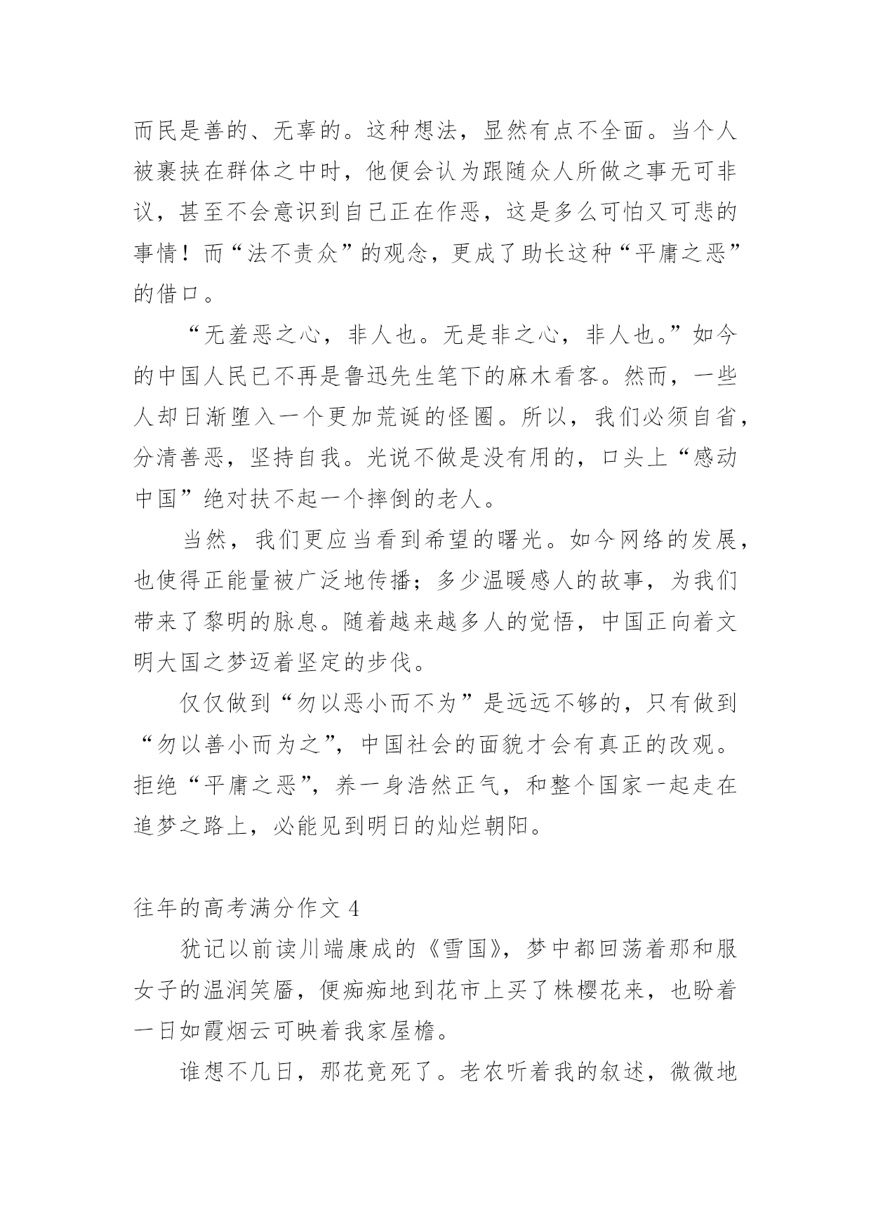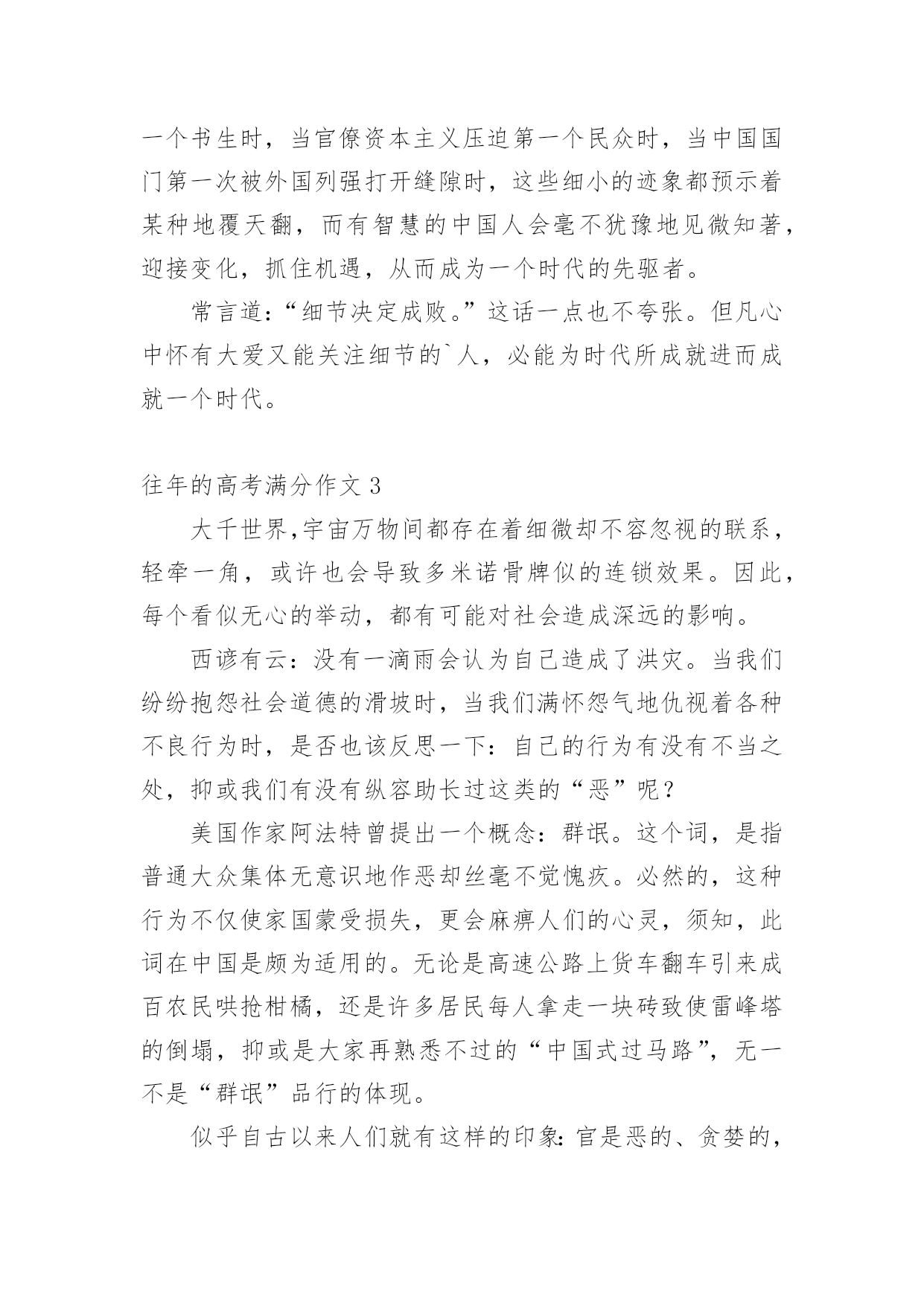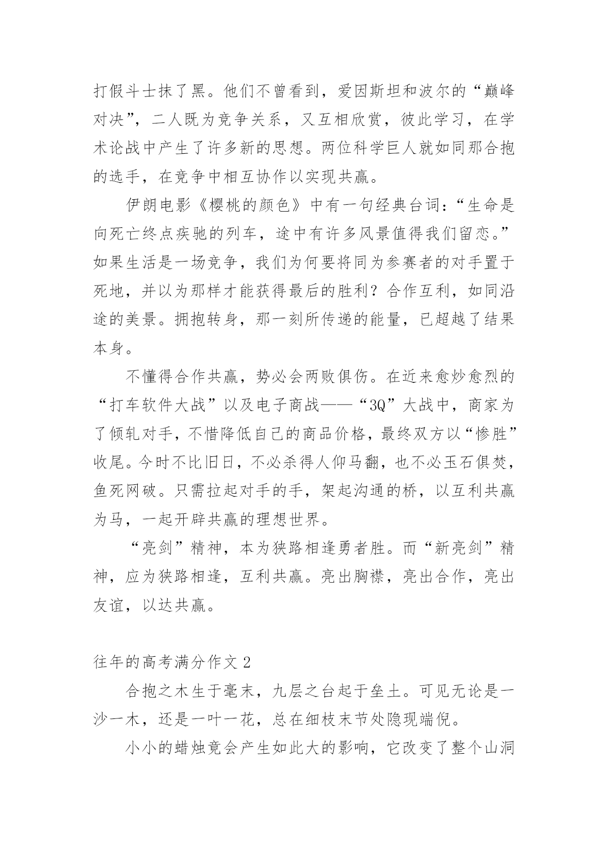 往年的高考满分作文无论在学习、工作或是生活中,大家都跟作文打过交道吧,作文是一种言语活动,具有高度的综合性和创造性。那么你知道一篇好的作文该怎么写吗?以下是小编帮大家整理的往年的高考满分作文,希望能够帮助到大家。往年的高考满分作文1张闻天说:“生活的理想,就是为了理想的生活。”而我们在一味的钩心斗角、鱼死网破时却忘记了竞争的本来目的。不如擦拭那恨不得将对手置于死地的双眸,合作互助,互利双赢,这又有何不可?双方选手无人落桥而获得双赢。这并非弃规则于不顾,而是懂得化敌为友,知晓合作共赢之道这一大智慧。合作共赢,使双方备美其美,美美与共。三国鼎立之时,若只是互相碾压,国便不可长久。于是便有吴蜀合作、孙刘联军的佳话。借得东风,火烧战舰,共退曹操大军。试想,倘若双方不谙合作,只醉心于“窝里斗”,覆巢之下,怎有完卵?故曰:狭路相逢,合作共赢。古语有“不战而屈人之兵”,而今则有“不战而互利共赢”。相互配合,目的地便不再遥远。合作共赢,成美好声誉。如今的方舟子、崔永元大战让人大跌眼镜。从最初的“华山论剑”到如今的“死缠烂打”,恨不得将对方置于死地。而频繁的脏话粗口更为央视名嘴、打假斗士抹了黑。他们不曾看到,爱因斯坦和波尔的“巅峰对决”,二人既为竞争关系,又互相欣赏,彼此学习,在学术论战中产生了许多新的思想。两位科学巨人就如同那合抱的选手,在竞争中相互协作以实现共赢。伊朗电影《樱桃的颜色》中有一句经典台词:“生命是向死亡终点疾驰的列车,途中有许多风景值得我们留恋。”如果生活是一场竞争,我们为何要将同为参赛者的对手置于死地,并以为那样才能获得最后的胜利?合作互利,如同沿途的美景。拥抱转身,那一刻所传递的能量,已超越了结果本身。不懂得合作共赢,势必会两败俱伤。在近来愈炒愈烈的“打车软件大战”以及电子商战——“3Q”大战中,商家为了倾轧对手,不惜降低自己的商品价格,最终双方以“惨胜”收尾。今时不比旧日,不必杀得人仰马翻,也不必玉石俱焚,鱼死网破。只需拉起对手的手,架起沟通的桥,以互利共赢为马,一起开辟共赢的理想世界。“亮剑”精神,本为狭路相逢勇者胜。而“新亮剑”精神,应为狭路相逢,互利共赢。亮出胸襟,亮出合作,亮出友谊,以达共赢。往年的高考满分作文2合抱之木生于毫末,九层之台起于垒土。可见无论是一沙一木,还是一叶一花,总在细枝末节处隐现端倪。小小的蜡烛竟会产生如此大的影响,它改变了整个山洞的环境,迫使那些斑斓的大蝴蝶只能另寻栖所。一叶零落,便知秋天将至。的确,注重细节需要有如“尘”的心思。这是一门洞察世事的学问,并非机械地观察记录,也不是四处探听偷窥,而是以一种至情至性的眼光来看待万物。这几位朋友,在进洞前只有对大蝴蝶的好奇和探索,全无对生命的尊重,因而他们贸然点燃蜡烛。如“尘”的心思是一种有血有肉的心灵探索,并不是高等生物对低等生物的征服。“钩帘归乳燕,穴纸出痴蝇。为鼠常留饭,怜蛾不点灯。”这是苏轼对于生命的大度。这位执铁板唱大江东去的真男儿,心中也有这种如“尘”的时刻。不过,此情并不令人费解,倘若没有这等如“尘”的心思,又怎能留下“十年生死两茫茫,不思量自难忘”的绵绵无绝的佳句?心思如“尘”,不仅需要“怜蛾不点灯”的大度与包容,还需要我们有触动事物核心的敏感。当我们有了触动事物核心的敏感时,才真正明白细节给我们带来的巨大力量,因为它可以使我们看得更多,看得更远。佛说:“一花一世界,一叶一菩提”。佛独具慧眼,从一花一叶之中,看到比凡人深得多也远得多的东西。懂得细节的人,往往能占尽先机。但凡有智慧的作家,在他们的作品中总会表现出一定的先知性。同为凡人,为何他们会有这种先知性?究其原因,是他们触碰到时代的脉博和神经,从细节出发,观凡人之不能观,悟常人之不能悟。细节,总是腐朽事物的报丧者、新鲜事物的召唤人。当宗法制度在第一个诸侯国被破坏时,当文字狱兴起、抓起第一个书生时,当官僚资本主义压迫第一个民众时,当中国国门第一次被外国列强打开缝隙时,这些细小的迹象都预示着某种地覆天翻,而有智慧的中国人会毫不犹豫地见微知著,迎接变化,抓住机遇,从而成为一个时代的先驱者。常言道:“细节决定成败。”这话一点也不夸张。但凡心中怀有大爱又能关注细节的`人,必能为时代所成就进而成就一个时代。往年的高考满分作文3大千世界,宇宙万物间都存在着细微却不容忽视的联系,轻牵一角,或许也会导致多米诺骨牌似的连锁效果。因此,每个看似无心的举动,都有可能对社会造成深远的影响。西谚有云:没有一滴雨会认为自己造成了洪灾。当我们纷纷抱怨社会道德的滑坡时,当我们满怀怨气地仇视着各种不良行为时,是否也该反思一下:自己的行为有没有不当之处,抑或我们有没有纵容助长过这类的“恶”呢?美国作家阿法特曾提出一个概念:群氓。这个词,是指普通大众集体无意识地作恶却丝毫不觉愧疚。必然的,这种行为不仅使家国蒙受损失