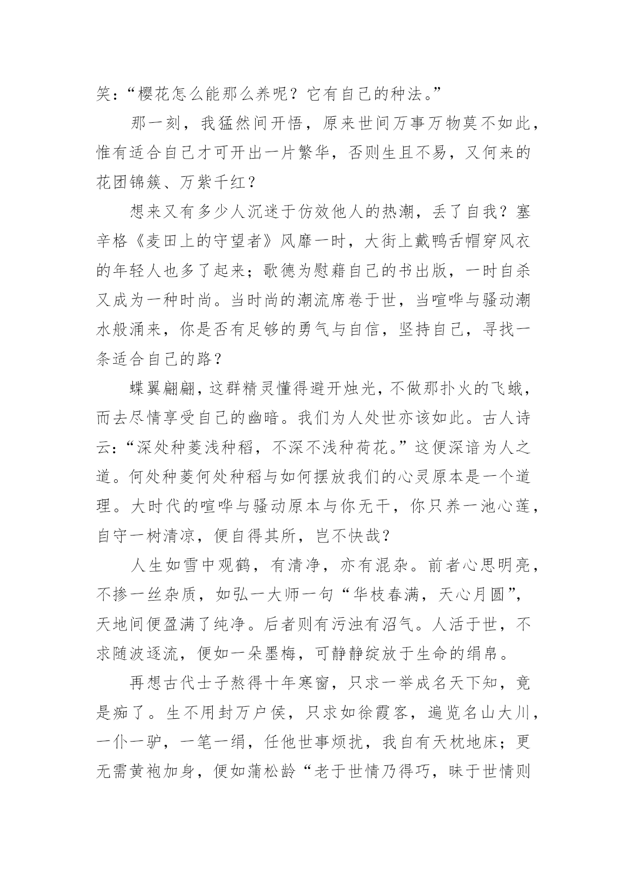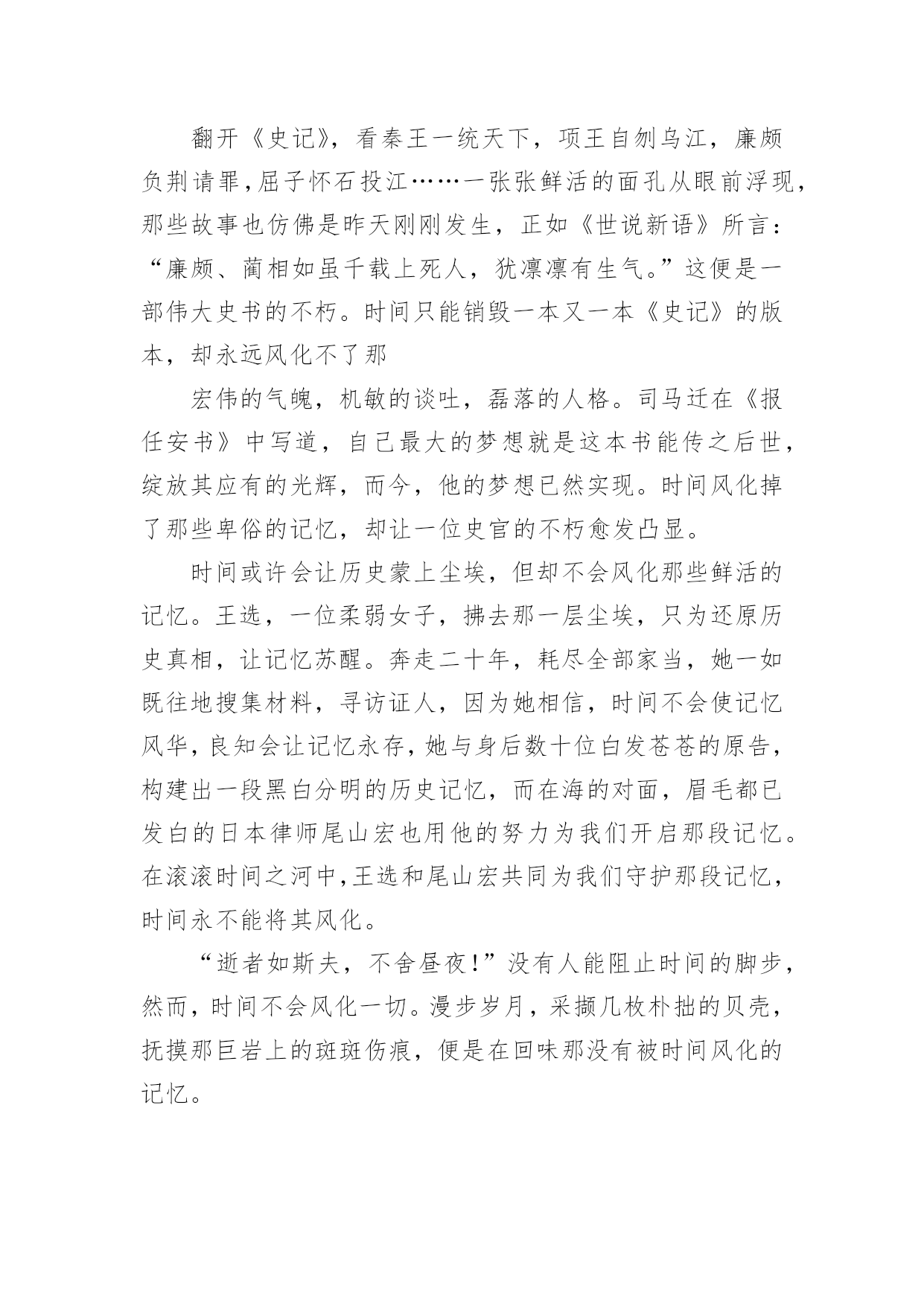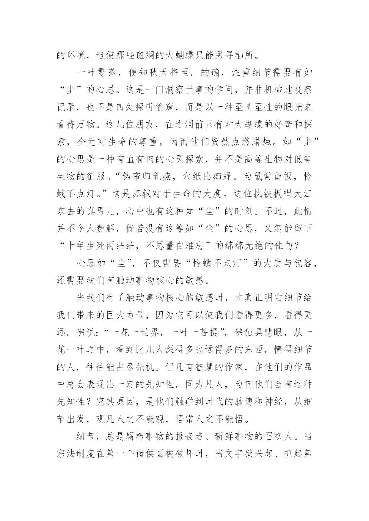 往年的高考满分作文无论在学习、工作或是生活中,大家都跟作文打过交道吧,作文是一种言语活动,具有高度的综合性和创造性。那么你知道一篇好的作文该怎么写吗?以下是小编帮大家整理的往年的高考满分作文,希望能够帮助到大家。往年的高考满分作文1张闻天说:“生活的理想,就是为了理想的生活。”而我们在一味的钩心斗角、鱼死网破时却忘记了竞争的本来目的。不如擦拭那恨不得将对手置于死地的双眸,合作互助,互利双赢,这又有何不可?双方选手无人落桥而获得双赢。这并非弃规则于不顾,而是懂得化敌为友,知晓合作共赢之道这一大智慧。合作共赢,使双方备美其美,美美与共。三国鼎立之时,若只是互相碾压,国便不可长久。于是便有吴蜀合作、孙刘联军的佳话。借得东风,火烧战舰,共退曹操大军。试想,倘若双方不谙合作,只醉心于“窝里斗”,覆巢之下,怎有完卵?故曰:狭路相逢,合作共赢。古语有“不战而屈人之兵”,而今则有“不战而互利共赢”。相互配合,目的地便不再遥远。合作共赢,成美好声誉。如今的方舟子、崔永元大战让人大跌眼镜。从最初的“华山论剑”到如今的“死缠烂打”,恨不得将对方置于死地。而频繁的脏话粗口更为央视名嘴、打假斗士抹了黑。他们不曾看到,爱因斯坦和波尔的“巅峰对决”,二人既为竞争关系,又互相欣赏,彼此学习,在学术论战中产生了许多新的思想。两位科学巨人就如同那合抱的选手,在竞争中相互协作以实现共赢。伊朗电影《樱桃的颜色》中有一句经典台词:“生命是向死亡终点疾驰的列车,途中有许多风景值得我们留恋。”如果生活是一场竞争,我们为何要将同为参赛者的对手置于死地,并以为那样才能获得最后的胜利?合作互利,如同沿途的美景。拥抱转身,那一刻所传递的能量,已超越了结果本身。不懂得合作共赢,势必会两败俱伤。在近来愈炒愈烈的“打车软件大战”以及电子商战——“3Q”大战中,商家为了倾轧对手,不惜降低自己的商品价格,最终双方以“惨胜”收尾。今时不比旧日,不必杀得人仰马翻,也不必玉石俱焚,鱼死网破。只需拉起对手的手,架起沟通的桥,以互利共赢为马,一起开辟共赢的理想世界。“亮剑”精神,本为狭路相逢勇者胜。而“新亮剑”精神,应为狭路相逢,互利共赢。亮出胸襟,亮出合作,亮出友谊,以达共赢。往年的高考满分作文2合抱之木生于毫末,九层之台起于垒土。可见无论是一沙一木,还是一叶一花,总在细枝末节处隐现端倪。小小的蜡烛竟会产生如此大的影响,它改变了整个山洞的环境,迫使那些斑斓的大蝴蝶只能另寻栖所。一叶零落,便知秋天将至。的确,注重细节需要有如“尘”的心思。这是一门洞察世事的学问,并非机械地观察记录,也不是四处探听偷窥,而是以一种至情至性的眼光来看待万物。这几位朋友,在进洞前只有对大蝴蝶的好奇和探索,全无对生命的尊重,因而他们贸然点燃蜡烛。如“尘”的心思是一种有血有肉的心灵探索,并不是高等生物对低等生物的征服。“钩帘归乳燕,穴纸出痴蝇。为鼠常留饭,怜蛾不点灯。”这是苏轼对于生命的大度。这位执铁板唱大江东去的真男儿,心中也有这种如“尘”的时刻。不过,此情并不令人费解,倘若没有这等如“尘”的心思,又怎能留下“十年生死两茫茫,不思量自难忘”的绵绵无绝的佳句?心思如“尘”,不仅需要“怜蛾不点灯”的大度与包容,还需要我们有触动事物核心的敏感。当我们有了触动事物核心的敏感时,才真正明白细节给我们带来的巨大力量,因为它可以使我们看得更多,看得更远。佛说:“一花一世界,一叶一菩提”。佛独具慧眼,从一花一叶之中,看到比凡人深得多也远得多的东西。懂得细节的人,往往能占尽先机。但凡有智慧的作家,在他们的作品中总会表现出一定的先知性。同为凡人,为何他们会有这种先知性?究其原因,是他们触碰到时代的脉博和神经,从细节出发,观凡人之不能观,悟常人之不能悟。细节,总是腐朽事物的报丧者、新鲜事物的召唤人。当宗法制度在第一个诸侯国被破坏时,当文字狱兴起、抓起第一个书生时,当官僚资本主义压迫第一个民众时,当中国国门第一次被外国列强打开缝隙时,这些细小的迹象都预示着某种地覆天翻,而有智慧的中国人会毫不犹豫地见微知著,迎接变化,抓住机遇,从而成为一个时代的先驱者。常言道:“细节决定成败。”这话一点也不夸张。但凡心中怀有大爱又能关注细节的`人,必能为时代所成就进而成就一个时代。往年的高考满分作文3大千世界,宇宙万物间都存在着细微却不容忽视的联系,轻牵一角,或许也会导致多米诺骨牌似的连锁效果。因此,每个看似无心的举动,都有可能对社会造成深远的影响。西谚有云:没有一滴雨会认为自己造成了洪灾。当我们纷纷抱怨社会道德的滑坡时,当我们满怀怨气地仇视着各种不良行为时,是否也该反思一下:自己的行为有没有不当之处,抑或我们有没有纵容助长过这类的“恶”呢?美国作家阿法特曾提出一个概念:群氓。这个词,是指普通大众集体无意识地作恶却丝毫不觉愧疚。必然的,这种行为不仅使家国蒙受损失