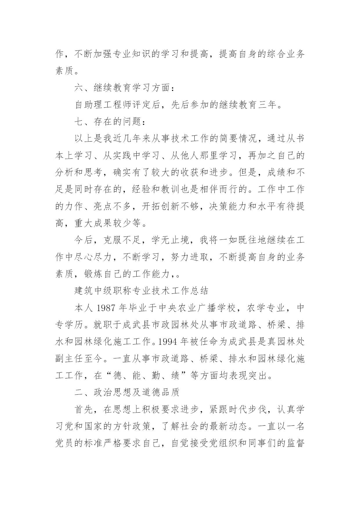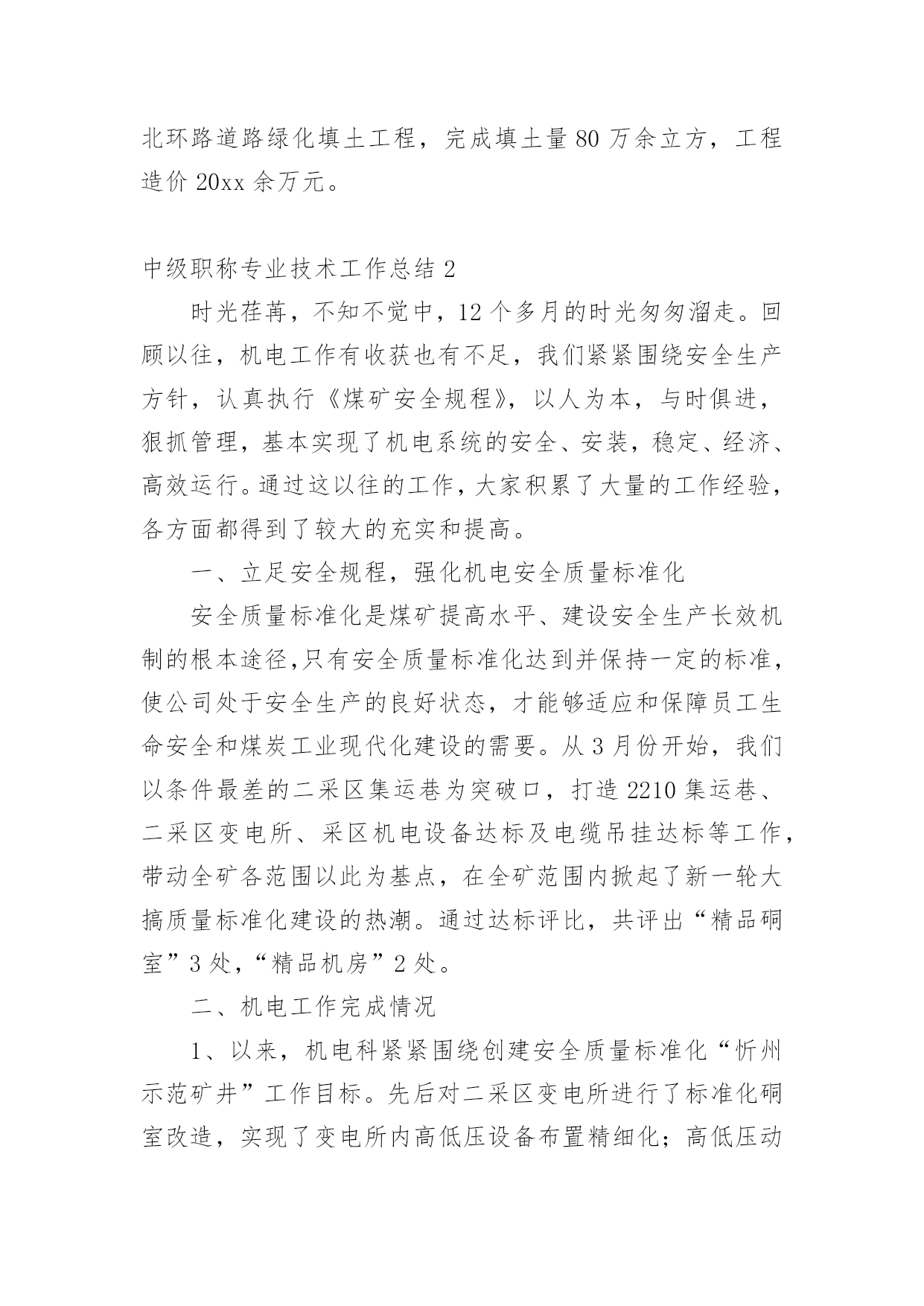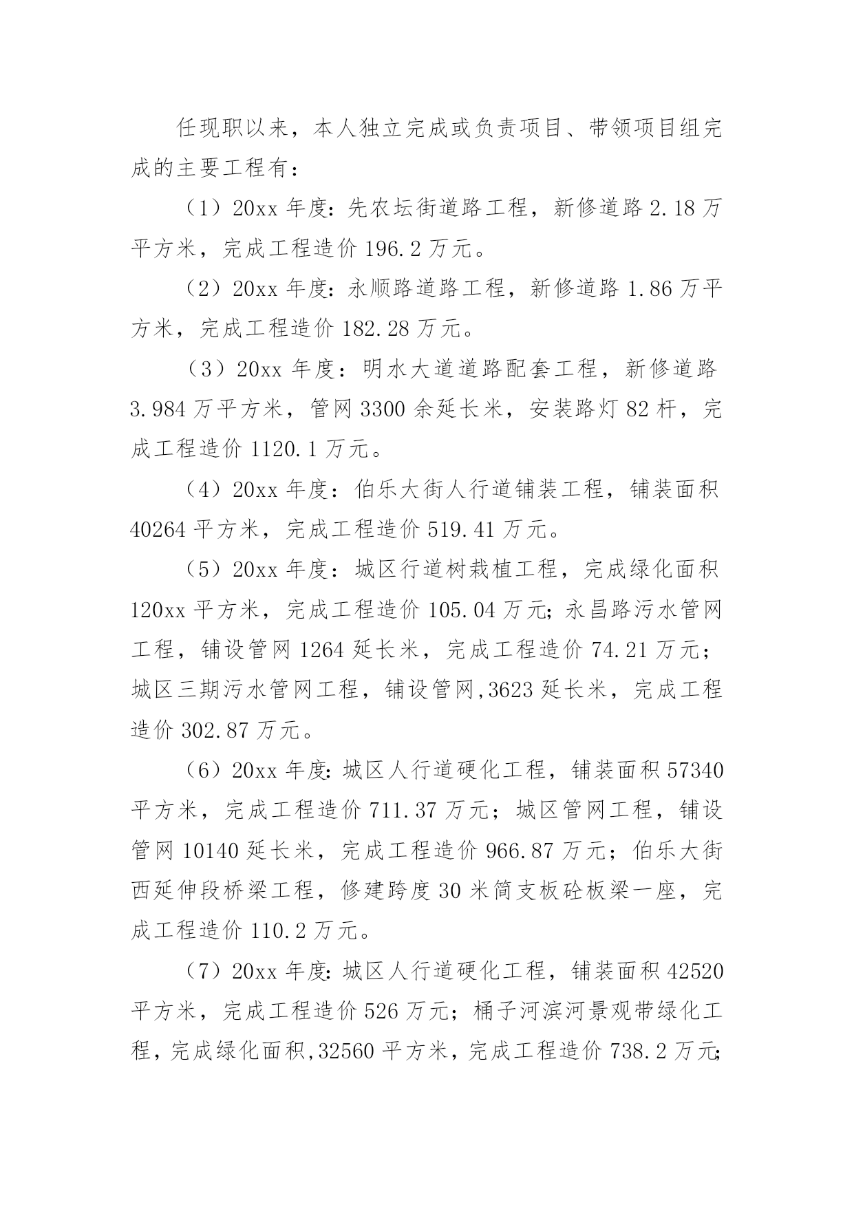 中级职称专业技术工作总结(合集)中级职称专业技术工作总结总结是指对某一阶段的工作、学习或思想中的经验或情况进行分析研究,做出带有规律性结论的书面材料,通过它可以全面地、系统地了解以往的学习和工作情况,让我们来为自己写一份总结吧。那么总结有什么格式呢?下面是小编为大家整理的中级职称专业技术工作总结,希望能够帮助到大家。中级职称专业技术工作总结120xx年7月,我顺利完成了学业,从内蒙古建筑职业技术学院工程造价专业毕业,并于同年进入建筑业。参加工作以来,我从事工程造价工作至今。现总结如下:一、学习专业知识,提高岗位技能:本人于20xx年7月正式参加工作,工作伊始,我发现学校里学到的专业知识同实际工作有很大的不同和差距,为了尽快转变角色,适应工作的要求,我努力学习工程造价专业知识,努力提高自己的岗位技能,在短短的半年内,我通过自己的努力及同事的帮助,能比较熟练地进行较复杂的工程造价日常事务工作。二、政治思想方面:在政治上,我对自己严格要求,积极参加各项政治活动,自觉学习政治理论,具有较强的大局意识和组织观念,工作上以事业为重,不计个人得失,在新的岗位上摆正位置,把公路施工的事业、把广大人民群众的利益放在首位,努力实践全心全意为人民服务的根本宗旨。在工作中做到公平公正、公道正派,具有较强的敬业精神和奉献精神,工作中吃苦耐劳,积极主动,作风踏实,不推诿扯皮,讲求效率。工作中注意研究,勤于思考,工作思路清晰,能把理论同实际相结合。三、组织协调方面:在实际工作中,努力学会运用马克思主义的立场、观点和方法去分析、研究、解决问题,有一定的组织协调能力和科学决策水平。注意学习现代管理知识,较好地掌握了人文社科管理的一般规律。能协助部门负责人做好职工的思想政治工作,为部门工作的有效开展提供了保障。四、工作管理方面:1、造价控制工程管理贯穿整个建设过程,在工程管理中,要认真做好事前控制,过程控制和事后的跟踪。首先必须熟悉施工图纸和技术要求、规范标准,它们是工程建设的依据,也是质量检查的准则,在进行质量检查前必须摸透设计意图才能做好质量管理工作。在施工过程中,充分利用监理,加强现场检查,处理质量问题要解决果断,要安排专人跟踪负责,不能马虎走过场,发现问题不处理、处理不彻底都是质量管理的弊病,必须要对质量问题付出代价,这样才能令施工单位不敢再犯、重犯。2、深入现场全面掌握工程动态。结算审核不能只是对图纸和工程变更的计算审核,还要深入现场,细致认真的核对,确保工程结算的质量。造价工程师要掌握工程动态,了解工程是否按图纸和工程变更施工,是否有的洽商没有施工,是否有已经去掉的部分没有变更,是否有在变更的基础上又变了。如发现问题,出现疑问逐一到现场核实。3、审核审核程序过程中的质量控制是整个审核质量保证的核心,对审核过程的质量控制,对保证审核质量,降低审核风险起到了关键性的作用。在确定工程造价时,坚持以现行的计价规范为依据,按照施工合同和招投标文件的规定,根据竣工图、结合现场签证和设计变更等进行审核。五、专业理论知识的学习:丰富的专业知识是从事专业技术工作的前提,自任助理工程师职称以来,我,不断充实自我专业理论水平和实践施工能力,加强专业理论知识的学习。任职以来,通过公司的培养教育、领导和同事同行的指导帮助、个人不懈的努力和虚心学习,我的政治觉悟、思想品德、工作能力、业务水平和管理能力、管理水平等都得到了不断的提升,综合素质也取得了长足进步,在公路建设和管理领域取得了系列成绩,积累了丰富的公路技术、公路施工及公路建设管理的实践经验。我会一如既往地做好本职工作,不断加强专业知识的学习和提高,提高自身的综合业务素质。六、继续教育学习方面:自助理工程师评定后,先后参加的继续教育三年。七、存在的问题:以上是我近几年来从事技术工作的简要情况,通过从书本上学习、从实践中学习、从他人那里学习,再加之自己的分析和思考,确实有了较大的收获和进步。但是,成绩和不足是同时存在的,经验和教训也是相伴而行的。工作中工作的力作、亮点不多,开拓创新不够,决策能力和水平有待提高,重大成果较少等。今后,克服不足,学无止境,我将一如既往地继续在工作中尽心尽力,不断学习,努力进取,不断提高自身的业务素质,锻炼自己的工作能力,。建筑中级职称专业技术工作总结本人1987年毕业于中央农业广播学校,农学专业,中专学历。就职于成武县市政园林处从事市政道路、桥梁、排水和园林绿化施工工作。1994年被任命为成武县是真园林处副主任至今。一直从事市政道路、桥梁、排水和园林绿化施工工作,在“德、能、勤、绩”等方面均表现突出。二、政治思想及道德品质首先,在思想上积极要求进步,紧跟时代步伐,认真学习党和国家的方针政策,了解社会的最新动态。一直以一名党员的标准严格要求自己,自觉接受党组织和同事们的监督和帮助,坚持不懈地克