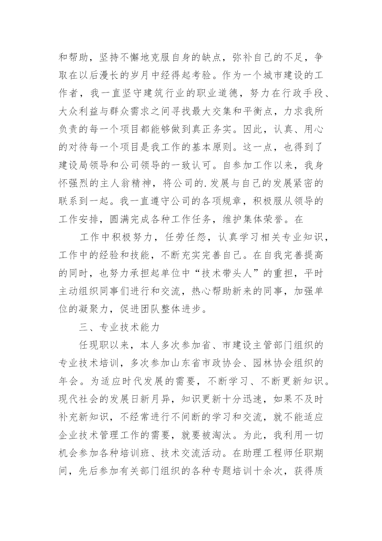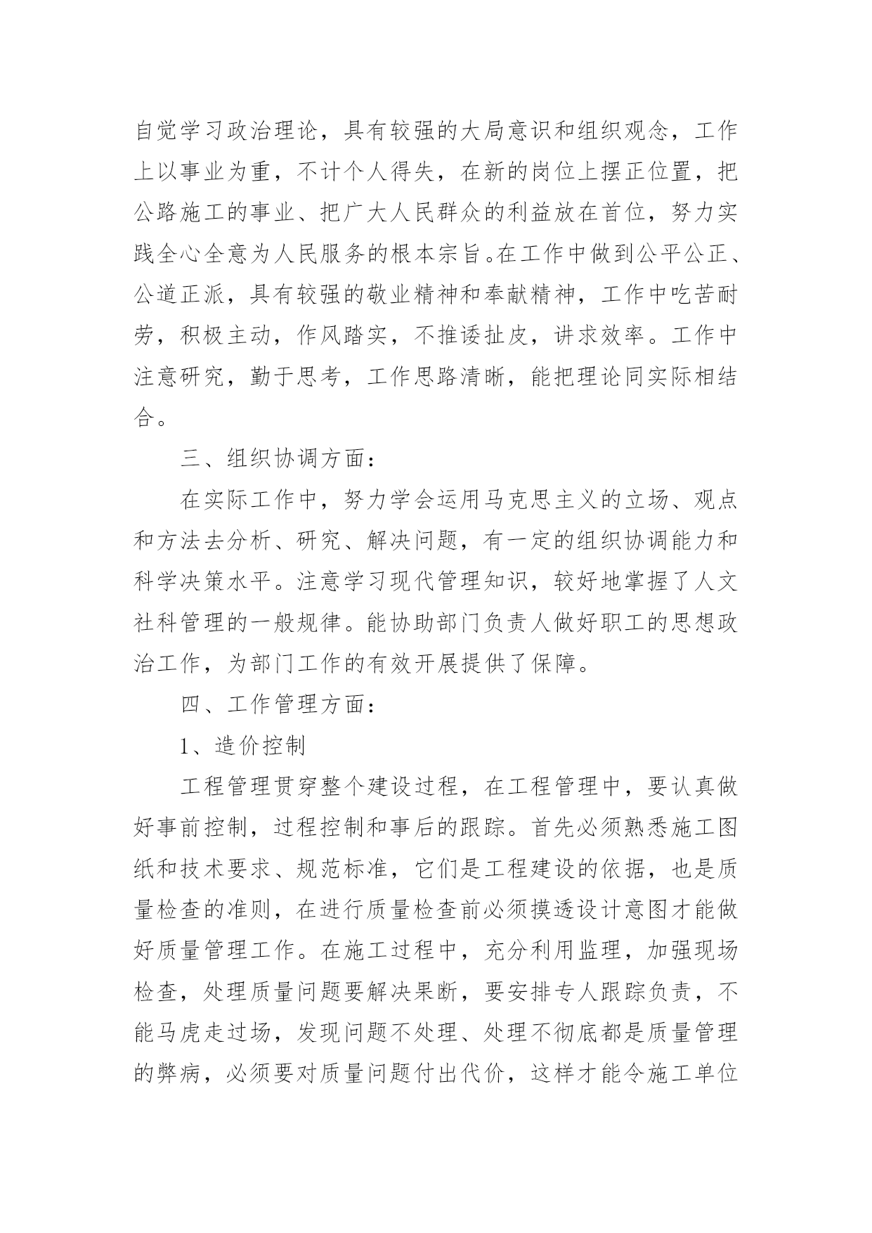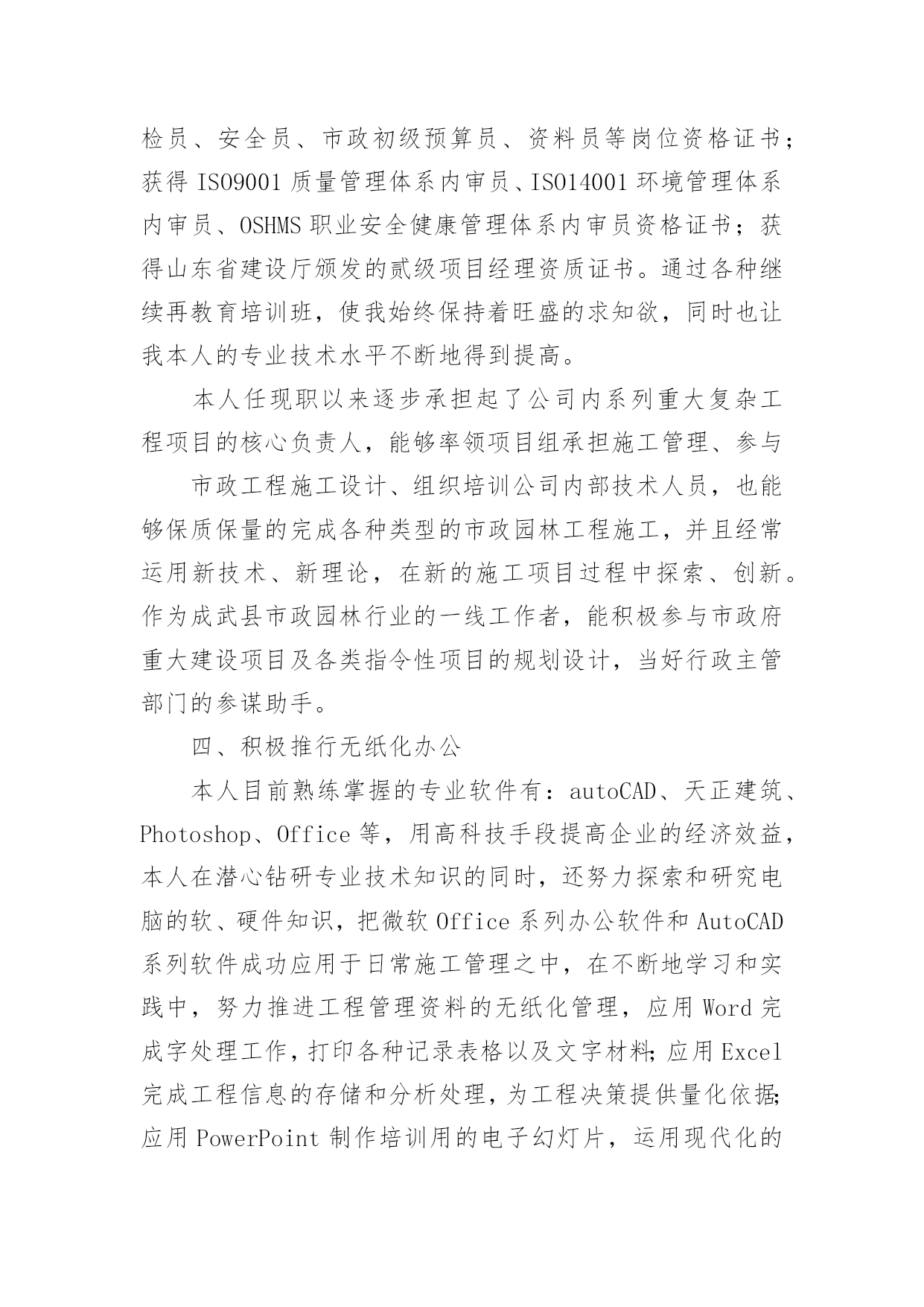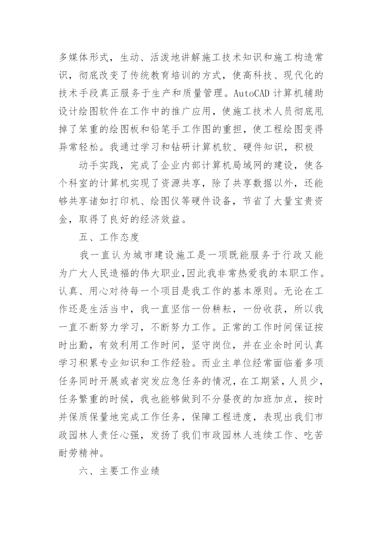 中级职称专业技术工作总结(合集)中级职称专业技术工作总结总结是指对某一阶段的工作、学习或思想中的经验或情况进行分析研究,做出带有规律性结论的书面材料,通过它可以全面地、系统地了解以往的学习和工作情况,让我们来为自己写一份总结吧。那么总结有什么格式呢?下面是小编为大家整理的中级职称专业技术工作总结,希望能够帮助到大家。中级职称专业技术工作总结120xx年7月,我顺利完成了学业,从内蒙古建筑职业技术学院工程造价专业毕业,并于同年进入建筑业。参加工作以来,我从事工程造价工作至今。现总结如下:一、学习专业知识,提高岗位技能:本人于20xx年7月正式参加工作,工作伊始,我发现学校里学到的专业知识同实际工作有很大的不同和差距,为了尽快转变角色,适应工作的要求,我努力学习工程造价专业知识,努力提高自己的岗位技能,在短短的半年内,我通过自己的努力及同事的帮助,能比较熟练地进行较复杂的工程造价日常事务工作。二、政治思想方面:在政治上,我对自己严格要求,积极参加各项政治活动,自觉学习政治理论,具有较强的大局意识和组织观念,工作上以事业为重,不计个人得失,在新的岗位上摆正位置,把公路施工的事业、把广大人民群众的利益放在首位,努力实践全心全意为人民服务的根本宗旨。在工作中做到公平公正、公道正派,具有较强的敬业精神和奉献精神,工作中吃苦耐劳,积极主动,作风踏实,不推诿扯皮,讲求效率。工作中注意研究,勤于思考,工作思路清晰,能把理论同实际相结合。三、组织协调方面:在实际工作中,努力学会运用马克思主义的立场、观点和方法去分析、研究、解决问题,有一定的组织协调能力和科学决策水平。注意学习现代管理知识,较好地掌握了人文社科管理的一般规律。能协助部门负责人做好职工的思想政治工作,为部门工作的有效开展提供了保障。四、工作管理方面:1、造价控制工程管理贯穿整个建设过程,在工程管理中,要认真做好事前控制,过程控制和事后的跟踪。首先必须熟悉施工图纸和技术要求、规范标准,它们是工程建设的依据,也是质量检查的准则,在进行质量检查前必须摸透设计意图才能做好质量管理工作。在施工过程中,充分利用监理,加强现场检查,处理质量问题要解决果断,要安排专人跟踪负责,不能马虎走过场,发现问题不处理、处理不彻底都是质量管理的弊病,必须要对质量问题付出代价,这样才能令施工单位不敢再犯、重犯。2、深入现场全面掌握工程动态。结算审核不能只是对图纸和工程变更的计算审核,还要深入现场,细致认真的核对,确保工程结算的质量。造价工程师要掌握工程动态,了解工程是否按图纸和工程变更施工,是否有的洽商没有施工,是否有已经去掉的部分没有变更,是否有在变更的基础上又变了。如发现问题,出现疑问逐一到现场核实。3、审核审核程序过程中的质量控制是整个审核质量保证的核心,对审核过程的质量控制,对保证审核质量,降低审核风险起到了关键性的作用。在确定工程造价时,坚持以现行的计价规范为依据,按照施工合同和招投标文件的规定,根据竣工图、结合现场签证和设计变更等进行审核。五、专业理论知识的学习:丰富的专业知识是从事专业技术工作的前提,自任助理工程师职称以来,我,不断充实自我专业理论水平和实践施工能力,加强专业理论知识的学习。任职以来,通过公司的培养教育、领导和同事同行的指导帮助、个人不懈的努力和虚心学习,我的政治觉悟、思想品德、工作能力、业务水平和管理能力、管理水平等都得到了不断的提升,综合素质也取得了长足进步,在公路建设和管理领域取得了系列成绩,积累了丰富的公路技术、公路施工及公路建设管理的实践经验。我会一如既往地做好本职工作,不断加强专业知识的学习和提高,提高自身的综合业务素质。六、继续教育学习方面:自助理工程师评定后,先后参加的继续教育三年。七、存在的问题:以上是我近几年来从事技术工作的简要情况,通过从书本上学习、从实践中学习、从他人那里学习,再加之自己的分析和思考,确实有了较大的收获和进步。但是,成绩和不足是同时存在的,经验和教训也是相伴而行的。工作中工作的力作、亮点不多,开拓创新不够,决策能力和水平有待提高,重大成果较少等。今后,克服不足,学无止境,我将一如既往地继续在工作中尽心尽力,不断学习,努力进取,不断提高自身的业务素质,锻炼自己的工作能力,。建筑中级职称专业技术工作总结本人1987年毕业于中央农业广播学校,农学专业,中专学历。就职于成武县市政园林处从事市政道路、桥梁、排水和园林绿化施工工作。1994年被任命为成武县是真园林处副主任至今。一直从事市政道路、桥梁、排水和园林绿化施工工作,在“德、能、勤、绩”等方面均表现突出。二、政治思想及道德品质首先,在思想上积极要求进步,紧跟时代步伐,认真学习党和国家的方针政策,了解社会的最新动态。一直以一名党员的标准严格要求自己,自觉接受党组织和同事们的监督和帮助,坚持不懈地克