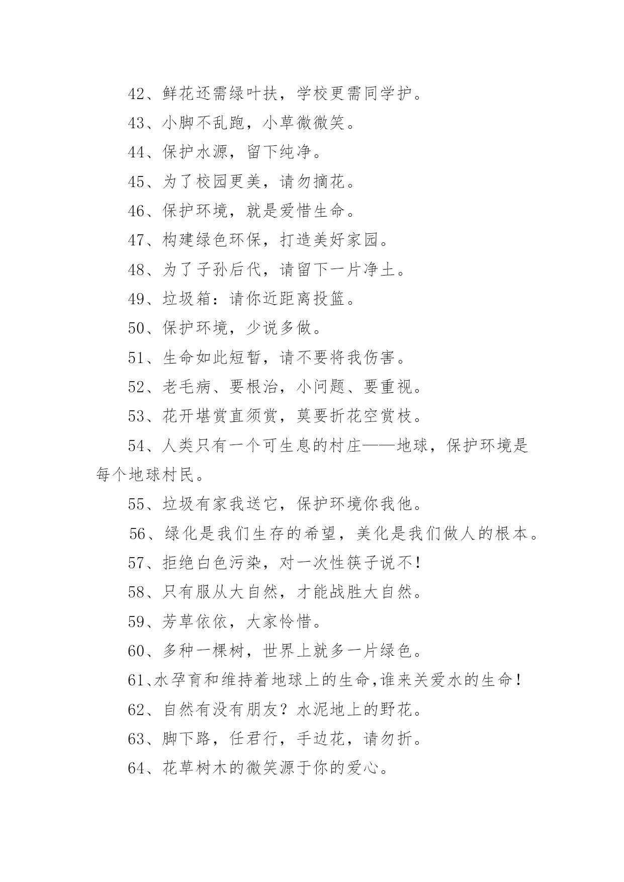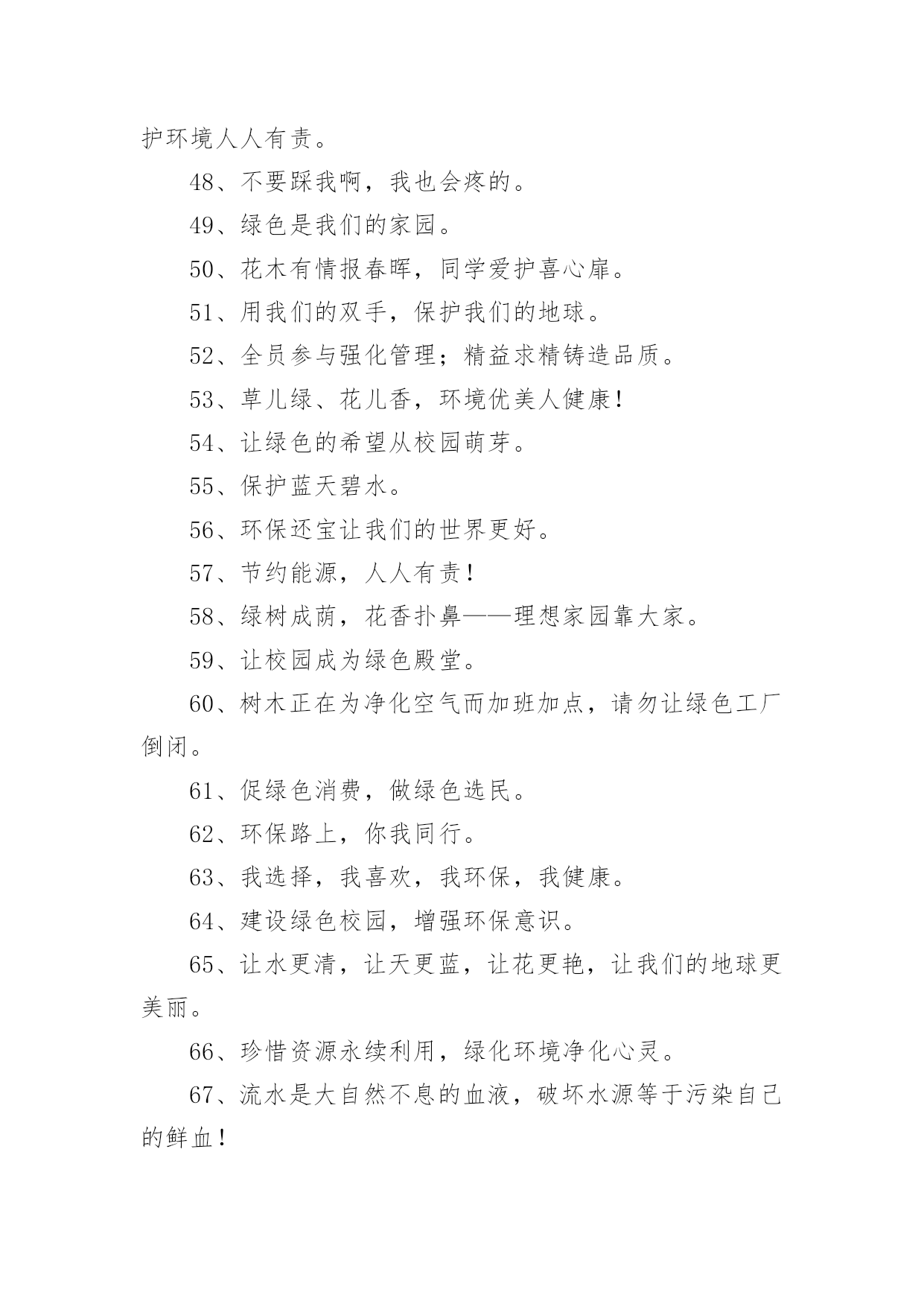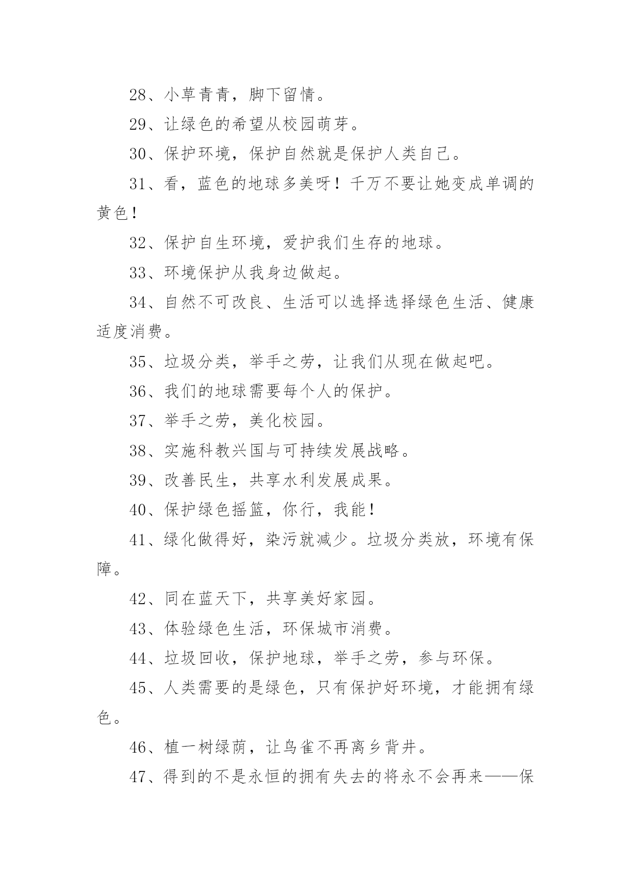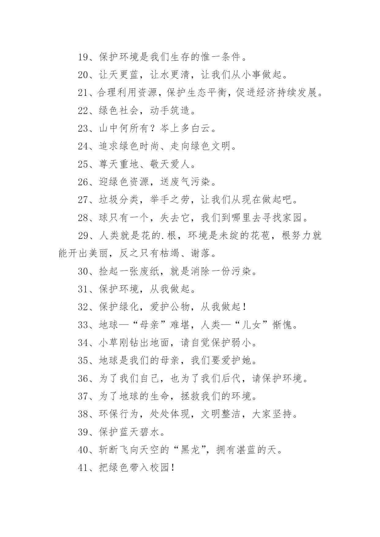 世界环保日宣传标语世界环保日宣传标语8篇在平平淡淡的学习、工作、生活中,大家对标语都再熟悉不过了吧,标语具有在理智上启发人们,在情感上打动人们的作用。还苦于找不到好的标语?以下是小编精心整理的世界环保日宣传标语,欢迎阅读与收藏。世界环保日宣传标语11.保护环境就是保护生产力2.水-----13亿人生命之所系3.既要金山银山更要青山绿水4.提倡绿色生活实施清洁生产5.树立节水意识反对浪费水源6.提高环境道德水平建设文明小康城区7.保护环境造福后代8.全面建设小康社会同心共创美好家园9.当环保卫士做时代公民10.若要电费缴得少,节约用电要做好。11.购买电器要记牢,用电效率第一条。12.选购电器有方法,节能标章真正好。13.节约能源有诀窍,建筑节能很重要。14.节约能源要做好,冷气效率要提高。15.选购冷气有一套,EER值必需高。16.若要冷气耗电少,温度适当设定好。17.照明品质要提高,省电灯具不可少。18.节约能源有良方,充分利用自然光。19.节约能源一起来,生活省电真方便。20.推动节约能源,落实优质环境。21.人人省电,人人省钱22.节约能源不是口号,是一种行动力。23.节约能源保护资源,源源不绝。24.节能N次方,地球更健康。25.节约能源就从居家做起。26.节约能源生活化,节能推动更落实。27.珍惜能源,创造美好环境。28.节约能源共创美丽新世界。29.节能大作战,等你来挑战。30.省一点能源,多一点资源。31.随手做节能,创造好人生。32.动手做节能,环保又省钱。33.节能尽一份力,环保多一点心。34.节能多用心,大家都开心。35.节约能源,源源不绝。36.节约能源一起来,共创美好的未来。37.珍惜现有能源,保有未来资源。38.有能源就是有资源,有资源就是有本钱。39.节能多尽力,未来多美丽。40.节约能源一起来,好山好水好将来。41.万般能源众家省,源远流长照世人。42.节约大家做,能源大家享。43.节能解危机,地球有转机。44.节能做的`好,朝朝无烦恼。45.欲享资源用不竭,各种能源随手节。46.能源来自大自然,节能保护大自然。47.省一分钟电,多一分钟电。48.随手关灯,随时有灯。49.让大气清新、让天空蔚蓝、让河山碧绿50.企业求发展环保须先行51.别让眼泪成为地球上的最后一滴水52.提高环境保护意识爱护我们共有家园53.天蓝水清地绿居佳54.合理利用资源保护生态平衡55.环境保护是我国一项基本国策56.全面建设小康社会切实走可持续发展之路世界环保日宣传标语21、你珍惜我的生命,我还你一片绿荫。2、人类应该为自己破坏环境的行为感到羞耻。3、保护水环境,节约水资源。4、美化生活,净化心灵。5、土壤不能再生,防止土壤污染和沙化,减少水土流失。6、动物是我们朋友,保护动物就是保护我们自己。7、垃圾箱:请你近距离投篮。8、地球能满足人类的需要、但满足不了人类的贪婪。9、让天更蓝,让水更清,让我们从小事做起。10、保护绿化,爱护公物,从我做起!11、你栽一棵树,我栽一棵树,我们共同为校园添绿。12、保护环境,让地球妈妈重绽笑脸!13、用我们的双手,保护我们的地球。14、留住草的美,体现你的`美。15、芳草依依,大家怜惜。16、为了校园一片绿,珍惜脚下每颗草。17、环境保护,人人有责。18、希望有一天,垃圾筒也会下岗。19、不让尘土进校园,只让美好到我家。20、有限的资源,无限的循环。21、促绿色消费,做绿色选民。22、朋友们,觉悟吧,从现在开始保护环境还来得及。23、地球是我们的母亲,我们要爱护她。24、保护地球,就从美化校园开始吧!25、自然有没有朋友?水泥地上的野花。26、小草青青,花香飘飘;青草鲜花,应当爱惜。27、如果环境受到污染,再青翠的蒹葭也会枯萎,下一个凋谢的将是您美丽的容颜。28、小草青青,脚下留情。29、让绿色的希望从校园萌芽。30、保护环境,保护自然就是保护人类自己。31、看,蓝色的地球多美呀!千万不要让她变成单调的黄色!32、保护自生环境,爱护我们生存的地球。33、环境保护从我身边做起。34、自然不可改良、生活可以选择选择绿色生活、健康适度消费。35、垃圾分类,举手之劳,让我们从现在做起吧。36、我们的地球需要每个人的保护。37、举手之劳,美化校园。38、实施科教兴国与可持续发展战略。39、改善民生,共享水利发展成果。40、保护绿色摇篮,你行,我能!41、绿化做得好,染污就减少。垃圾分类放,环境有保障。42、同在蓝天下,共享美好家园。43、体验绿色生活,环保城市消费。44、垃圾回收,保护地球,举手之劳,参与环保。45、人类需要的是绿色,只有保护好环境,才能拥有绿色。46、植一树绿荫,让鸟雀不再离乡背井。47、得到的不是永恒的拥有失去的将永不会再来——保护环境人人有责。48、不要踩我啊,我也会疼