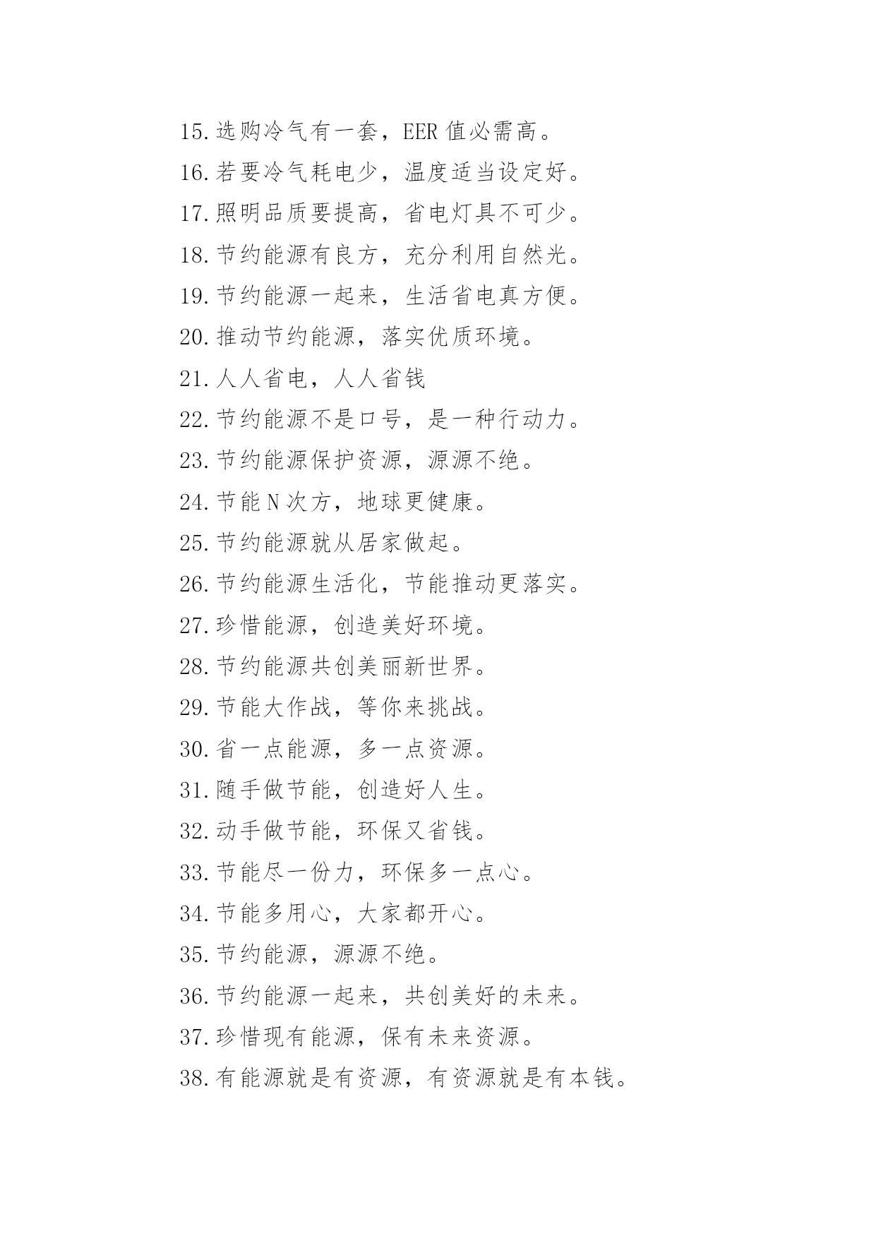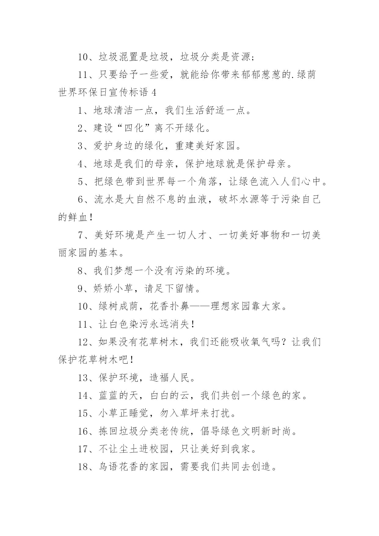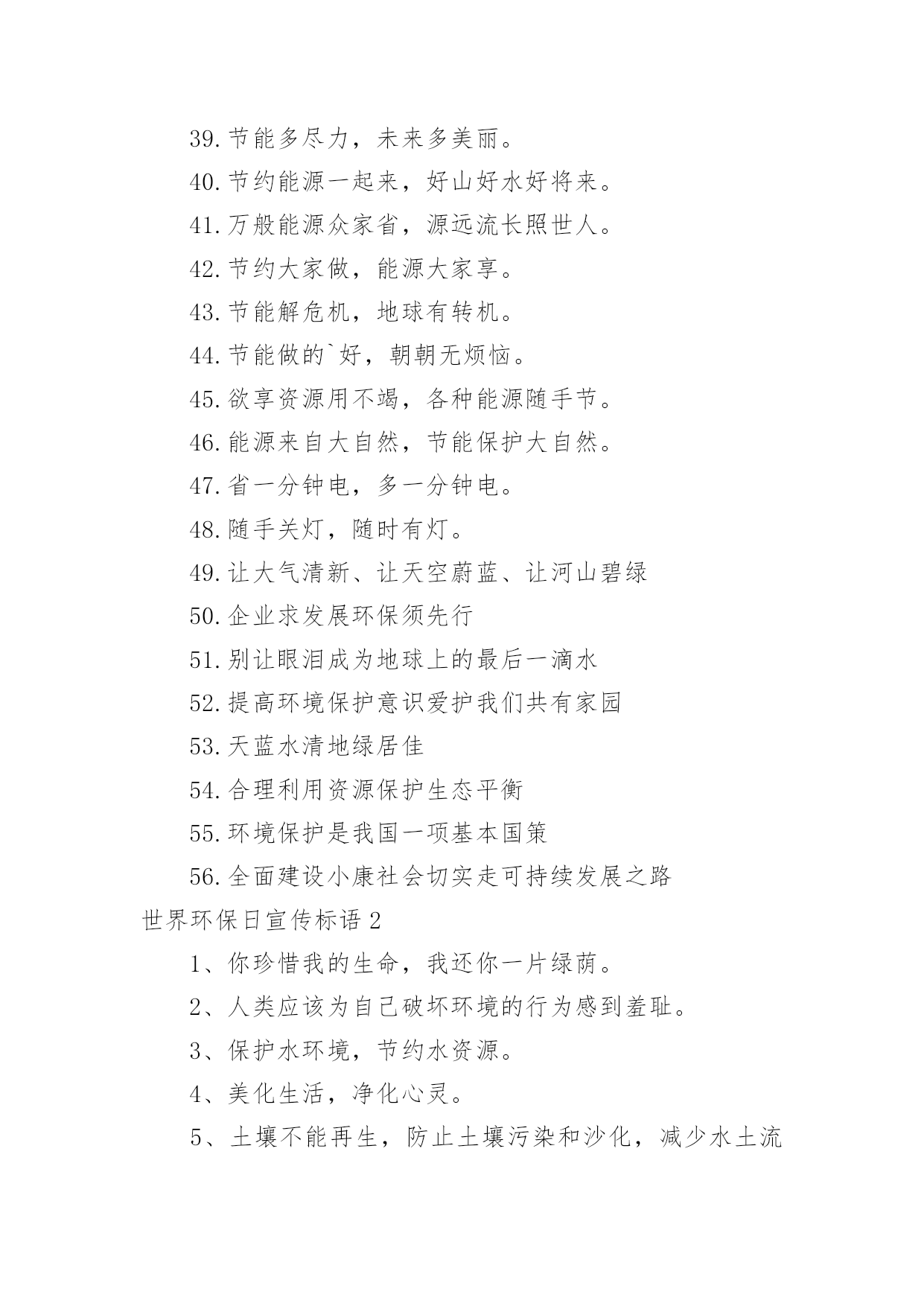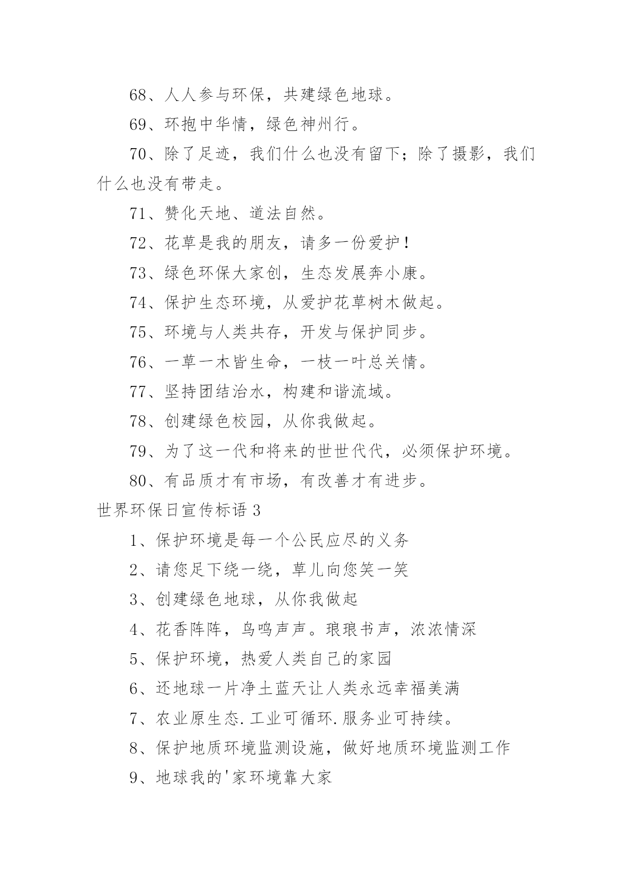 世界环保日宣传标语世界环保日宣传标语8篇在平平淡淡的学习、工作、生活中,大家对标语都再熟悉不过了吧,标语具有在理智上启发人们,在情感上打动人们的作用。还苦于找不到好的标语?以下是小编精心整理的世界环保日宣传标语,欢迎阅读与收藏。世界环保日宣传标语11.保护环境就是保护生产力2.水-----13亿人生命之所系3.既要金山银山更要青山绿水4.提倡绿色生活实施清洁生产5.树立节水意识反对浪费水源6.提高环境道德水平建设文明小康城区7.保护环境造福后代8.全面建设小康社会同心共创美好家园9.当环保卫士做时代公民10.若要电费缴得少,节约用电要做好。11.购买电器要记牢,用电效率第一条。12.选购电器有方法,节能标章真正好。13.节约能源有诀窍,建筑节能很重要。14.节约能源要做好,冷气效率要提高。15.选购冷气有一套,EER值必需高。16.若要冷气耗电少,温度适当设定好。17.照明品质要提高,省电灯具不可少。18.节约能源有良方,充分利用自然光。19.节约能源一起来,生活省电真方便。20.推动节约能源,落实优质环境。21.人人省电,人人省钱22.节约能源不是口号,是一种行动力。23.节约能源保护资源,源源不绝。24.节能N次方,地球更健康。25.节约能源就从居家做起。26.节约能源生活化,节能推动更落实。27.珍惜能源,创造美好环境。28.节约能源共创美丽新世界。29.节能大作战,等你来挑战。30.省一点能源,多一点资源。31.随手做节能,创造好人生。32.动手做节能,环保又省钱。33.节能尽一份力,环保多一点心。34.节能多用心,大家都开心。35.节约能源,源源不绝。36.节约能源一起来,共创美好的未来。37.珍惜现有能源,保有未来资源。38.有能源就是有资源,有资源就是有本钱。39.节能多尽力,未来多美丽。40.节约能源一起来,好山好水好将来。41.万般能源众家省,源远流长照世人。42.节约大家做,能源大家享。43.节能解危机,地球有转机。44.节能做的`好,朝朝无烦恼。45.欲享资源用不竭,各种能源随手节。46.能源来自大自然,节能保护大自然。47.省一分钟电,多一分钟电。48.随手关灯,随时有灯。49.让大气清新、让天空蔚蓝、让河山碧绿50.企业求发展环保须先行51.别让眼泪成为地球上的最后一滴水52.提高环境保护意识爱护我们共有家园53.天蓝水清地绿居佳54.合理利用资源保护生态平衡55.环境保护是我国一项基本国策56.全面建设小康社会切实走可持续发展之路世界环保日宣传标语21、你珍惜我的生命,我还你一片绿荫。2、人类应该为自己破坏环境的行为感到羞耻。3、保护水环境,节约水资源。4、美化生活,净化心灵。5、土壤不能再生,防止土壤污染和沙化,减少水土流失。6、动物是我们朋友,保护动物就是保护我们自己。7、垃圾箱:请你近距离投篮。8、地球能满足人类的需要、但满足不了人类的贪婪。9、让天更蓝,让水更清,让我们从小事做起。10、保护绿化,爱护公物,从我做起!11、你栽一棵树,我栽一棵树,我们共同为校园添绿。12、保护环境,让地球妈妈重绽笑脸!13、用我们的双手,保护我们的地球。14、留住草的美,体现你的`美。15、芳草依依,大家怜惜。16、为了校园一片绿,珍惜脚下每颗草。17、环境保护,人人有责。18、希望有一天,垃圾筒也会下岗。19、不让尘土进校园,只让美好到我家。20、有限的资源,无限的循环。21、促绿色消费,做绿色选民。22、朋友们,觉悟吧,从现在开始保护环境还来得及。23、地球是我们的母亲,我们要爱护她。24、保护地球,就从美化校园开始吧!25、自然有没有朋友?水泥地上的野花。26、小草青青,花香飘飘;青草鲜花,应当爱惜。27、如果环境受到污染,再青翠的蒹葭也会枯萎,下一个凋谢的将是您美丽的容颜。28、小草青青,脚下留情。29、让绿色的希望从校园萌芽。30、保护环境,保护自然就是保护人类自己。31、看,蓝色的地球多美呀!千万不要让她变成单调的黄色!32、保护自生环境,爱护我们生存的地球。33、环境保护从我身边做起。34、自然不可改良、生活可以选择选择绿色生活、健康适度消费。35、垃圾分类,举手之劳,让我们从现在做起吧。36、我们的地球需要每个人的保护。37、举手之劳,美化校园。38、实施科教兴国与可持续发展战略。39、改善民生,共享水利发展成果。40、保护绿色摇篮,你行,我能!41、绿化做得好,染污就减少。垃圾分类放,环境有保障。42、同在蓝天下,共享美好家园。43、体验绿色生活,环保城市消费。44、垃圾回收,保护地球,举手之劳,参与环保。45、人类需要的是绿色,只有保护好环境,才能拥有绿色。46、植一树绿荫,让鸟雀不再离乡背井。47、得到的不是永恒的拥有失去的将永不会再来——保护环境人人有责。48、不要踩我啊,我也会疼