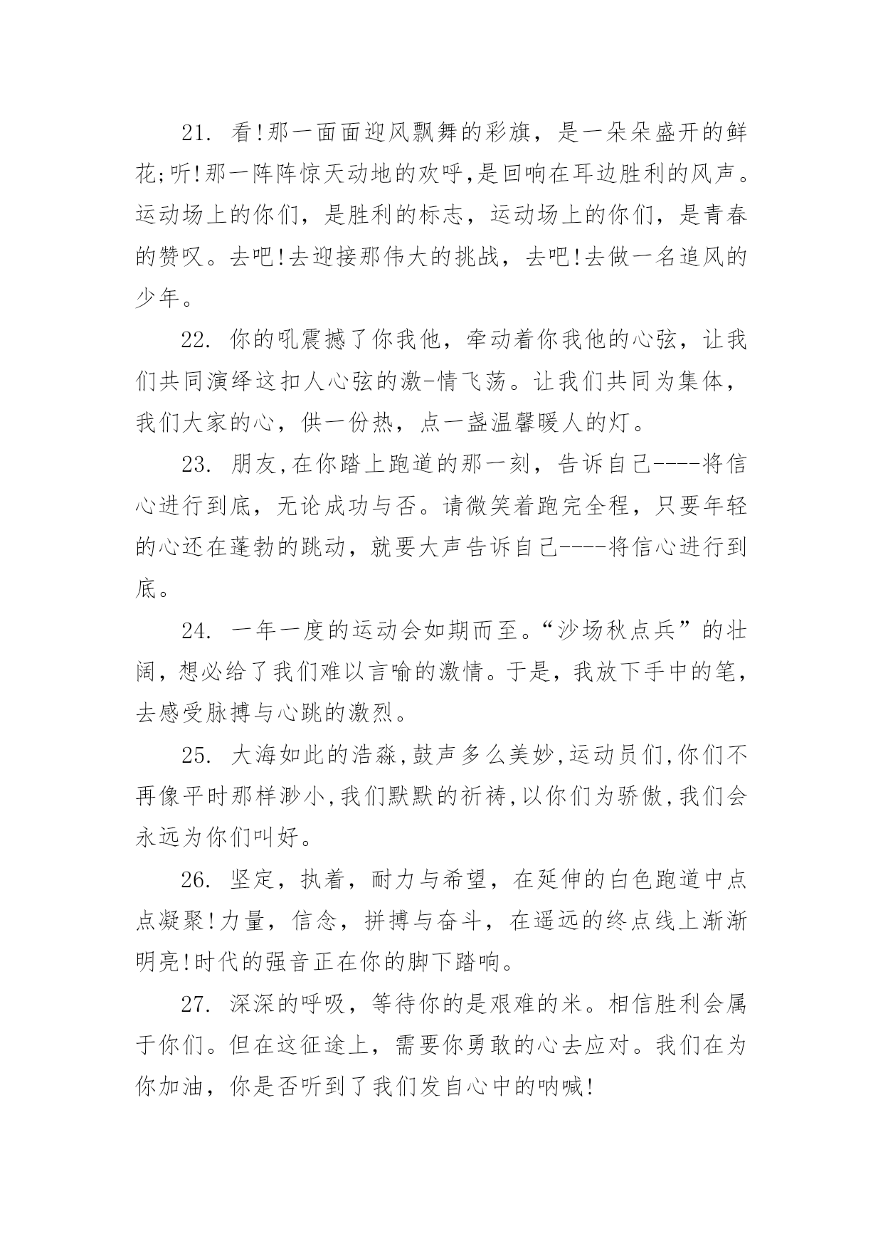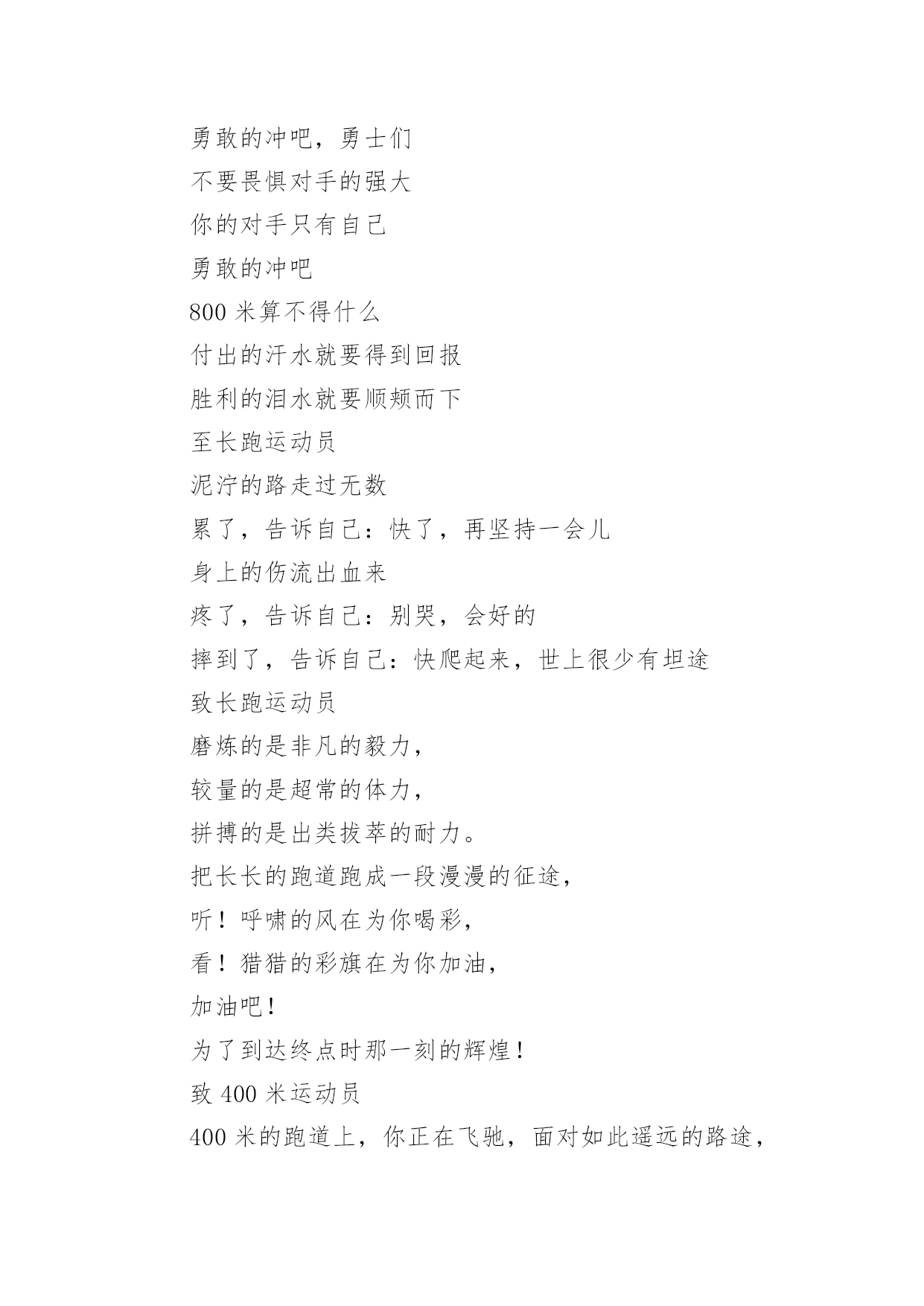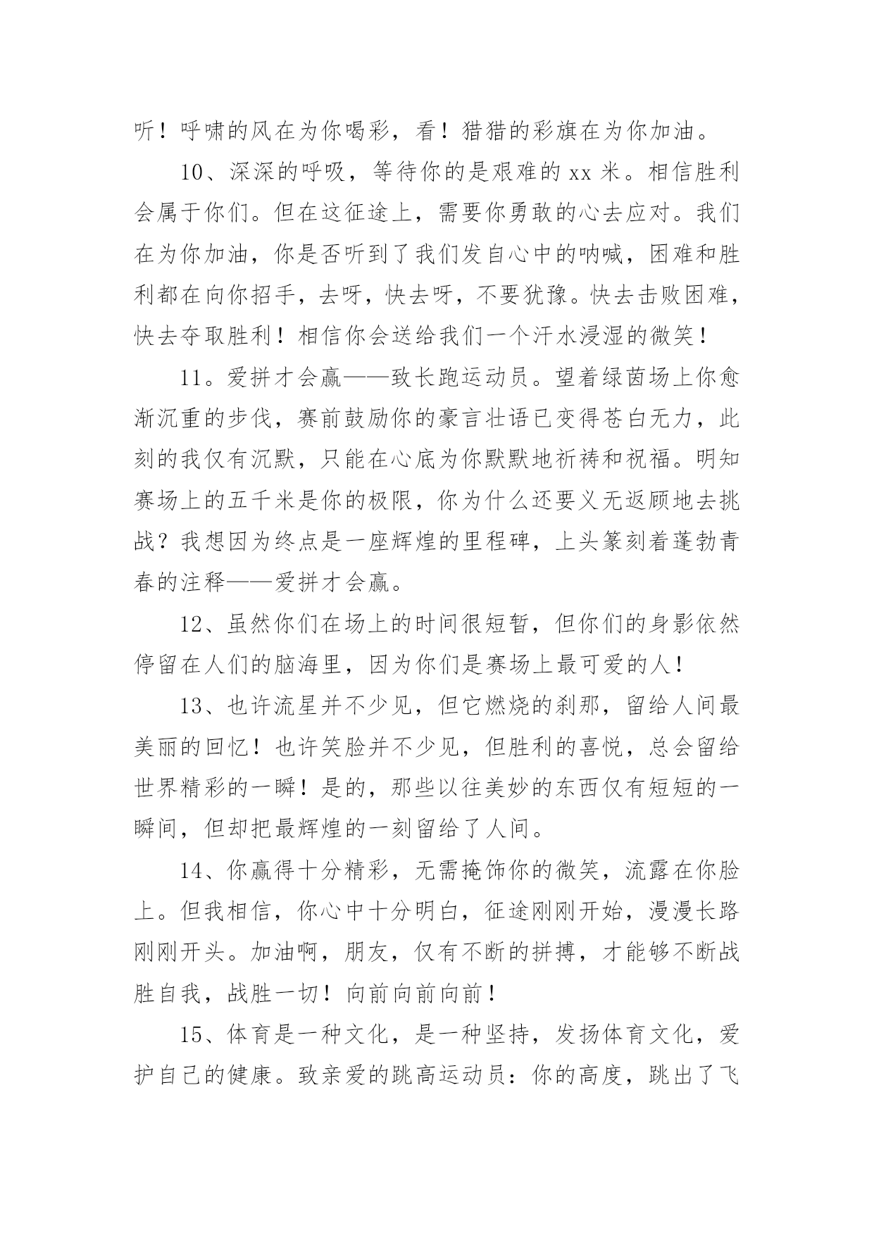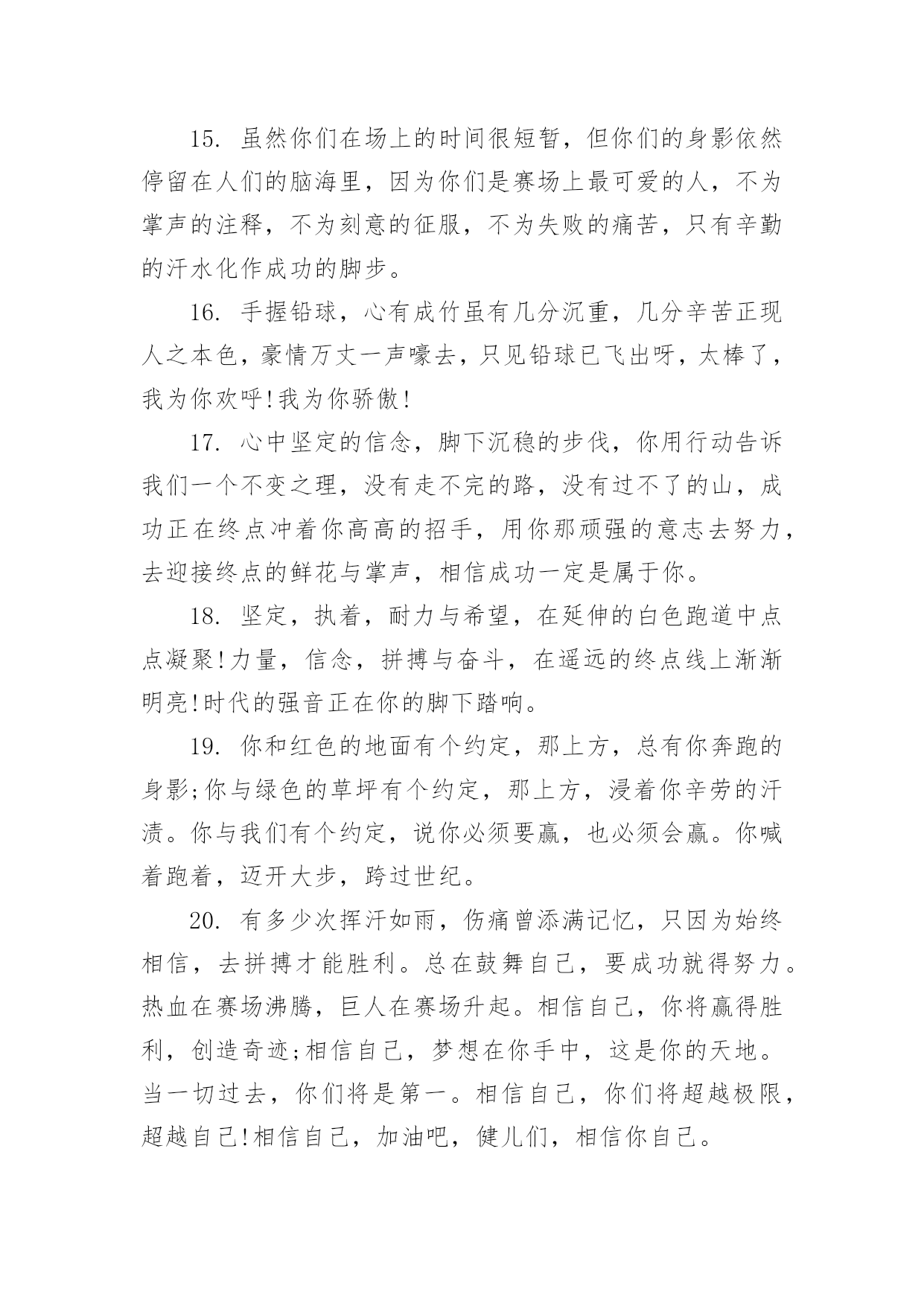 运动会加油稿(经典)运动会加油稿15篇随着社会一步步向前发展,很多地方都会使用到加油稿,借助加油稿可以给对方传达鼓励。那要怎么写好加油稿呢?以下是小编为大家整理的运动会加油稿,欢迎阅读,希望大家能够喜欢。运动会加油稿1蔚蓝的天空下,有你矫健的身影,热闹的操场上,有你坚定的步伐,美丽的鲜花后,有你辛勤的汗水,我们的喝彩中,有你的自豪与骄傲!体育健儿们,我们知道你们的`辛勤,我们了解你们的辛苦。加油吧!不论你是成功还是失败,我们都是你们坚强的后盾。胜也爱你,败也爱你,我们永远支持你,你们永远是“最特别的运动会加油稿21、利吧!跨过那一瞬,转过那道弯,胜利在向你招手。2、起跑线上,你们一字排开,健美的肌肉蕴涵着爆发力量,坚定的目光充满了自信。枪响了,你们开始了并不长的征程,笔直的跑道上,有你们稳健的足迹;不远的的终点,将留下你们冲刺时矫健的身影。拼搏吧,掌声将为你响起;奋斗吧,胜利和鲜花将属于你们。3、大地属于你,蓝天属于你,在你一跃的瞬间,同时跃出了我们的期望。草儿欣赏你,白云欢迎你,身轻如燕,飞跃蓝天,奥林匹克精神在你的身上体现。跳吧,跳出你的自信,跳出你的顶尖,跳出你的胜利山巅。4、蔚蓝的天空下,有你们矫健的身影,热闹的操场上,有你们坚定的步伐,美丽的鲜花后,有你们辛勤的汗水,我们的喝彩中,有你们的骄傲和自豪!5、心中坚定的信念,脚下沉稳的步伐,你用行动告诉我们一个不变之理,没有走不完的路,没有过不了的山,成功正在终点冲着你高高的招手,用你那顽强的意志去努力,去迎接终点的鲜花与掌声,相信成功一定属于你。6、年轻的我们自信飞扬,青春的气息如同初升的朝阳,蓬勃的力量如同阳光的挥洒。此时此刻,跑道便是我们精彩的舞台,声声加油便是我们的奖项!论何成功,谈何荣辱,心中的信念只有一个:拼搏!7、运动场上有你们的飒爽英姿,运动场上有你们拼搏的身影,面对漫漫的征程,你没有畏惧和退缩,任汗水打湿脊背,任疲惫爬满全身,依然奋力追赶,只有一个目标,只有一个信念,为班级赢得荣誉,拼搏吧,我为你们呐喊,加油。8、虽然你们在场上的时间很短暂,但你们的.身影依然停留在人们的脑海里,因为你们是赛场上最可爱的人。9、磨炼的是非凡的毅力,较量的是超常的体力,拼搏的是出类拔萃的耐力,把长长的跑道跑成一段漫漫的征途,听!呼啸的风在为你喝彩,看!猎猎的彩旗在为你加油。10、深深的呼吸,等待你的是艰难的xx米。相信胜利会属于你们。但在这征途上,需要你勇敢的心去应对。我们在为你加油,你是否听到了我们发自心中的呐喊,困难和胜利都在向你招手,去呀,快去呀,不要犹豫。快去击败困难,快去夺取胜利!相信你会送给我们一个汗水浸湿的微笑!11。爱拼才会赢——致长跑运动员。望着绿茵场上你愈渐沉重的步伐,赛前鼓励你的豪言壮语已变得苍白无力,此刻的我仅有沉默,只能在心底为你默默地祈祷和祝福。明知赛场上的五千米是你的极限,你为什么还要义无返顾地去挑战?我想因为终点是一座辉煌的里程碑,上头篆刻着蓬勃青春的注释——爱拼才会赢。12、虽然你们在场上的时间很短暂,但你们的身影依然停留在人们的脑海里,因为你们是赛场上最可爱的人!13、也许流星并不少见,但它燃烧的刹那,留给人间最美丽的回忆!也许笑脸并不少见,但胜利的喜悦,总会留给世界精彩的一瞬!是的,那些以往美妙的东西仅有短短的一瞬间,但却把最辉煌的一刻留给了人间。14、你赢得十分精彩,无需掩饰你的微笑,流露在你脸上。但我相信,你心中十分明白,征途刚刚开始,漫漫长路刚刚开头。加油啊,朋友,仅有不断的拼搏,才能够不断战胜自我,战胜一切!向前向前向前!15、体育是一种文化,是一种坚持,发扬体育文化,爱护自己的健康。致亲爱的跳高运动员:你的高度,跳出了飞扬,你的跳跃,飞出了优美。在阳光的照耀下,显得是那么的光芒万丈,你是那么的伟大。运动会加油稿3你只要,全身心准备好。梦想在前方我们向前奔跑,生命中谁都要有个目标。谁在风中,风中燃烧。谁在雨中,雨中舞蹈。梦想前方,就在今朝。让世界把我们知道!赛场上的旋律你听那激烈奔跑的脚步声,震撼大地。你听那欢呼加油的呐喊声,催人奋进。赛场上的旋律,如旋风般急速,如号角般激扬,如激流般奔腾不息。创新!突破!超越!永远是赛场上最激动人心的旋律。至800米运动员迎接你的,是800米跑道等待你的.,是漫漫征途勇敢的冲吧,勇士们不要畏惧对手的强大你的对手只有自己勇敢的冲吧800米算不得什么付出的汗水就要得到回报胜利的泪水就要顺颊而下至长跑运动员泥泞的路走过无数累了,告诉自己:快了,再坚持一会儿身上的伤流出血来疼了,告诉自己:别哭,会好的摔到了,告诉自己:快爬起来,世上很少有坦途致长跑运动员磨炼的是非凡的毅力,较量的是超常的体力,拼搏的是出类拔萃的耐力。把长长的跑道跑成一段漫漫的征途,听!呼啸的风在为你喝彩,看!猎猎的彩旗在为你加油,