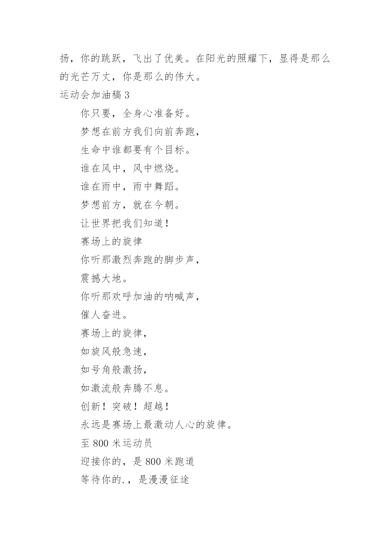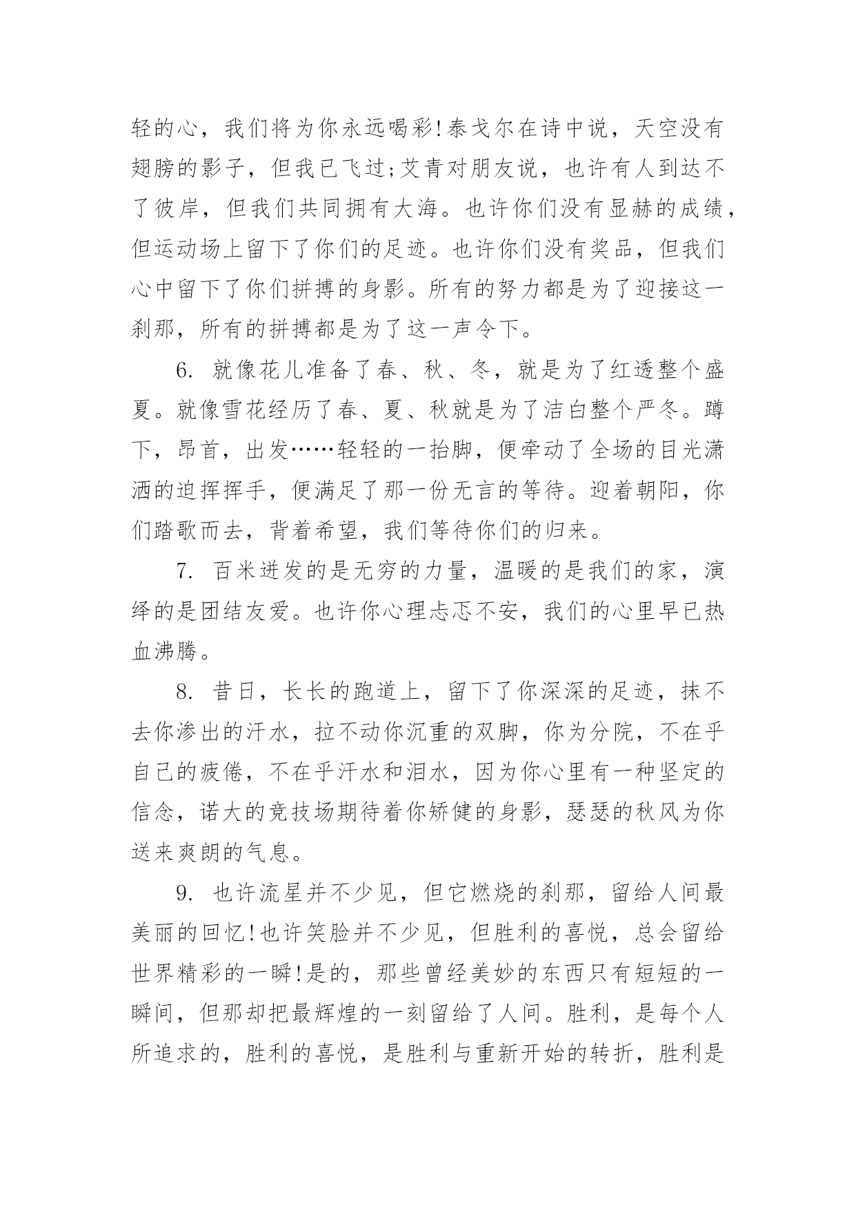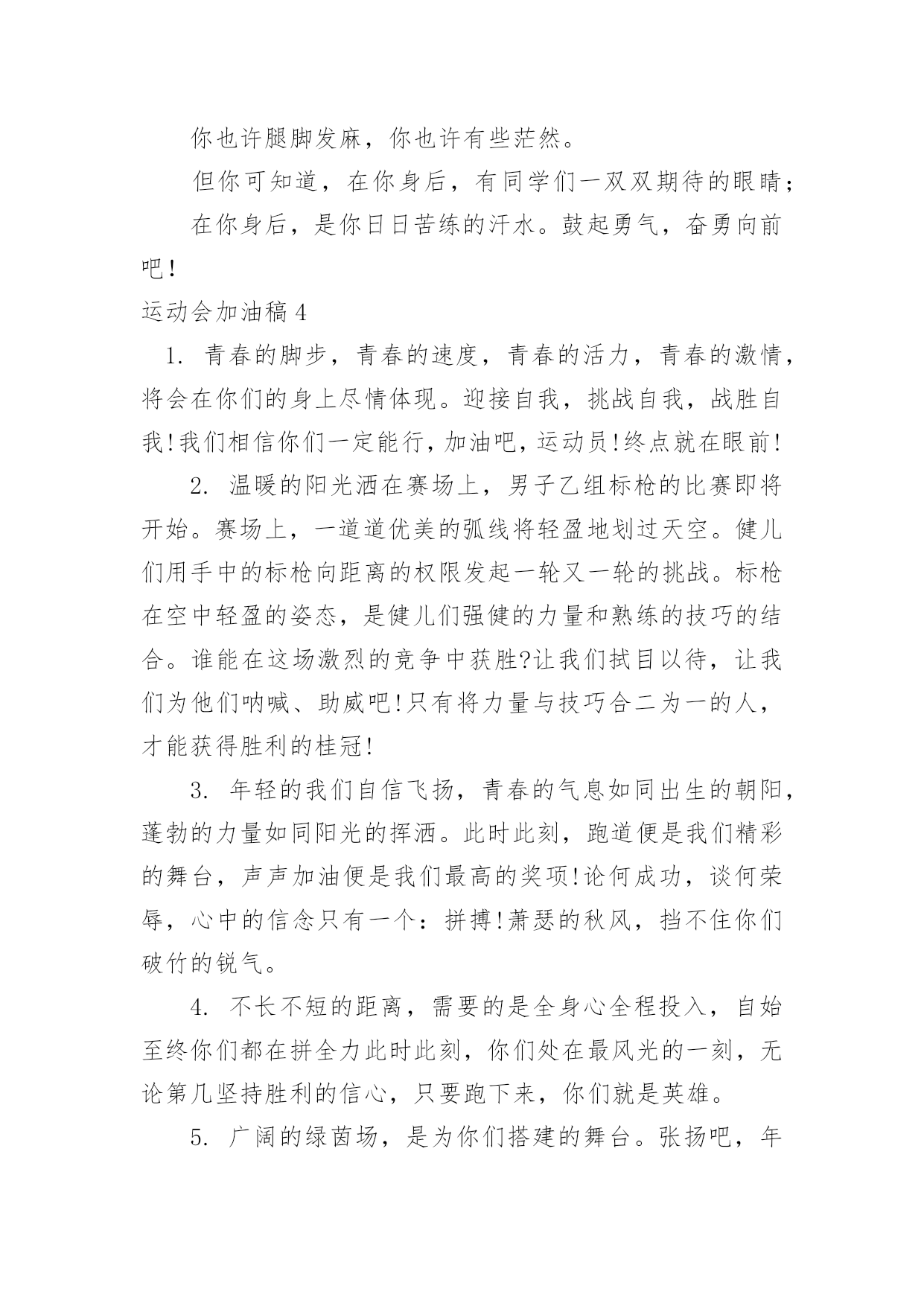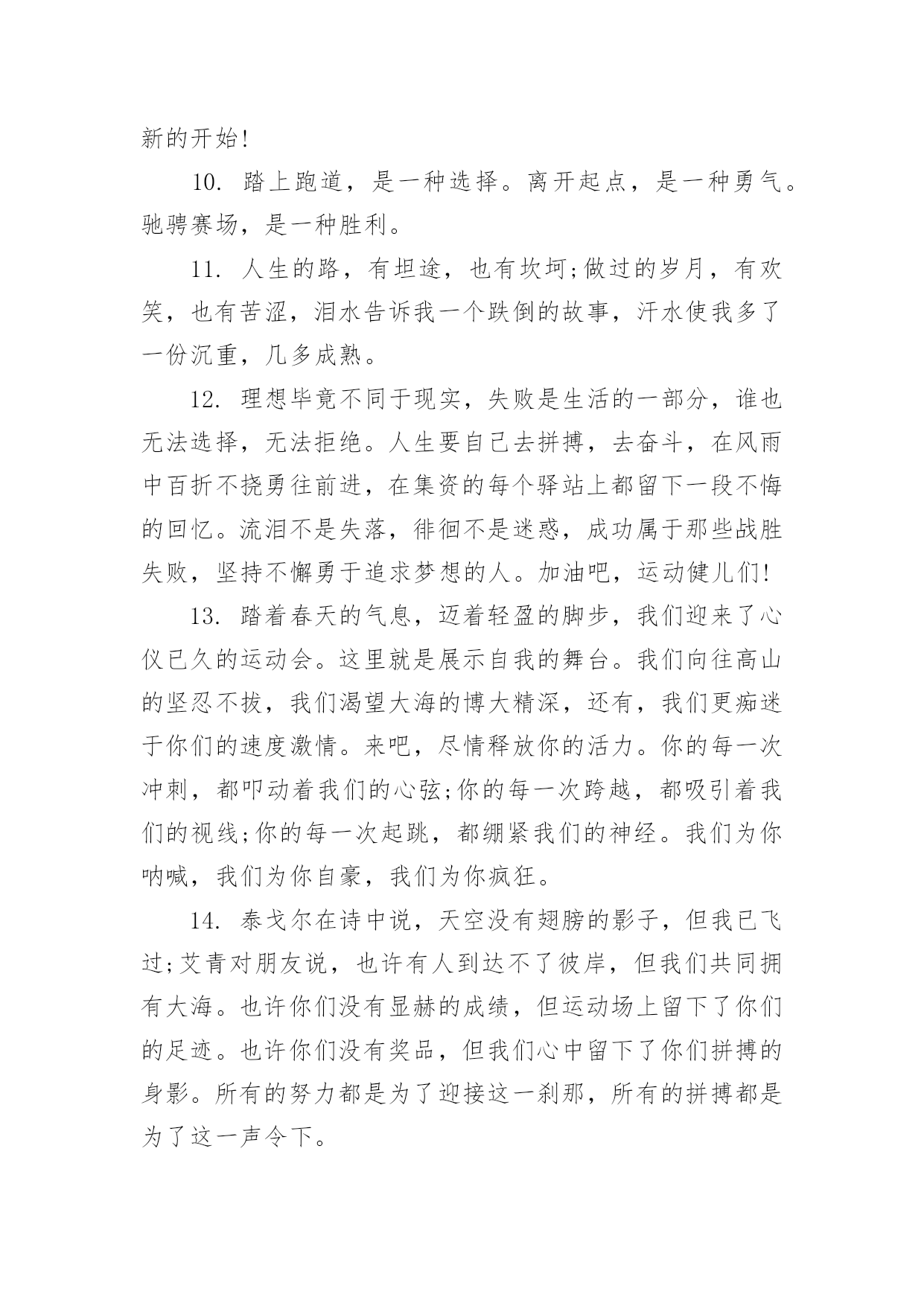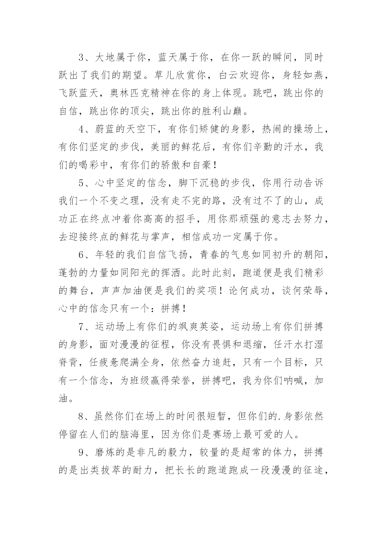 运动会加油稿(经典)运动会加油稿15篇随着社会一步步向前发展,很多地方都会使用到加油稿,借助加油稿可以给对方传达鼓励。那要怎么写好加油稿呢?以下是小编为大家整理的运动会加油稿,欢迎阅读,希望大家能够喜欢。运动会加油稿1蔚蓝的天空下,有你矫健的身影,热闹的操场上,有你坚定的步伐,美丽的鲜花后,有你辛勤的汗水,我们的喝彩中,有你的自豪与骄傲!体育健儿们,我们知道你们的`辛勤,我们了解你们的辛苦。加油吧!不论你是成功还是失败,我们都是你们坚强的后盾。胜也爱你,败也爱你,我们永远支持你,你们永远是“最特别的运动会加油稿21、利吧!跨过那一瞬,转过那道弯,胜利在向你招手。2、起跑线上,你们一字排开,健美的肌肉蕴涵着爆发力量,坚定的目光充满了自信。枪响了,你们开始了并不长的征程,笔直的跑道上,有你们稳健的足迹;不远的的终点,将留下你们冲刺时矫健的身影。拼搏吧,掌声将为你响起;奋斗吧,胜利和鲜花将属于你们。3、大地属于你,蓝天属于你,在你一跃的瞬间,同时跃出了我们的期望。草儿欣赏你,白云欢迎你,身轻如燕,飞跃蓝天,奥林匹克精神在你的身上体现。跳吧,跳出你的自信,跳出你的顶尖,跳出你的胜利山巅。4、蔚蓝的天空下,有你们矫健的身影,热闹的操场上,有你们坚定的步伐,美丽的鲜花后,有你们辛勤的汗水,我们的喝彩中,有你们的骄傲和自豪!5、心中坚定的信念,脚下沉稳的步伐,你用行动告诉我们一个不变之理,没有走不完的路,没有过不了的山,成功正在终点冲着你高高的招手,用你那顽强的意志去努力,去迎接终点的鲜花与掌声,相信成功一定属于你。6、年轻的我们自信飞扬,青春的气息如同初升的朝阳,蓬勃的力量如同阳光的挥洒。此时此刻,跑道便是我们精彩的舞台,声声加油便是我们的奖项!论何成功,谈何荣辱,心中的信念只有一个:拼搏!7、运动场上有你们的飒爽英姿,运动场上有你们拼搏的身影,面对漫漫的征程,你没有畏惧和退缩,任汗水打湿脊背,任疲惫爬满全身,依然奋力追赶,只有一个目标,只有一个信念,为班级赢得荣誉,拼搏吧,我为你们呐喊,加油。8、虽然你们在场上的时间很短暂,但你们的.身影依然停留在人们的脑海里,因为你们是赛场上最可爱的人。9、磨炼的是非凡的毅力,较量的是超常的体力,拼搏的是出类拔萃的耐力,把长长的跑道跑成一段漫漫的征途,听!呼啸的风在为你喝彩,看!猎猎的彩旗在为你加油。10、深深的呼吸,等待你的是艰难的xx米。相信胜利会属于你们。但在这征途上,需要你勇敢的心去应对。我们在为你加油,你是否听到了我们发自心中的呐喊,困难和胜利都在向你招手,去呀,快去呀,不要犹豫。快去击败困难,快去夺取胜利!相信你会送给我们一个汗水浸湿的微笑!11。爱拼才会赢——致长跑运动员。望着绿茵场上你愈渐沉重的步伐,赛前鼓励你的豪言壮语已变得苍白无力,此刻的我仅有沉默,只能在心底为你默默地祈祷和祝福。明知赛场上的五千米是你的极限,你为什么还要义无返顾地去挑战?我想因为终点是一座辉煌的里程碑,上头篆刻着蓬勃青春的注释——爱拼才会赢。12、虽然你们在场上的时间很短暂,但你们的身影依然停留在人们的脑海里,因为你们是赛场上最可爱的人!13、也许流星并不少见,但它燃烧的刹那,留给人间最美丽的回忆!也许笑脸并不少见,但胜利的喜悦,总会留给世界精彩的一瞬!是的,那些以往美妙的东西仅有短短的一瞬间,但却把最辉煌的一刻留给了人间。14、你赢得十分精彩,无需掩饰你的微笑,流露在你脸上。但我相信,你心中十分明白,征途刚刚开始,漫漫长路刚刚开头。加油啊,朋友,仅有不断的拼搏,才能够不断战胜自我,战胜一切!向前向前向前!15、体育是一种文化,是一种坚持,发扬体育文化,爱护自己的健康。致亲爱的跳高运动员:你的高度,跳出了飞扬,你的跳跃,飞出了优美。在阳光的照耀下,显得是那么的光芒万丈,你是那么的伟大。运动会加油稿3你只要,全身心准备好。梦想在前方我们向前奔跑,生命中谁都要有个目标。谁在风中,风中燃烧。谁在雨中,雨中舞蹈。梦想前方,就在今朝。让世界把我们知道!赛场上的旋律你听那激烈奔跑的脚步声,震撼大地。你听那欢呼加油的呐喊声,催人奋进。赛场上的旋律,如旋风般急速,如号角般激扬,如激流般奔腾不息。创新!突破!超越!永远是赛场上最激动人心的旋律。至800米运动员迎接你的,是800米跑道等待你的.,是漫漫征途勇敢的冲吧,勇士们不要畏惧对手的强大你的对手只有自己勇敢的冲吧800米算不得什么付出的汗水就要得到回报胜利的泪水就要顺颊而下至长跑运动员泥泞的路走过无数累了,告诉自己:快了,再坚持一会儿身上的伤流出血来疼了,告诉自己:别哭,会好的摔到了,告诉自己:快爬起来,世上很少有坦途致长跑运动员磨炼的是非凡的毅力,较量的是超常的体力,拼搏的是出类拔萃的耐力。把长长的跑道跑成一段漫漫的征途,听!呼啸的风在为你喝彩,看!猎猎的彩旗在为你加油,