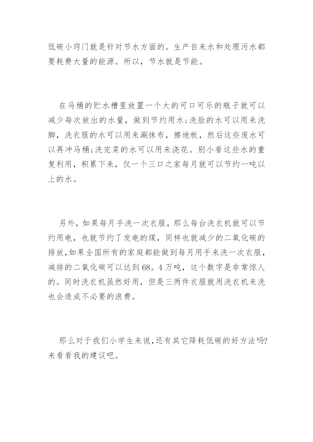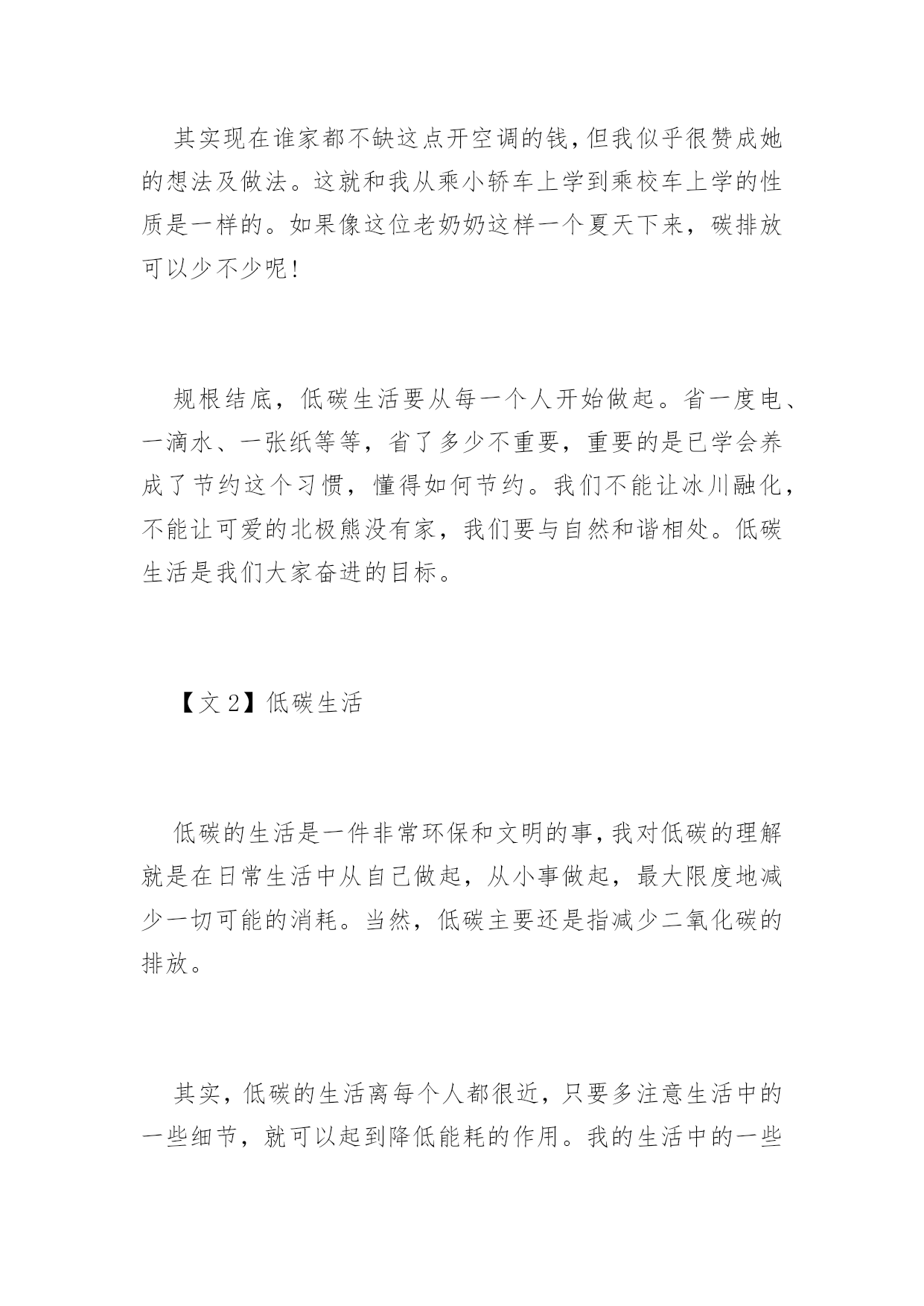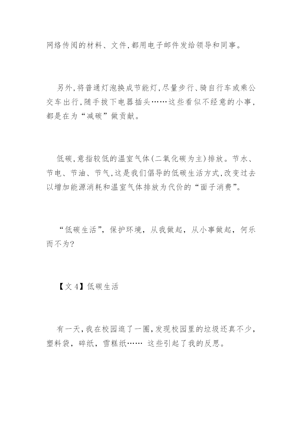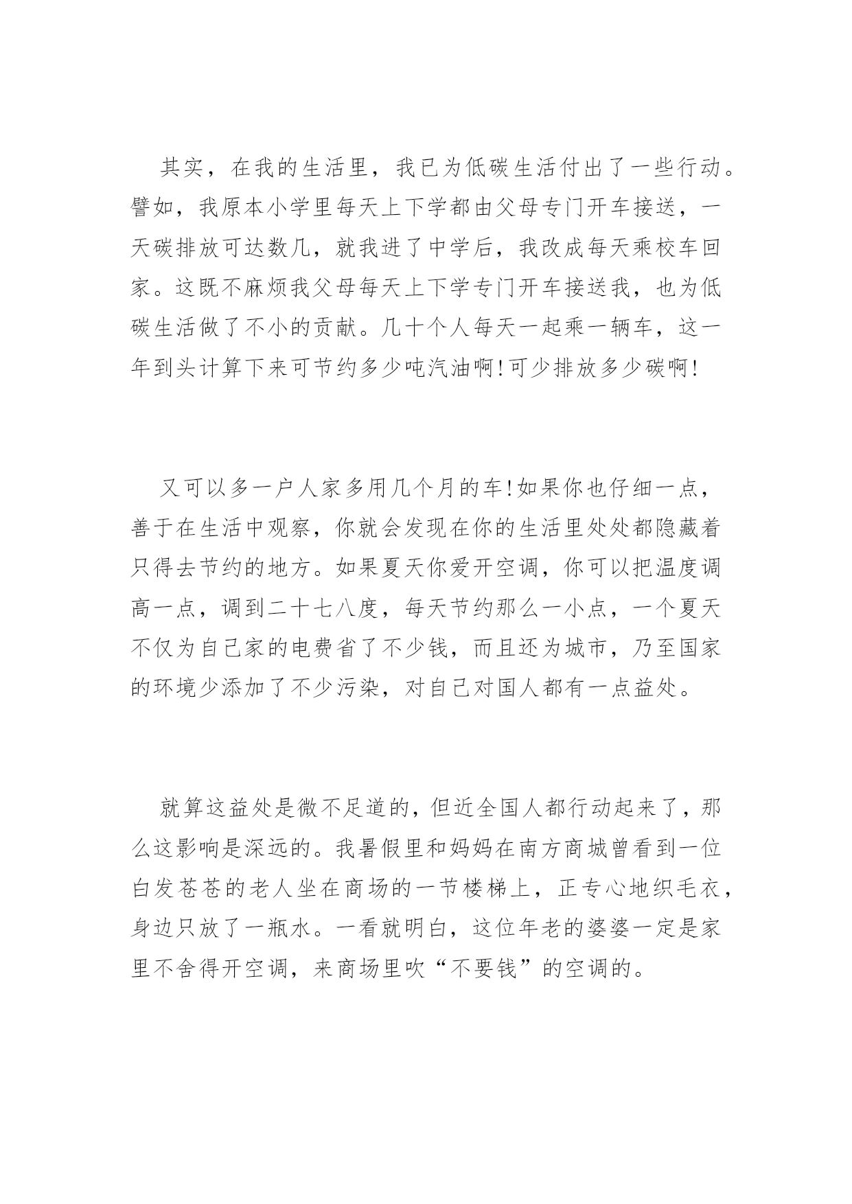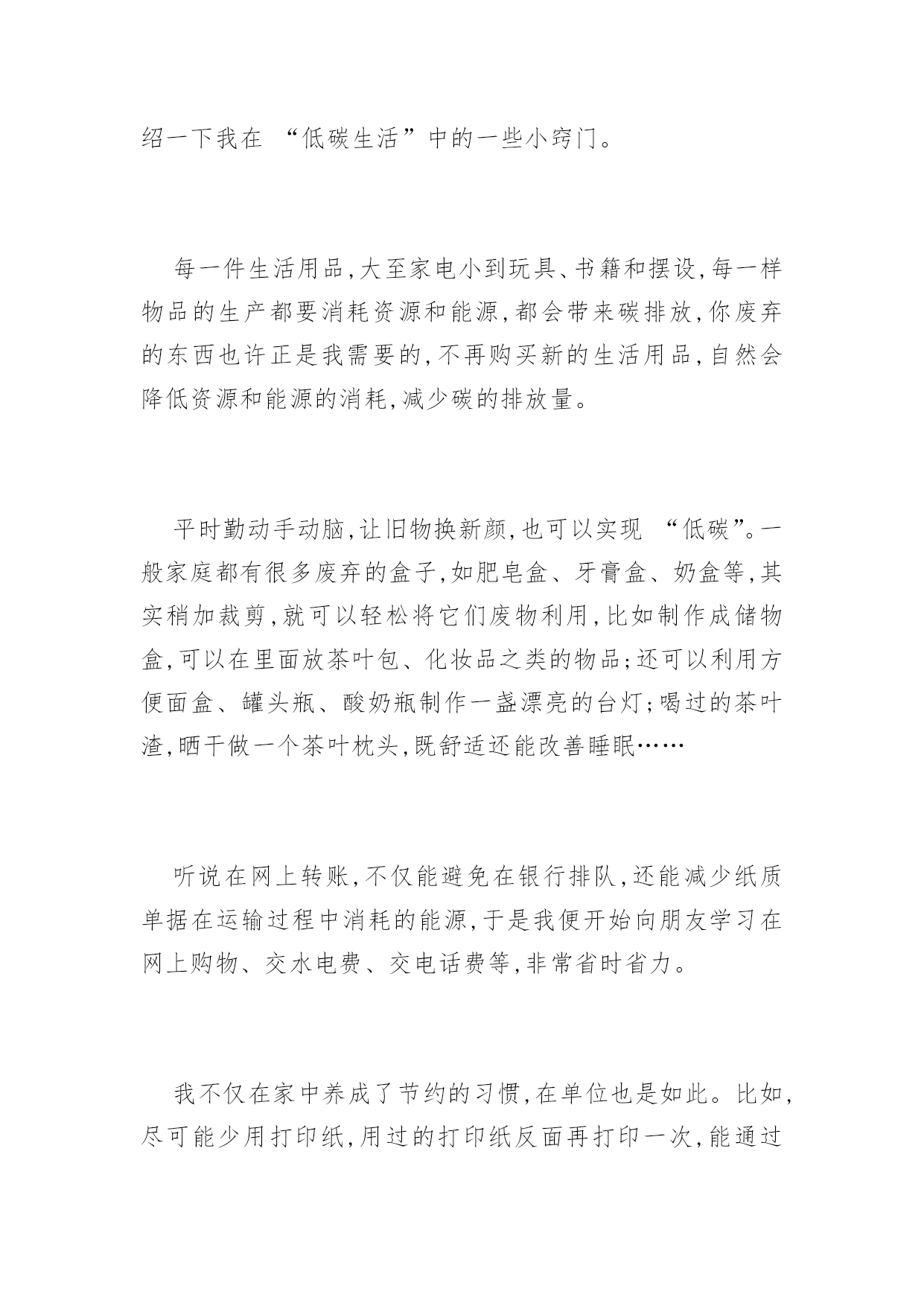 低碳生活的作文科技高速发达的今天,环境的污染也不容忽视。有一种新的生活方式也随之出现了,这种生活方式就叫做“低碳生活”。这种在生活中尽量采用低能耗、低排放的生活方式,小编也是很赞同的哦。毕竟,保护环境,从我做起嘛!【文1】低碳生活每当我看到上班族们天天挤地铁上班时,心里总有一个想法,为什么他们要挤地铁上班?他们为什么不开车上班?心里却从没有想过乘地铁对环境的好处,对城市的环境有什么好处,对国家的环境有什么好处,甚至对世界有什么好处。“碳”对众人来说都很熟悉,它危害着我们的地球,危害着我们生存的环境,也危害着我们的健康。这么一说,世界上的碳排放要是能少排放一点就是一点,毕竟他对我们来说是有害的,但想让他少排放出来一点,可不是凭口上随便说说的,要有实际行动。其实,在我的生活里,我已为低碳生活付出了一些行动。譬如,我原本小学里每天上下学都由父母专门开车接送,一天碳排放可达数几,就我进了中学后,我改成每天乘校车回家。这既不麻烦我父母每天上下学专门开车接送我,也为低碳生活做了不小的贡献。几十个人每天一起乘一辆车,这一年到头计算下来可节约多少吨汽油啊!可少排放多少碳啊!又可以多一户人家多用几个月的车!如果你也仔细一点,善于在生活中观察,你就会发现在你的生活里处处都隐藏着只得去节约的地方。如果夏天你爱开空调,你可以把温度调高一点,调到二十七八度,每天节约那么一小点,一个夏天不仅为自己家的电费省了不少钱,而且还为城市,乃至国家的环境少添加了不少污染,对自己对国人都有一点益处。就算这益处是微不足道的,但近全国人都行动起来了,那么这影响是深远的。我暑假里和妈妈在南方商城曾看到一位白发苍苍的老人坐在商场的一节楼梯上,正专心地织毛衣,身边只放了一瓶水。一看就明白,这位年老的婆婆一定是家里不舍得开空调,来商场里吹“不要钱”的空调的。其实现在谁家都不缺这点开空调的钱,但我似乎很赞成她的想法及做法。这就和我从乘小轿车上学到乘校车上学的性质是一样的。如果像这位老奶奶这样一个夏天下来,碳排放可以少不少呢!规根结底,低碳生活要从每一个人开始做起。省一度电、一滴水、一张纸等等,省了多少不重要,重要的是已学会养成了节约这个习惯,懂得如何节约。我们不能让冰川融化,不能让可爱的北极熊没有家,我们要与自然和谐相处。低碳生活是我们大家奋进的目标。【文2】低碳生活低碳的生活是一件非常环保和文明的事,我对低碳的理解就是在日常生活中从自己做起,从小事做起,最大限度地减少一切可能的消耗。当然,低碳主要还是指减少二氧化碳的排放。其实,低碳的生活离每个人都很近,只要多注意生活中的一些细节,就可以起到降低能耗的作用。我的生活中的一些低碳小窍门就是针对节水方面的。生产自来水和处理污水都要耗费大量的能源。所以,节水就是节能。在马桶的贮水槽里放置一个大的可口可乐的瓶子就可以减少每次放出的水量,做到节约用水;洗脸的水可以用来洗脚,洗衣服的水可以用来涮抹布,擦地板,然后这些废水可以再冲马桶;洗完菜的水可以用来浇花。别小看这些水的重复利用,积累下来,仅一个三口之家每月就可以节约一吨以上的水。另外,如果每月手洗一次衣服,那么每台洗衣机就可以节约用电,也就节约了发电的煤,同样也就减少的二氧化碳的排放,如果全国所有的家庭都能做到每月用手来洗一次衣服,减排的二氧化碳可以达到68。4万吨,这个数字是非常惊人的。同时洗衣机虽然好用,但是三两件衣服就用洗衣机来洗也会造成不必要的浪费。那么对于我们小学生来说,还有其它降耗低碳的好方法吗?来看看我的建议吧。纸张的双面使用,节约用纸;不用一次性的筷子和一次性的饭盒;不用一次性的塑料袋;减少粮食的浪费;随手关灯,随手管好水龙头。我们的地球需要我们共同来爱护,让我们从身边的小事做起,珍惜资源,降低能耗,让我们的生活更加美好。【文3】低碳生活尽管哥本哈根气候大会已经召开,但很多人还是对“低碳”不是很了解。其实,“低碳”就在我们身边。下面,我简单介绍一下我在“低碳生活”中的一些小窍门。每一件生活用品,大至家电小到玩具、书籍和摆设,每一样物品的生产都要消耗资源和能源,都会带来碳排放,你废弃的东西也许正是我需要的,不再购买新的生活用品,自然会降低资源和能源的消耗,减少碳的排放量。平时勤动手动脑,让旧物换新颜,也可以实现“低碳”。一般家庭都有很多废弃的盒子,如肥皂盒、牙膏盒、奶盒等,其实稍加裁剪,就可以轻松将它们废物利用,比如制作成储物盒,可以在里面放茶叶包、化妆品之类的物品;还可以利用方便面盒、罐头瓶、酸奶瓶制作一盏漂亮的台灯;喝过的茶叶渣,晒干做一个茶叶枕头,既舒适还能改善睡眠……听说在网上转账,不仅能避免在银行排队,还能减少纸质单据在运输过程中消耗的能源,于是我便开始向朋友学习在网上购物、交水电费、交电话费等,非常省时省力