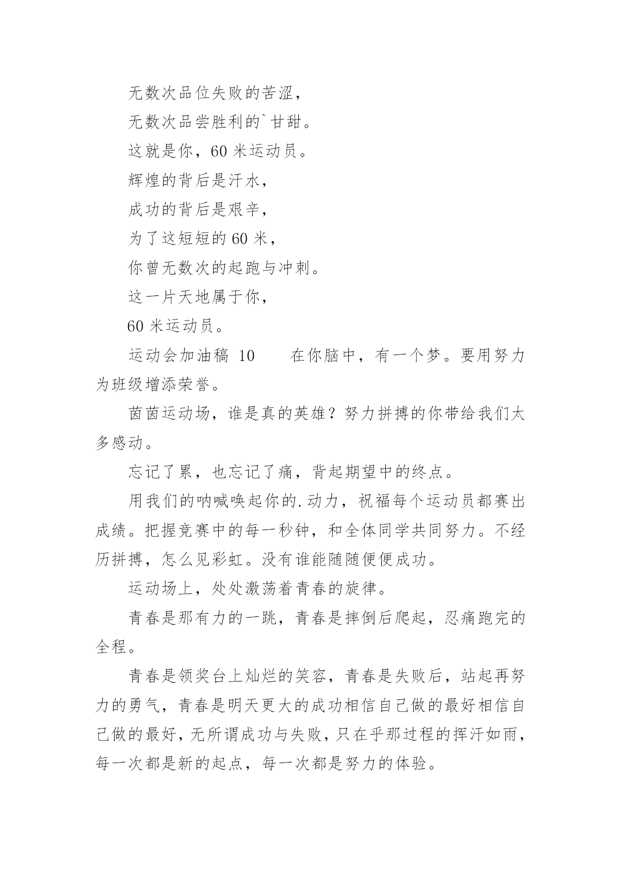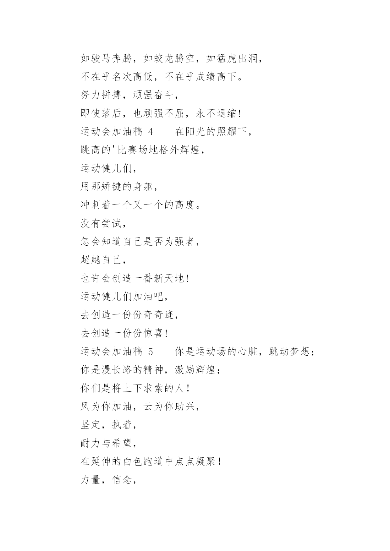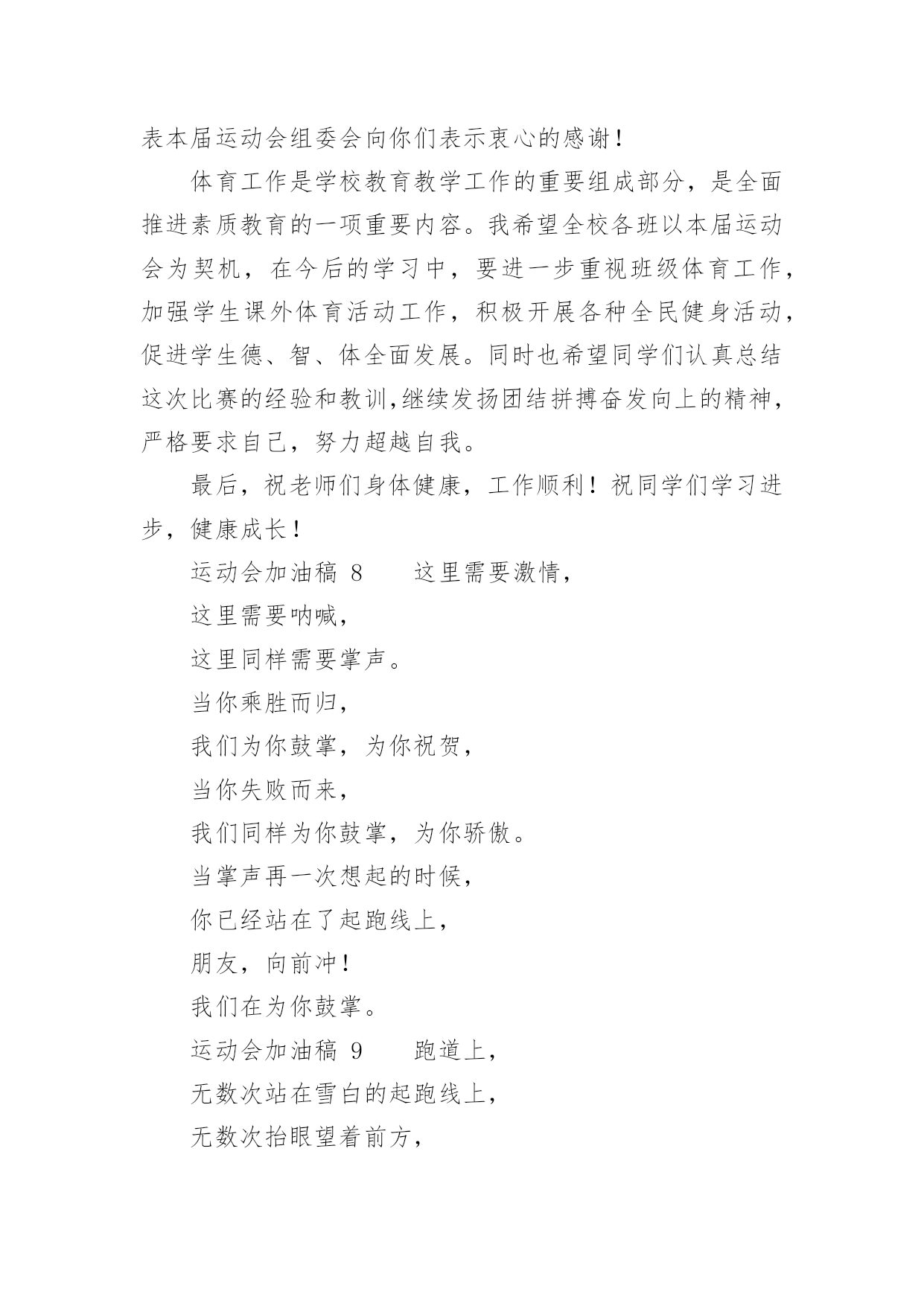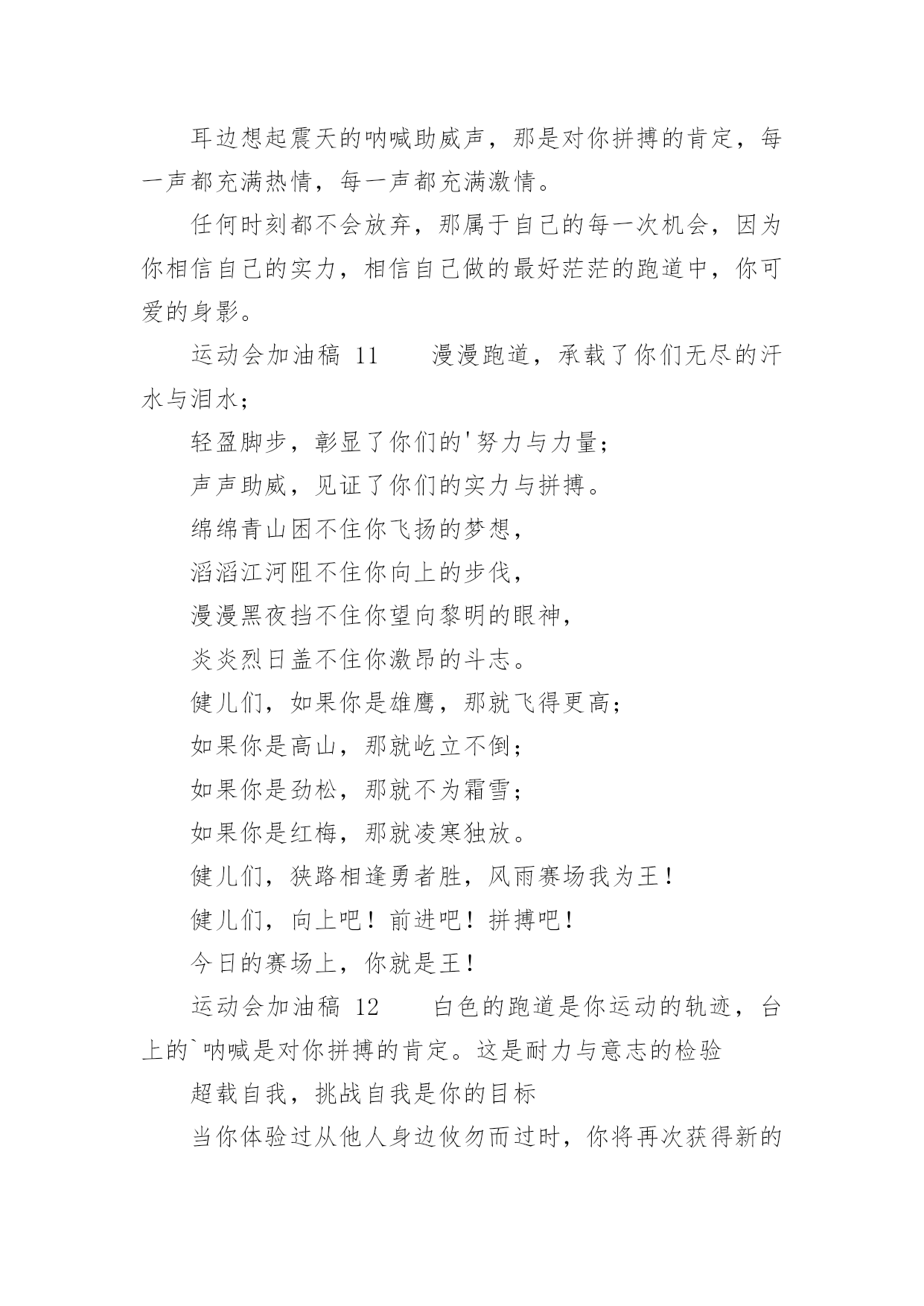 运动会加油稿运动会加油稿(精选21篇)在社会一步步向前发展的今天,用到加油稿的地方越来越多,加油稿可以促进对方完成目标的进程。相信许多人会觉得加油稿很难写吧,下面是小编精心整理的运动会加油稿,欢迎大家借鉴与参考,希望对大家有所帮助。运动会加油稿1无论成绩如何,我都会驻立在茫茫中,为你送上一份特别的祝福,人不是一件东西,而是一个置身于不断发展过程中的生命体,人的生命在运动。为何不让我们运动起来,让生命现出光彩呢?为何不让这个生命展现出无尽的光茫呢?让我们运动起来,一起展示我们的色彩。让我们解脱过重的学习负担,飞驰在运动场上。让我们为自已飞奔吧,把握住这一刻吧终于,迎来了这一刻;这是激动人心的一刻;这是今人兴奋的`一刻;这是千钧一发的一刻;这是关键的一刻,这是储蓄了好久的力量,终于要爆发的一刻。为了它,洒下了多少汗水,为了它,付出了多少心血。因此,把握住这一刻吧!运动会加油稿2我们不喜欢无云的.天空,我们不喜欢无泪的人生,因为,云朵也是一道风景,眼泪也是一种晶莹,不要总是遗憾,生命的美丽,常常在于过程,不要总是哀叹,一点点挫折,只会让人,越战越勇。运动会加油稿3为你们祝福,为你们喝彩。一声枪响伴着飒爽的秋风,你们亮出自己的风采,在这短短的100米中,你们与时间争分夺秒,只为了那最后的冲刺。不管结果如何,你们都是胜利者。因为,你们曾与时间竞赛。走过一段很长的`路,你用青春的脚步,敲出铿锵的音符。成功融入笑容,失败也有幸福。一双双期盼的目光,每个人脚下都有一条成功之路。为拼搏喝彩在黑白相间的跑道上,留下了你们灿烂的身影。在枪响的那一刹那,似流星、似闪电,如骏马奔腾,如蛟龙腾空,如猛虎出洞,不在乎名次高低,不在乎成绩高下。努力拼搏,顽强奋斗,即使落后,也顽强不屈,永不退缩!运动会加油稿4在阳光的照耀下,跳高的'比赛场地格外辉煌,运动健儿们,用那矫键的身躯,冲刺着一个又一个的高度。没有尝试,怎会知道自己是否为强者,超越自己,也许会创造一番新天地!运动健儿们加油吧,去创造一份份奇奇迹,去创造一份份惊喜!运动会加油稿5你是运动场的心脏,跳动梦想;你是漫长路的精神,激励辉煌;你们是将上下求索的人!风为你加油,云为你助兴,坚定,执着,耐力与希望,在延伸的白色跑道中点点凝聚!力量,信念,拼搏与奋斗,在遥远的'终点线上渐渐明亮!时代的强音正在你的脚下踏响。运动会加油稿6深深的呼吸,等待你的是艰难的5000米。相信胜利会属于你们。但在这征途上,需要你用勇敢的心去面对。我们在为你加油,你是否听到了我们发自心中的'呐喊?困难和胜利都在向你招手,去呀,快去呀,不要犹豫。快去击败困难、快去夺取胜利!相信你会送给我们一个汗水浸湿的微笑!运动会加油稿7一年一度的校运动会经过5天紧张有序的激烈角逐,已经圆满结束了。在此,我谨代表学校向本届运动会的圆满成功表示热烈的祝贺,向各位参判表示衷心的感谢!向在比赛中取得优异成绩的班级表示热烈的祝贺!本次运动会精彩纷呈。全体运动员自觉遵守比赛规程,听从指挥,服从裁判,发扬友谊第一,比赛第二和更高、更快、更强的体育精神,顽强拼搏,奋力争先,赛出了风格,赛出了友谊,赛出了水平,充分展示了我校学生体育运动的水平,全体裁判员严格遵守《裁判员守则》,认真履行工作职责,不辞劳苦,公正裁判。全体学生会工作人员辛勤工作,乐于奉献,服务周到,为保证运动会的.圆满成功作出了积极的贡献。对此,我代表本届运动会组委会向你们表示衷心的感谢!体育工作是学校教育教学工作的重要组成部分,是全面推进素质教育的一项重要内容。我希望全校各班以本届运动会为契机,在今后的学习中,要进一步重视班级体育工作,加强学生课外体育活动工作,积极开展各种全民健身活动,促进学生德、智、体全面发展。同时也希望同学们认真总结这次比赛的经验和教训,继续发扬团结拼搏奋发向上的精神,严格要求自己,努力超越自我。最后,祝老师们身体健康,工作顺利!祝同学们学习进步,健康成长!运动会加油稿8这里需要激情,这里需要呐喊,这里同样需要掌声。当你乘胜而归,我们为你鼓掌,为你祝贺,当你失败而来,我们同样为你鼓掌,为你骄傲。当掌声再一次想起的时候,你已经站在了起跑线上,朋友,向前冲!我们在为你鼓掌。运动会加油稿9跑道上,无数次站在雪白的起跑线上,无数次抬眼望着前方,无数次品位失败的苦涩,无数次品尝胜利的`甘甜。这就是你,60米运动员。辉煌的背后是汗水,成功的背后是艰辛,为了这短短的60米,你曾无数次的起跑与冲刺。这一片天地属于你,60米运动员。运动会加油稿10在你脑中,有一个梦。要用努力为班级增添荣誉。茵茵运动场,谁是真的英雄?努力拼搏的你带给我们太多感动。忘记了累,也忘记了痛,背起期望中的终点。用我们的呐喊唤起你的.动力,祝福每个运动员都赛出成绩。把握竞赛中的每一秒钟,和全体同学共同努力。不经历拼搏,怎