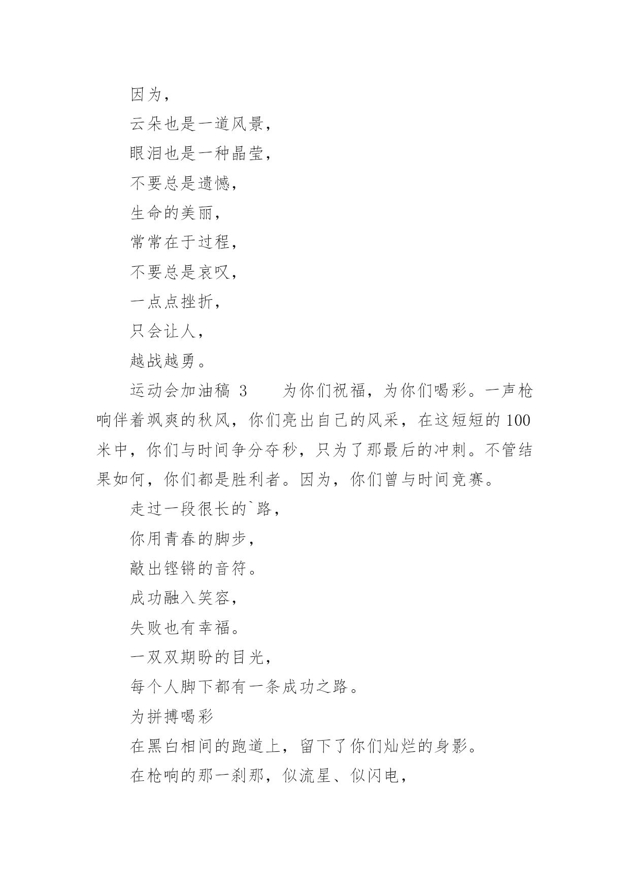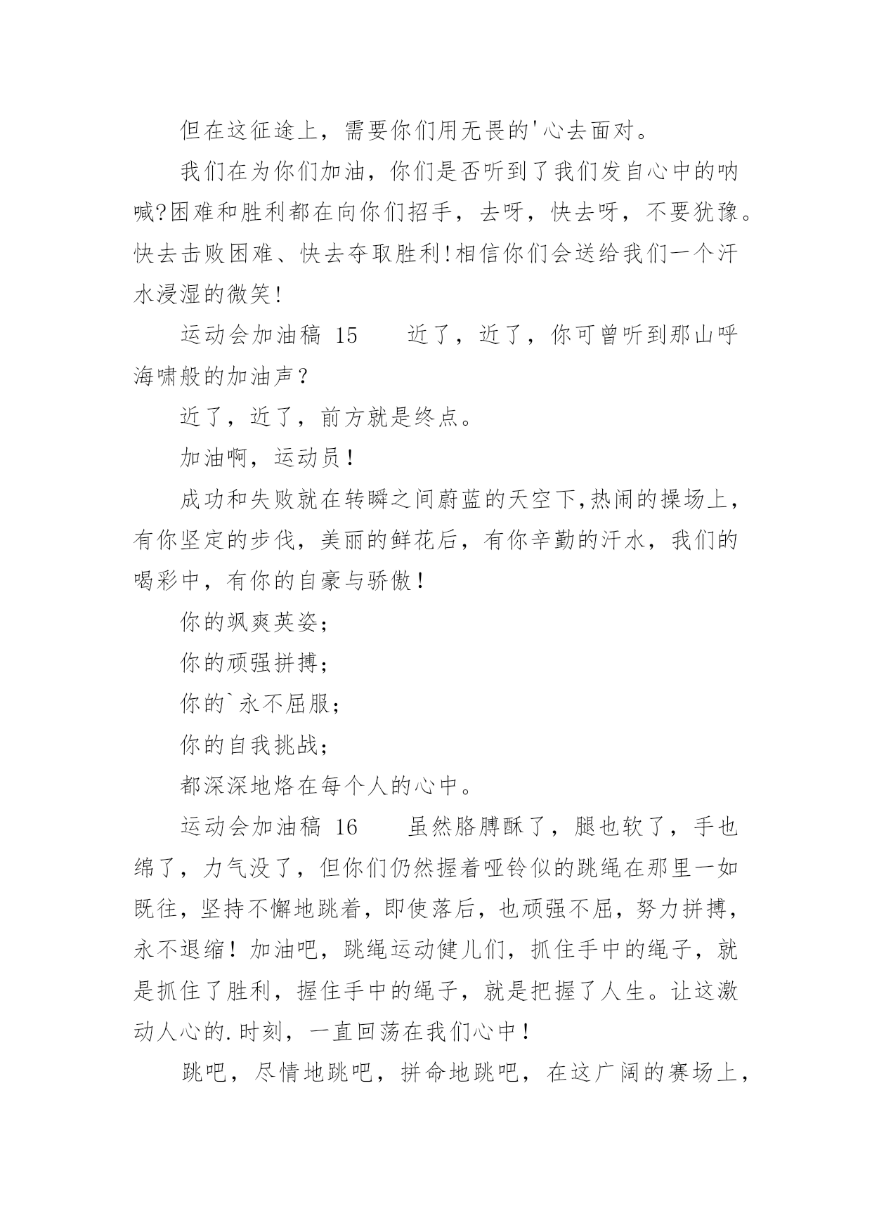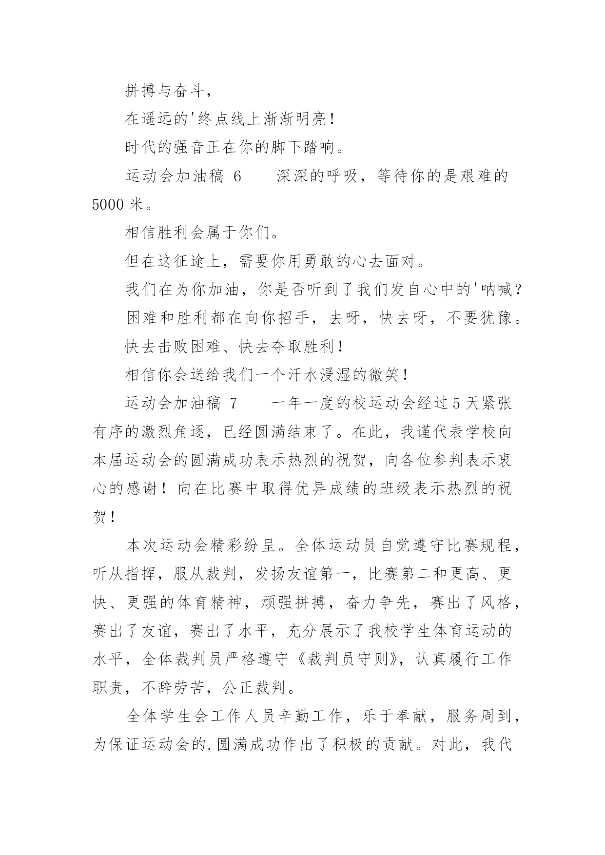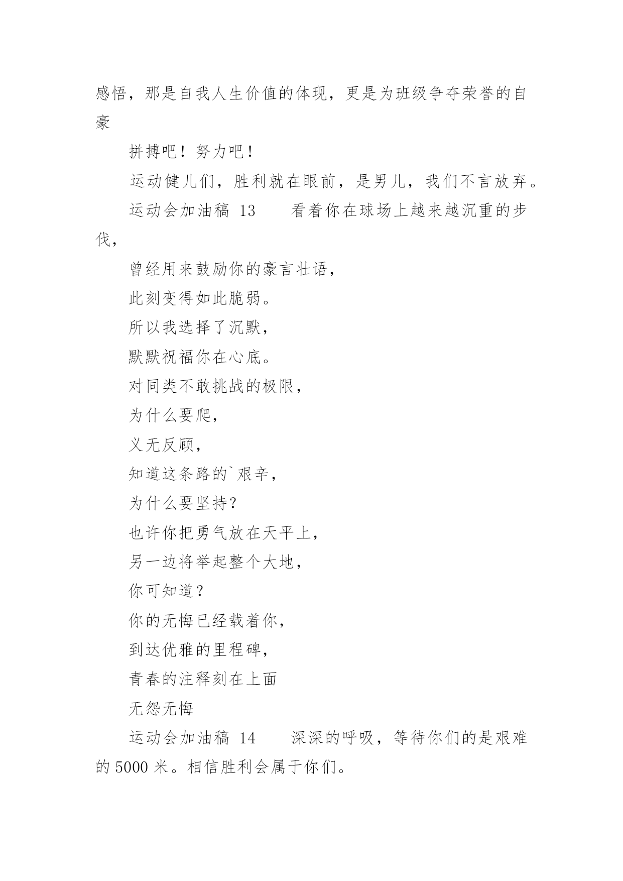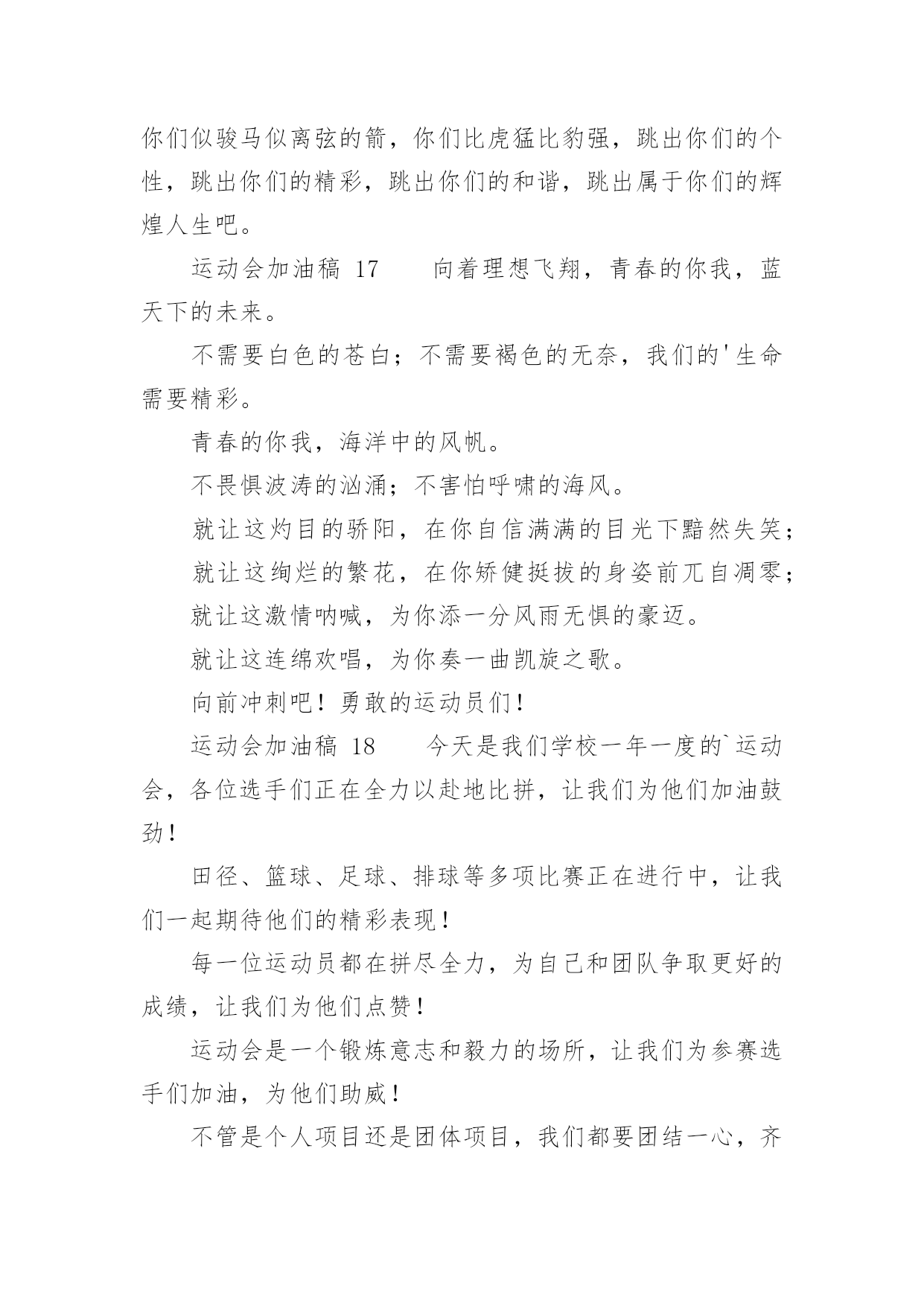 运动会加油稿运动会加油稿(精选21篇)在社会一步步向前发展的今天,用到加油稿的地方越来越多,加油稿可以促进对方完成目标的进程。相信许多人会觉得加油稿很难写吧,下面是小编精心整理的运动会加油稿,欢迎大家借鉴与参考,希望对大家有所帮助。运动会加油稿1无论成绩如何,我都会驻立在茫茫中,为你送上一份特别的祝福,人不是一件东西,而是一个置身于不断发展过程中的生命体,人的生命在运动。为何不让我们运动起来,让生命现出光彩呢?为何不让这个生命展现出无尽的光茫呢?让我们运动起来,一起展示我们的色彩。让我们解脱过重的学习负担,飞驰在运动场上。让我们为自已飞奔吧,把握住这一刻吧终于,迎来了这一刻;这是激动人心的一刻;这是今人兴奋的`一刻;这是千钧一发的一刻;这是关键的一刻,这是储蓄了好久的力量,终于要爆发的一刻。为了它,洒下了多少汗水,为了它,付出了多少心血。因此,把握住这一刻吧!运动会加油稿2我们不喜欢无云的.天空,我们不喜欢无泪的人生,因为,云朵也是一道风景,眼泪也是一种晶莹,不要总是遗憾,生命的美丽,常常在于过程,不要总是哀叹,一点点挫折,只会让人,越战越勇。运动会加油稿3为你们祝福,为你们喝彩。一声枪响伴着飒爽的秋风,你们亮出自己的风采,在这短短的100米中,你们与时间争分夺秒,只为了那最后的冲刺。不管结果如何,你们都是胜利者。因为,你们曾与时间竞赛。走过一段很长的`路,你用青春的脚步,敲出铿锵的音符。成功融入笑容,失败也有幸福。一双双期盼的目光,每个人脚下都有一条成功之路。为拼搏喝彩在黑白相间的跑道上,留下了你们灿烂的身影。在枪响的那一刹那,似流星、似闪电,如骏马奔腾,如蛟龙腾空,如猛虎出洞,不在乎名次高低,不在乎成绩高下。努力拼搏,顽强奋斗,即使落后,也顽强不屈,永不退缩!运动会加油稿4在阳光的照耀下,跳高的'比赛场地格外辉煌,运动健儿们,用那矫键的身躯,冲刺着一个又一个的高度。没有尝试,怎会知道自己是否为强者,超越自己,也许会创造一番新天地!运动健儿们加油吧,去创造一份份奇奇迹,去创造一份份惊喜!运动会加油稿5你是运动场的心脏,跳动梦想;你是漫长路的精神,激励辉煌;你们是将上下求索的人!风为你加油,云为你助兴,坚定,执着,耐力与希望,在延伸的白色跑道中点点凝聚!力量,信念,拼搏与奋斗,在遥远的'终点线上渐渐明亮!时代的强音正在你的脚下踏响。运动会加油稿6深深的呼吸,等待你的是艰难的5000米。相信胜利会属于你们。但在这征途上,需要你用勇敢的心去面对。我们在为你加油,你是否听到了我们发自心中的'呐喊?困难和胜利都在向你招手,去呀,快去呀,不要犹豫。快去击败困难、快去夺取胜利!相信你会送给我们一个汗水浸湿的微笑!运动会加油稿7一年一度的校运动会经过5天紧张有序的激烈角逐,已经圆满结束了。在此,我谨代表学校向本届运动会的圆满成功表示热烈的祝贺,向各位参判表示衷心的感谢!向在比赛中取得优异成绩的班级表示热烈的祝贺!本次运动会精彩纷呈。全体运动员自觉遵守比赛规程,听从指挥,服从裁判,发扬友谊第一,比赛第二和更高、更快、更强的体育精神,顽强拼搏,奋力争先,赛出了风格,赛出了友谊,赛出了水平,充分展示了我校学生体育运动的水平,全体裁判员严格遵守《裁判员守则》,认真履行工作职责,不辞劳苦,公正裁判。全体学生会工作人员辛勤工作,乐于奉献,服务周到,为保证运动会的.圆满成功作出了积极的贡献。对此,我代表本届运动会组委会向你们表示衷心的感谢!体育工作是学校教育教学工作的重要组成部分,是全面推进素质教育的一项重要内容。我希望全校各班以本届运动会为契机,在今后的学习中,要进一步重视班级体育工作,加强学生课外体育活动工作,积极开展各种全民健身活动,促进学生德、智、体全面发展。同时也希望同学们认真总结这次比赛的经验和教训,继续发扬团结拼搏奋发向上的精神,严格要求自己,努力超越自我。最后,祝老师们身体健康,工作顺利!祝同学们学习进步,健康成长!运动会加油稿8这里需要激情,这里需要呐喊,这里同样需要掌声。当你乘胜而归,我们为你鼓掌,为你祝贺,当你失败而来,我们同样为你鼓掌,为你骄傲。当掌声再一次想起的时候,你已经站在了起跑线上,朋友,向前冲!我们在为你鼓掌。运动会加油稿9跑道上,无数次站在雪白的起跑线上,无数次抬眼望着前方,无数次品位失败的苦涩,无数次品尝胜利的`甘甜。这就是你,60米运动员。辉煌的背后是汗水,成功的背后是艰辛,为了这短短的60米,你曾无数次的起跑与冲刺。这一片天地属于你,60米运动员。运动会加油稿10在你脑中,有一个梦。要用努力为班级增添荣誉。茵茵运动场,谁是真的英雄?努力拼搏的你带给我们太多感动。忘记了累,也忘记了痛,背起期望中的终点。用我们的呐喊唤起你的.动力,祝福每个运动员都赛出成绩。把握竞赛中的每一秒钟,和全体同学共同努力。不经历拼搏,怎