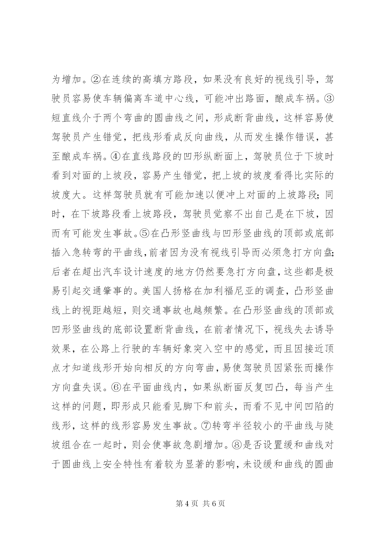 第PAGE\*Arabic\*MERGEFORMAT6页共NUMPAGES\*MERGEFORMAT6页道路线形与交通安全摘要。道路曲线实际上不是一条简单的平曲线或竖曲线,而应该是一条自由舒展的空间曲线,它既能够满足行车的力学性能,又能满足线形连续、指标均衡、视觉良好、景观协调、安全舒适等要求。车辆在行驶过程中,存在一条曲率连续变化的轨迹,无论车速高低,这一轨迹线都是客观存在的,它的形式和长度则随行驶速度、曲率半径和司机转动方向盘的快慢而定。在诸多的交通事故中,大部分驾驶员出事故的原因是由于困难的行驶条件所造成的,道路的几何要素或线形组合不合理,都有可能导致交通事故的发生。为此,本文针对道路线形和交通安全的关系进行论述,并探讨了合理的道路线形的设计与规划。关键词:交通安全道路线形关系规划0引言随着人们生活水平的提高,交通安全问题已成为人们最关心的问题。本文分析了道路交通事故产生的主要原因和道路线形与道路交通事故的关系,提出了用布劳斯曲线改进道路曲线的设计方法和道路线形设计方法,以满足行车的力学性能,同时满足线形连续、指标均衡、视觉良好、景观协调、安全舒适等要求,使道路曲线与地形和车辆的行驶轨迹达到完美的组合。在道路交通安全研究中,发现交通事故与道路设计不尽合理有关系。现行道路线形设计理论,以汽车行驶对道路的要求为依据,静止地套用公路技术标准上的规定,孤立地分析线形要素的尺寸。1道路线形与交通安全的关系分析公路的线形最终是以平面线形、纵断面线形和横断面形式组合而成的立体线形映入驾驶员眼帘的。驾驶员在驾驶车辆过程中所选定的实际行驶速度,是由他对三维立体线形的判断做出的。公路的立体线形除必须满足驾驶动力学要求的最小值外,还应满足驾驶员视觉心理方面连续、舒适的要求,反映公路线形好坏的关键是速度的连续性,它直接影响道路交通的安全。通过对多起交通事故的分析,我们发现。公路线形几何要素的不合理以及各种不良的线形组合,均可能导致交通事故的发生。1.1直线。过长的直线段,易使驾驶员因景观单调而产生疲劳,注意力不集中,反应迟缓,一旦有突显信息出现,就会因措手不及而肇事。另外,驾驶员在长直路段爱开快车,致使车辆进入直线路段末段后的曲线部分速度仍较高,若遇到弯道超高不足,往往导致倾覆或其它类型的交通事故。1.2曲线。据美国公路部门统计,在弯道上发生的事故约占全部事故的10%以上,特别是与陡坡和路面滑溜等情形加在一起时,发生在弯道上的事故要比直线上多。1.3平曲线。平曲线即弯道,平曲线与交通事故的关系很大。在圆曲线上,由于横向力的存在,对汽车的安全行驶会产生不利影响。大半径曲线比小半径曲线的事故率低;连续曲线当半径协调时事故率比不协调时低。调查表明曲率愈大,事故率愈高;尤其是曲率在10以上时,事故率急剧增大。原因是曲率越大,汽车在运行中的转弯半径越小,视线盲区增大。1.4竖曲线。由于道路的凸形竖曲线半径过小时,会影响到驾驶员的视距,使其视野变小,此时驾驶员不易发现前方情况,容易发生碰撞。凸形竖曲线上的视距越短,则交通事故也越频繁。1.5纵坡度。调查表明,在平原地区、丘陵地区和山区道路上,发生于坡道部分的交通事故分别占17%、18%和25%。分析坡道上交通事故率高的原因,主要是下坡时,驾驶员为节油常采取熄火滑行的操作方法,一旦遇到紧急情况来不及采取应急措施,此类事故约占坡道事故的24%,这样的事故案例不少。车辆下长坡时,由于重力作用,行驶速度过高,制动非安全区过长,频繁使用制动致使制动产生热衰减,遇有紧急情况不能及时停车,此种原因引起的事故占坡道事故的40%;车辆上坡行驶时,由于超越停放或后备功率较小的低速行驶车辆所造成的坡道事故占18%;由于其它原因引起的坡道事故占18%左右。1.6线形组合:行车安全性的大小与不同线形之间的组合是否协调有密切的关系,下列不良的线形组合往往是导致交通事故发生的重要原因:①线形的骤变,如长直线的末端设置急转弯曲线,尤其是长下坡(大于1km)接小半径曲线是有危险倾向的设计,易造成车辆在不自觉的高速情况下驶入平曲线,事故隐患大为增加。②在连续的高填方路段,如果没有良好的视线引导,驾驶员容易使车辆偏离车道中心线,可能冲出路面,酿成车祸。③短直线介于两个弯曲的圆曲线之间,形成断背曲线,这样容易使驾驶员产生错觉,把线形看成反向曲线,从而发生操作错误,甚至酿成车祸。④在直线路段的凹形纵断面上,驾驶员位于下坡时看到对面的上坡段,容易产生错觉,把上坡的坡度看得比实际的坡度大。这样驾驶员就有可能加速以便冲上对面的上坡路段;同时,在下坡路段看上坡路段,驾驶员觉察不出自己是在下坡,因而有可能发生事故。⑤在凸形竖曲线与凹形竖曲线的顶部或底部插入急转弯的平曲线,前者因为没有视线引导而必须急打方向盘;后者在超出汽车设计速度的