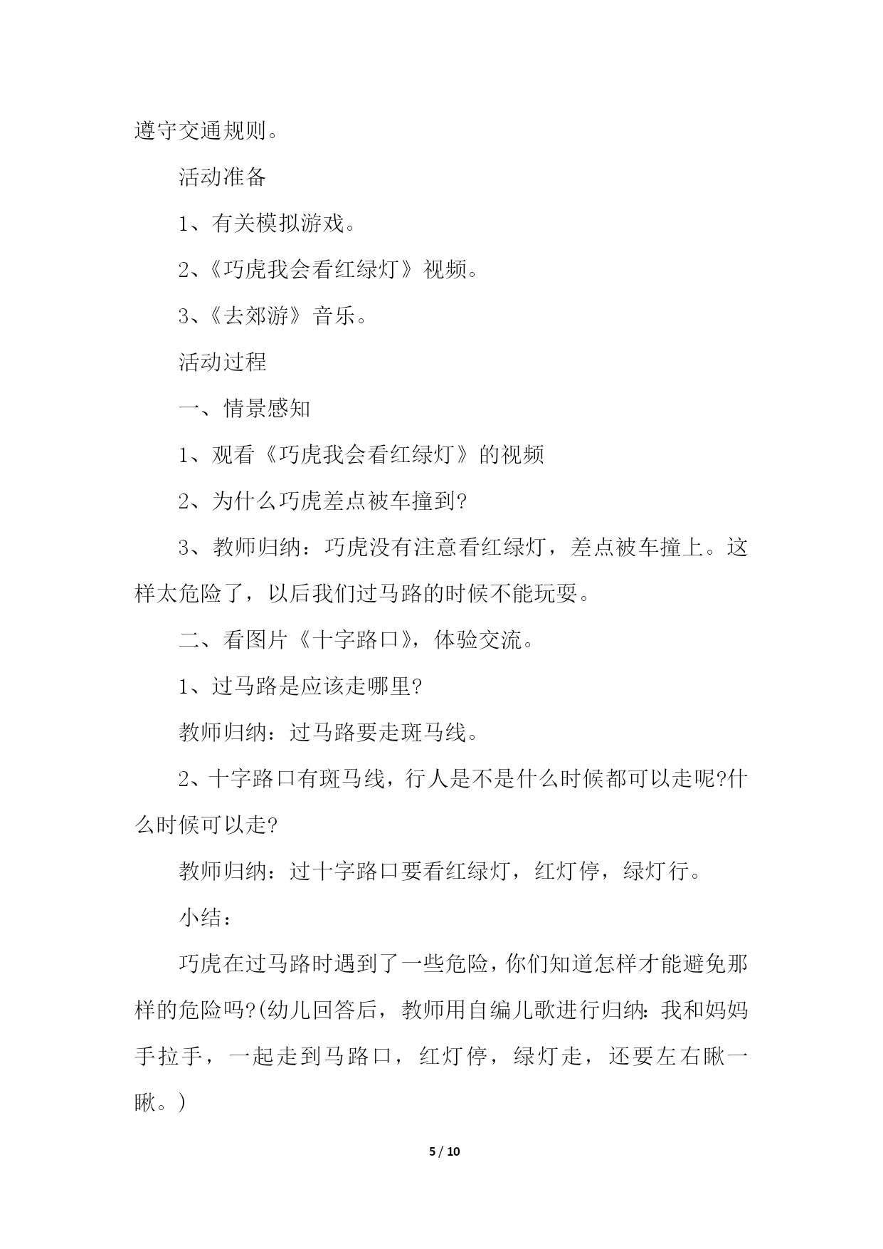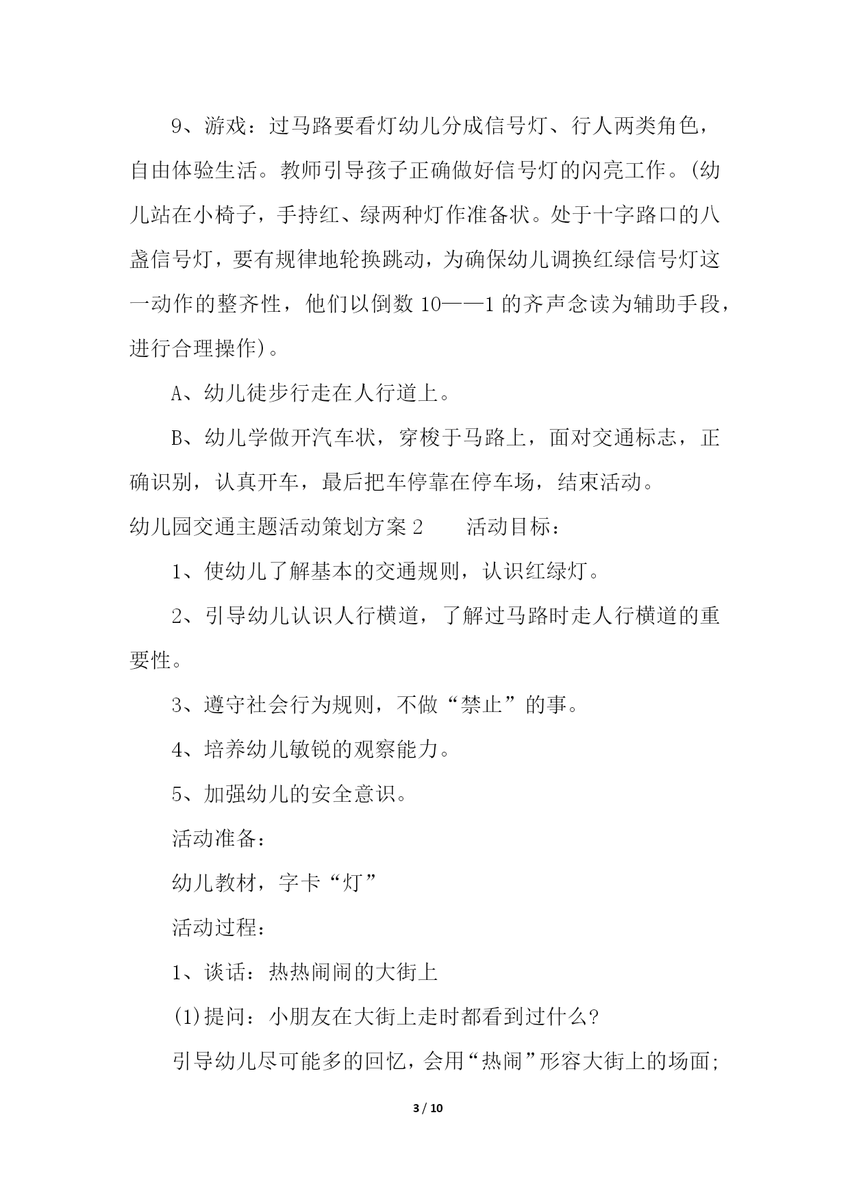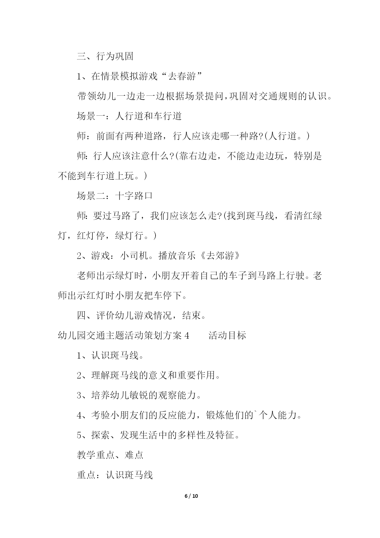 PAGE10/NUMPAGES10幼儿园交通主题活动策划方案幼儿园交通主题活动策划方案1活动目标:1、尝试了解各种不同的交通标志图,正确表达它们各自的作用。2、体验游戏的快乐,乐于遵守交通规则。3、加强幼儿的安全意识。4、探索、发现生活中的多样性及特征。5、遵守社会行为规则,不做“禁止”的事。活动准备:1、幼儿编写有关“交通标志图”的信息图片。2、立体的交通标志(停车标志、信号灯、左右转弯标志)。3、自制信号灯(红色八盏、绿色八盏)。4、“十字路口”场景布置。活动难点重点:活动难点:解读交通标志图。活动重点:让幼儿明白如何正确穿越“十字路口”。活动过程:1、“前些日子,老师请小朋友在马路上仔细寻找各类交通标志图,并画了下来,谢谢你们。今天,我们开展一个“交通标志图”的交流会,请小朋友把各自找到的标志图展示出来,并要用自己的语言完整讲述,让我们听明白这个标志图所表达的含义。”2、幼儿自由交流,展示标志图,表达具体含义。3、教师引导孩子设想路段的情况,以生动的例子、形象的手势,启发孩子理解标志图的作用。如某幼儿出示“禁止鸣喇叭”这个标志图后,教师引发幼儿思考:(1)这个路段旁可能有什么需要保持安静的建筑设施?(2)假如你听到连续的喇叭声,你会感觉如何?(3)预设的答案:可能幼儿园的小朋友正在睡午觉;可能医院里有病人需要休息;可能大哥哥大姐姐正在考试;(4)小结:当我们看到这个标志,在走过这个地方时,绝对不能鸣喇叭,要保持安静。4、“现在,老师扮演交通警阿姨。你们想不想当一个小记者来采访我?”5、教师引导孩子从交通警的职业情况、辛苦程度、交通手势等不同角度进行采访。6、具体了解民警在指挥交通时有什么手势?这些手势告诉我们哪些交通规则?(微笑立正表示对人尊重;右手掌往上,手心向外,体前平举表示请停下;右手臂侧举,来回移动表示前行)7、请幼儿学做民警阿姨指挥交通。8、“在十字路口,设有明显的交通标志图,叫什么名称?”(信号灯,也叫红绿灯)9、游戏:过马路要看灯幼儿分成信号灯、行人两类角色,自由体验生活。教师引导孩子正确做好信号灯的闪亮工作。(幼儿站在小椅子,手持红、绿两种灯作准备状。处于十字路口的八盏信号灯,要有规律地轮换跳动,为确保幼儿调换红绿信号灯这一动作的整齐性,他们以倒数10——1的齐声念读为辅助手段,进行合理操作)。A、幼儿徒步行走在人行道上。B、幼儿学做开汽车状,穿梭于马路上,面对交通标志,正确识别,认真开车,最后把车停靠在停车场,结束活动。幼儿园交通主题活动策划方案2活动目标:1、使幼儿了解基本的交通规则,认识红绿灯。2、引导幼儿认识人行横道,了解过马路时走人行横道的重要性。3、遵守社会行为规则,不做“禁止”的事。4、培养幼儿敏锐的观察能力。5、加强幼儿的安全意识。活动准备:幼儿教材,字卡“灯”活动过程:1、谈话:热热闹闹的大街上(1)提问:小朋友在大街上走时都看到过什么?引导幼儿尽可能多的回忆,会用“热闹”形容大街上的场面;(2)提问:“马路的路口有什么?红绿灯是做什么用的?”引导幼儿说出红绿灯,知道红灯停绿灯行的道路;(3)、提问:我们应该怎样过马路?引导幼儿知道过马路时要走人行横道;(4)、提问:如果没有了红绿灯会怎么样?引导幼儿通过讨论知道遵守交通规则的重要性。2、请幼儿做小司机,每人取一本书。3、请幼儿将书轻轻翻到提问:(1)请你看一看,图画中都画了什么?(2)图中画的是哪里?4、教师有感情地朗诵儿歌5、教师提问:鼓励幼儿大胆回答。幼儿园交通主题活动策划方案3活动目标1、幼儿能认识简单的交通标记。2、通过游戏,引导幼儿遵守交通规则,知道不乱穿马路,增强幼儿遵守交通规则的意识。3、增强幼儿与同伴合作的游戏的意识,体验游戏的快乐。4、探索、发现生活中的多样性及特征。5、加强幼儿的安全意识。教学重点、难点认识简单的交通标记,并能在游戏中巩固认识交通信号灯,遵守交通规则。活动准备1、有关模拟游戏。2、《巧虎我会看红绿灯》视频。3、《去郊游》音乐。活动过程一、情景感知1、观看《巧虎我会看红绿灯》的视频2、为什么巧虎差点被车撞到?3、教师归纳:巧虎没有注意看红绿灯,差点被车撞上。这样太危险了,以后我们过马路的时候不能玩耍。二、看图片《十字路口》,体验交流。1、过马路是应该走哪里?教师归纳:过马路要走斑马线。2、十字路口有斑马线,行人是不是什么时候都可以走呢?什么时候可以走?教师归纳:过十字路口要看红绿灯,红灯停,绿灯行。小结:巧虎在过马路时遇到了一些危险,你们知道怎样才能避免那样的危险吗?(幼儿回答后,教师用自编儿歌进行归纳:我和妈妈手拉手,一起走到马路口,红灯停,绿灯走,还要左右瞅一瞅。)三、行为巩固1、在情景模拟游戏“去春游”带领幼儿一边走一边根据场景提问,巩固对交通规则的认识。场景一:人行道和车行道