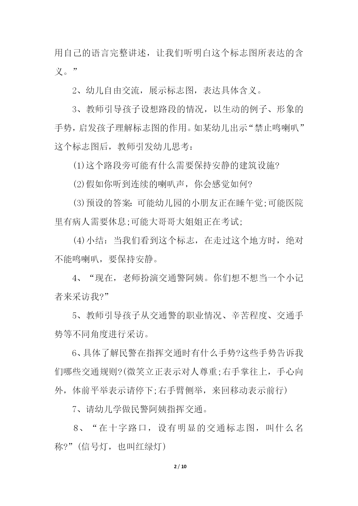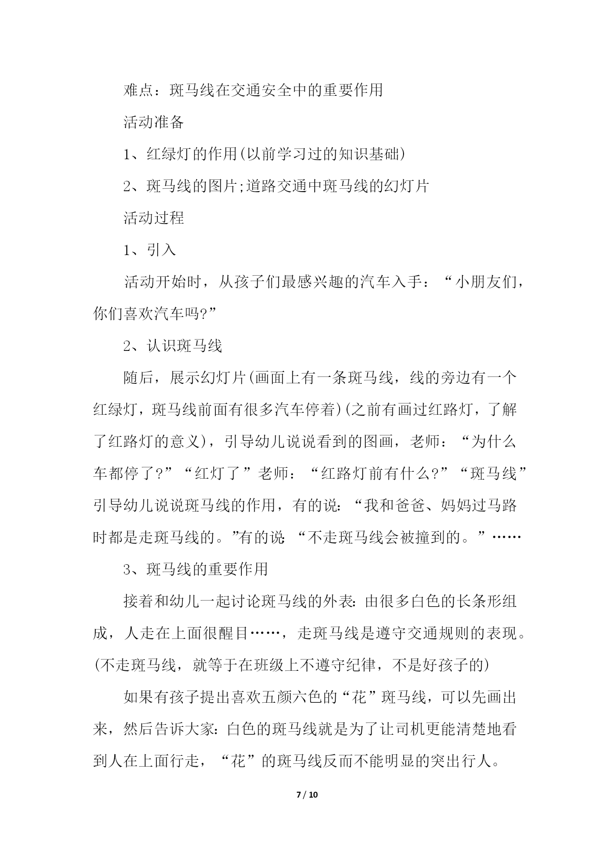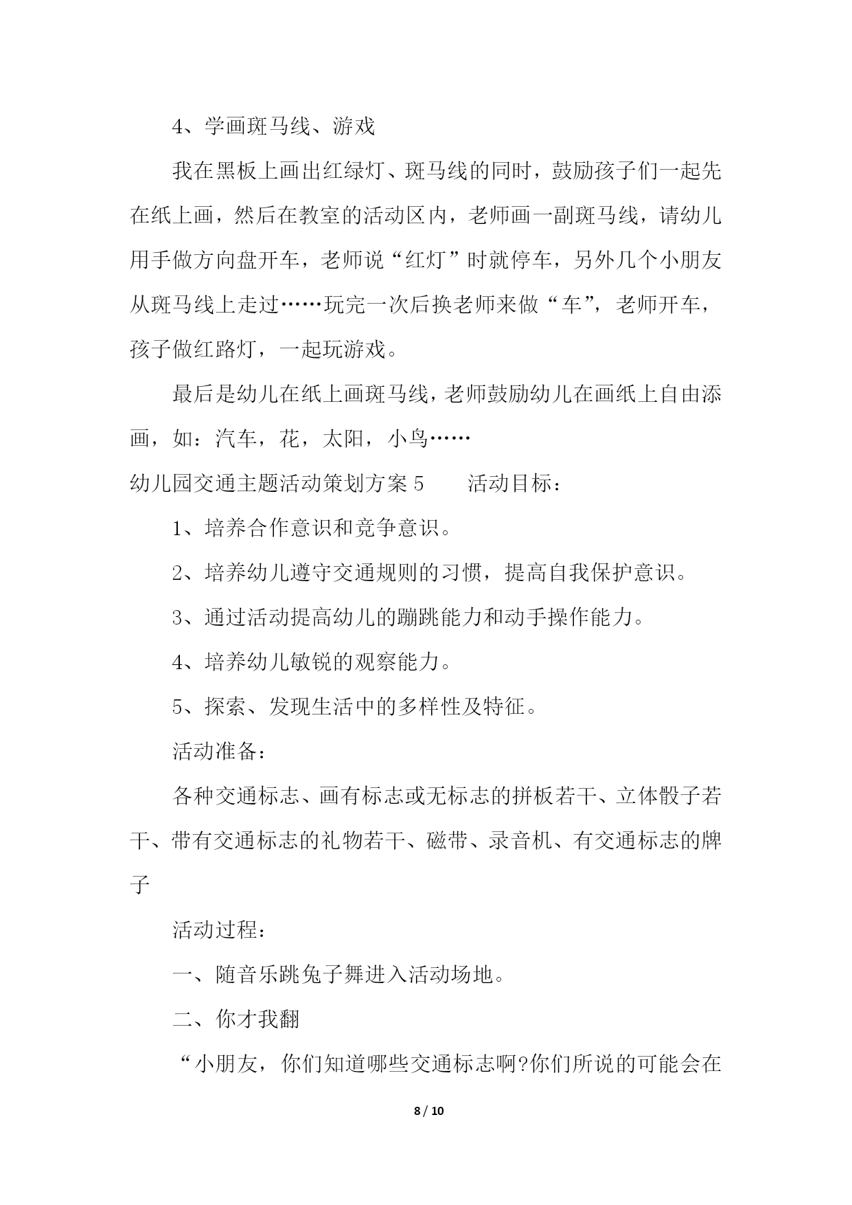 PAGE10/NUMPAGES10幼儿园交通主题活动策划方案幼儿园交通主题活动策划方案1活动目标:1、尝试了解各种不同的交通标志图,正确表达它们各自的作用。2、体验游戏的快乐,乐于遵守交通规则。3、加强幼儿的安全意识。4、探索、发现生活中的多样性及特征。5、遵守社会行为规则,不做“禁止”的事。活动准备:1、幼儿编写有关“交通标志图”的信息图片。2、立体的交通标志(停车标志、信号灯、左右转弯标志)。3、自制信号灯(红色八盏、绿色八盏)。4、“十字路口”场景布置。活动难点重点:活动难点:解读交通标志图。活动重点:让幼儿明白如何正确穿越“十字路口”。活动过程:1、“前些日子,老师请小朋友在马路上仔细寻找各类交通标志图,并画了下来,谢谢你们。今天,我们开展一个“交通标志图”的交流会,请小朋友把各自找到的标志图展示出来,并要用自己的语言完整讲述,让我们听明白这个标志图所表达的含义。”2、幼儿自由交流,展示标志图,表达具体含义。3、教师引导孩子设想路段的情况,以生动的例子、形象的手势,启发孩子理解标志图的作用。如某幼儿出示“禁止鸣喇叭”这个标志图后,教师引发幼儿思考:(1)这个路段旁可能有什么需要保持安静的建筑设施?(2)假如你听到连续的喇叭声,你会感觉如何?(3)预设的答案:可能幼儿园的小朋友正在睡午觉;可能医院里有病人需要休息;可能大哥哥大姐姐正在考试;(4)小结:当我们看到这个标志,在走过这个地方时,绝对不能鸣喇叭,要保持安静。4、“现在,老师扮演交通警阿姨。你们想不想当一个小记者来采访我?”5、教师引导孩子从交通警的职业情况、辛苦程度、交通手势等不同角度进行采访。6、具体了解民警在指挥交通时有什么手势?这些手势告诉我们哪些交通规则?(微笑立正表示对人尊重;右手掌往上,手心向外,体前平举表示请停下;右手臂侧举,来回移动表示前行)7、请幼儿学做民警阿姨指挥交通。8、“在十字路口,设有明显的交通标志图,叫什么名称?”(信号灯,也叫红绿灯)9、游戏:过马路要看灯幼儿分成信号灯、行人两类角色,自由体验生活。教师引导孩子正确做好信号灯的闪亮工作。(幼儿站在小椅子,手持红、绿两种灯作准备状。处于十字路口的八盏信号灯,要有规律地轮换跳动,为确保幼儿调换红绿信号灯这一动作的整齐性,他们以倒数10——1的齐声念读为辅助手段,进行合理操作)。A、幼儿徒步行走在人行道上。B、幼儿学做开汽车状,穿梭于马路上,面对交通标志,正确识别,认真开车,最后把车停靠在停车场,结束活动。幼儿园交通主题活动策划方案2活动目标:1、使幼儿了解基本的交通规则,认识红绿灯。2、引导幼儿认识人行横道,了解过马路时走人行横道的重要性。3、遵守社会行为规则,不做“禁止”的事。4、培养幼儿敏锐的观察能力。5、加强幼儿的安全意识。活动准备:幼儿教材,字卡“灯”活动过程:1、谈话:热热闹闹的大街上(1)提问:小朋友在大街上走时都看到过什么?引导幼儿尽可能多的回忆,会用“热闹”形容大街上的场面;(2)提问:“马路的路口有什么?红绿灯是做什么用的?”引导幼儿说出红绿灯,知道红灯停绿灯行的道路;(3)、提问:我们应该怎样过马路?引导幼儿知道过马路时要走人行横道;(4)、提问:如果没有了红绿灯会怎么样?引导幼儿通过讨论知道遵守交通规则的重要性。2、请幼儿做小司机,每人取一本书。3、请幼儿将书轻轻翻到提问:(1)请你看一看,图画中都画了什么?(2)图中画的是哪里?4、教师有感情地朗诵儿歌5、教师提问:鼓励幼儿大胆回答。幼儿园交通主题活动策划方案3活动目标1、幼儿能认识简单的交通标记。2、通过游戏,引导幼儿遵守交通规则,知道不乱穿马路,增强幼儿遵守交通规则的意识。3、增强幼儿与同伴合作的游戏的意识,体验游戏的快乐。4、探索、发现生活中的多样性及特征。5、加强幼儿的安全意识。教学重点、难点认识简单的交通标记,并能在游戏中巩固认识交通信号灯,遵守交通规则。活动准备1、有关模拟游戏。2、《巧虎我会看红绿灯》视频。3、《去郊游》音乐。活动过程一、情景感知1、观看《巧虎我会看红绿灯》的视频2、为什么巧虎差点被车撞到?3、教师归纳:巧虎没有注意看红绿灯,差点被车撞上。这样太危险了,以后我们过马路的时候不能玩耍。二、看图片《十字路口》,体验交流。1、过马路是应该走哪里?教师归纳:过马路要走斑马线。2、十字路口有斑马线,行人是不是什么时候都可以走呢?什么时候可以走?教师归纳:过十字路口要看红绿灯,红灯停,绿灯行。小结:巧虎在过马路时遇到了一些危险,你们知道怎样才能避免那样的危险吗?(幼儿回答后,教师用自编儿歌进行归纳:我和妈妈手拉手,一起走到马路口,红灯停,绿灯走,还要左右瞅一瞅。)三、行为巩固1、在情景模拟游戏“去春游”带领幼儿一边走一边根据场景提问,巩固对交通规则的认识。场景一:人行道和车行道