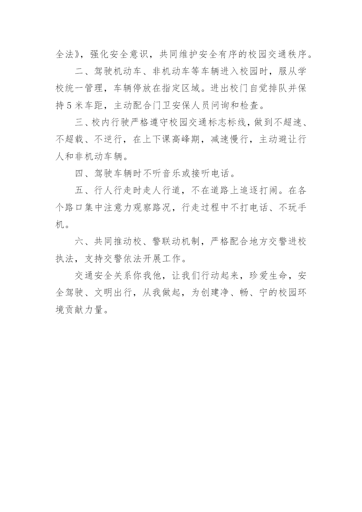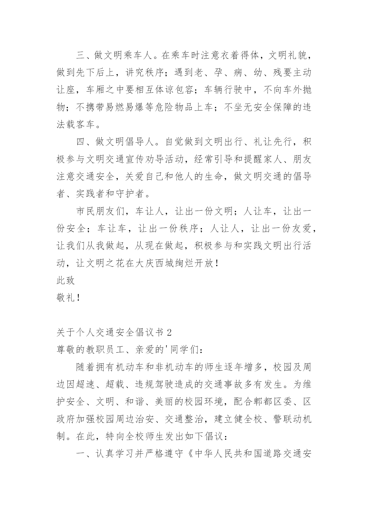 个人交通安全倡议书关于个人交通安全倡议书现如今,倡议书与我们的生活息息相关,倡议书作为一种公开提议性的专用书信,其在写作上有一定的规范。相信写倡议书是一个让许多人都头痛的问题,下面是小编精心整理的关于个人交通安全倡议书,希望能够帮助到大家。关于个人交通安全倡议书1西城市民朋友们:我们生活在全国文明城市,我们生活在中国发展潜力区,西城的文明需要你我共同营造,西城的形象需要你我共同呵护。交通文明是展示市民素质窗口,共建文明和谐的交通环境,是每一位市民应尽的义务和责任。在大庆市“文明出行”主题活动启动之际,我们向广大市民发出如下倡议:一、做文明开车人。做到酒后不驾车,疲劳不开车;斑马线上不争先,红绿灯前不抢行;不超速、不超载、不抢道、不占道;不违章停车、不逆向行驶、不接听手机、不乱鸣喇叭、不向车外扔杂物;开机动车系好安全带,乘摩托车戴好安全帽,行车时让出应急通道,停车时让出消防通道。二、做文明行路人。做到不闯红灯,不乱穿马路,不在机动车、非机动车道内行走,不在车行道上候车,不在十字路口打的`,不违反交通信号指示通行,不翻越交通隔离设施,不与非机动车争道,不妨碍机动车正常通行。三、做文明乘车人。在乘车时注意衣着得体,文明礼貌,做到先下后上,讲究秩序;遇到老、孕、病、幼、残要主动让座,车厢之中要相互体谅包容;车辆行驶中,不向车外抛物;不携带易燃易爆等危险物品上车;不坐无安全保障的违法载客车。四、做文明倡导人。自觉做到文明出行、礼让先行,积极参与文明交通宣传劝导活动,经常引导和提醒家人、朋友注意交通安全,关爱自己和他人的生命,做文明交通的倡导者、实践者和守护者。市民朋友们,车让人,让出一份文明;人让车,让出一份安全;车让车,让出一份秩序;人让人,让出一份友爱,让我们从我做起,从现在做起,积极参与和实践文明出行活动,让文明之花在大庆西城绚烂开放!此致敬礼!关于个人交通安全倡议书2尊敬的教职员工、亲爱的'同学们:随着拥有机动车和非机动车的师生逐年增多,校园及周边因超速、超载、违规驾驶造成的交通事故多有发生。为维护安全、文明、和谐、美丽的校园环境,配合郫都区委、区政府加强校园周边治安、交通整治,建立健全校、警联动机制。在此,特向全校师生发出如下倡议:一、认真学习并严格遵守《中华人民共和国道路交通安全法》,强化安全意识,共同维护安全有序的校园交通秩序。二、驾驶机动车、非机动车等车辆进入校园时,服从学校统一管理,车辆停放在指定区域。进出校门自觉排队并保持5米车距,主动配合门卫安保人员问询和检查。三、校内行驶严格遵守校园交通标志标线,做到不超速、不超载、不逆行,在上下课高峰期,减速慢行,主动避让行人和非机动车辆。四、驾驶车辆时不听音乐或接听电话。五、行人行走时走人行道,不在道路上追逐打闹。在各个路口集中注意力观察路况,行走过程中不打电话、不玩手机。六、共同推动校、警联动机制,严格配合地方交警进校执法,支持交警依法开展工作。交通安全关系你我他,让我们行动起来,珍爱生命,安全驾驶、文明出行,从我做起,为创建净、畅、宁的校园环境贡献力量。