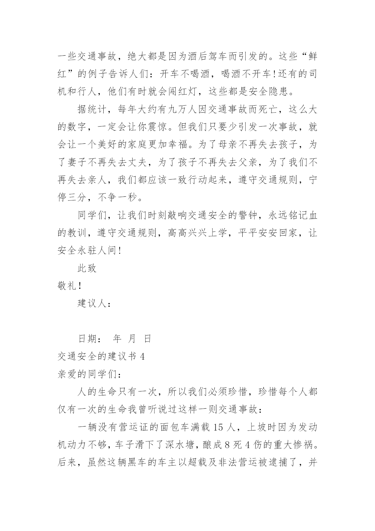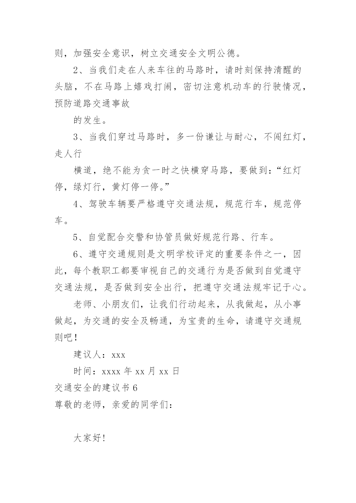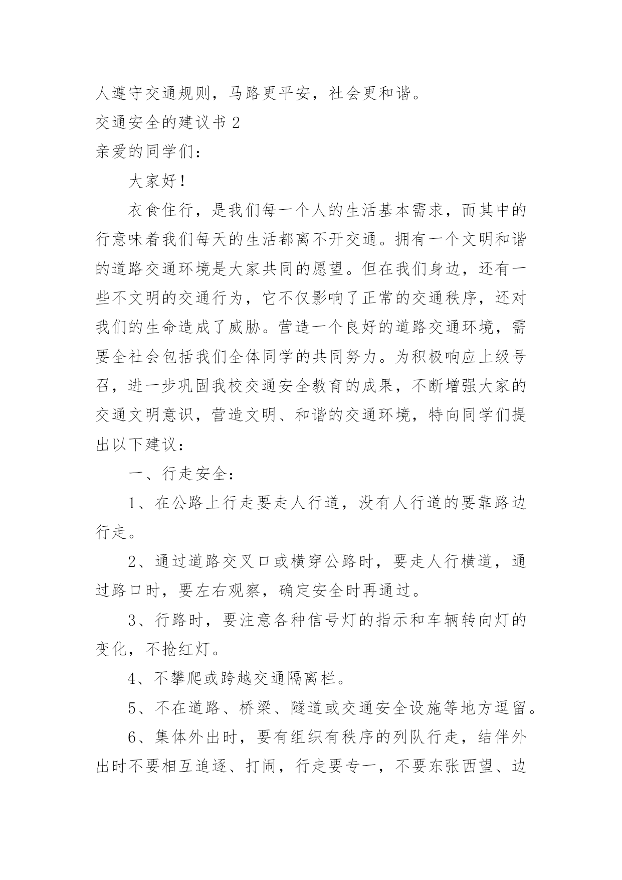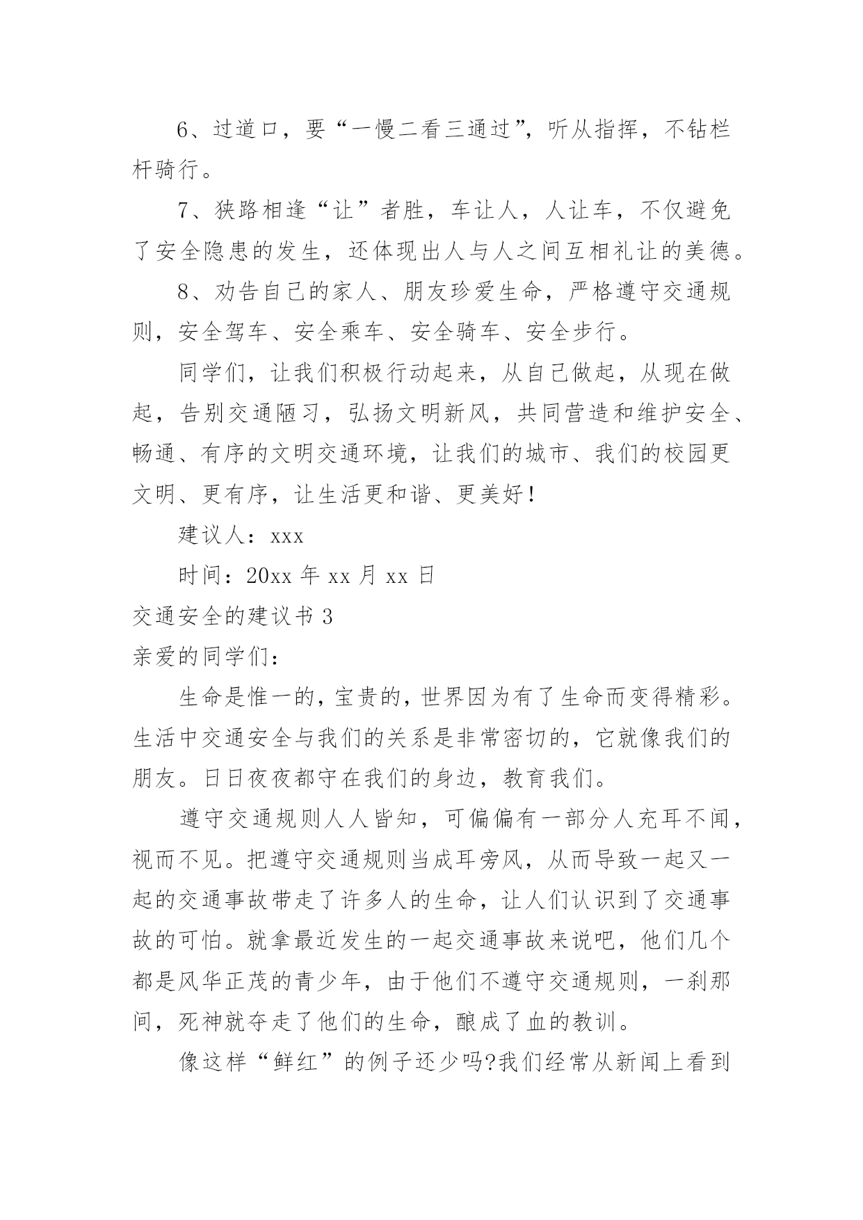 交通安全的建议书交通安全的建议书通用15篇在现实社会中,越来越多人会去使用建议书,建议书是就某项工作提出某种建议时使用的一种常用书信,也叫意见书。那么一般建议书是怎么写的呢?下面是小编整理的交通安全的建议书,欢迎阅读,希望大家能够喜欢。交通安全的建议书1向交通管理部门的建议:杭州作为一座国际化的大都市,发展日新月异,路况越来越好,交通出行方便快捷,选择多样化。人们活动日益增多,随之而来的是交通安全问题日益凸显。大家一定会注意到:红灯亮起时,行人,车辆嘎然而止,可是依然有些人骑着车,东张西望,大摇大摆而过,完全无视红灯。正常行驶的车辆,行人,则紧急避让,险象环生,很大程度影响了正常交通秩序。有些人过斑马线,眼盯手机,旁若无人,慢条斯理,看到绿灯闪起,紧赶慢跑,左躲右闪。更有甚者,骑车之人为抢绿灯的最后1秒,和时间赛跑,加速穿越路口,汽车行人则纷纷等待避让。在路口,我仔细观察记录了闯红灯的情况。正常工作日的早上,发生人次较多,有做小生意忙进货,满载而行,节约时间,红灯时呼啸而过;送学生的电动自行车,因晚起几分钟,赶时间到校,顾不上红灯了;还有的是上班族,背包,手提包样样俱全,红灯时却熟视无睹,扬长而去。我觉得,闯红灯者,究其原因,无怪乎是:赶时间;无视法规。赶时间者,因客观原因,错过了时机,只好冒险闯红灯,偶尔为之,比如送学生,下次他们会注意,早点出门,时间充裕些。做生意进货,送货,要合理调配。那些无视法规者,他们闯红灯习以为常了,有种感觉,红灯绿灯是为别人准备的,和他无关。其它时间段,则相对少些,路口平安了许多。建议:1,路口安装闯红灯记录机器。杭州现在是科技网络时代,利用人脸识别系统,抓拍闯红灯者,信息发至他本人,提醒,警告后,屡教不改者严惩不贷。2,加强法规教育宣传。杭州斑马线礼让行人蔚然成风,但闯红灯者回带来各种意外。闯红灯者,现场要学习法规知识30分钟,还要求其一月内,规定时间来学习,考核。3,低头族们,请昂首挺胸过马路,看看眼前的世界很精彩,低头只会看见自己的脚尖,会失去很多的。现在的红灯绿灯方式是数字,闪动。能否加些提示音乐,最后10秒开始提醒。过马路就会有紧迫感。4,利用互联网技术,建立信用档案。违章教育不改者,系统将个人信用信息上传,留下不良记录。那么在任何地方,个人信用都会受限。不再是个自由身了!5,建议斑马线和红灯绿灯信号灯一致,自动变换。可以装在地上,也不可以投影。增强些色彩,或许会让更多的人遵守交通规则,马路更平安,社会更和谐。交通安全的建议书2亲爱的同学们:大家好!衣食住行,是我们每一个人的生活基本需求,而其中的行意味着我们每天的生活都离不开交通。拥有一个文明和谐的道路交通环境是大家共同的愿望。但在我们身边,还有一些不文明的交通行为,它不仅影响了正常的交通秩序,还对我们的生命造成了威胁。营造一个良好的道路交通环境,需要全社会包括我们全体同学的共同努力。为积极响应上级号召,进一步巩固我校交通安全教育的成果,不断增强大家的交通文明意识,营造文明、和谐的交通环境,特向同学们提出以下建议:一、行走安全:1、在公路上行走要走人行道,没有人行道的要靠路边行走。2、通过道路交叉口或横穿公路时,要走人行横道,通过路口时,要左右观察,确定安全时再通过。3、行路时,要注意各种信号灯的指示和车辆转向灯的变化,不抢红灯。4、不攀爬或跨越交通隔离栏。5、不在道路、桥梁、隧道或交通安全设施等地方逗留。6、集体外出时,要有组织有秩序的列队行走,结伴外出时不要相互追逐、打闹,行走要专一,不要东张西望、边走边看书、看报或做其他事情。7、校园内行走应遵循靠右原则,有人行道的路段应在人行道内行走。不得在道路上嬉戏、踢球或进行其他有碍交通秩序的活动。上下楼梯精力要集中,一律靠楼梯的右边行走,前后要保持一定的距离,避免多人并排,跑跳,追逐打闹和前推后拥;发现拥挤现象不要慌乱,要靠墙或扶楼梯扶手止步;不要将身体探过楼梯扶手,更不要从栏杆上往下滑。8、在楼道走廊上行走时,要轻声慢步,不要大声喧哗,不要打闹追逐。不要借助栏杆做健身动作,更不要用身体、四肢冲撞栏杆。不向楼下扔任何东西。9、课间活动时不可在教室内跑、追逐打闹和恶作剧。10、在校园内活动时不得急跑,不得追逐打闹,不得做恶作剧。在人少的地方活动或游戏,且不要危及他人安全。不要做有危险的活动和游戏。二、骑车安全:1、骑自行车转弯时要提前减速慢行向后观望并招手示意,不要突然猛拐。2、不能逞能飞车穿行,超越前方自行车时,不要靠的太近,不要速度过快。3、骑车时不三五成群并肩骑行,也不要扶肩而行,更不要互相追逐、竟驶。4、不要手中持物骑行,更不要双手离把,呈一时之快。5、不要紧随机动车后面骑行,更不要扒机动车行驶,以免被挂倒。6、过道口,要“一慢二看三通过”,听从指挥,不钻栏杆骑行。7、狭路相逢“
