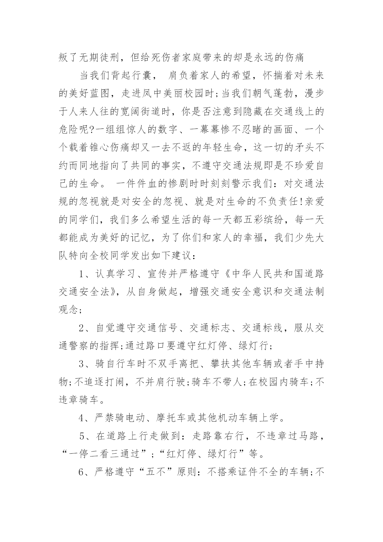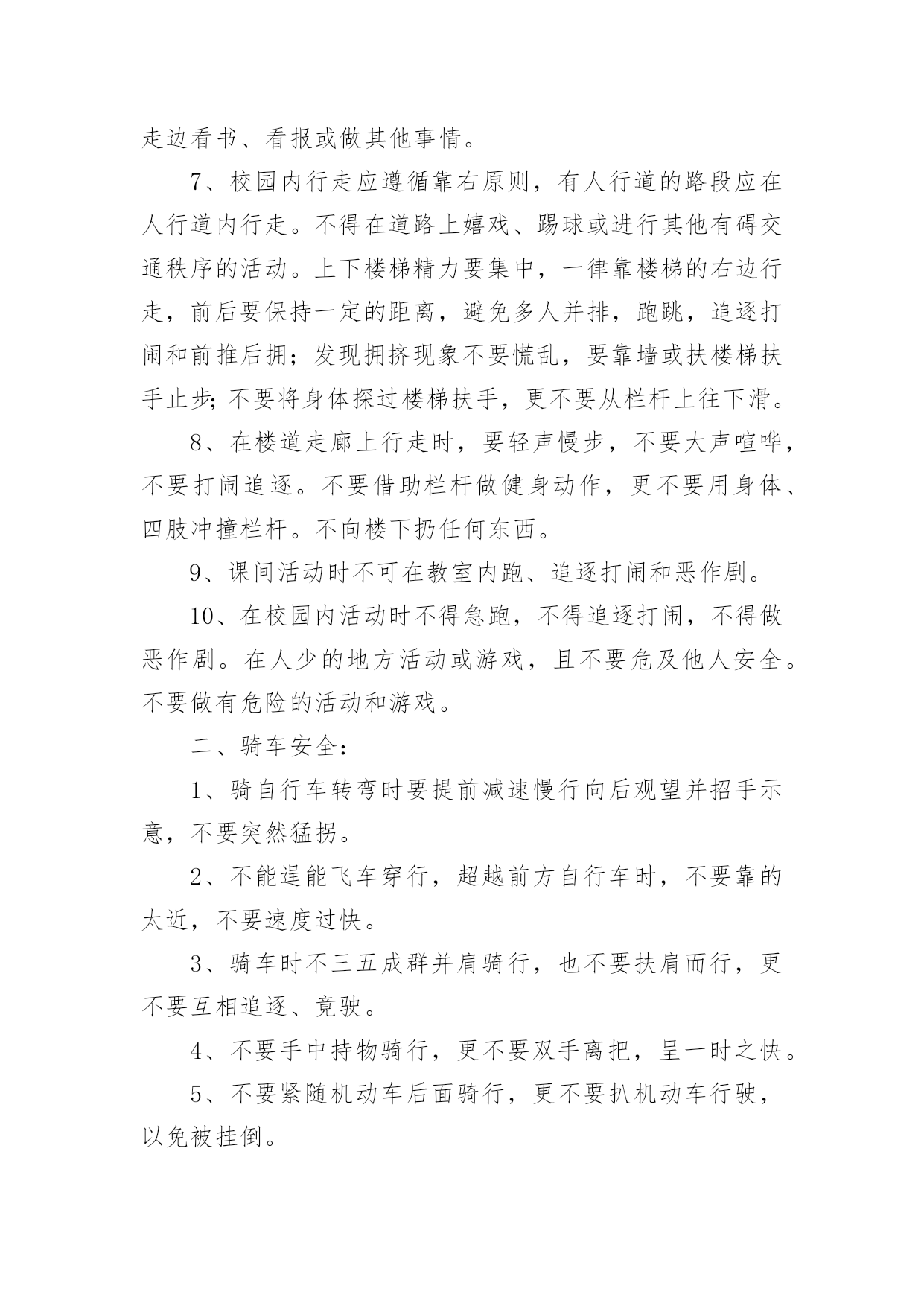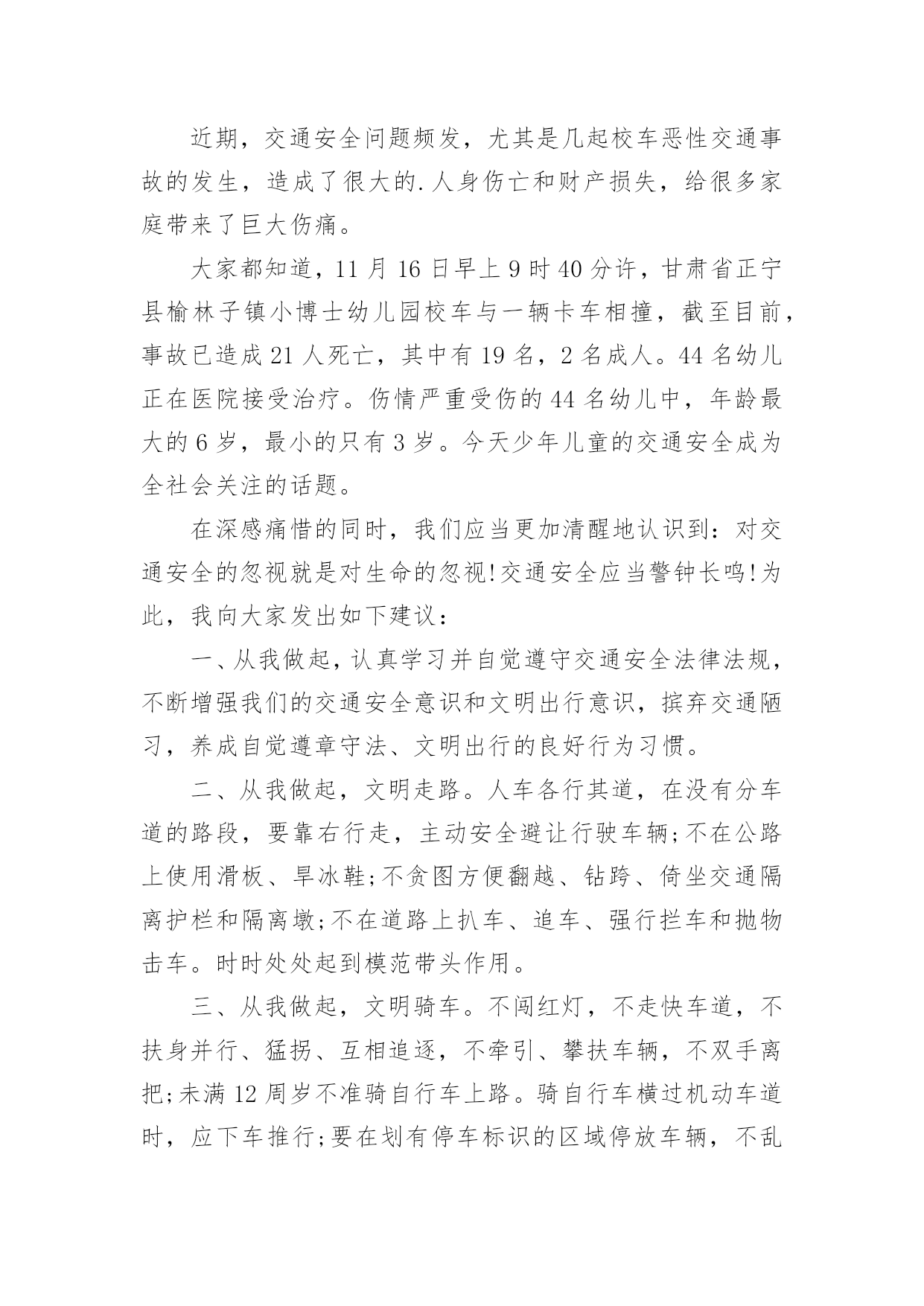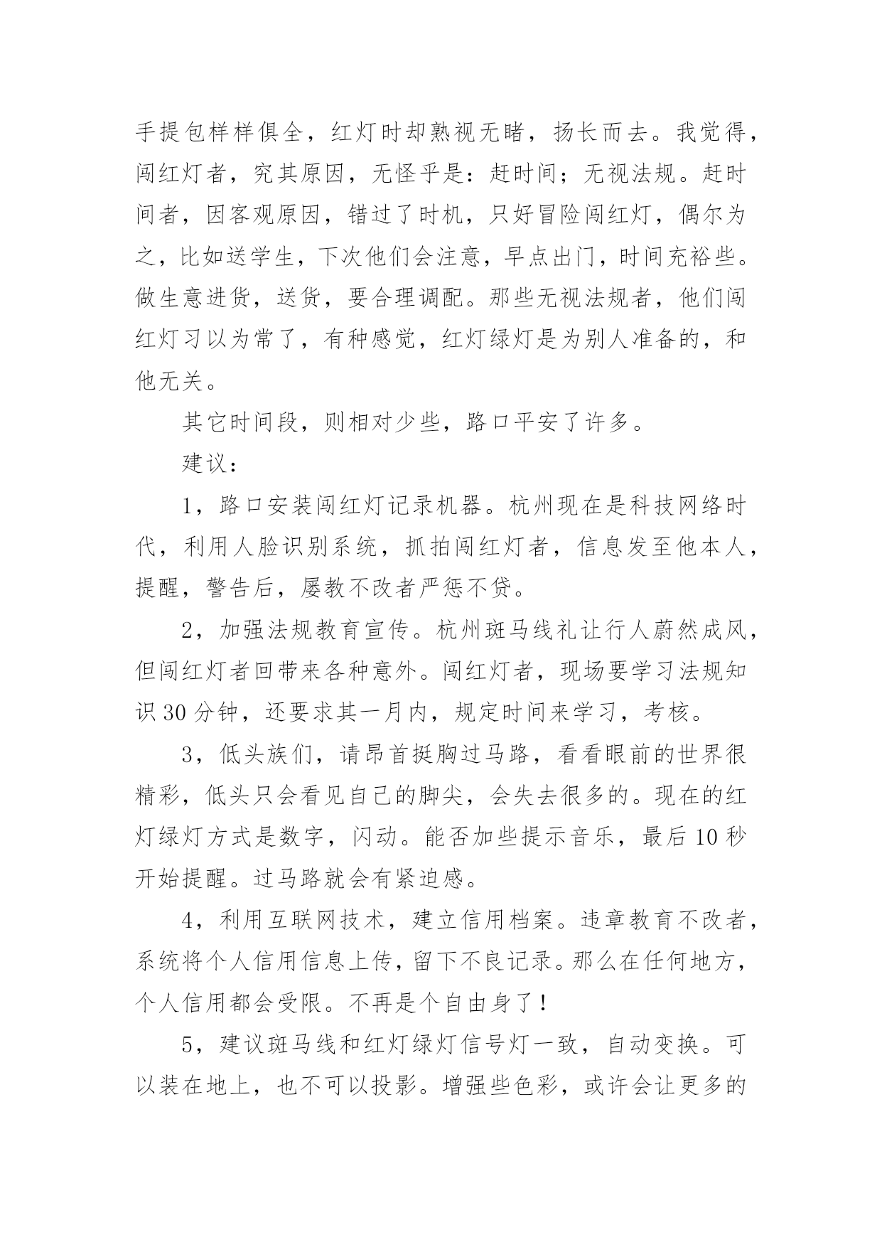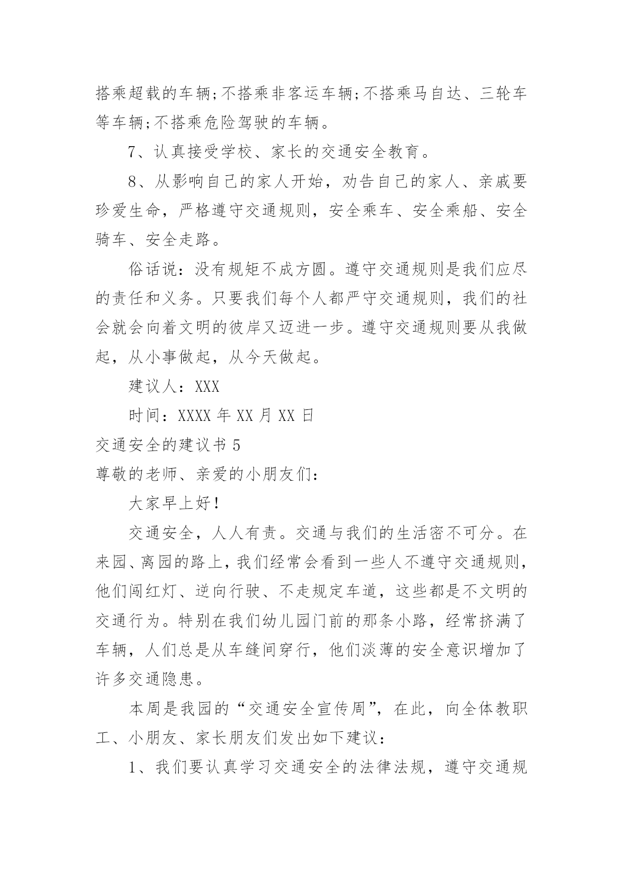 交通安全的建议书交通安全的建议书通用15篇在现实社会中,越来越多人会去使用建议书,建议书是就某项工作提出某种建议时使用的一种常用书信,也叫意见书。那么一般建议书是怎么写的呢?下面是小编整理的交通安全的建议书,欢迎阅读,希望大家能够喜欢。交通安全的建议书1向交通管理部门的建议:杭州作为一座国际化的大都市,发展日新月异,路况越来越好,交通出行方便快捷,选择多样化。人们活动日益增多,随之而来的是交通安全问题日益凸显。大家一定会注意到:红灯亮起时,行人,车辆嘎然而止,可是依然有些人骑着车,东张西望,大摇大摆而过,完全无视红灯。正常行驶的车辆,行人,则紧急避让,险象环生,很大程度影响了正常交通秩序。有些人过斑马线,眼盯手机,旁若无人,慢条斯理,看到绿灯闪起,紧赶慢跑,左躲右闪。更有甚者,骑车之人为抢绿灯的最后1秒,和时间赛跑,加速穿越路口,汽车行人则纷纷等待避让。在路口,我仔细观察记录了闯红灯的情况。正常工作日的早上,发生人次较多,有做小生意忙进货,满载而行,节约时间,红灯时呼啸而过;送学生的电动自行车,因晚起几分钟,赶时间到校,顾不上红灯了;还有的是上班族,背包,手提包样样俱全,红灯时却熟视无睹,扬长而去。我觉得,闯红灯者,究其原因,无怪乎是:赶时间;无视法规。赶时间者,因客观原因,错过了时机,只好冒险闯红灯,偶尔为之,比如送学生,下次他们会注意,早点出门,时间充裕些。做生意进货,送货,要合理调配。那些无视法规者,他们闯红灯习以为常了,有种感觉,红灯绿灯是为别人准备的,和他无关。其它时间段,则相对少些,路口平安了许多。建议:1,路口安装闯红灯记录机器。杭州现在是科技网络时代,利用人脸识别系统,抓拍闯红灯者,信息发至他本人,提醒,警告后,屡教不改者严惩不贷。2,加强法规教育宣传。杭州斑马线礼让行人蔚然成风,但闯红灯者回带来各种意外。闯红灯者,现场要学习法规知识30分钟,还要求其一月内,规定时间来学习,考核。3,低头族们,请昂首挺胸过马路,看看眼前的世界很精彩,低头只会看见自己的脚尖,会失去很多的。现在的红灯绿灯方式是数字,闪动。能否加些提示音乐,最后10秒开始提醒。过马路就会有紧迫感。4,利用互联网技术,建立信用档案。违章教育不改者,系统将个人信用信息上传,留下不良记录。那么在任何地方,个人信用都会受限。不再是个自由身了!5,建议斑马线和红灯绿灯信号灯一致,自动变换。可以装在地上,也不可以投影。增强些色彩,或许会让更多的人遵守交通规则,马路更平安,社会更和谐。交通安全的建议书2亲爱的同学们:大家好!衣食住行,是我们每一个人的生活基本需求,而其中的行意味着我们每天的生活都离不开交通。拥有一个文明和谐的道路交通环境是大家共同的愿望。但在我们身边,还有一些不文明的交通行为,它不仅影响了正常的交通秩序,还对我们的生命造成了威胁。营造一个良好的道路交通环境,需要全社会包括我们全体同学的共同努力。为积极响应上级号召,进一步巩固我校交通安全教育的成果,不断增强大家的交通文明意识,营造文明、和谐的交通环境,特向同学们提出以下建议:一、行走安全:1、在公路上行走要走人行道,没有人行道的要靠路边行走。2、通过道路交叉口或横穿公路时,要走人行横道,通过路口时,要左右观察,确定安全时再通过。3、行路时,要注意各种信号灯的指示和车辆转向灯的变化,不抢红灯。4、不攀爬或跨越交通隔离栏。5、不在道路、桥梁、隧道或交通安全设施等地方逗留。6、集体外出时,要有组织有秩序的列队行走,结伴外出时不要相互追逐、打闹,行走要专一,不要东张西望、边走边看书、看报或做其他事情。7、校园内行走应遵循靠右原则,有人行道的路段应在人行道内行走。不得在道路上嬉戏、踢球或进行其他有碍交通秩序的活动。上下楼梯精力要集中,一律靠楼梯的右边行走,前后要保持一定的距离,避免多人并排,跑跳,追逐打闹和前推后拥;发现拥挤现象不要慌乱,要靠墙或扶楼梯扶手止步;不要将身体探过楼梯扶手,更不要从栏杆上往下滑。8、在楼道走廊上行走时,要轻声慢步,不要大声喧哗,不要打闹追逐。不要借助栏杆做健身动作,更不要用身体、四肢冲撞栏杆。不向楼下扔任何东西。9、课间活动时不可在教室内跑、追逐打闹和恶作剧。10、在校园内活动时不得急跑,不得追逐打闹,不得做恶作剧。在人少的地方活动或游戏,且不要危及他人安全。不要做有危险的活动和游戏。二、骑车安全:1、骑自行车转弯时要提前减速慢行向后观望并招手示意,不要突然猛拐。2、不能逞能飞车穿行,超越前方自行车时,不要靠的太近,不要速度过快。3、骑车时不三五成群并肩骑行,也不要扶肩而行,更不要互相追逐、竟驶。4、不要手中持物骑行,更不要双手离把,呈一时之快。5、不要紧随机动车后面骑行,更不要扒机动车行驶,以免被挂倒。6、过道口,要“一慢二看三通过”,听从指挥,不钻栏杆骑行。7、狭路相逢“