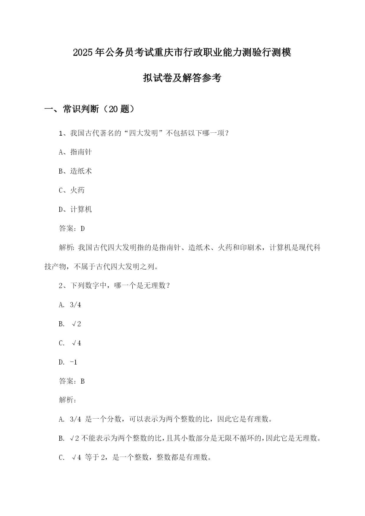 2025年公务员考试重庆市行政职业能力测验行测模拟试卷及解答参考.docx