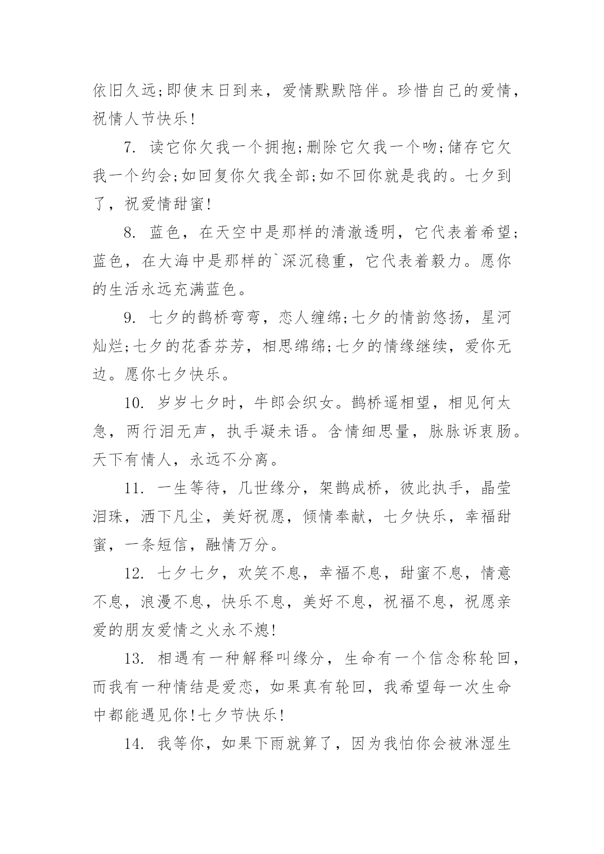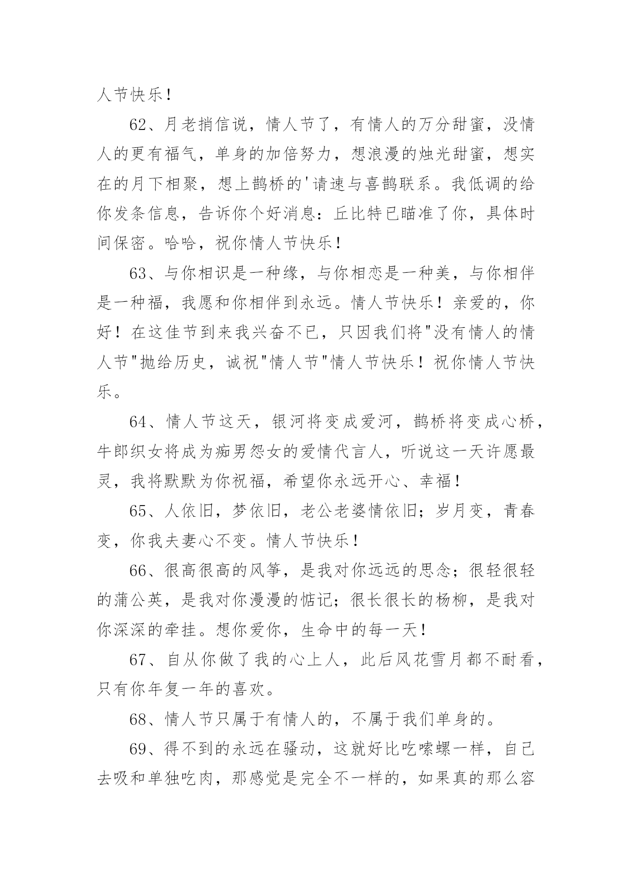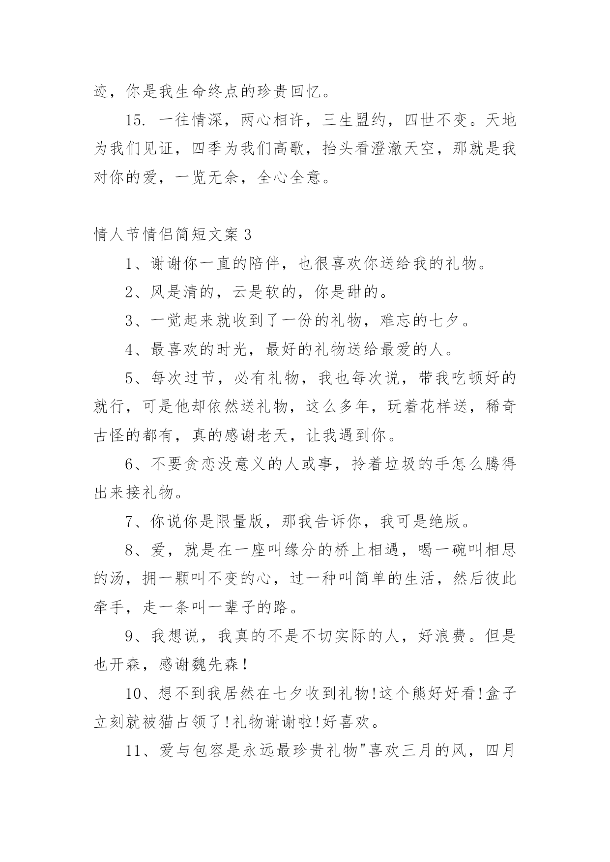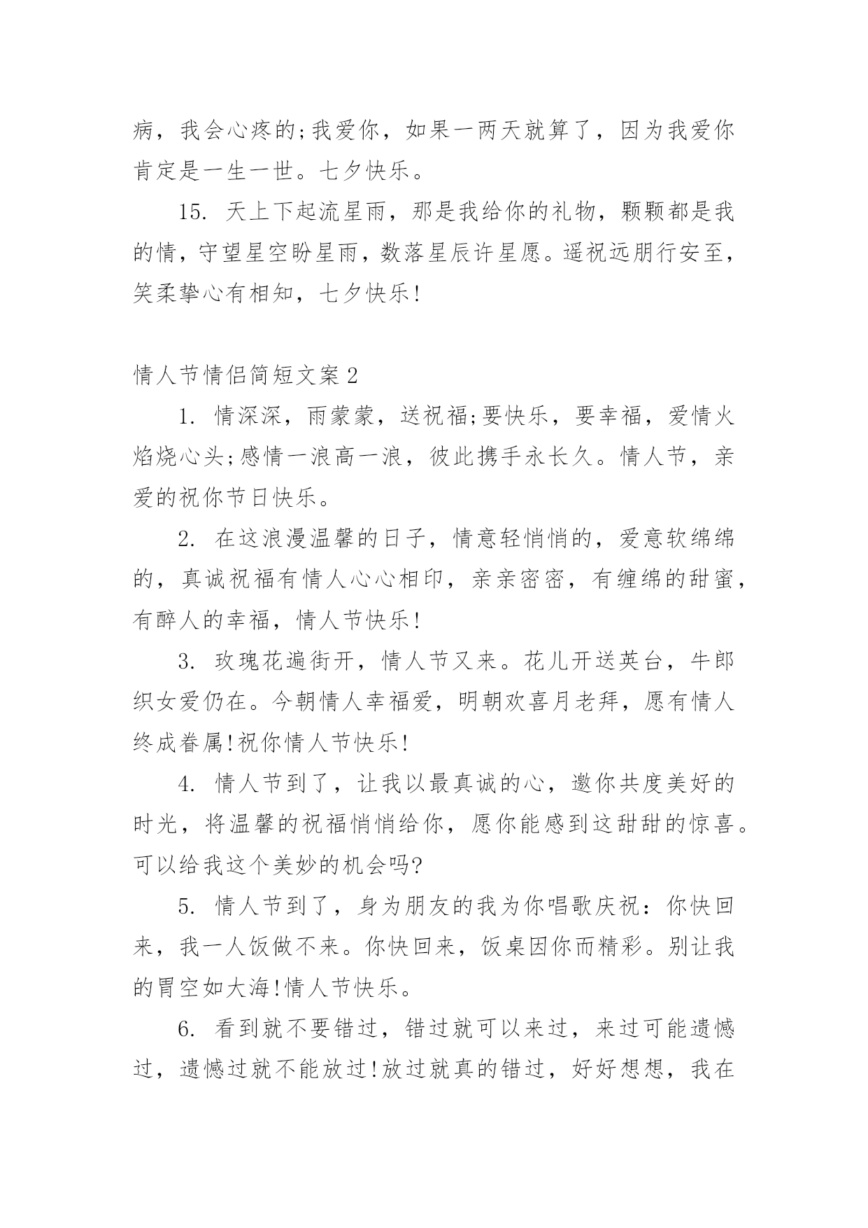 情人节情侣简短文案在平日的学习、工作和生活里,越来越多人会在网上发布文案,文案用以分享自己的生活。那什么样的文案才是经典的呢?下面是小编为大家整理的情人节情侣简短文案,欢迎阅读,希望大家能够喜欢。情人节情侣简短文案11.亲爱的,你知道吗?都说外面的世界精彩万千,我却最眷恋你暖暖的臂弯。当外面世界使我疲倦,总是最想飞奔到你的身边!2.七七情人节到了,接着七夕情人节的机会来场创意秀,向爱人朋友亲人发送七夕情人节创意短信,秀出你的个性和关爱。3.我们徜徉过的小树林,我们观赏过的蓝色黄色粉红色的花朵……,一切的一切,仍然依旧。你什么时候回来,我们一起再同游?4.如果世界只剩十分钟,我会和你一同回忆走过的风雨,如果世界只剩三分钟,我会吻你,如果世界只剩一分钟,我会说次我爱你!5.生活可以是平淡的,犹如蓝天下碧蓝的湖水。生活也可以是诗,在一路的奔腾中高歌。只要我们牵着手,每一个日子都是幸福的。6.即使容颜老去,爱情永不变质;即使海枯石烂,爱情依旧久远;即使末日到来,爱情默默陪伴。珍惜自己的爱情,祝情人节快乐!7.读它你欠我一个拥抱;删除它欠我一个吻;储存它欠我一个约会;如回复你欠我全部;如不回你就是我的。七夕到了,祝爱情甜蜜!8.蓝色,在天空中是那样的清澈透明,它代表着希望;蓝色,在大海中是那样的`深沉稳重,它代表着毅力。愿你的生活永远充满蓝色。9.七夕的鹊桥弯弯,恋人缠绵;七夕的情韵悠扬,星河灿烂;七夕的花香芬芳,相思绵绵;七夕的情缘继续,爱你无边。愿你七夕快乐。10.岁岁七夕时,牛郎会织女。鹊桥遥相望,相见何太急,两行泪无声,执手凝未语。含情细思量,脉脉诉衷肠。天下有情人,永远不分离。11.一生等待,几世缘分,架鹊成桥,彼此执手,晶莹泪珠,洒下凡尘,美好祝愿,倾情奉献,七夕快乐,幸福甜蜜,一条短信,融情万分。12.七夕七夕,欢笑不息,幸福不息,甜蜜不息,情意不息,浪漫不息,快乐不息,美好不息,祝福不息,祝愿亲爱的朋友爱情之火永不熄!13.相遇有一种解释叫缘分,生命有一个信念称轮回,而我有一种情结是爱恋,如果真有轮回,我希望每一次生命中都能遇见你!七夕节快乐!14.我等你,如果下雨就算了,因为我怕你会被淋湿生病,我会心疼的;我爱你,如果一两天就算了,因为我爱你肯定是一生一世。七夕快乐。15.天上下起流星雨,那是我给你的礼物,颗颗都是我的情,守望星空盼星雨,数落星辰许星愿。遥祝远朋行安至,笑柔挚心有相知,七夕快乐!情人节情侣简短文案21.情深深,雨蒙蒙,送祝福;要快乐,要幸福,爱情火焰烧心头;感情一浪高一浪,彼此携手永长久。情人节,亲爱的祝你节日快乐。2.在这浪漫温馨的日子,情意轻悄悄的,爱意软绵绵的,真诚祝福有情人心心相印,亲亲密密,有缠绵的甜蜜,有醉人的幸福,情人节快乐!3.玫瑰花遍街开,情人节又来。花儿开送英台,牛郎织女爱仍在。今朝情人幸福爱,明朝欢喜月老拜,愿有情人终成眷属!祝你情人节快乐!4.情人节到了,让我以最真诚的心,邀你共度美好的时光,将温馨的祝福悄悄给你,愿你能感到这甜甜的惊喜。可以给我这个美妙的机会吗?5.情人节到了,身为朋友的我为你唱歌庆祝:你快回来,我一人饭做不来。你快回来,饭桌因你而精彩。别让我的胃空如大海!情人节快乐。6.看到就不要错过,错过就可以来过,来过可能遗憾过,遗憾过就不能放过!放过就真的错过,好好想想,我在等你来过!老婆情人节愉快!7.二月春风似剪刀,柳枝吐绿玫瑰笑。人逢喜事精神爽,爱情开花人欢笑。双双对对手牵手,隐入花海幸福抱。情人节到了,祝你快乐欢笑!8.月,献上rose,送来真心,将你chase,追逐幸福,做个candy,留住甜蜜,有个boy,送你joy,祝你happy,在情人的Day!情人节开心!9.曾经拥有的-不要忘记,无法得到的-更要珍惜,属于自己的-不要放弃,已经失去的'-留做回忆,走过的路-已成过去,愿你的未来一切顺利!10.白天我们思念,夜晚我们梦见,约会我们不断,情缘我们无限,相见我们恨晚,热恋我们不倦,爱心我们互献,祝福我们永远。情人节快乐!11.爱情《论语》:短信传情,不亦悦乎?有爱自远方来,不亦乐乎?关心常相伴,不亦知己乎?子曰:手机一响,胜过玫瑰千朵,爱你没商量!12.幸福其实很简单,有一个很爱很爱的人,有一份大展宏图的工作,这些就是百分之百的快乐。我最好的朋友,愿你能拥有它们。情人节快乐!13.想你在朝朝暮暮;想你在云起雾散;想你在花前月下;想你在眼底心头;想你在漫漫长夜;想你在今生来世;想你在情人节这样浪漫的日子里!14.你是我独家的记忆,你是我诗篇的绝句,你是我想要的甜蜜,你是我享受的脾气,你是我情人节唯一想要的奇迹,你是我生命终点的珍贵回忆。15.一往情深,两心相许,三生盟约,四世不变。天地为我们见证,四季为我们高歌,抬头看澄澈天空,那就是我对你的爱,一览无余,