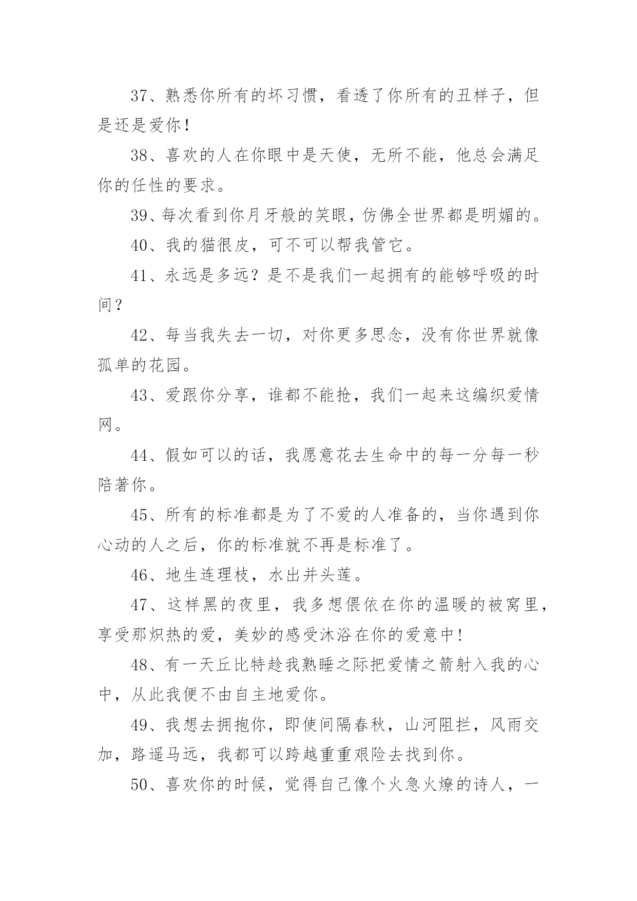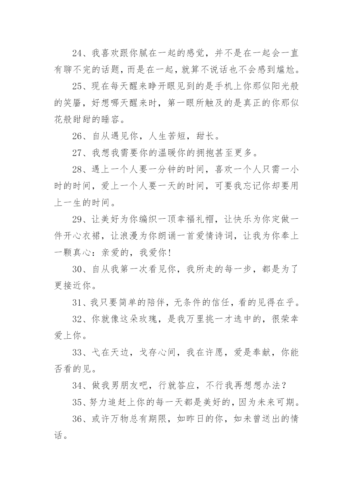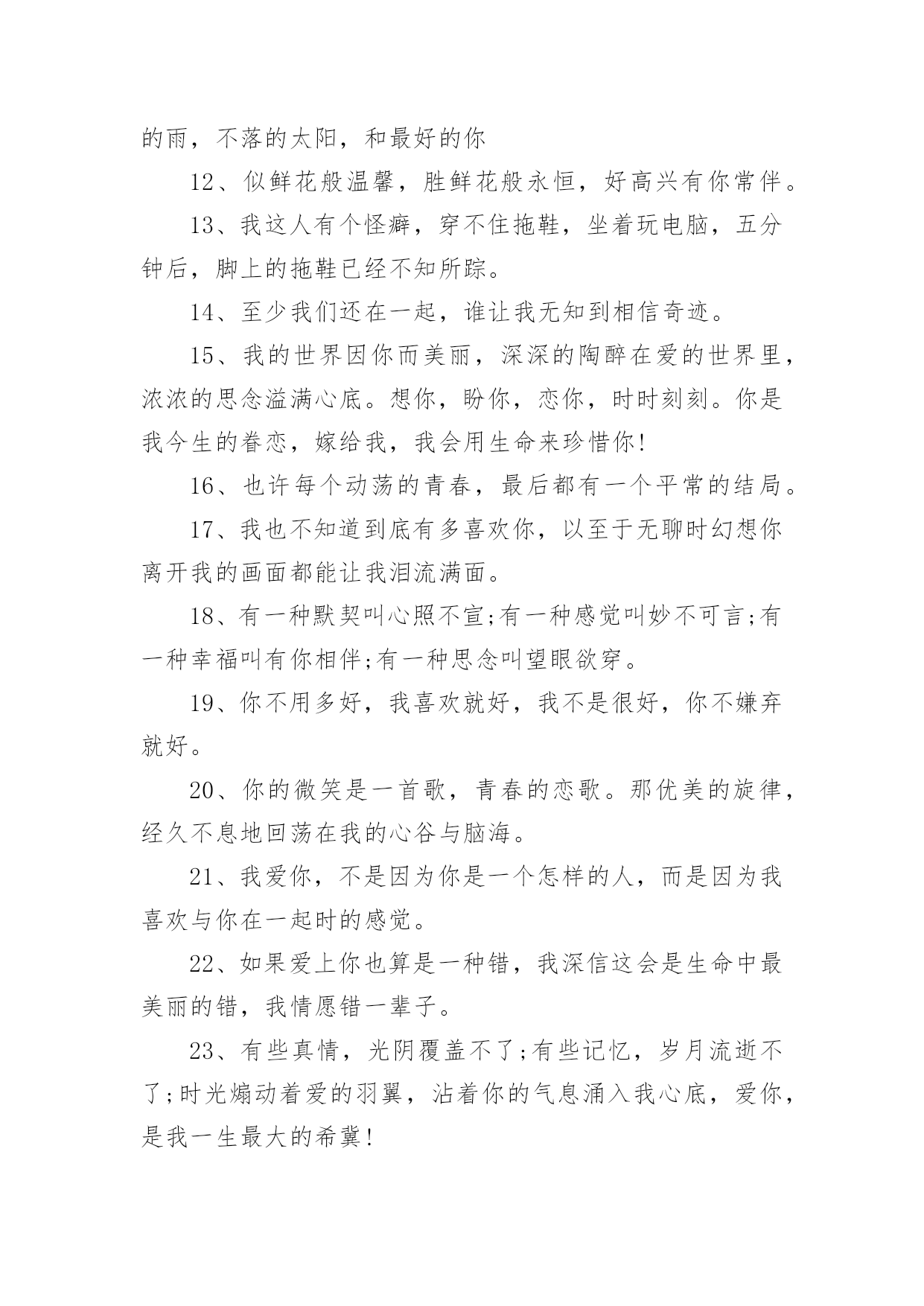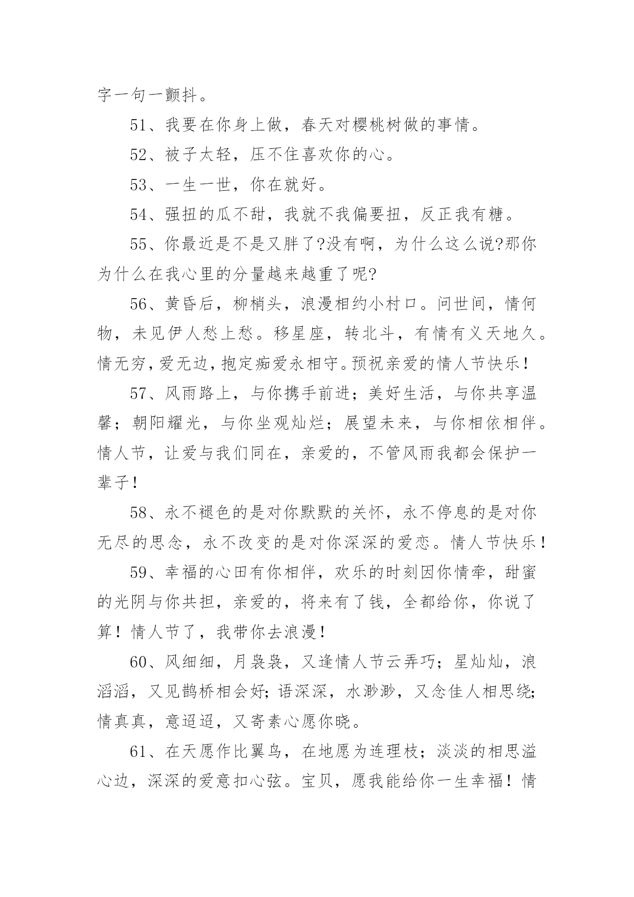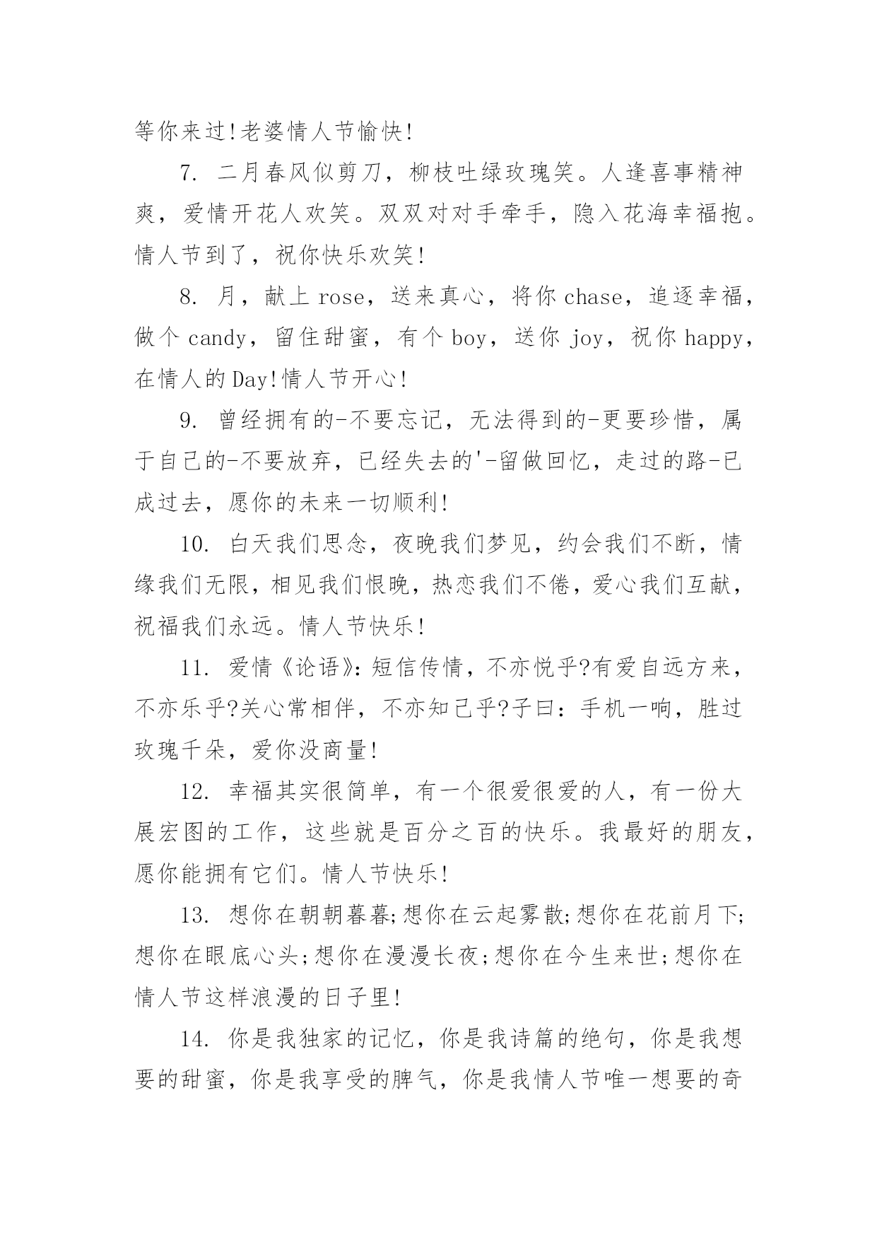 情人节情侣简短文案在平日的学习、工作和生活里,越来越多人会在网上发布文案,文案用以分享自己的生活。那什么样的文案才是经典的呢?下面是小编为大家整理的情人节情侣简短文案,欢迎阅读,希望大家能够喜欢。情人节情侣简短文案11.亲爱的,你知道吗?都说外面的世界精彩万千,我却最眷恋你暖暖的臂弯。当外面世界使我疲倦,总是最想飞奔到你的身边!2.七七情人节到了,接着七夕情人节的机会来场创意秀,向爱人朋友亲人发送七夕情人节创意短信,秀出你的个性和关爱。3.我们徜徉过的小树林,我们观赏过的蓝色黄色粉红色的花朵……,一切的一切,仍然依旧。你什么时候回来,我们一起再同游?4.如果世界只剩十分钟,我会和你一同回忆走过的风雨,如果世界只剩三分钟,我会吻你,如果世界只剩一分钟,我会说次我爱你!5.生活可以是平淡的,犹如蓝天下碧蓝的湖水。生活也可以是诗,在一路的奔腾中高歌。只要我们牵着手,每一个日子都是幸福的。6.即使容颜老去,爱情永不变质;即使海枯石烂,爱情依旧久远;即使末日到来,爱情默默陪伴。珍惜自己的爱情,祝情人节快乐!7.读它你欠我一个拥抱;删除它欠我一个吻;储存它欠我一个约会;如回复你欠我全部;如不回你就是我的。七夕到了,祝爱情甜蜜!8.蓝色,在天空中是那样的清澈透明,它代表着希望;蓝色,在大海中是那样的`深沉稳重,它代表着毅力。愿你的生活永远充满蓝色。9.七夕的鹊桥弯弯,恋人缠绵;七夕的情韵悠扬,星河灿烂;七夕的花香芬芳,相思绵绵;七夕的情缘继续,爱你无边。愿你七夕快乐。10.岁岁七夕时,牛郎会织女。鹊桥遥相望,相见何太急,两行泪无声,执手凝未语。含情细思量,脉脉诉衷肠。天下有情人,永远不分离。11.一生等待,几世缘分,架鹊成桥,彼此执手,晶莹泪珠,洒下凡尘,美好祝愿,倾情奉献,七夕快乐,幸福甜蜜,一条短信,融情万分。12.七夕七夕,欢笑不息,幸福不息,甜蜜不息,情意不息,浪漫不息,快乐不息,美好不息,祝福不息,祝愿亲爱的朋友爱情之火永不熄!13.相遇有一种解释叫缘分,生命有一个信念称轮回,而我有一种情结是爱恋,如果真有轮回,我希望每一次生命中都能遇见你!七夕节快乐!14.我等你,如果下雨就算了,因为我怕你会被淋湿生病,我会心疼的;我爱你,如果一两天就算了,因为我爱你肯定是一生一世。七夕快乐。15.天上下起流星雨,那是我给你的礼物,颗颗都是我的情,守望星空盼星雨,数落星辰许星愿。遥祝远朋行安至,笑柔挚心有相知,七夕快乐!情人节情侣简短文案21.情深深,雨蒙蒙,送祝福;要快乐,要幸福,爱情火焰烧心头;感情一浪高一浪,彼此携手永长久。情人节,亲爱的祝你节日快乐。2.在这浪漫温馨的日子,情意轻悄悄的,爱意软绵绵的,真诚祝福有情人心心相印,亲亲密密,有缠绵的甜蜜,有醉人的幸福,情人节快乐!3.玫瑰花遍街开,情人节又来。花儿开送英台,牛郎织女爱仍在。今朝情人幸福爱,明朝欢喜月老拜,愿有情人终成眷属!祝你情人节快乐!4.情人节到了,让我以最真诚的心,邀你共度美好的时光,将温馨的祝福悄悄给你,愿你能感到这甜甜的惊喜。可以给我这个美妙的机会吗?5.情人节到了,身为朋友的我为你唱歌庆祝:你快回来,我一人饭做不来。你快回来,饭桌因你而精彩。别让我的胃空如大海!情人节快乐。6.看到就不要错过,错过就可以来过,来过可能遗憾过,遗憾过就不能放过!放过就真的错过,好好想想,我在等你来过!老婆情人节愉快!7.二月春风似剪刀,柳枝吐绿玫瑰笑。人逢喜事精神爽,爱情开花人欢笑。双双对对手牵手,隐入花海幸福抱。情人节到了,祝你快乐欢笑!8.月,献上rose,送来真心,将你chase,追逐幸福,做个candy,留住甜蜜,有个boy,送你joy,祝你happy,在情人的Day!情人节开心!9.曾经拥有的-不要忘记,无法得到的-更要珍惜,属于自己的-不要放弃,已经失去的'-留做回忆,走过的路-已成过去,愿你的未来一切顺利!10.白天我们思念,夜晚我们梦见,约会我们不断,情缘我们无限,相见我们恨晚,热恋我们不倦,爱心我们互献,祝福我们永远。情人节快乐!11.爱情《论语》:短信传情,不亦悦乎?有爱自远方来,不亦乐乎?关心常相伴,不亦知己乎?子曰:手机一响,胜过玫瑰千朵,爱你没商量!12.幸福其实很简单,有一个很爱很爱的人,有一份大展宏图的工作,这些就是百分之百的快乐。我最好的朋友,愿你能拥有它们。情人节快乐!13.想你在朝朝暮暮;想你在云起雾散;想你在花前月下;想你在眼底心头;想你在漫漫长夜;想你在今生来世;想你在情人节这样浪漫的日子里!14.你是我独家的记忆,你是我诗篇的绝句,你是我想要的甜蜜,你是我享受的脾气,你是我情人节唯一想要的奇迹,你是我生命终点的珍贵回忆。15.一往情深,两心相许,三生盟约,四世不变。天地为我们见证,四季为我们高歌,抬头看澄澈天空,那就是我对你的爱,一览无余,