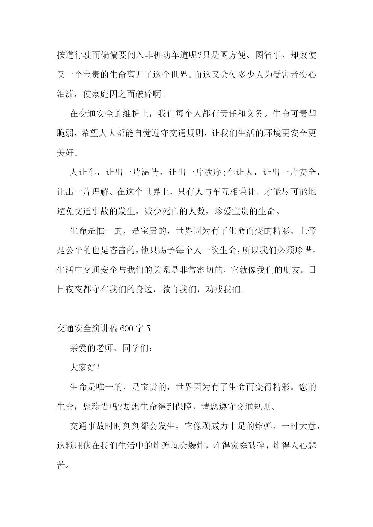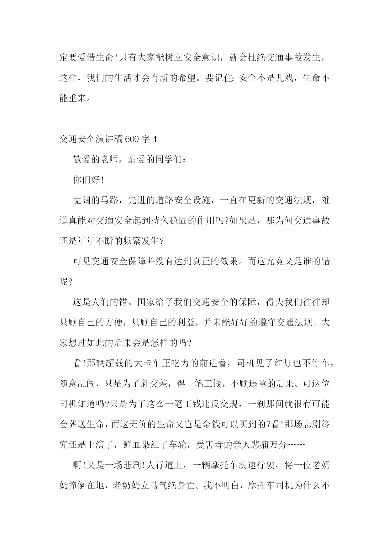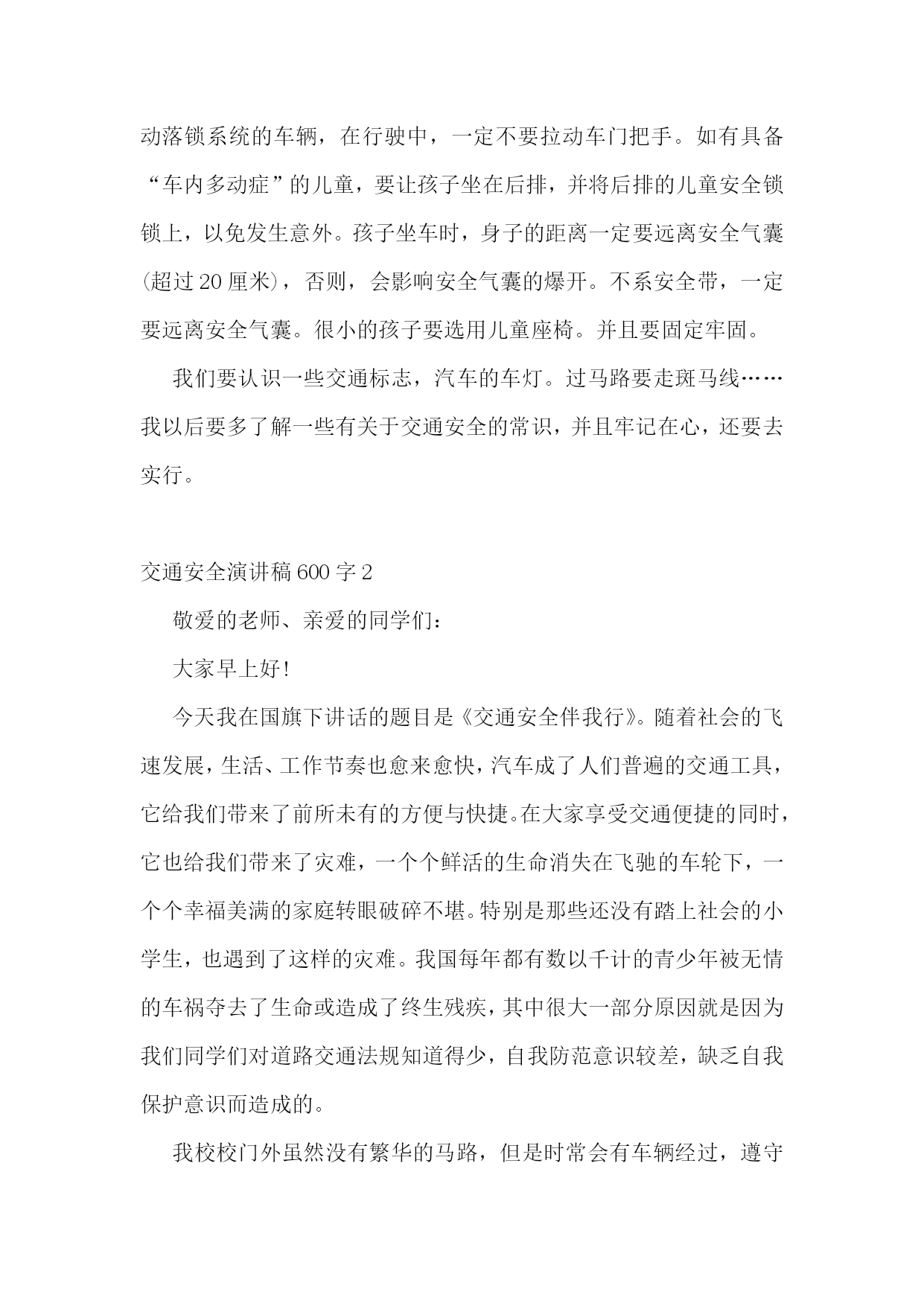 交通安全演讲稿600字交通安全演讲稿600字1敬爱的老师们,亲爱的同学们:大家好!我们生活中的安全方面有很多,其中有交通方面——交通安全。在驾车时,注意力要高度集中,如果要掉头,应先观察好周围的情况,是否允许掉头。在确保安全的情况下,距离掉头位置50米至100米之前开启左侧转向灯,示意前、后方车辆。掉头时,一定要了解好自己车辆的转弯半径,方向盘打几把最为合适。速度不宜过快,不要因为自己的车辆配备有ESP(电子稳定系统),就将车速提高。毕竟系统也是有盲点的。甚至有时会失灵。所以,不要逞能。还要时刻关注“三镜”(两侧后视镜,车内后视镜),确保万无一失。如果这里不允许掉头。就要继续行车,寻找最佳位置,进行掉头。千万不要不遵守规定,否则,后果严重。要超车时,要提前开启相应方向的转向灯,并且,眼睛要注视着相应方向的后视镜。有超车灯的车辆,可以根据情况,调整超车灯闪烁的次数。千万不要强行超车。不要疲劳驾驶、酒后驾驶。开车要礼让,在两辆车逆行同时通过一条小路时,两方中有一方要停车让行。小型车礼让大型车。否则,两辆车谁也无法通过。行车时,要选择好自己的车道。不要占用紧急车道和超车道。不要在两条线中间行车;也要注意前方车辆的转向灯、倒车灯和刹车灯是否起亮,要提前做出判断。在一些不配备行车自动落锁或感速式自动落锁系统的车辆,在行驶中,一定不要拉动车门把手。如有具备“车内多动症”的儿童,要让孩子坐在后排,并将后排的儿童安全锁锁上,以免发生意外。孩子坐车时,身子的距离一定要远离安全气囊(超过20厘米),否则,会影响安全气囊的爆开。不系安全带,一定要远离安全气囊。很小的孩子要选用儿童座椅。并且要固定牢固。我们要认识一些交通标志,汽车的车灯。过马路要走斑马线……我以后要多了解一些有关于交通安全的常识,并且牢记在心,还要去实行。交通安全演讲稿600字2敬爱的老师、亲爱的同学们:大家早上好!今天我在国旗下讲话的题目是《交通安全伴我行》。随着社会的飞速发展,生活、工作节奏也愈来愈快,汽车成了人们普遍的交通工具,它给我们带来了前所未有的方便与快捷。在大家享受交通便捷的同时,它也给我们带来了灾难,一个个鲜活的生命消失在飞驰的车轮下,一个个幸福美满的家庭转眼破碎不堪。特别是那些还没有踏上社会的小学生,也遇到了这样的灾难。我国每年都有数以千计的青少年被无情的车祸夺去了生命或造成了终生残疾,其中很大一部分原因就是因为我们同学们对道路交通法规知道得少,自我防范意识较差,缺乏自我保护意识而造成的。我校校门外虽然没有繁华的马路,但是时常会有车辆经过,遵守交通法规,增强安全意识,十分必要,但现状让人担忧,例如:清晨上学,为了赶时间,你在路上一路奔跑;放学回家你在路上与同学互相追逐、打闹;在车辆川流不息的马路上你无视这些来往的车辆固执地横穿到对面……这些都会构成对生命的威胁。同学们,生命是宝贵的,对每个人来说,生命只有一次,为了你和家人的幸福,避免交通事故的发生,希望大家务必提高交通安全意识,自觉遵守交通法规。针对我们学校的情况我给大家提几点意见:1、各位同学要自觉学习和遵守交通法规,增强交通安全意识,提高自我保护能力。2、由家长接送的同学,要告诉家长尽量不要因停车而影响同学们的出行,应服从学校的安排,保证学校门__通顺畅。3、每天下午放学后不要在校门口因等人或买零食而导致交通堵塞,过马路要注意力集中,密切注视机动车的行驶情况,预防交通事故的发生。同学们,交通安全是关系到我们每一个人的生命财产安全的大事,因此我们不能有丝毫的疏忽大意。为了你,为了他,为了大家,我们要牢固树立交通安全意识,自觉遵守交通法规,掌握交通安全知识,提高自我保护能力,愿我们每天高高兴兴上学,平平安安回家。交通安全演讲稿600字3随着社会的经济发展水平不断提高,各种汽车也不断的更新生产出来,看看马路上川流不息形形色色的车辆就知道了,如今的车子品种之繁多足以让你看的眼花撩乱目不睱接。因此我们小朋友更应该自觉遵守交通规则,从小培养良好的习惯!爸爸妈妈经常会对我不厌其烦地我耳边叮咛:过马路一定要走横行道,红灯停,绿灯行,等等一些基本的常识,可是生性顽皮的我根本不放在心上,总是左耳边进,右耳朵出,当作耳边风。直到有一天发生了这样的一件事,让我彻底改变了以往的态度和习惯。记得那是一个天气晴朗的星期天,我和妈妈一起去逛中华市场。过马路的时候,我没有听妈妈的阻止,只是兴奋地在马路中间跑来跑去,早已跑出了横行道的界绿,全然不顾妈妈急切的叫喊声,而自顾自悠闲地奔跑着,看着妈妈面赤耳红,追的气喘吁吁,竟然还笑妈妈胆小,忽然,一个摩托车从我跟前急驶而过,直觉得膝盖一阵疼痛,我强忍着疼痛低头一看,不仅下了一大跳,原来摩托车的排气管把我的腿烫伤了,还丢了一大块皮啊,隐隐的还有几丝血丝渗出来。我终于受不了那疼痛,号啕大哭起来,这时妈妈