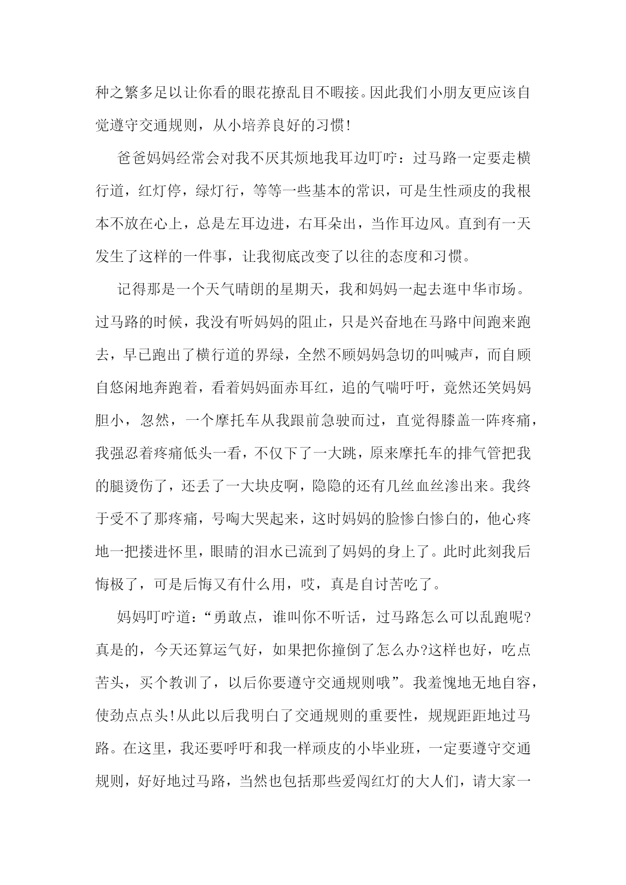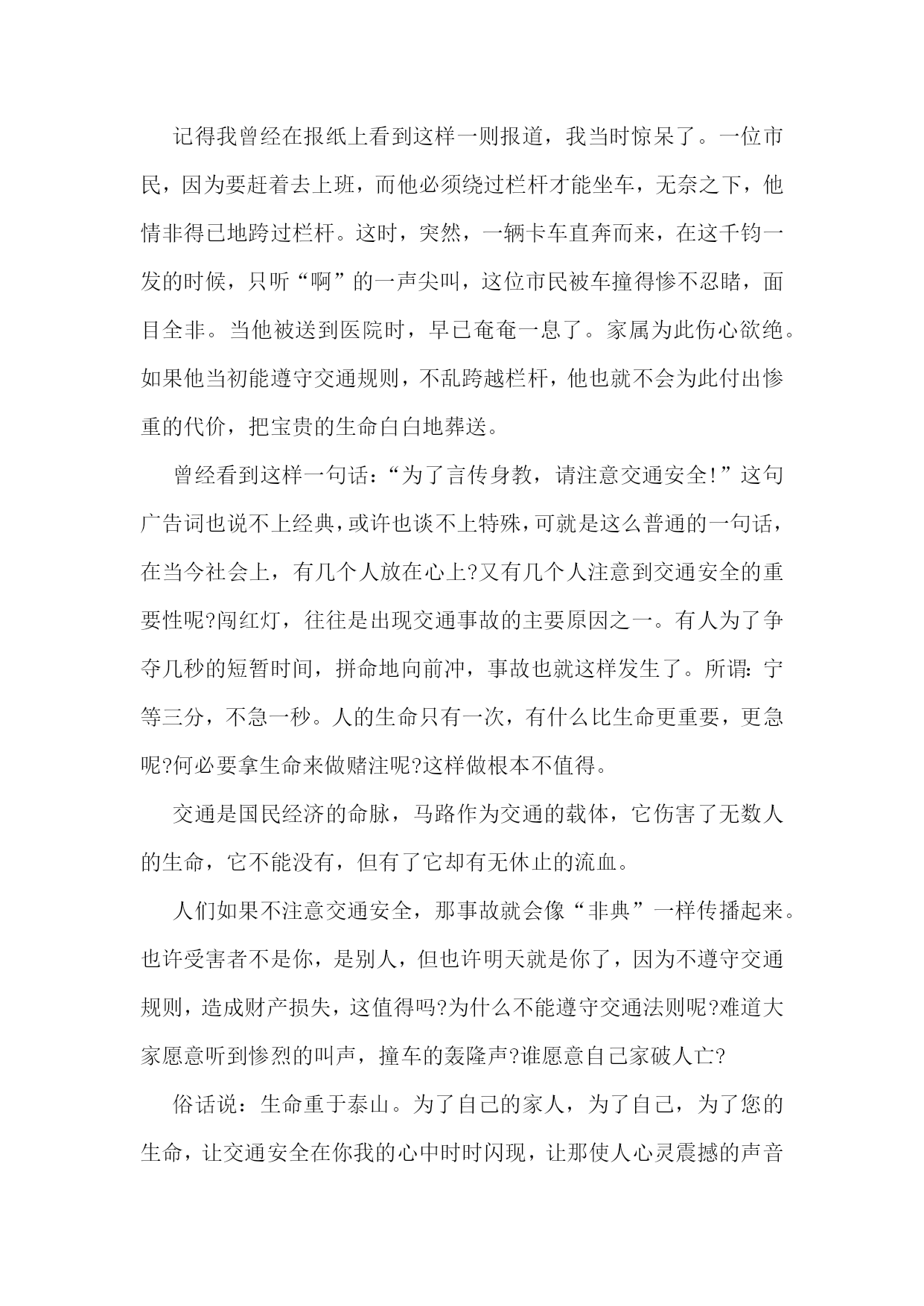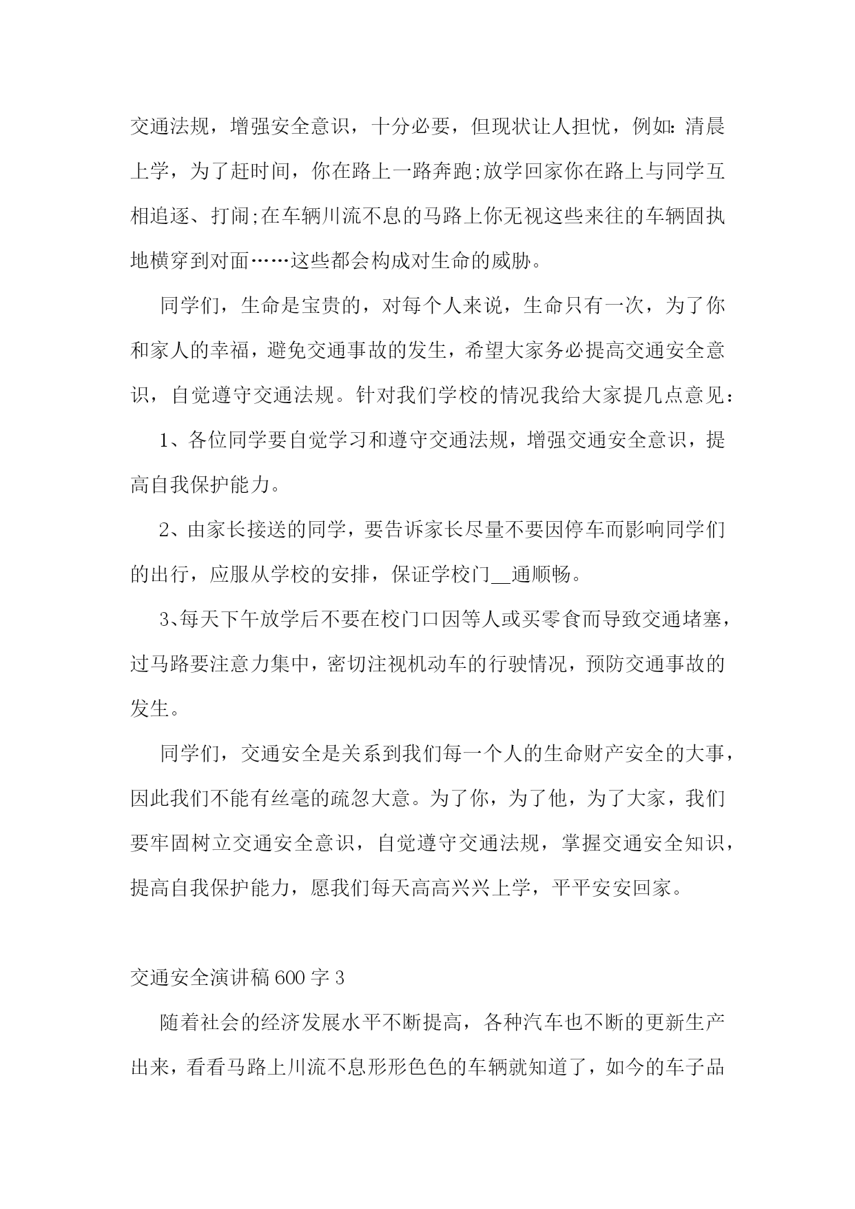 交通安全演讲稿600字交通安全演讲稿600字1敬爱的老师们,亲爱的同学们:大家好!我们生活中的安全方面有很多,其中有交通方面——交通安全。在驾车时,注意力要高度集中,如果要掉头,应先观察好周围的情况,是否允许掉头。在确保安全的情况下,距离掉头位置50米至100米之前开启左侧转向灯,示意前、后方车辆。掉头时,一定要了解好自己车辆的转弯半径,方向盘打几把最为合适。速度不宜过快,不要因为自己的车辆配备有ESP(电子稳定系统),就将车速提高。毕竟系统也是有盲点的。甚至有时会失灵。所以,不要逞能。还要时刻关注“三镜”(两侧后视镜,车内后视镜),确保万无一失。如果这里不允许掉头。就要继续行车,寻找最佳位置,进行掉头。千万不要不遵守规定,否则,后果严重。要超车时,要提前开启相应方向的转向灯,并且,眼睛要注视着相应方向的后视镜。有超车灯的车辆,可以根据情况,调整超车灯闪烁的次数。千万不要强行超车。不要疲劳驾驶、酒后驾驶。开车要礼让,在两辆车逆行同时通过一条小路时,两方中有一方要停车让行。小型车礼让大型车。否则,两辆车谁也无法通过。行车时,要选择好自己的车道。不要占用紧急车道和超车道。不要在两条线中间行车;也要注意前方车辆的转向灯、倒车灯和刹车灯是否起亮,要提前做出判断。在一些不配备行车自动落锁或感速式自动落锁系统的车辆,在行驶中,一定不要拉动车门把手。如有具备“车内多动症”的儿童,要让孩子坐在后排,并将后排的儿童安全锁锁上,以免发生意外。孩子坐车时,身子的距离一定要远离安全气囊(超过20厘米),否则,会影响安全气囊的爆开。不系安全带,一定要远离安全气囊。很小的孩子要选用儿童座椅。并且要固定牢固。我们要认识一些交通标志,汽车的车灯。过马路要走斑马线……我以后要多了解一些有关于交通安全的常识,并且牢记在心,还要去实行。交通安全演讲稿600字2敬爱的老师、亲爱的同学们:大家早上好!今天我在国旗下讲话的题目是《交通安全伴我行》。随着社会的飞速发展,生活、工作节奏也愈来愈快,汽车成了人们普遍的交通工具,它给我们带来了前所未有的方便与快捷。在大家享受交通便捷的同时,它也给我们带来了灾难,一个个鲜活的生命消失在飞驰的车轮下,一个个幸福美满的家庭转眼破碎不堪。特别是那些还没有踏上社会的小学生,也遇到了这样的灾难。我国每年都有数以千计的青少年被无情的车祸夺去了生命或造成了终生残疾,其中很大一部分原因就是因为我们同学们对道路交通法规知道得少,自我防范意识较差,缺乏自我保护意识而造成的。我校校门外虽然没有繁华的马路,但是时常会有车辆经过,遵守交通法规,增强安全意识,十分必要,但现状让人担忧,例如:清晨上学,为了赶时间,你在路上一路奔跑;放学回家你在路上与同学互相追逐、打闹;在车辆川流不息的马路上你无视这些来往的车辆固执地横穿到对面……这些都会构成对生命的威胁。同学们,生命是宝贵的,对每个人来说,生命只有一次,为了你和家人的幸福,避免交通事故的发生,希望大家务必提高交通安全意识,自觉遵守交通法规。针对我们学校的情况我给大家提几点意见:1、各位同学要自觉学习和遵守交通法规,增强交通安全意识,提高自我保护能力。2、由家长接送的同学,要告诉家长尽量不要因停车而影响同学们的出行,应服从学校的安排,保证学校门__通顺畅。3、每天下午放学后不要在校门口因等人或买零食而导致交通堵塞,过马路要注意力集中,密切注视机动车的行驶情况,预防交通事故的发生。同学们,交通安全是关系到我们每一个人的生命财产安全的大事,因此我们不能有丝毫的疏忽大意。为了你,为了他,为了大家,我们要牢固树立交通安全意识,自觉遵守交通法规,掌握交通安全知识,提高自我保护能力,愿我们每天高高兴兴上学,平平安安回家。交通安全演讲稿600字3随着社会的经济发展水平不断提高,各种汽车也不断的更新生产出来,看看马路上川流不息形形色色的车辆就知道了,如今的车子品种之繁多足以让你看的眼花撩乱目不睱接。因此我们小朋友更应该自觉遵守交通规则,从小培养良好的习惯!爸爸妈妈经常会对我不厌其烦地我耳边叮咛:过马路一定要走横行道,红灯停,绿灯行,等等一些基本的常识,可是生性顽皮的我根本不放在心上,总是左耳边进,右耳朵出,当作耳边风。直到有一天发生了这样的一件事,让我彻底改变了以往的态度和习惯。记得那是一个天气晴朗的星期天,我和妈妈一起去逛中华市场。过马路的时候,我没有听妈妈的阻止,只是兴奋地在马路中间跑来跑去,早已跑出了横行道的界绿,全然不顾妈妈急切的叫喊声,而自顾自悠闲地奔跑着,看着妈妈面赤耳红,追的气喘吁吁,竟然还笑妈妈胆小,忽然,一个摩托车从我跟前急驶而过,直觉得膝盖一阵疼痛,我强忍着疼痛低头一看,不仅下了一大跳,原来摩托车的排气管把我的腿烫伤了,还丢了一大块皮啊,隐隐的还有几丝血丝渗出来。我终于受不了那疼痛,号啕大哭起来,这时妈妈