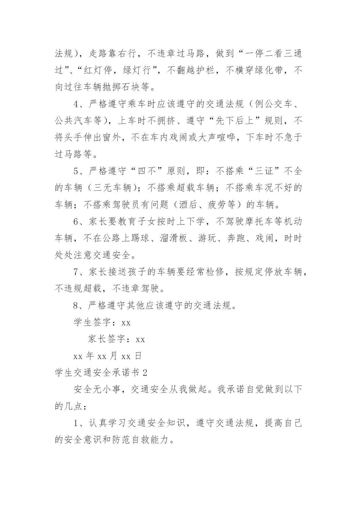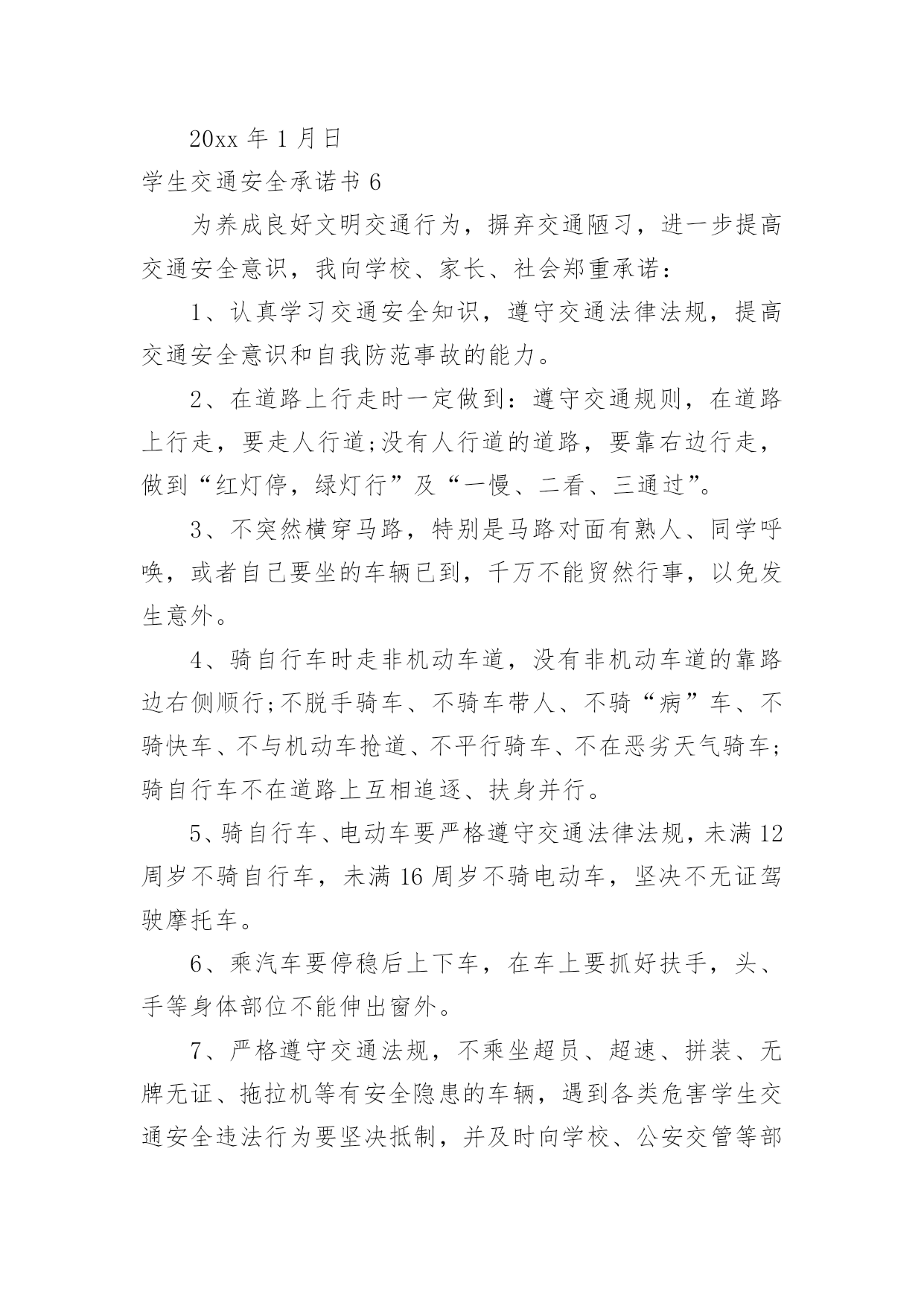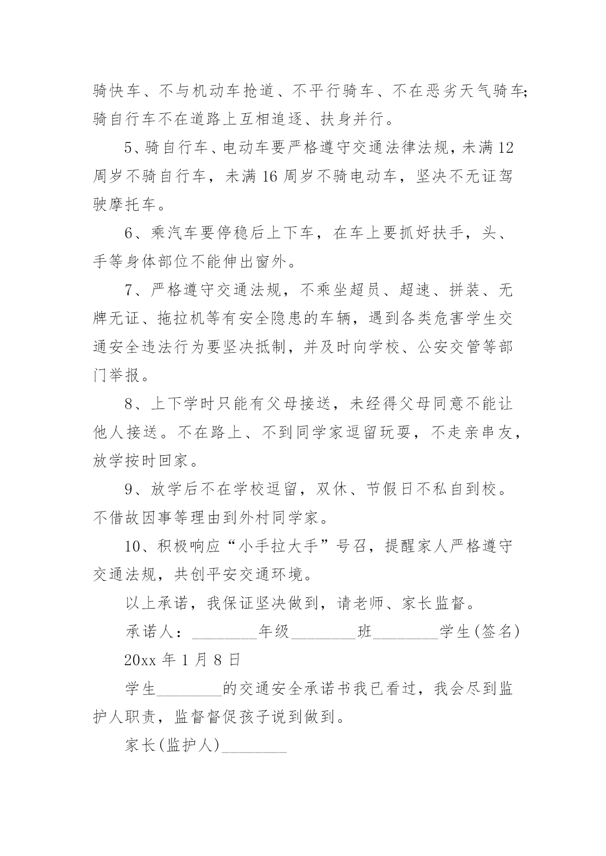 学生交通安全承诺书学生交通安全承诺书在我们平凡的日常里,我们可以使用承诺书的机会越来越多,承诺书是单方意思表示,不具有合同效力。那么一般承诺书是怎么写的呢?以下是小编为大家收集的学生交通安全承诺书,欢迎大家分享。学生交通安全承诺书1交通安全事关学生的健康成长和家庭幸福。近年来,中小学生交通事故频发,惨痛的教训已为我们敲响了警钟。为此,我校号召广大学生及家长要增强交通安全意识,遵守交通规则,乘坐安全的车辆,并养成良好的乘车习惯。为了你和他人的安全,请学生及家长承诺如下:1、认真学习交通法规和交通安全知识,提高安全意识和防护自救能力,时刻提醒自己注意维护自己和他人的交通安全。2、严格遵守骑自行车、电动自行车应该遵守的交通法规,不骑“病车”,不违章骑车,骑自行车不带人。不满12周岁的学生不在道路上驾驶自行车、三轮车,不满16周岁的学生不在道路上驾驶电动自行车。3、严格遵守行人应该遵守的交通法规(包括爱护护路法规),走路靠右行,不违章过马路,做到“一停二看三通过”、“红灯停,绿灯行”,不翻越护栏,不横穿绿化带,不向过往车辆抛掷石块等。4、严格遵守乘车时应该遵守的交通法规(例公交车、公共汽车等),上车时不拥挤、遵守“先下后上”规则,不将头手伸出窗外,不在车内戏闹或大声喧哗,下车时不急于过马路等。5、严格遵守“四不”原则,即:不搭乘“三证”不全的车辆(三无车辆);不搭乘超载车辆;不搭乘车况不好的车辆;不搭乘驾驶员有问题(酒后、疲劳等)的车辆。6、家长要教育子女按时上下学,不驾驶摩托车等机动车辆,不在公路上踢球、溜滑板、游玩、奔跑、戏闹,时时处处注意交通安全。7、家长接送孩子的车辆要经常检修,按规定停放车辆,不违规超载,不违章驾驶。8、严格遵守其他应该遵守的交通法规。学生签字:xx家长签字:xxxx年xx月xx日学生交通安全承诺书2安全无小事,交通安全从我做起。我承诺自觉做到以下的几点:1、认真学习交通安全知识,遵守交通法规,提高自己的安全意识和防范自救能力。2、严格遵守交通法规,坚决不骑车上下学,不攀扶其他车辆或者手中持物;不追逐打闹,不三五并肩行驶;放假不违章骑车。3、在道路上行走做到:走路靠右行,不违章过马路,一停二看三通过红灯停、绿灯行等。4、严格遵守五不原则:不搭乘证件不全的车辆;不搭乘超载的车辆;不搭乘非客运车辆;不搭乘司机酒后、疲劳等的车辆;不搭乘危险驾驶的车辆。5、严格执行学校、家长的交通安全教育。承诺人:20xx年xx月xx日学生交通安全承诺书3为进一步加强对学生的安全教育和管理,提高学生的交通安全意识,杜绝或减少交通安全事故的发生,作为学生家长,我与学校签订交通安全保证书。1,认真学习道路交通安全相关法律法规知识,提高自身交通法制观念和交通安全意识,为学生树立起自觉遵守交通法律法规的良好形象。2,对学生开展经常性的交通安全教育,增强他们遵守交通安全法律法规的意识和能力,鼓励其积极参加学校组织的各种交通安全教育活动。3,不让学生乘坐农用车,报废车,拖拉机和无牌无证无运营手续的车辆上下学,不乘坐超载车辆。及时向学校及有关部门举报运载学生的可疑车辆。4,切实尽到家长的职责,最大限度地保证学生在上下学途中的交通安全。以上各项我保证做到,请学校和老师予以监督。学校(章):XXXXXXXXXX家长(签字):XXXXXXXXX校长(签字):XXXXXXXXXX20xxXX年XXX月XXX日学生交通安全承诺书4交通安全事关家庭幸福和孩子健康成长。我向学校承诺如下:1、认真学习交通法规和交通安全知识,提高安全意识和防护自救能力,时刻提醒自己注意维护自己和他人的交通安全。2、严格遵守交通法规,不在道路上驾驶自行车、三轮车、电动自行车。3、严格遵守行人应该遵守的交通法规,走路靠右行,不违章过马路,做到“一停二看三通过”、“红灯停,绿灯行”,不翻越护栏,不横穿绿化带,不向过往车辆抛掷石块等。4、严格遵守乘车时应该遵守的交通法规,上车时不拥挤、遵守“先下后上”规则,不将头手伸出窗外,不在车内戏闹或大声喧哗,下车时不急于过马路等。5、严格遵守“四不”原则,即:不搭乘“三证”不全的车辆;不搭乘超载车辆;不搭乘车况不好的车辆;不搭乘驾驶员有问题(酒后、疲劳等)的车辆。6、家长要教育子女不驾驶摩托车等机动车辆,教育子女不在公路上踢球、溜滑板、游玩、奔跑、戏闹,时时处处注意交通安全。7、家长接送孩子的车辆要经常检修,不违规超载,不违章驾驶。8、严格遵守其他应该遵守的交通法规。承诺人(签字):家长签字:关防乡明德小学20xx年9月1日学生交通安全承诺书5为养成良好文明交通行为,摒弃交通陋习,进一步提高交通安全意识,我向学校、家长、社会郑重承诺:1、认真学习交通安全知识,遵守交通法律法规,提高交通安全意识和自我防范事故的能力。2、在道路上行走时一定做到:遵