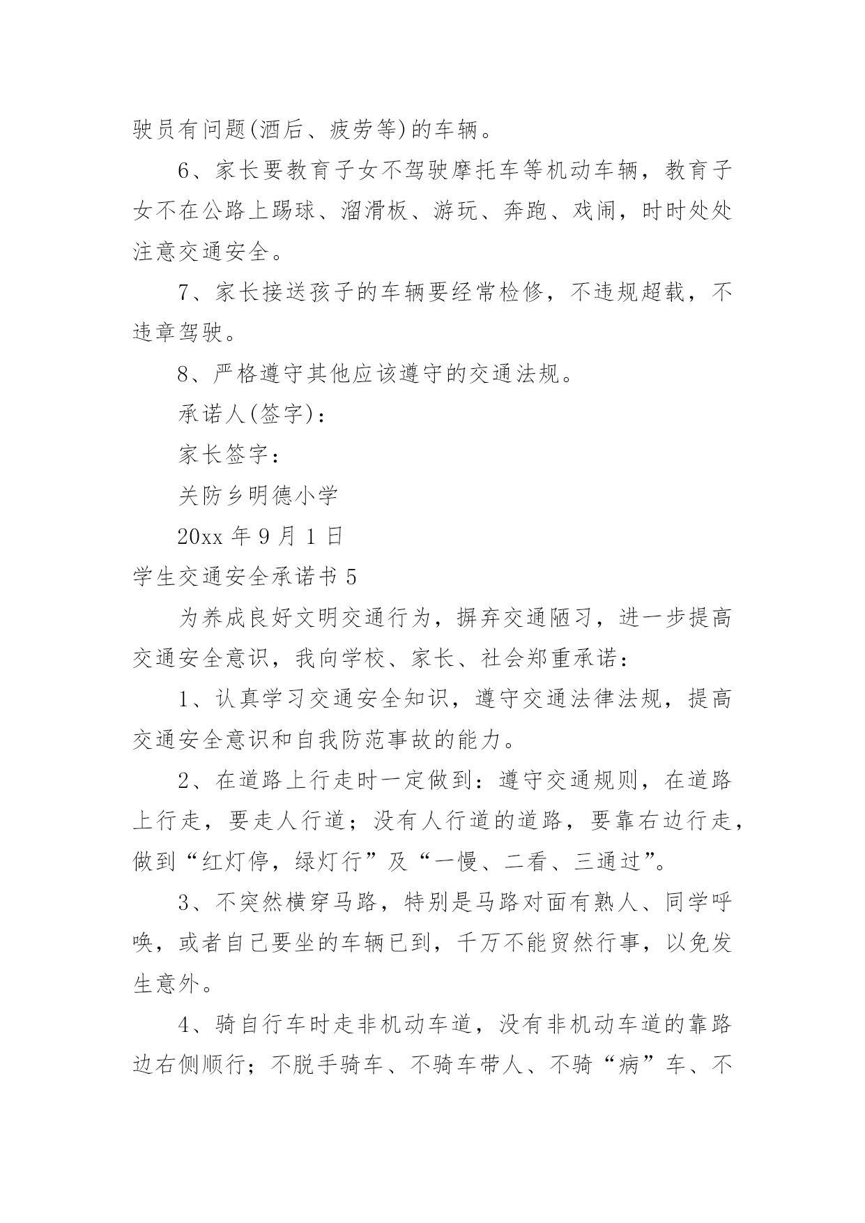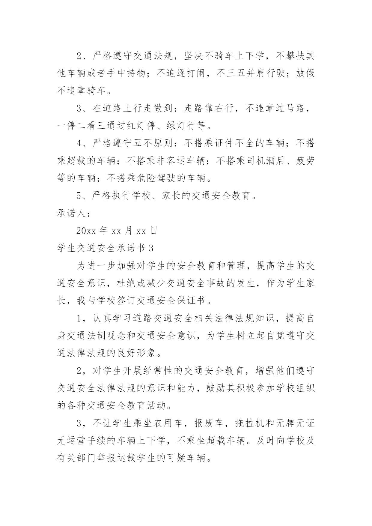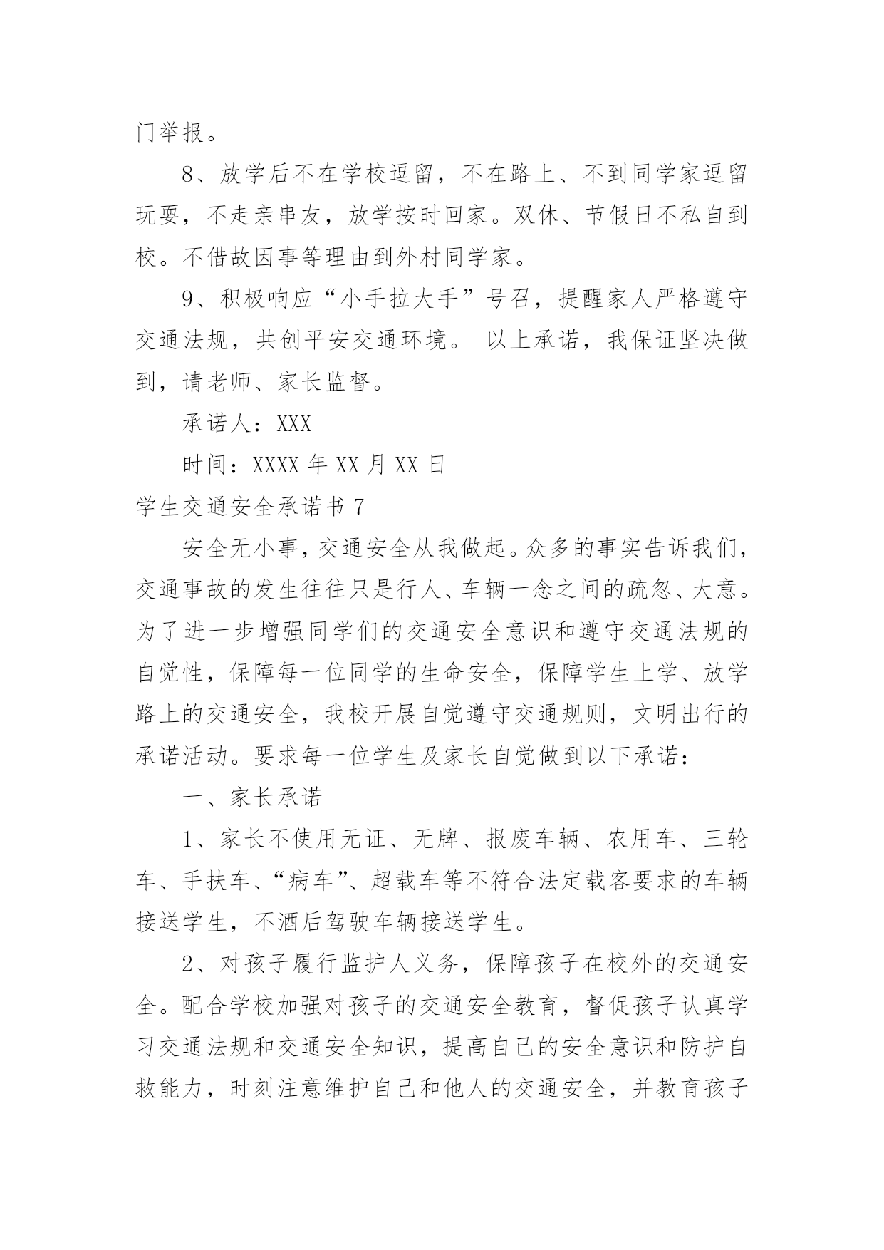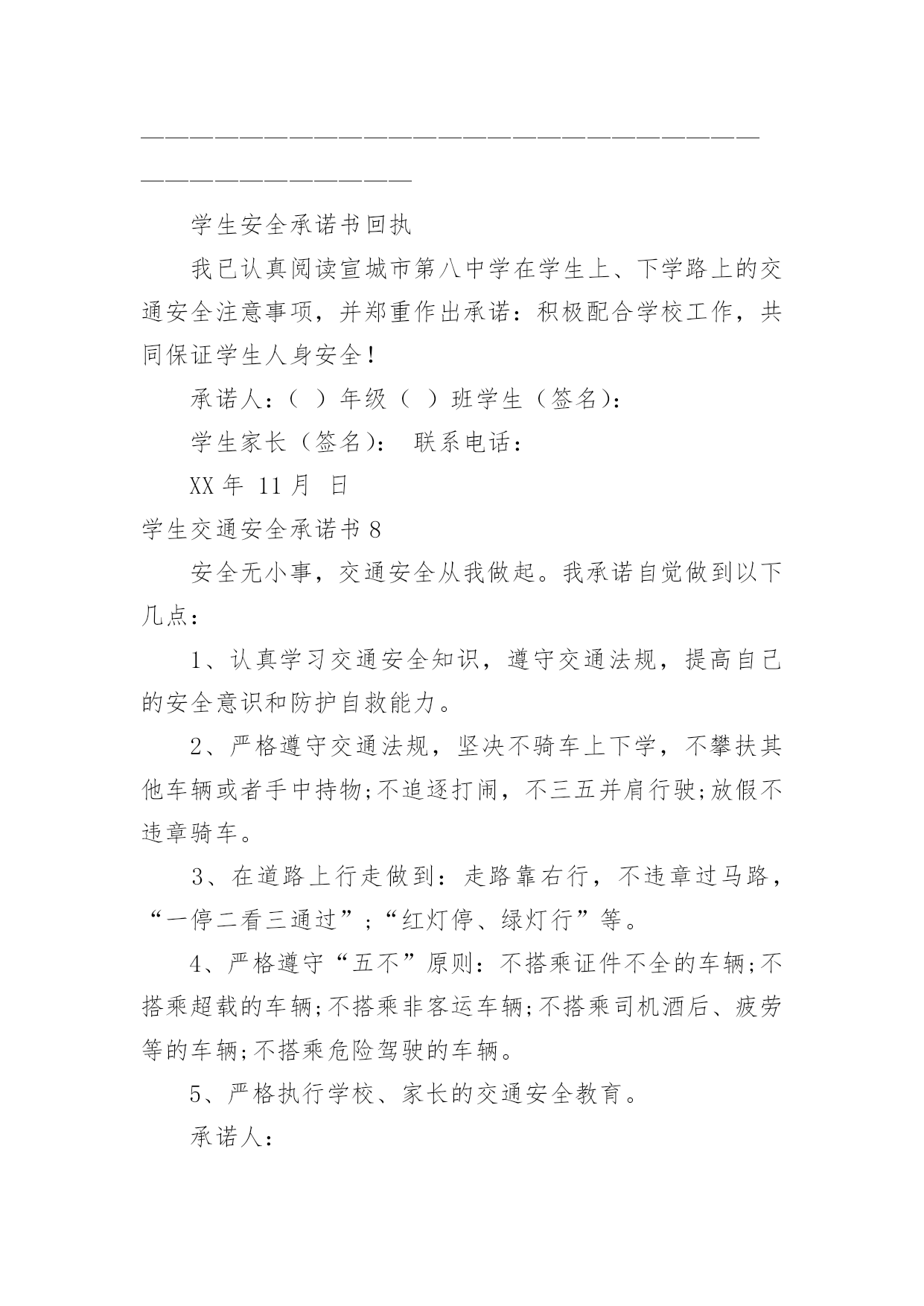 学生交通安全承诺书学生交通安全承诺书在我们平凡的日常里,我们可以使用承诺书的机会越来越多,承诺书是单方意思表示,不具有合同效力。那么一般承诺书是怎么写的呢?以下是小编为大家收集的学生交通安全承诺书,欢迎大家分享。学生交通安全承诺书1交通安全事关学生的健康成长和家庭幸福。近年来,中小学生交通事故频发,惨痛的教训已为我们敲响了警钟。为此,我校号召广大学生及家长要增强交通安全意识,遵守交通规则,乘坐安全的车辆,并养成良好的乘车习惯。为了你和他人的安全,请学生及家长承诺如下:1、认真学习交通法规和交通安全知识,提高安全意识和防护自救能力,时刻提醒自己注意维护自己和他人的交通安全。2、严格遵守骑自行车、电动自行车应该遵守的交通法规,不骑“病车”,不违章骑车,骑自行车不带人。不满12周岁的学生不在道路上驾驶自行车、三轮车,不满16周岁的学生不在道路上驾驶电动自行车。3、严格遵守行人应该遵守的交通法规(包括爱护护路法规),走路靠右行,不违章过马路,做到“一停二看三通过”、“红灯停,绿灯行”,不翻越护栏,不横穿绿化带,不向过往车辆抛掷石块等。4、严格遵守乘车时应该遵守的交通法规(例公交车、公共汽车等),上车时不拥挤、遵守“先下后上”规则,不将头手伸出窗外,不在车内戏闹或大声喧哗,下车时不急于过马路等。5、严格遵守“四不”原则,即:不搭乘“三证”不全的车辆(三无车辆);不搭乘超载车辆;不搭乘车况不好的车辆;不搭乘驾驶员有问题(酒后、疲劳等)的车辆。6、家长要教育子女按时上下学,不驾驶摩托车等机动车辆,不在公路上踢球、溜滑板、游玩、奔跑、戏闹,时时处处注意交通安全。7、家长接送孩子的车辆要经常检修,按规定停放车辆,不违规超载,不违章驾驶。8、严格遵守其他应该遵守的交通法规。学生签字:xx家长签字:xxxx年xx月xx日学生交通安全承诺书2安全无小事,交通安全从我做起。我承诺自觉做到以下的几点:1、认真学习交通安全知识,遵守交通法规,提高自己的安全意识和防范自救能力。2、严格遵守交通法规,坚决不骑车上下学,不攀扶其他车辆或者手中持物;不追逐打闹,不三五并肩行驶;放假不违章骑车。3、在道路上行走做到:走路靠右行,不违章过马路,一停二看三通过红灯停、绿灯行等。4、严格遵守五不原则:不搭乘证件不全的车辆;不搭乘超载的车辆;不搭乘非客运车辆;不搭乘司机酒后、疲劳等的车辆;不搭乘危险驾驶的车辆。5、严格执行学校、家长的交通安全教育。承诺人:20xx年xx月xx日学生交通安全承诺书3为进一步加强对学生的安全教育和管理,提高学生的交通安全意识,杜绝或减少交通安全事故的发生,作为学生家长,我与学校签订交通安全保证书。1,认真学习道路交通安全相关法律法规知识,提高自身交通法制观念和交通安全意识,为学生树立起自觉遵守交通法律法规的良好形象。2,对学生开展经常性的交通安全教育,增强他们遵守交通安全法律法规的意识和能力,鼓励其积极参加学校组织的各种交通安全教育活动。3,不让学生乘坐农用车,报废车,拖拉机和无牌无证无运营手续的车辆上下学,不乘坐超载车辆。及时向学校及有关部门举报运载学生的可疑车辆。4,切实尽到家长的职责,最大限度地保证学生在上下学途中的交通安全。以上各项我保证做到,请学校和老师予以监督。学校(章):XXXXXXXXXX家长(签字):XXXXXXXXX校长(签字):XXXXXXXXXX20xxXX年XXX月XXX日学生交通安全承诺书4交通安全事关家庭幸福和孩子健康成长。我向学校承诺如下:1、认真学习交通法规和交通安全知识,提高安全意识和防护自救能力,时刻提醒自己注意维护自己和他人的交通安全。2、严格遵守交通法规,不在道路上驾驶自行车、三轮车、电动自行车。3、严格遵守行人应该遵守的交通法规,走路靠右行,不违章过马路,做到“一停二看三通过”、“红灯停,绿灯行”,不翻越护栏,不横穿绿化带,不向过往车辆抛掷石块等。4、严格遵守乘车时应该遵守的交通法规,上车时不拥挤、遵守“先下后上”规则,不将头手伸出窗外,不在车内戏闹或大声喧哗,下车时不急于过马路等。5、严格遵守“四不”原则,即:不搭乘“三证”不全的车辆;不搭乘超载车辆;不搭乘车况不好的车辆;不搭乘驾驶员有问题(酒后、疲劳等)的车辆。6、家长要教育子女不驾驶摩托车等机动车辆,教育子女不在公路上踢球、溜滑板、游玩、奔跑、戏闹,时时处处注意交通安全。7、家长接送孩子的车辆要经常检修,不违规超载,不违章驾驶。8、严格遵守其他应该遵守的交通法规。承诺人(签字):家长签字:关防乡明德小学20xx年9月1日学生交通安全承诺书5为养成良好文明交通行为,摒弃交通陋习,进一步提高交通安全意识,我向学校、家长、社会郑重承诺:1、认真学习交通安全知识,遵守交通法律法规,提高交通安全意识和自我防范事故的能力。2、在道路上行走时一定做到:遵