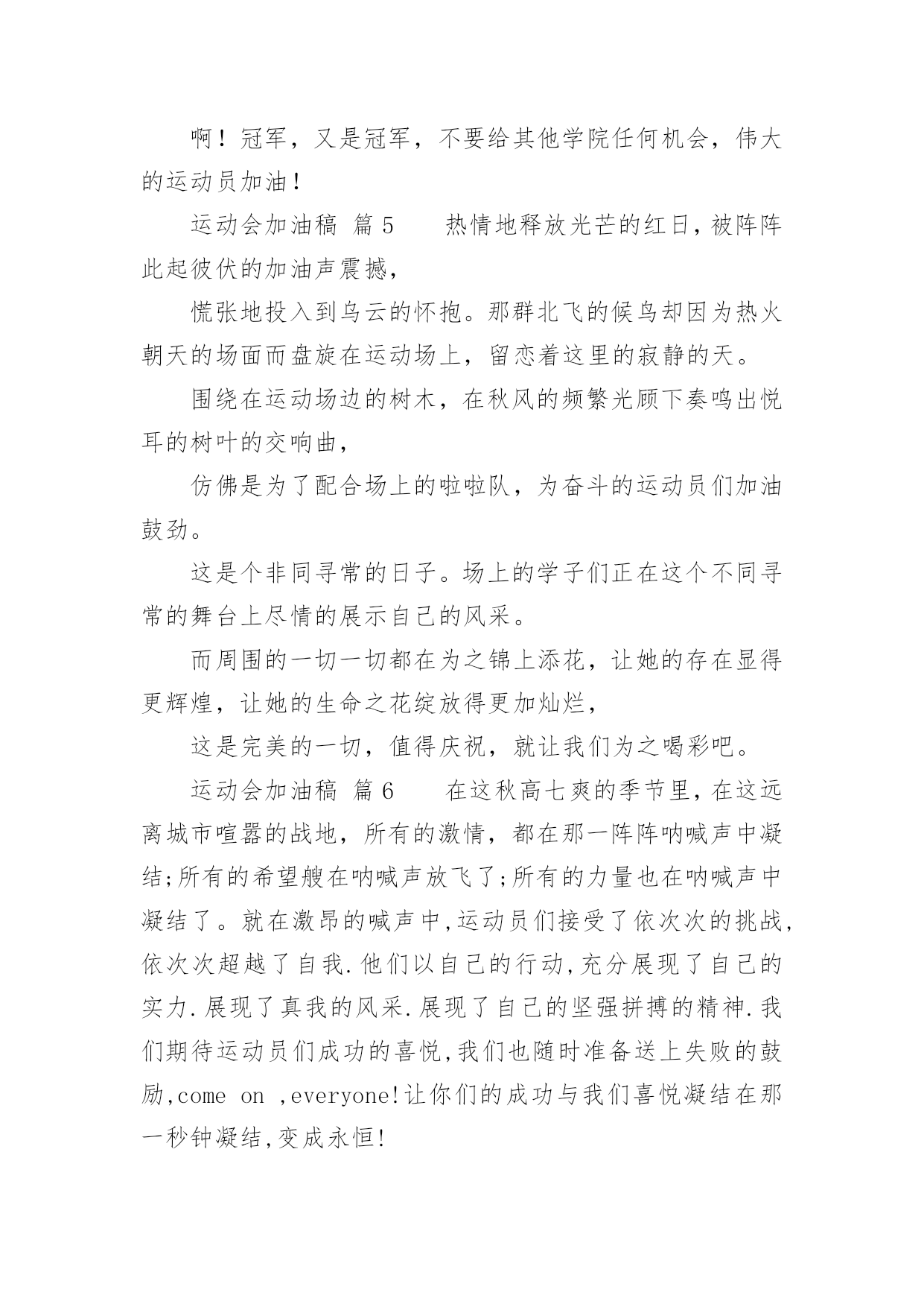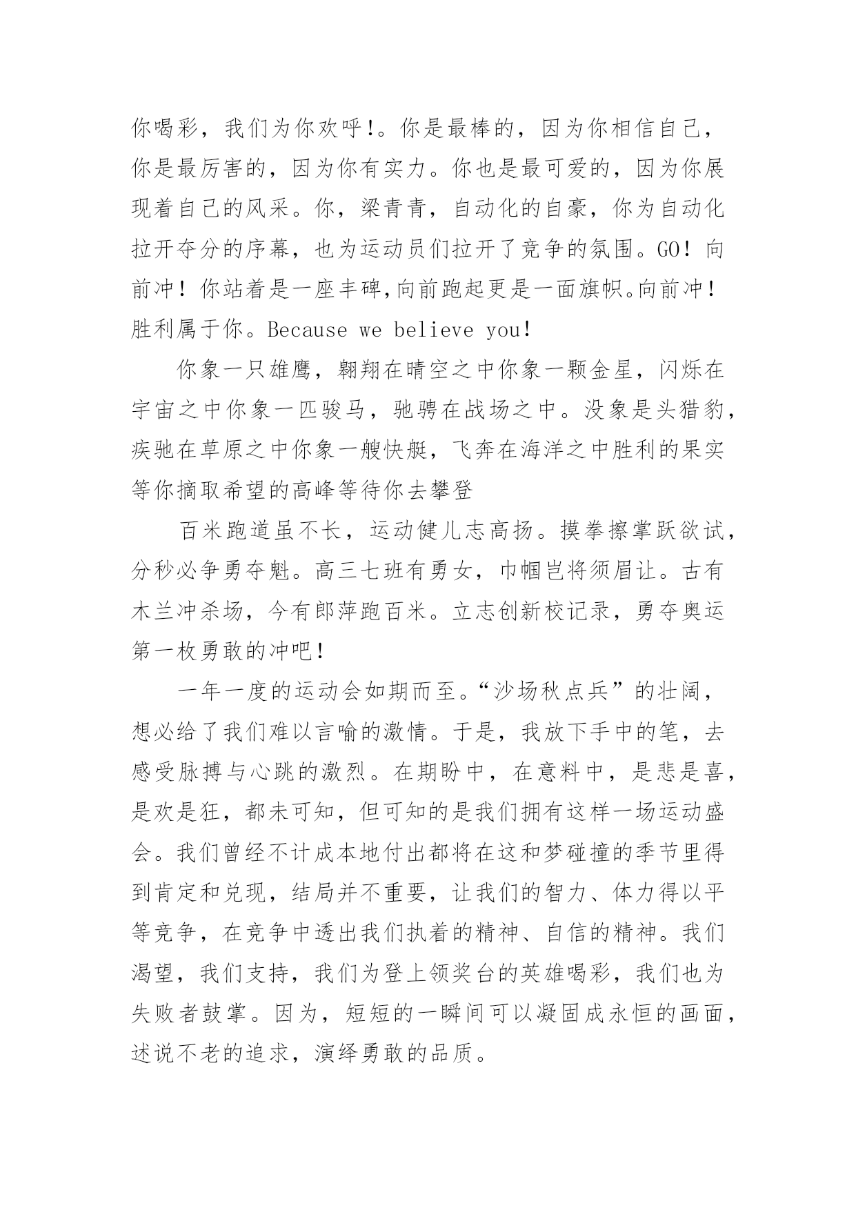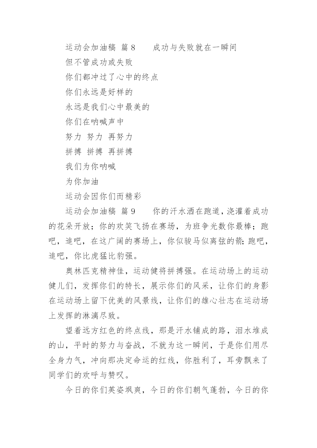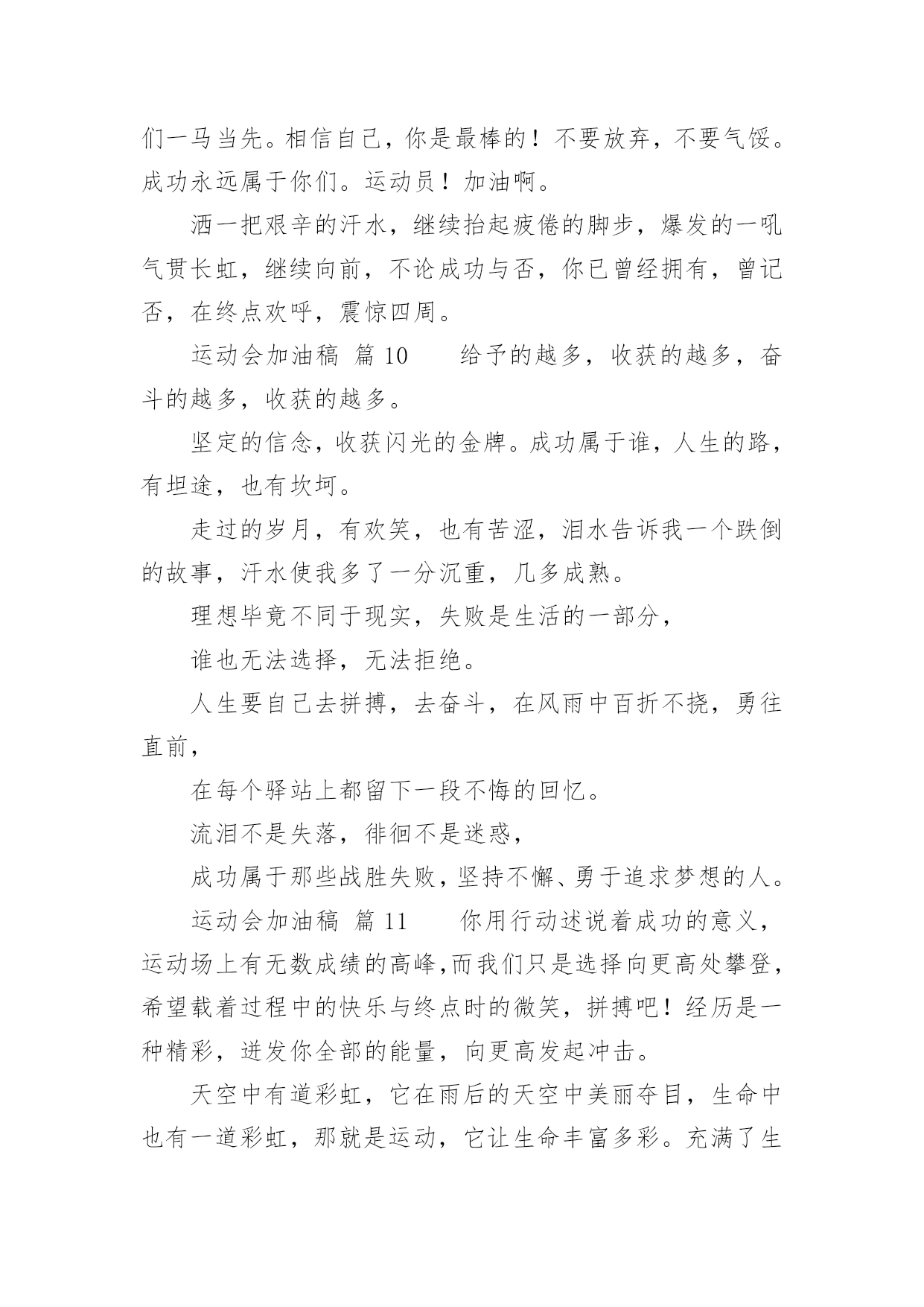 运动会加油稿运动会加油稿通用14篇在不断进步的时代,越来越多人会去使用加油稿,借助加油稿可以表达对对方的鼓励和支持。那么,怎么去写加油稿呢?下面是小编为大家整理的运动会加油稿,希望能够帮助到大家。运动会加油稿篇1努力、努力、再努力!加油、加油、再加油!你一定可以像苍龙一样,光耀九州,也可以像孤鹰一样翱翔世界,相信自己。超越自我,胜利永远属于努力的拼搏的你!他们朝气蓬勃,勇往直前;他们同甘共苦,团结一心,不一样的脚步,同一样的声音,是他们团结的心声在召唤。我们的运动健儿,摩拳擦掌,跃跃欲试,要在运动场上一显身手,互论短长。运动场上,显露竞争精神,展现我辈英雄本色;运动场下,友谊第一,比赛第二;增进感情,健身才可以健康。运动健儿最漂亮!青春是不老的誓言,飞扬是年轻的梦想,金色的十月,让我们在这长长的跑道上青春飞扬,现出飒爽的风姿,亮出真我的风采,带上同学们的热情,载着同伴们的期望,背负老师的嘱托,在这活力四射的校园里,放飞你的青春活力和运动激情。运动会加油稿篇2成功了!终于成功了!我们为你喝彩,我们为你欢呼!。你是最棒的,因为你相信自己,你是最厉害的,因为你有实力。你也是最可爱的,因为你展现着自己的风采。你,梁青青,自动化的自豪,你为自动化拉开夺分的序幕,也为运动员们拉开了竞争的氛围。GO!向前冲!你站着是一座丰碑,向前跑起更是一面旗帜。向前冲!胜利属于你。Becausewebelieveyou!你象一只雄鹰,翱翔在晴空之中你象一颗金星,闪烁在宇宙之中你象一匹骏马,驰骋在战场之中。没象是头猎豹,疾驰在草原之中你象一艘快艇,飞奔在海洋之中胜利的果实等你摘取希望的高峰等待你去攀登百米跑道虽不长,运动健儿志高扬。摸拳擦掌跃欲试,分秒必争勇夺魁。高三七班有勇女,巾帼岂将须眉让。古有木兰冲杀场,今有郎萍跑百米。立志创新校记录,勇夺奥运第一枚勇敢的冲吧!一年一度的运动会如期而至。“沙场秋点兵”的壮阔,想必给了我们难以言喻的激情。于是,我放下手中的笔,去感受脉搏与心跳的激烈。在期盼中,在意料中,是悲是喜,是欢是狂,都未可知,但可知的是我们拥有这样一场运动盛会。我们曾经不计成本地付出都将在这和梦碰撞的季节里得到肯定和兑现,结局并不重要,让我们的智力、体力得以平等竞争,在竞争中透出我们执着的精神、自信的精神。我们渴望,我们支持,我们为登上领奖台的英雄喝彩,我们也为失败者鼓掌。因为,短短的一瞬间可以凝固成永恒的画面,述说不老的追求,演绎勇敢的品质。柳树抽出新芽,怎能忘了春风的吹拂?小草钻出泥土,怎能忘了春雨的滋润?花儿绽开美丽笑脸,怎能忘了太阳爱抚?孩子们的成长更不能忘记老师的培养。今天,我们成绩的取得,怎能忘记您,公正成功属于奋斗者收获闪光的金牌,无私的裁判员老师。运动会加油稿篇31、你的毅力令我们全班折服,你的努力,令我们全班佩服,你是我们班的焦点,你是全班的中心,不屈不挠,坚持不懈,你让我们真正体会到奥运精神。2、或许,有意无意之间,你已陷入一场惊心动魄的争夺之中,即使天崩地裂,日月无光,你毫无怨言,永往直前。既然心中已锁定目标,就抛却一切。3、漫漫长路,你愿一人独撑,忍受着孤独与寂寞,承受着体力与精神的压迫,只任汗水溶于泪水,可脚步却从不停歇。4、生活中,我们每一天都在尝试;我们走向成功,品味失败,走过心灵的阴雨晴空。运动员们,不要放下尝试,无论失败与否,重要的是你勇于参与的精神。5、运动场上彩旗飘,运动健儿显英豪,跳跃身姿轻如燕,铅球飞落地动摇,百米冲刺如猛虎。6、梦想毕竟不一样于现实,失败是生活的一部分,谁也无法选择,无法拒绝。7、坚定,执着,耐力与希望,在延伸的白色跑道中点点凝聚!力量,信念,拼搏与奋斗,在遥远的终点线上渐渐明亮!时代的强音正在你的脚下踏响。8、温暖的阳光洒在赛场上,男子乙组标枪的比赛即将开始。赛场上,一道道优美的弧线将轻盈地划过天空。健儿们用手中的标枪向距离的权限发起一轮又一轮的挑战。标枪在空中轻盈的姿态,是健儿们强健的力量和熟练的技巧的结合。9、广阔的绿茵场,是为你们搭建的舞台。张扬吧,年轻的心,我们将为你永远喝彩!10、你说你必须要赢,也必须会赢。枪声响了,四百米,九秒却又像几个世纪,你喊着跑着,迈开大步,跨过世纪。运动会加油稿篇4依然是蓝色的天空,依然是金色的阳光,依然是绿色的草地,依然是红色的跑道,依然是你,勇敢的你,坚强的你。你不是一个人在奔跑,在这一刻,刘翔、姚明灵魂附体,你不是一个人,你代表体育学院光荣传统,你不是一个人在奔跑。只见众运动健儿并肩而行,虽然落后却毫无气馁之象。运动健儿们,我们对你们的敬仰之情,如滔滔江水连绵不绝,亦如黄河泛滥,一发不可收拾!只见一道黑影在赛场上若隐若现,定睛一看,才知是奔跑的运动健儿。比赛伊始,运动健儿犹如变了一个人,身法如鬼如魅,须臾不见踪影。啊!冠军,又是冠军,不要