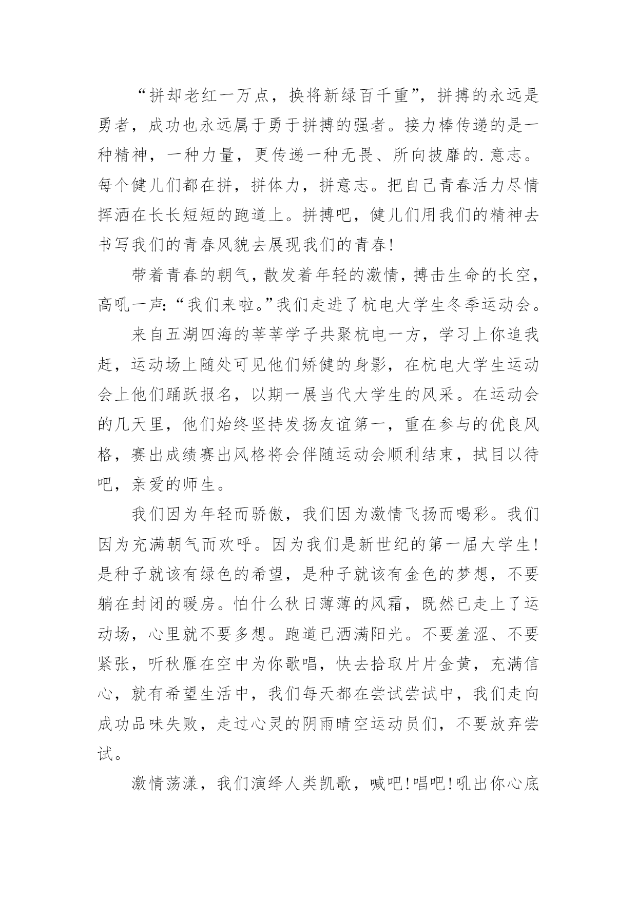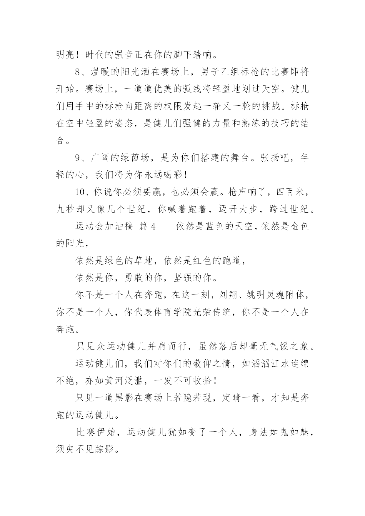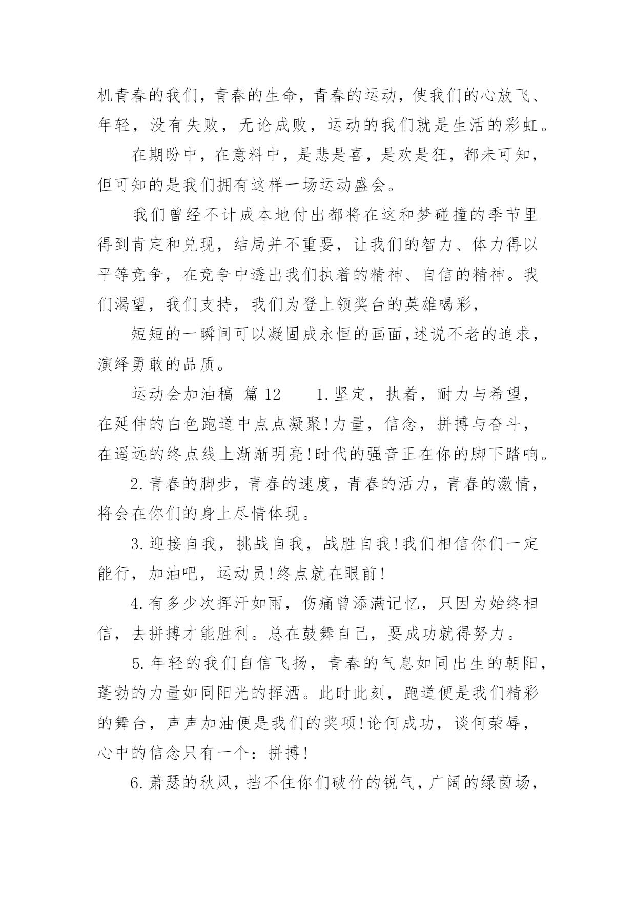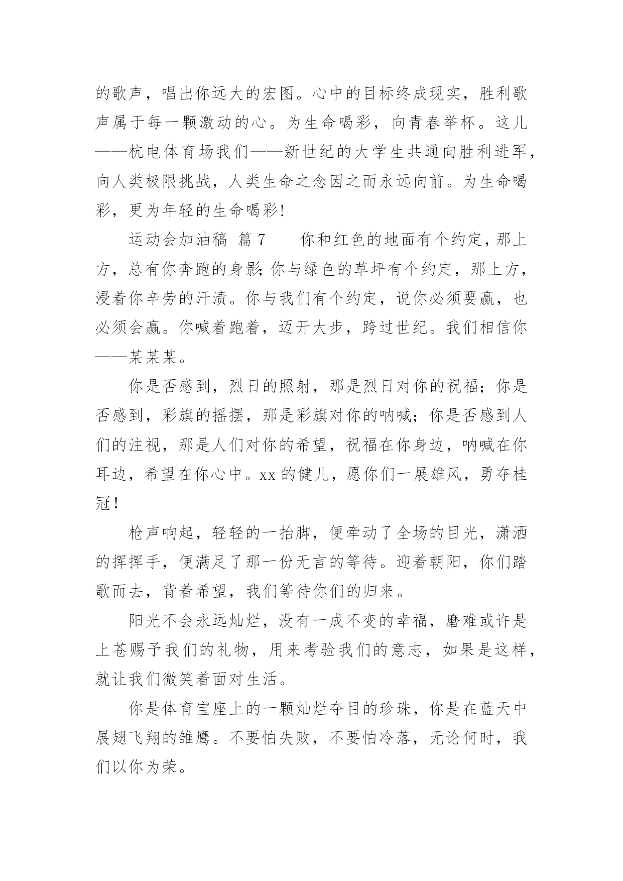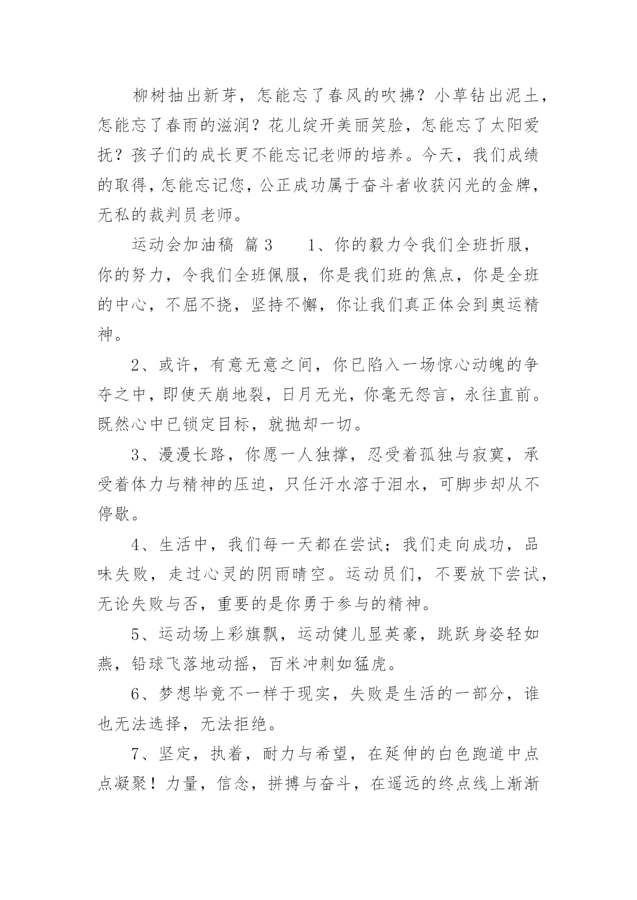 运动会加油稿运动会加油稿通用14篇在不断进步的时代,越来越多人会去使用加油稿,借助加油稿可以表达对对方的鼓励和支持。那么,怎么去写加油稿呢?下面是小编为大家整理的运动会加油稿,希望能够帮助到大家。运动会加油稿篇1努力、努力、再努力!加油、加油、再加油!你一定可以像苍龙一样,光耀九州,也可以像孤鹰一样翱翔世界,相信自己。超越自我,胜利永远属于努力的拼搏的你!他们朝气蓬勃,勇往直前;他们同甘共苦,团结一心,不一样的脚步,同一样的声音,是他们团结的心声在召唤。我们的运动健儿,摩拳擦掌,跃跃欲试,要在运动场上一显身手,互论短长。运动场上,显露竞争精神,展现我辈英雄本色;运动场下,友谊第一,比赛第二;增进感情,健身才可以健康。运动健儿最漂亮!青春是不老的誓言,飞扬是年轻的梦想,金色的十月,让我们在这长长的跑道上青春飞扬,现出飒爽的风姿,亮出真我的风采,带上同学们的热情,载着同伴们的期望,背负老师的嘱托,在这活力四射的校园里,放飞你的青春活力和运动激情。运动会加油稿篇2成功了!终于成功了!我们为你喝彩,我们为你欢呼!。你是最棒的,因为你相信自己,你是最厉害的,因为你有实力。你也是最可爱的,因为你展现着自己的风采。你,梁青青,自动化的自豪,你为自动化拉开夺分的序幕,也为运动员们拉开了竞争的氛围。GO!向前冲!你站着是一座丰碑,向前跑起更是一面旗帜。向前冲!胜利属于你。Becausewebelieveyou!你象一只雄鹰,翱翔在晴空之中你象一颗金星,闪烁在宇宙之中你象一匹骏马,驰骋在战场之中。没象是头猎豹,疾驰在草原之中你象一艘快艇,飞奔在海洋之中胜利的果实等你摘取希望的高峰等待你去攀登百米跑道虽不长,运动健儿志高扬。摸拳擦掌跃欲试,分秒必争勇夺魁。高三七班有勇女,巾帼岂将须眉让。古有木兰冲杀场,今有郎萍跑百米。立志创新校记录,勇夺奥运第一枚勇敢的冲吧!一年一度的运动会如期而至。“沙场秋点兵”的壮阔,想必给了我们难以言喻的激情。于是,我放下手中的笔,去感受脉搏与心跳的激烈。在期盼中,在意料中,是悲是喜,是欢是狂,都未可知,但可知的是我们拥有这样一场运动盛会。我们曾经不计成本地付出都将在这和梦碰撞的季节里得到肯定和兑现,结局并不重要,让我们的智力、体力得以平等竞争,在竞争中透出我们执着的精神、自信的精神。我们渴望,我们支持,我们为登上领奖台的英雄喝彩,我们也为失败者鼓掌。因为,短短的一瞬间可以凝固成永恒的画面,述说不老的追求,演绎勇敢的品质。柳树抽出新芽,怎能忘了春风的吹拂?小草钻出泥土,怎能忘了春雨的滋润?花儿绽开美丽笑脸,怎能忘了太阳爱抚?孩子们的成长更不能忘记老师的培养。今天,我们成绩的取得,怎能忘记您,公正成功属于奋斗者收获闪光的金牌,无私的裁判员老师。运动会加油稿篇31、你的毅力令我们全班折服,你的努力,令我们全班佩服,你是我们班的焦点,你是全班的中心,不屈不挠,坚持不懈,你让我们真正体会到奥运精神。2、或许,有意无意之间,你已陷入一场惊心动魄的争夺之中,即使天崩地裂,日月无光,你毫无怨言,永往直前。既然心中已锁定目标,就抛却一切。3、漫漫长路,你愿一人独撑,忍受着孤独与寂寞,承受着体力与精神的压迫,只任汗水溶于泪水,可脚步却从不停歇。4、生活中,我们每一天都在尝试;我们走向成功,品味失败,走过心灵的阴雨晴空。运动员们,不要放下尝试,无论失败与否,重要的是你勇于参与的精神。5、运动场上彩旗飘,运动健儿显英豪,跳跃身姿轻如燕,铅球飞落地动摇,百米冲刺如猛虎。6、梦想毕竟不一样于现实,失败是生活的一部分,谁也无法选择,无法拒绝。7、坚定,执着,耐力与希望,在延伸的白色跑道中点点凝聚!力量,信念,拼搏与奋斗,在遥远的终点线上渐渐明亮!时代的强音正在你的脚下踏响。8、温暖的阳光洒在赛场上,男子乙组标枪的比赛即将开始。赛场上,一道道优美的弧线将轻盈地划过天空。健儿们用手中的标枪向距离的权限发起一轮又一轮的挑战。标枪在空中轻盈的姿态,是健儿们强健的力量和熟练的技巧的结合。9、广阔的绿茵场,是为你们搭建的舞台。张扬吧,年轻的心,我们将为你永远喝彩!10、你说你必须要赢,也必须会赢。枪声响了,四百米,九秒却又像几个世纪,你喊着跑着,迈开大步,跨过世纪。运动会加油稿篇4依然是蓝色的天空,依然是金色的阳光,依然是绿色的草地,依然是红色的跑道,依然是你,勇敢的你,坚强的你。你不是一个人在奔跑,在这一刻,刘翔、姚明灵魂附体,你不是一个人,你代表体育学院光荣传统,你不是一个人在奔跑。只见众运动健儿并肩而行,虽然落后却毫无气馁之象。运动健儿们,我们对你们的敬仰之情,如滔滔江水连绵不绝,亦如黄河泛滥,一发不可收拾!只见一道黑影在赛场上若隐若现,定睛一看,才知是奔跑的运动健儿。比赛伊始,运动健儿犹如变了一个人,身法如鬼如魅,须臾不见踪影。啊!冠军,又是冠军,不要