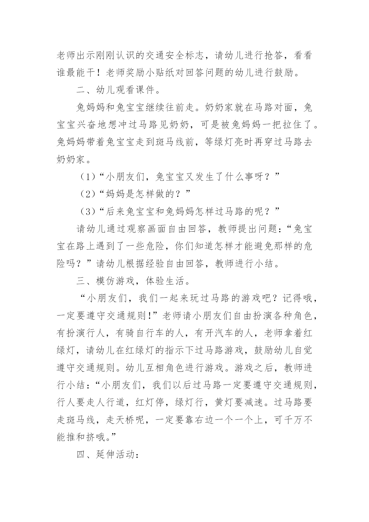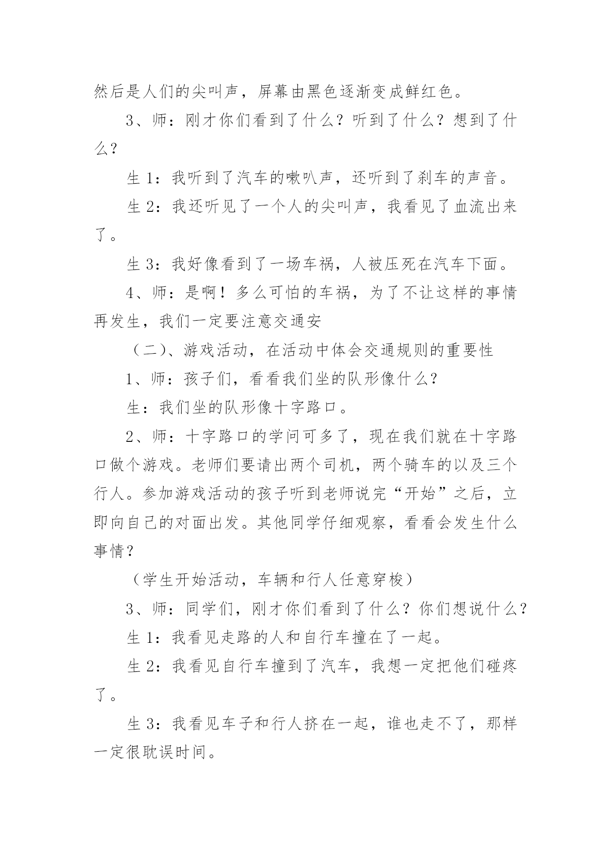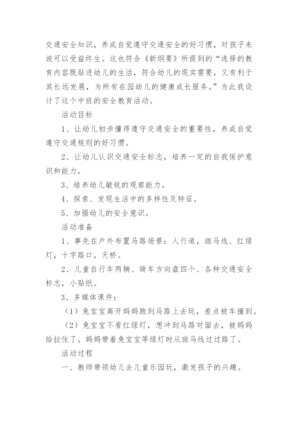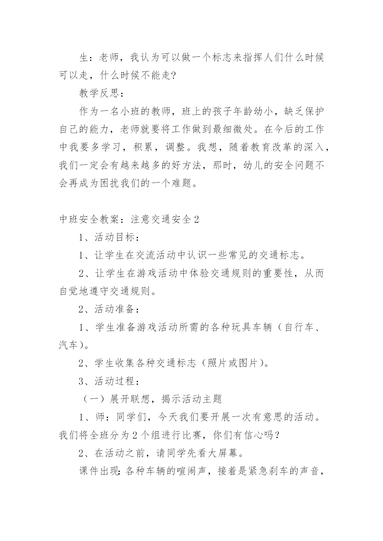中班安全教案:注意交通安全作为一位无私奉献的人民教师,有必要进行细致的教案准备工作,教案有利于教学水平的提高,有助于教研活动的开展。来参考自己需要的教案吧!以下是小编为大家收集的中班安全教案:注意交通安全,供大家参考借鉴,希望可以帮助到有需要的朋友。中班安全教案:注意交通安全1一、活动目标:1、让学生在交流活动中认识一些常见的交通标志。2、让学生在游戏活动中体验交通规则的重要性,从而自觉地遵守交通规则。3、让学生在合作学习中学得一些基本的学习方法。4、能积极参加游戏活动,并学会自我保护。5、能说出不易玩耍的地方存在什么样的安全隐患。二、学情分析:学生们对《品德与生活》的兴趣浓厚,他们喜欢和同伴进行交流,喜欢游戏活动,喜欢在活动中展示自己。三、指导策略:1、以活动贯穿全课。2、让学生在游戏活动中体验和感悟。3、将交警请到课堂,实现课堂的开放性。4、在交流合作中实现活动的有效互动。四、活动准备:1、学生准备游戏活动所需的各种玩具车辆(自行车、汽车)。2、精心布置活动场景。3、学生收集各种交通标志(照片或图片)。4、活动涉及的相关课件。五、课堂活动实录:(一)展开联想,揭示活动主题1、师:孩子们,今天我们要开展一次有意思的活动。我们将全班分为8个组进行比赛,你们有信心吗?生:有信心!2、师:很好!在活动之前,请孩子们先看大屏幕。课件出现:各种车辆的喧闹声,接着是紧急刹车的声音,然后是人们的尖叫声,屏幕由黑色逐渐变成鲜红色。学生认真地听着,仔细地看着……师:孩子们,刚才你们看到了什么?听到了什么?想到了什么?生1:我听到了汽车的嗽叭声,还听到了刹车的声音。生2:我还听见了一个人的尖叫声,我看见了血流出来了。生3:我好像看到了一场车祸,人被压死在汽车下面。3、师:是啊!多么可怕的车祸,为了不让这样的事情再发生,我们一定要注意交通安全。(板书活动主题)(二)、游戏活动??在活动中体会交通规则的重要性1、师:孩子们,看看我们坐的队形像什么?生:我们坐的队形像十字路口。师:十字路口的学问可多了,现在我们就在十字路口做个游戏。老师们要请出三个司机,三个骑车的以及五个行人。(学生到位)参加游戏活动的'孩子听到老师说完“开始”之后,立即向自己的对面出发。其他孩子仔细观察,看看会发生什么事情?(学生开始活动,车辆和行人任意穿梭)2、师:孩子们,刚才你们看到了什么?你们想说什么?生1:我看见走路的人和自行车撞在了一起,我想说:“你们如果慢一点就好了!”师:你的建议挺不错!生2:我看见自行车撞到了汽车,我想一定把他们碰疼了。师:我想也是。生3:我看见车子和行人挤在一起,谁也走不了,那样一定很耽误时间。3、师:是啊!如果生活中也是这样可不行啊!为什么会发生这种情况呢?生1:我觉得是他们不懂规矩。生2:我认为是因为没有人指挥他们,如果有人指挥他们怎么走,一定不会发生赌车的事情。师:对啊!要是有人指挥就好了!生:老师,我认为可以做一个标志来指挥人们什么时候可以走,什么时候不能走?教学反思:作为一名小班的教师,班上的孩子年龄幼小,缺乏保护自己的能力,老师就要将工作做到最细微处。在今后的工作中我要多学习,积累,调整。我想,随着教育改革的深入,我们一定会有越来越多的好方法,那时,幼儿的安全问题不会再成为困扰我们的一个难题。中班安全教案:注意交通安全21、活动目标:1、让学生在交流活动中认识一些常见的交通标志。2、让学生在游戏活动中体验交通规则的重要性,从而自觉地遵守交通规则。2、活动准备:1、学生准备游戏活动所需的各种玩具车辆(自行车、汽车)。2、学生收集各种交通标志(照片或图片)。3、活动过程:(一)展开联想,揭示活动主题1、师:同学们,今天我们要开展一次有意思的活动。我们将全班分为2个组进行比赛,你们有信心吗?2、在活动之前,请同学先看大屏幕。课件出现:各种车辆的喧闹声,接着是紧急刹车的声音,然后是人们的尖叫声,屏幕由黑色逐渐变成鲜红色。3、师:刚才你们看到了什么?听到了什么?想到了什么?生1:我听到了汽车的嗽叭声,还听到了刹车的声音。生2:我还听见了一个人的尖叫声,我看见了血流出来了。生3:我好像看到了一场车祸,人被压死在汽车下面。4、师:是啊!多么可怕的车祸,为了不让这样的事情再发生,我们一定要注意交通安(二)、游戏活动,在活动中体会交通规则的重要性1、师:孩子们,看看我们坐的队形像什么?生:我们坐的队形像十字路口。2、师:十字路口的学问可多了,现在我们就在十字路口做个游戏。老师们要请出两个司机,两个骑车的以及三个行人。参加游戏活动的孩子听到老师说完“开始”之后,立即向自己的对面出发。其他同学仔细观察,看看会发生什么事情?(学生开始活动,车辆和行人任意穿梭)3、师:同学们,刚才你们看到了什么?你们想说什么?生1:我看见走路的人和自行车撞在了一起。生2:我