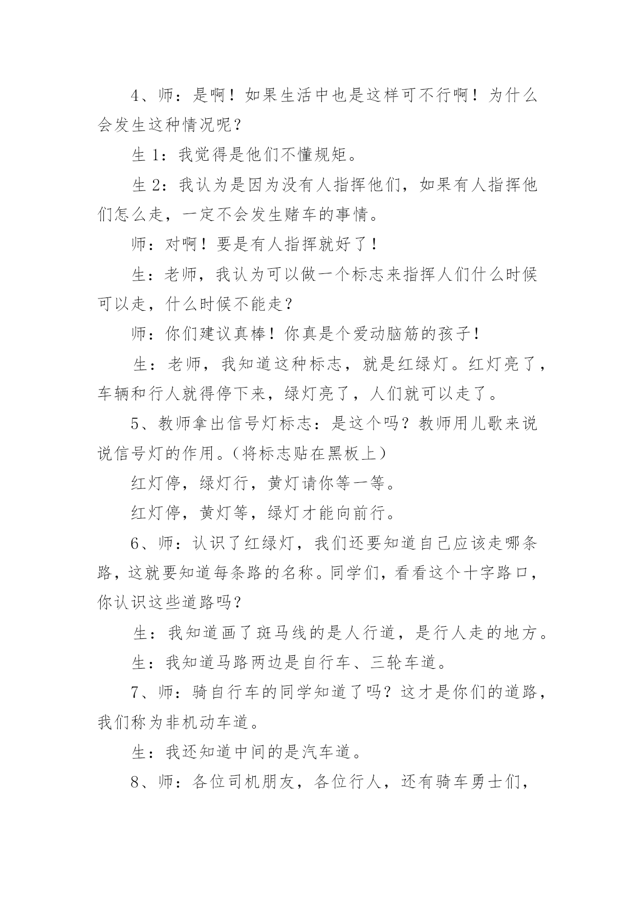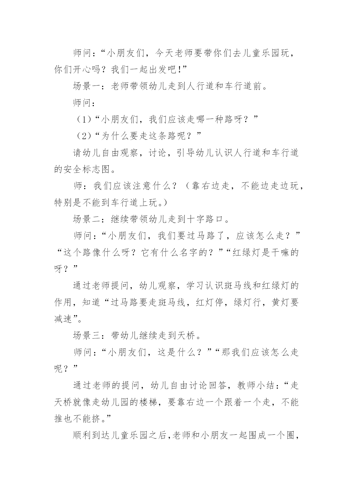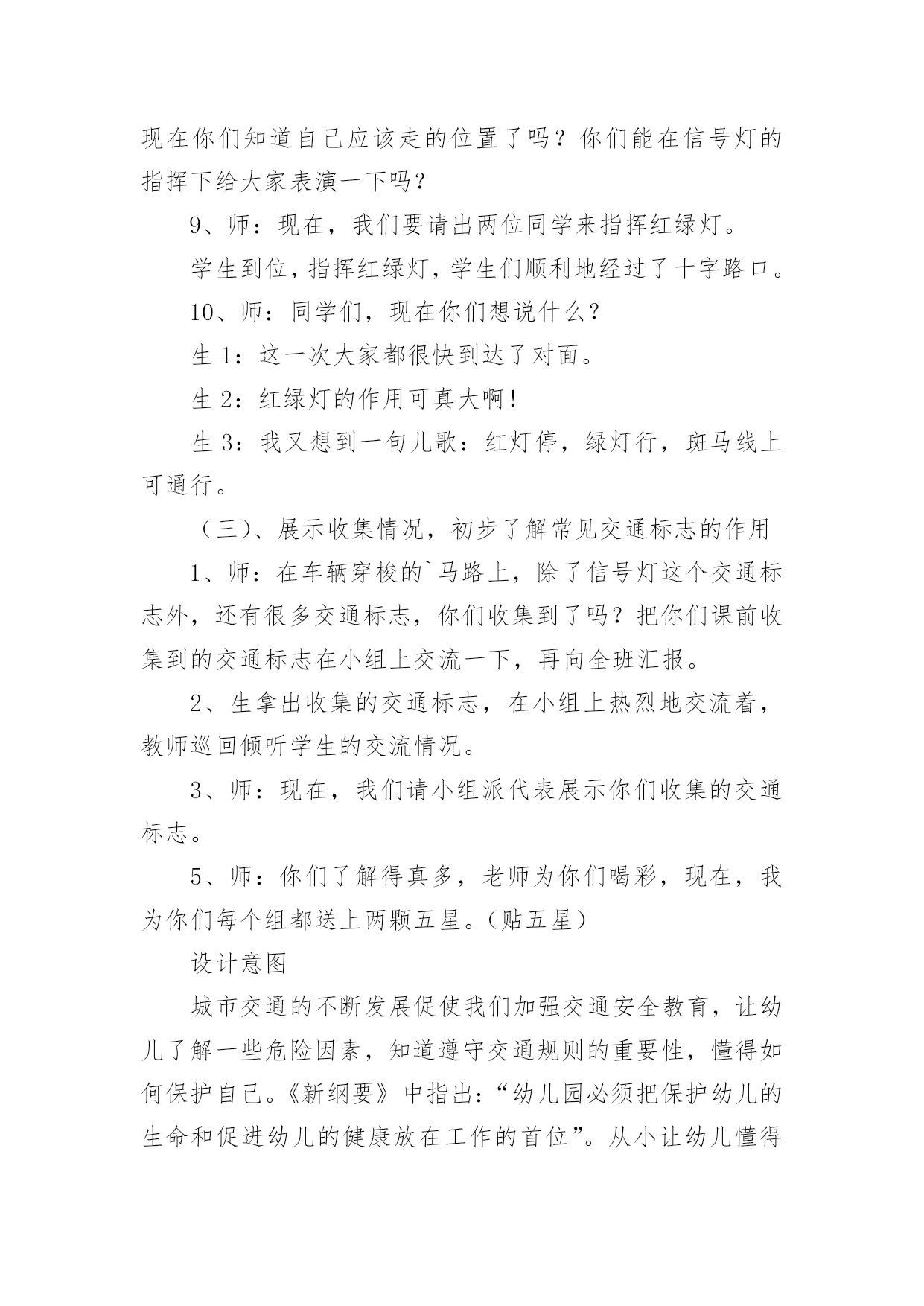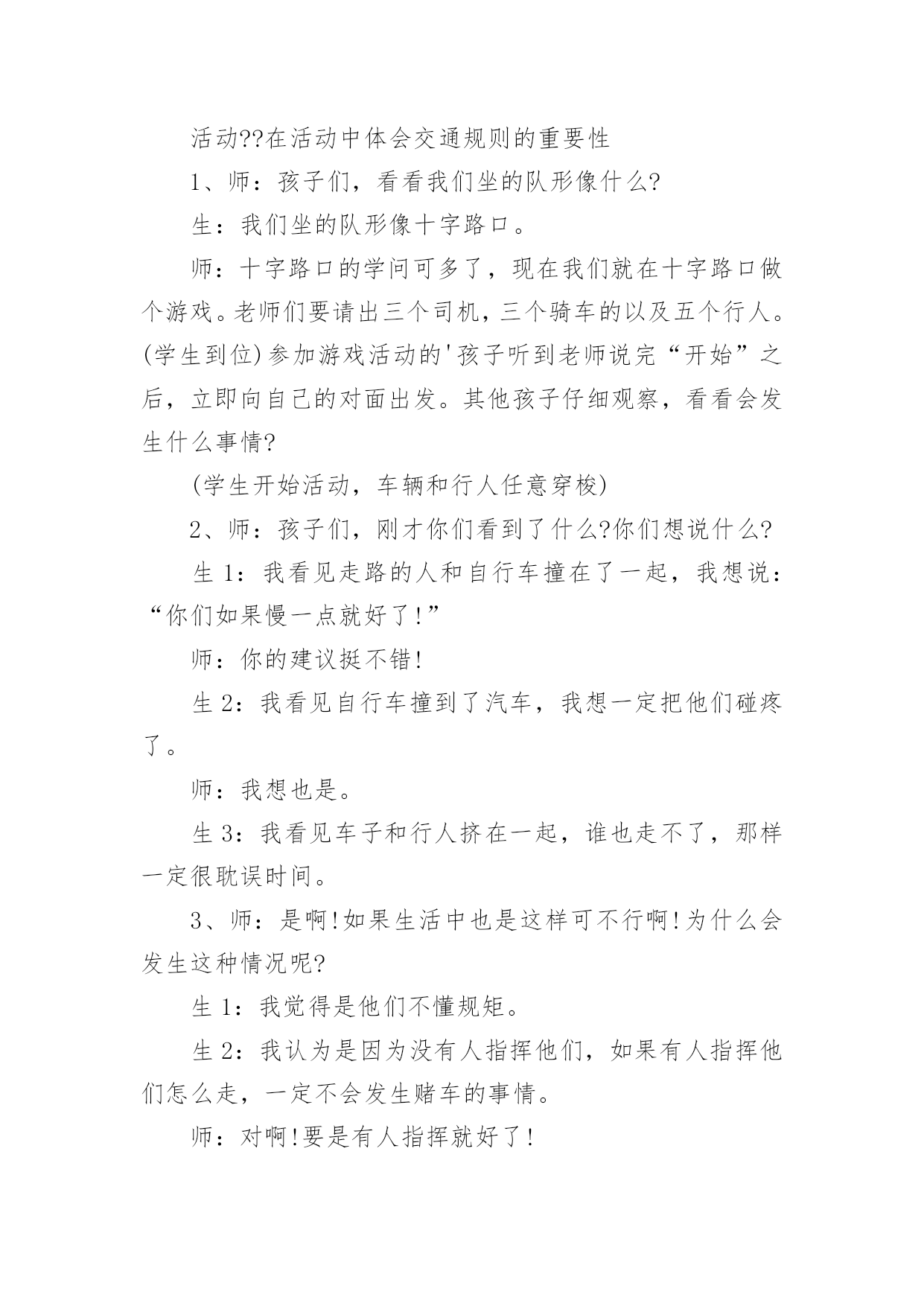 中班安全教案:注意交通安全作为一位无私奉献的人民教师,有必要进行细致的教案准备工作,教案有利于教学水平的提高,有助于教研活动的开展。来参考自己需要的教案吧!以下是小编为大家收集的中班安全教案:注意交通安全,供大家参考借鉴,希望可以帮助到有需要的朋友。中班安全教案:注意交通安全1一、活动目标:1、让学生在交流活动中认识一些常见的交通标志。2、让学生在游戏活动中体验交通规则的重要性,从而自觉地遵守交通规则。3、让学生在合作学习中学得一些基本的学习方法。4、能积极参加游戏活动,并学会自我保护。5、能说出不易玩耍的地方存在什么样的安全隐患。二、学情分析:学生们对《品德与生活》的兴趣浓厚,他们喜欢和同伴进行交流,喜欢游戏活动,喜欢在活动中展示自己。三、指导策略:1、以活动贯穿全课。2、让学生在游戏活动中体验和感悟。3、将交警请到课堂,实现课堂的开放性。4、在交流合作中实现活动的有效互动。四、活动准备:1、学生准备游戏活动所需的各种玩具车辆(自行车、汽车)。2、精心布置活动场景。3、学生收集各种交通标志(照片或图片)。4、活动涉及的相关课件。五、课堂活动实录:(一)展开联想,揭示活动主题1、师:孩子们,今天我们要开展一次有意思的活动。我们将全班分为8个组进行比赛,你们有信心吗?生:有信心!2、师:很好!在活动之前,请孩子们先看大屏幕。课件出现:各种车辆的喧闹声,接着是紧急刹车的声音,然后是人们的尖叫声,屏幕由黑色逐渐变成鲜红色。学生认真地听着,仔细地看着……师:孩子们,刚才你们看到了什么?听到了什么?想到了什么?生1:我听到了汽车的嗽叭声,还听到了刹车的声音。生2:我还听见了一个人的尖叫声,我看见了血流出来了。生3:我好像看到了一场车祸,人被压死在汽车下面。3、师:是啊!多么可怕的车祸,为了不让这样的事情再发生,我们一定要注意交通安全。(板书活动主题)(二)、游戏活动??在活动中体会交通规则的重要性1、师:孩子们,看看我们坐的队形像什么?生:我们坐的队形像十字路口。师:十字路口的学问可多了,现在我们就在十字路口做个游戏。老师们要请出三个司机,三个骑车的以及五个行人。(学生到位)参加游戏活动的'孩子听到老师说完“开始”之后,立即向自己的对面出发。其他孩子仔细观察,看看会发生什么事情?(学生开始活动,车辆和行人任意穿梭)2、师:孩子们,刚才你们看到了什么?你们想说什么?生1:我看见走路的人和自行车撞在了一起,我想说:“你们如果慢一点就好了!”师:你的建议挺不错!生2:我看见自行车撞到了汽车,我想一定把他们碰疼了。师:我想也是。生3:我看见车子和行人挤在一起,谁也走不了,那样一定很耽误时间。3、师:是啊!如果生活中也是这样可不行啊!为什么会发生这种情况呢?生1:我觉得是他们不懂规矩。生2:我认为是因为没有人指挥他们,如果有人指挥他们怎么走,一定不会发生赌车的事情。师:对啊!要是有人指挥就好了!生:老师,我认为可以做一个标志来指挥人们什么时候可以走,什么时候不能走?教学反思:作为一名小班的教师,班上的孩子年龄幼小,缺乏保护自己的能力,老师就要将工作做到最细微处。在今后的工作中我要多学习,积累,调整。我想,随着教育改革的深入,我们一定会有越来越多的好方法,那时,幼儿的安全问题不会再成为困扰我们的一个难题。中班安全教案:注意交通安全21、活动目标:1、让学生在交流活动中认识一些常见的交通标志。2、让学生在游戏活动中体验交通规则的重要性,从而自觉地遵守交通规则。2、活动准备:1、学生准备游戏活动所需的各种玩具车辆(自行车、汽车)。2、学生收集各种交通标志(照片或图片)。3、活动过程:(一)展开联想,揭示活动主题1、师:同学们,今天我们要开展一次有意思的活动。我们将全班分为2个组进行比赛,你们有信心吗?2、在活动之前,请同学先看大屏幕。课件出现:各种车辆的喧闹声,接着是紧急刹车的声音,然后是人们的尖叫声,屏幕由黑色逐渐变成鲜红色。3、师:刚才你们看到了什么?听到了什么?想到了什么?生1:我听到了汽车的嗽叭声,还听到了刹车的声音。生2:我还听见了一个人的尖叫声,我看见了血流出来了。生3:我好像看到了一场车祸,人被压死在汽车下面。4、师:是啊!多么可怕的车祸,为了不让这样的事情再发生,我们一定要注意交通安(二)、游戏活动,在活动中体会交通规则的重要性1、师:孩子们,看看我们坐的队形像什么?生:我们坐的队形像十字路口。2、师:十字路口的学问可多了,现在我们就在十字路口做个游戏。老师们要请出两个司机,两个骑车的以及三个行人。参加游戏活动的孩子听到老师说完“开始”之后,立即向自己的对面出发。其他同学仔细观察,看看会发生什么事情?(学生开始活动,车辆和行人任意穿梭)3、师:同学们,刚才你们看到了什么?你们想说什么?生1:我看见走路的人和自行车撞在了一起。生2:我