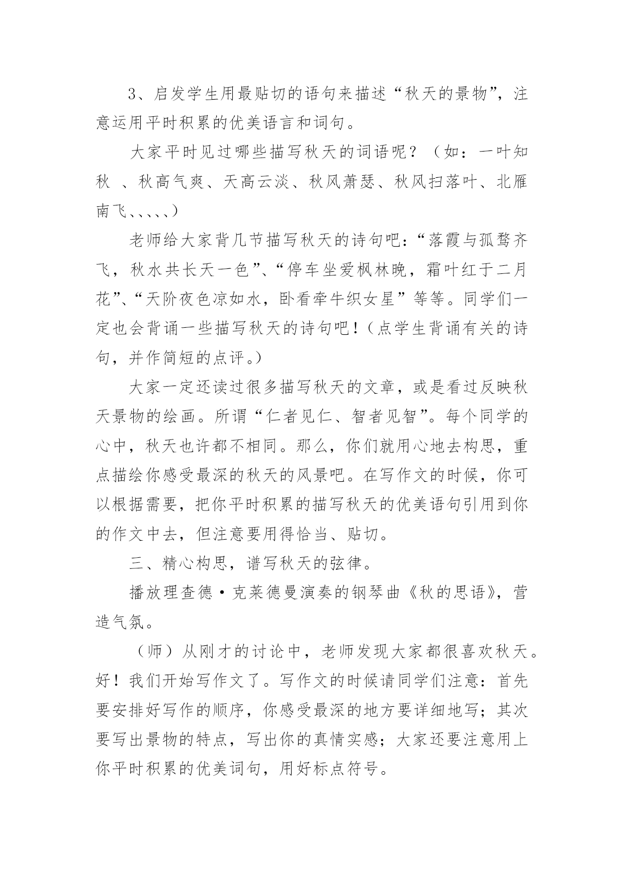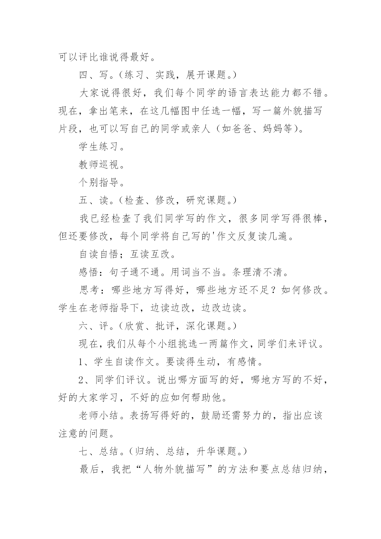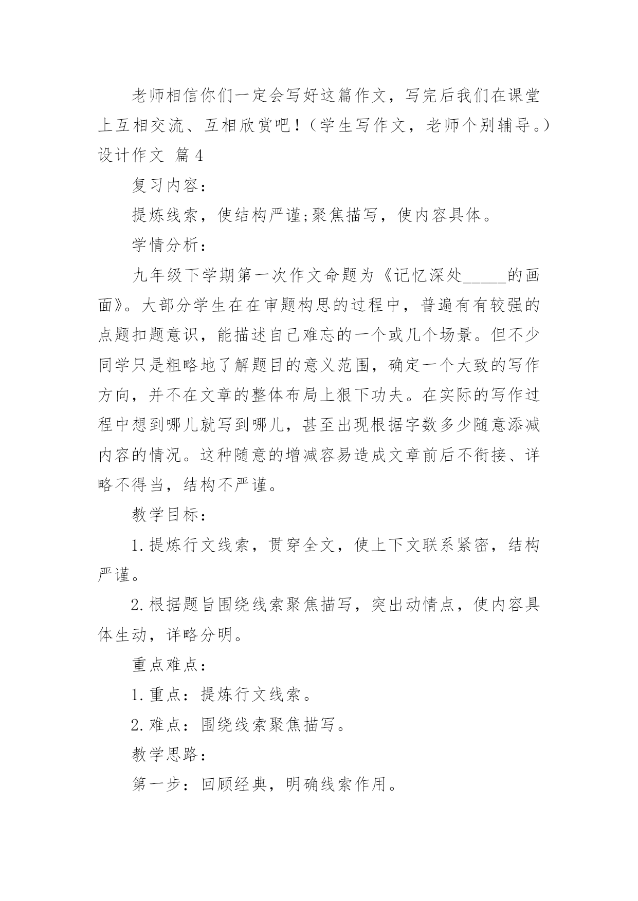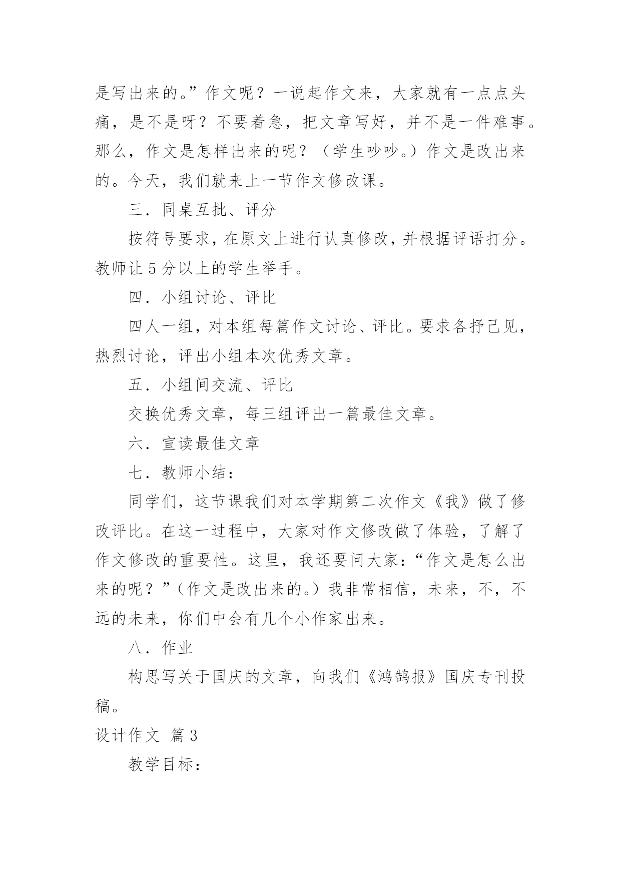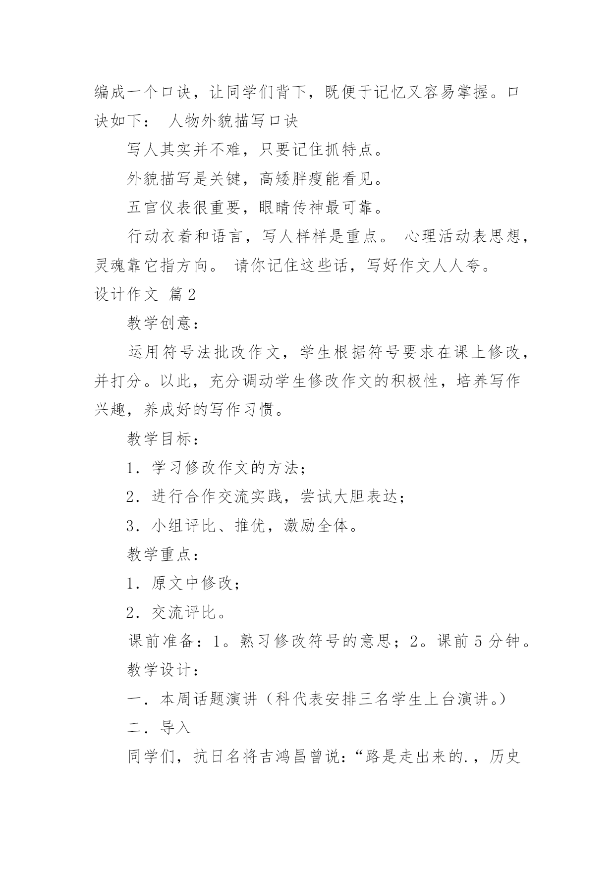 设计作文(集合)设计作文5篇在平平淡淡的学习、工作、生活中,大家一定都接触过作文吧,作文是从内部言语向外部言语的过渡,即从经过压缩的简要的、自己能明白的语言,向开展的、具有规范语法结构的、能为他人所理解的外部语言形式的转化。那么一般作文是怎么写的呢?下面是小编精心整理的设计作文5篇,希望能够帮助到大家。设计作文篇1教学思想作文教学是语文教学的难点,在教学小学三年级作文《人物外貌描写》这一课题时,我想通过听、看、说、写、读、评、总结“七步曲”的教学方法,充分发挥学生的主观能动性,增强教学效果,提高学生写作能力。教学目标1、通过学习人物外貌描写方法,使学生能够抓住人物外貌特征进行外貌描写。2、完成外貌描写片段作文。教学过程一、听。(启发、引导,揭示课题。)同学们,今天的作文课,我们一起学习《人物的外貌描写》(板书)。学习前,我们先听一段录音:音乐声中,播放描写本班音乐老师的一段范文??师:同学们,听了这段录音,你们知道,短文中描写的是谁吗?生:我们的音乐老师。师:你们怎么知道她是我们的音乐老师?生:从外貌特征??师:(抓住时机,引导)外貌特征是描写人物外貌的关键。那么,什么是人物的外貌描写呢?根据前面例文可以看出。外貌描写就是将一个人的神态、面貌、身影、穿戴、长相等特征真实地描摹下来。(板书)二、看。(观察、讨论,分析课题。)刚才,我们听了一段人物外貌描写的录音,同学们也总结出了人物外貌描写的方法。现在,我们观看下面几幅图(出示挂图)。看一看:这几幅图上的人物各有什么特征?想一想:你能不能用自己的话说出他们的外貌特征?议一议:同学们把自己看到的和想到的跟同桌议一议,有什么不同的看法,互相学习。学生看图,思考,讨论。教师参与,和学生一起活动。三、说。(交流、表达,说明课题。)我们看了、想了、又互相讨论了图上的人物,现在请同学们分别说出这些人物的外貌特征。图1:(一个惹人喜爱的小男孩。)图2:(一位朝气勃勃的青年。)图3:(一位饱经沧桑的老人。)先单独说,再分组说。最后,学生讨论,老师补充。还可以评比谁说得最好。四、写。(练习、实践,展开课题。)大家说得很好,我们每个同学的语言表达能力都不错。现在,拿出笔来,在这几幅图中任选一幅,写一篇外貌描写片段,也可以写自己的同学或亲人(如爸爸、妈妈等)。学生练习。教师巡视。个别指导。五、读。(检查、修改,研究课题。)我已经检查了我们同学写的作文,很多同学写得很棒,但还要修改,每个同学将自己写的'作文反复读几遍。自读自悟;互读互改。感悟:句子通不通。用词当不当。条理清不清。思考:哪些地方写得好,哪些地方还不足?如何修改。学生在老师指导下,边读边改,边改边读。六、评。(欣赏、批评,深化课题。)现在,我们从每个小组挑选一两篇作文,同学们来评议。1、学生自读作文。要读得生动,有感情。2、同学们评议。说出哪方面写的好,哪地方写的不好,好的大家学习,不好的应如何帮助他。老师小结。表扬写得好的,鼓励还需努力的,指出应该注意的问题。七、总结。(归纳、总结,升华课题。)最后,我把“人物外貌描写”的方法和要点总结归纳,编成一个口诀,让同学们背下,既便于记忆又容易掌握。口诀如下:人物外貌描写口诀写人其实并不难,只要记住抓特点。外貌描写是关键,高矮胖瘦能看见。五官仪表很重要,眼睛传神最可靠。行动衣着和语言,写人样样是重点。心理活动表思想,灵魂靠它指方向。请你记住这些话,写好作文人人夸。设计作文篇2教学创意:运用符号法批改作文,学生根据符号要求在课上修改,并打分。以此,充分调动学生修改作文的积极性,培养写作兴趣,养成好的写作习惯。教学目标:1.学习修改作文的方法;2.进行合作交流实践,尝试大胆表达;3.小组评比、推优,激励全体。教学重点:1.原文中修改;2.交流评比。课前准备:1。熟习修改符号的意思;2。课前5分钟。教学设计:一.本周话题演讲(科代表安排三名学生上台演讲。)二.导入同学们,抗日名将吉鸿昌曾说:“路是走出来的.,历史是写出来的。”作文呢?一说起作文来,大家就有一点点头痛,是不是呀?不要着急,把文章写好,并不是一件难事。那么,作文是怎样出来的呢?(学生吵吵。)作文是改出来的。今天,我们就来上一节作文修改课。三.同桌互批、评分按符号要求,在原文上进行认真修改,并根据评语打分。教师让5分以上的学生举手。四.小组讨论、评比四人一组,对本组每篇作文讨论、评比。要求各抒己见,热烈讨论,评出小组本次优秀文章。五.小组间交流、评比交换优秀文章,每三组评出一篇最佳文章。六.宣读最佳文章七.教师小结:同学们,这节课我们对本学期第二次作文《我》做了修改评比。在这一过程中,大家对作文修改做了体验,了解了作文修改的重要性。这里,我还要问大家:“作文是怎么出来的呢?”(作文是改出来的。)我非常相信,未来,不,不远的未来,你们中会有