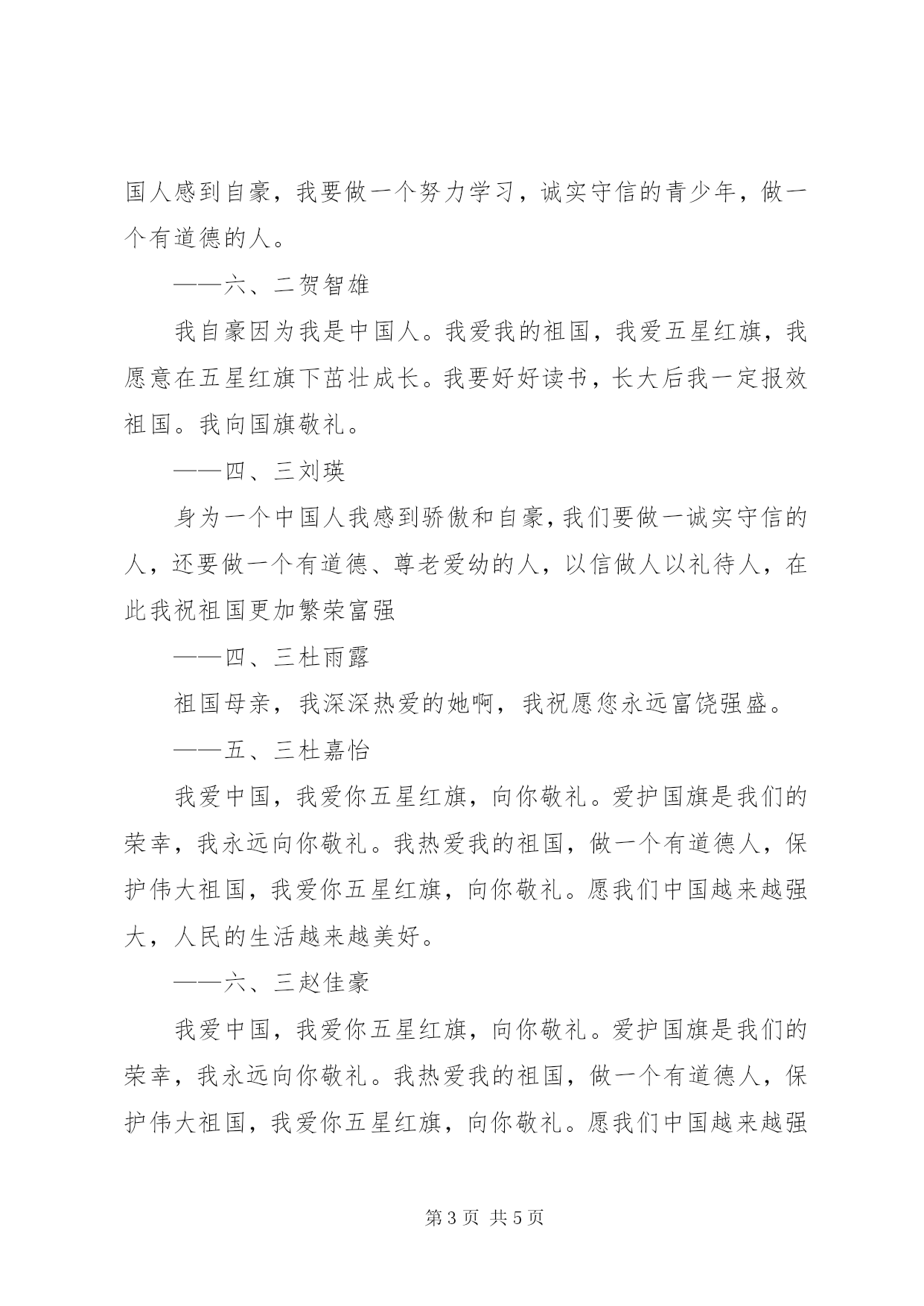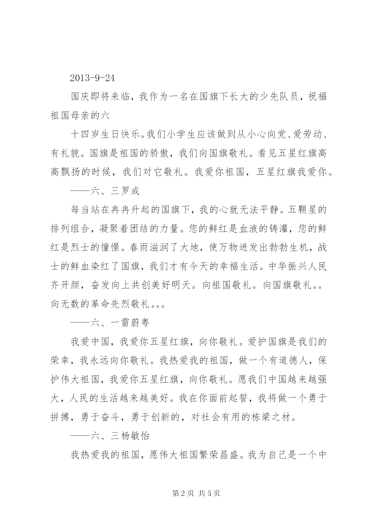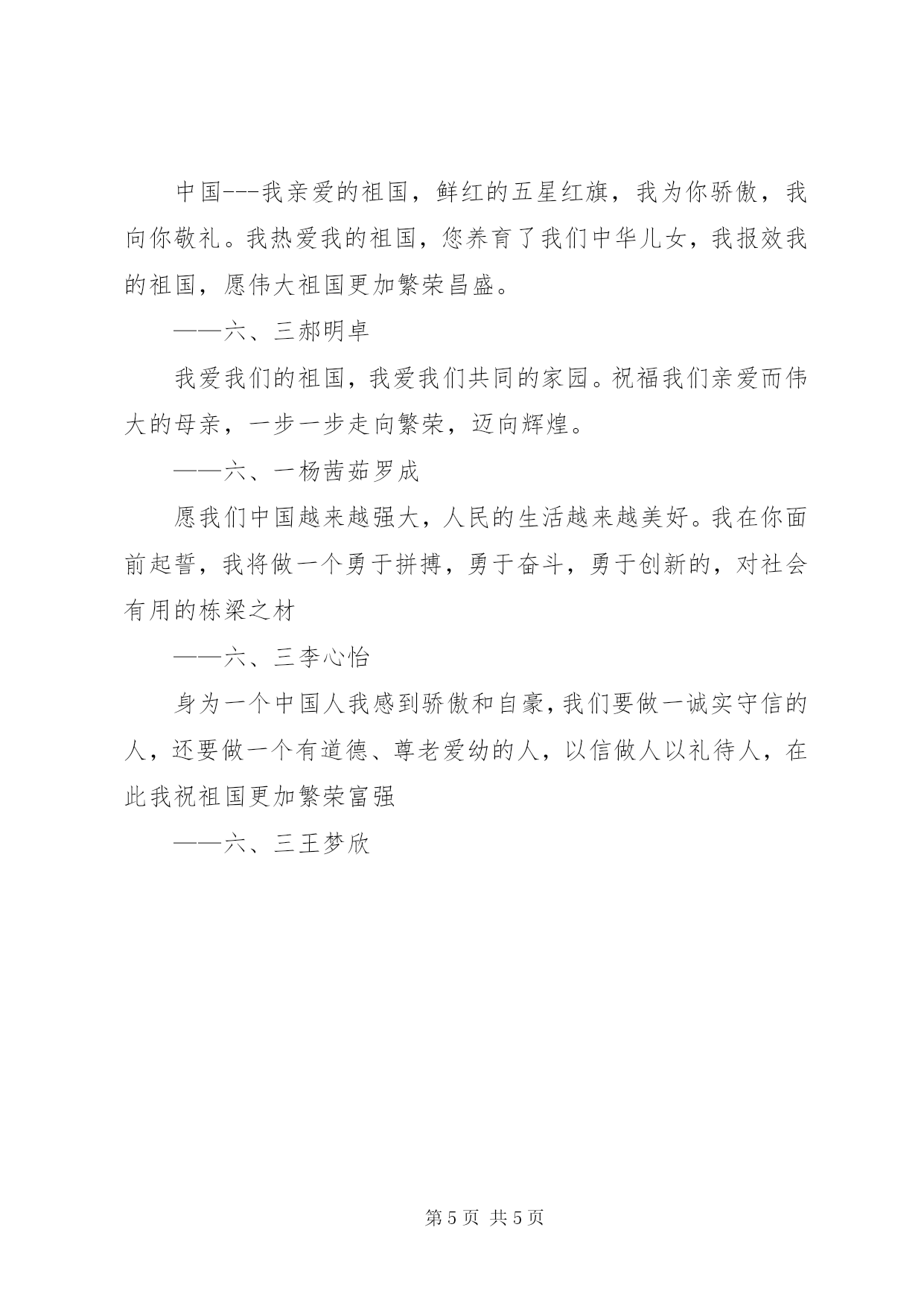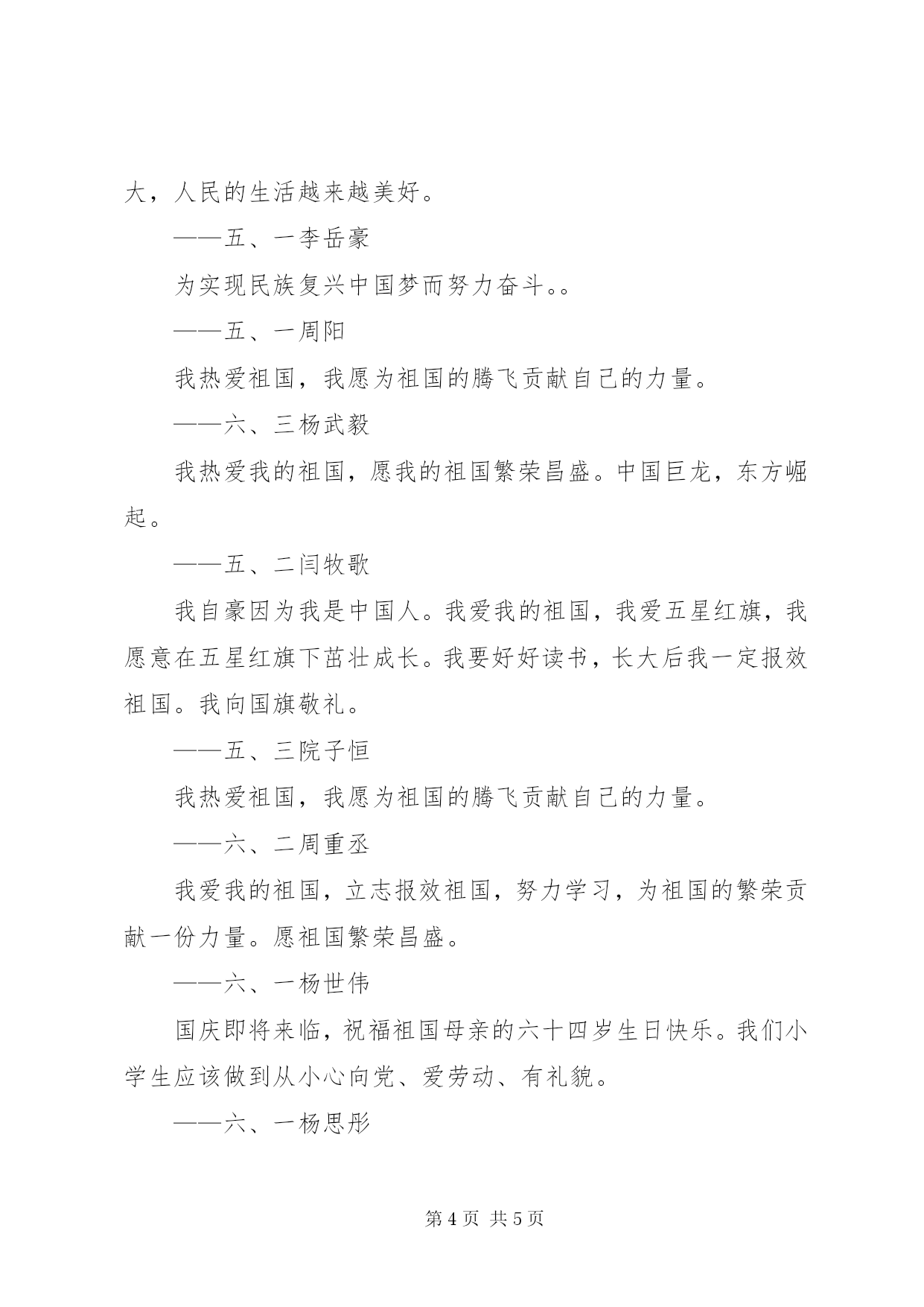 第PAGE\*Arabic\*MERGEFORMAT5页共NUMPAGES\*MERGEFORMAT5页迎国庆活动方案为了加强爱国主义教育,增强学生爱国热情,培养学生良好的爱国情操。在国庆64周年到来之际,我校将组织全体少先队员开展以“迎国庆颂祖国”为主题的系列教育活动。活动一。组织各年级观看爱国主义影片。活动二。“祖国在我心中”。为了提高我校学生了解、使用地图的能力,自觉维护国家版图的尊严,要求老师上好一堂关于国家版图知识的主题班会教育课。活动三。低年级学唱国歌。本周利用音乐课和综合实践课时间各班统一唱国歌,以宏壮的歌声迎接国庆。活动四。中年级书画赛。本周班主任老师负责、美术老师协助指导学生开展祖国变化书画赛,优秀作品在班级展览。各班报优秀作品15份,建议a4纸绘图,以便学校统一装订成册。活动五。高年级颂祖国征文。国庆期间走亲访友,了解祖国的日新月异,举行颂祖国征文比赛,获奖的文章将被“红领巾广播站”录用。各班报优秀征文(5份)给学校统一装订成册。活动六。十一期间举行“向国旗敬礼”网上签名寄语活动,班级学生参与面要求达到80%以上。希望学生通过对活动的亲身参与,获得丰富的情感体验,从而激发学生爱国主义热情,深化学生爱国主义情感。xxxx小学2013-9-24国庆即将来临,我作为一名在国旗下长大的少先队员,祝福祖国母亲的六十四岁生日快乐。我们小学生应该做到从小心向党、爱劳动、有礼貌。国旗是祖国的骄傲,我们向国旗敬礼。看见五星红旗高高飘扬的时候,我们对它敬礼。我爱你祖国,五星红旗我爱你。——六、三罗成每当站在冉冉升起的国旗下,我的心就无法平静。五颗星的排列组合,凝聚着团结的力量。您的鲜红是血液的铸灌,您的鲜红是烈士的憧憬。春雨滋润了大地,使万物迸发出勃勃生机,战士的鲜血染红了国旗,我们才有今天的幸福生活。中华振兴人民齐开颜,奋发向上共创美好明天。向祖国敬礼。向国旗敬礼。。向无数的革命先烈敬礼。。。——六、一雷蔚粤我爱中国,我爱你五星红旗,向你敬礼。爱护国旗是我们的荣幸,我永远向你敬礼。我热爱我的祖国,做一个有道德人,保护伟大祖国,我爱你五星红旗,向你敬礼。愿我们中国越来越强大,人民的生活越来越美好。我在你面前起誓,我将做一个勇于拼搏,勇于奋斗,勇于创新的,对社会有用的栋梁之材。——六、三杨敏怡我热爱我的祖国,愿伟大祖国繁荣昌盛。我为自己是一个中国人感到自豪,我要做一个努力学习,诚实守信的青少年,做一个有道德的人。——六、二贺智雄我自豪因为我是中国人。我爱我的祖国,我爱五星红旗,我愿意在五星红旗下茁壮成长。我要好好读书,长大后我一定报效祖国。我向国旗敬礼。——四、三刘瑛身为一个中国人我感到骄傲和自豪,我们要做一诚实守信的人,还要做一个有道德、尊老爱幼的人,以信做人以礼待人,在此我祝祖国更加繁荣富强——四、三杜雨露祖国母亲,我深深热爱的她啊,我祝愿您永远富饶强盛。——五、三杜嘉怡我爱中国,我爱你五星红旗,向你敬礼。爱护国旗是我们的荣幸,我永远向你敬礼。我热爱我的祖国,做一个有道德人,保护伟大祖国,我爱你五星红旗,向你敬礼。愿我们中国越来越强大,人民的生活越来越美好。——六、三赵佳豪我爱中国,我爱你五星红旗,向你敬礼。爱护国旗是我们的荣幸,我永远向你敬礼。我热爱我的祖国,做一个有道德人,保护伟大祖国,我爱你五星红旗,向你敬礼。愿我们中国越来越强大,人民的生活越来越美好。——五、一李岳豪为实现民族复兴中国梦而努力奋斗。。——五、一周阳我热爱祖国,我愿为祖国的腾飞贡献自己的力量。——六、三杨武毅我热爱我的祖国,愿我的祖国繁荣昌盛。中国巨龙,东方崛起。——五、二闫牧歌我自豪因为我是中国人。我爱我的祖国,我爱五星红旗,我愿意在五星红旗下茁壮成长。我要好好读书,长大后我一定报效祖国。我向国旗敬礼。——五、三院子恒我热爱祖国,我愿为祖国的腾飞贡献自己的力量。——六、二周重丞我爱我的祖国,立志报效祖国,努力学习,为祖国的繁荣贡献一份力量。愿祖国繁荣昌盛。——六、一杨世伟国庆即将来临,祝福祖国母亲的六十四岁生日快乐。我们小学生应该做到从小心向党、爱劳动、有礼貌。——六、一杨思彤中国---我亲爱的祖国,鲜红的五星红旗,我为你骄傲,我向你敬礼。我热爱我的祖国,您养育了我们中华儿女,我报效我的祖国,愿伟大祖国更加繁荣昌盛。——六、三郝明卓我爱我们的祖国,我爱我们共同的家园。祝福我们亲爱而伟大的母亲,一步一步走向繁荣,迈向辉煌。——六、一杨茜茹罗成愿我们中国越来越强大,人民的生活越来越美好。我在你面前起誓,我将做一个勇于拼搏,勇于奋斗,勇于创新的,对社会有用的栋梁之材——六、三李心怡身为一个中国人我感到骄傲和自豪,我们要做一诚实守信的人,还要做一个有道德、尊老爱幼的人,以信做人以礼待人,在此我祝祖国更加繁荣富强——六、三王梦欣