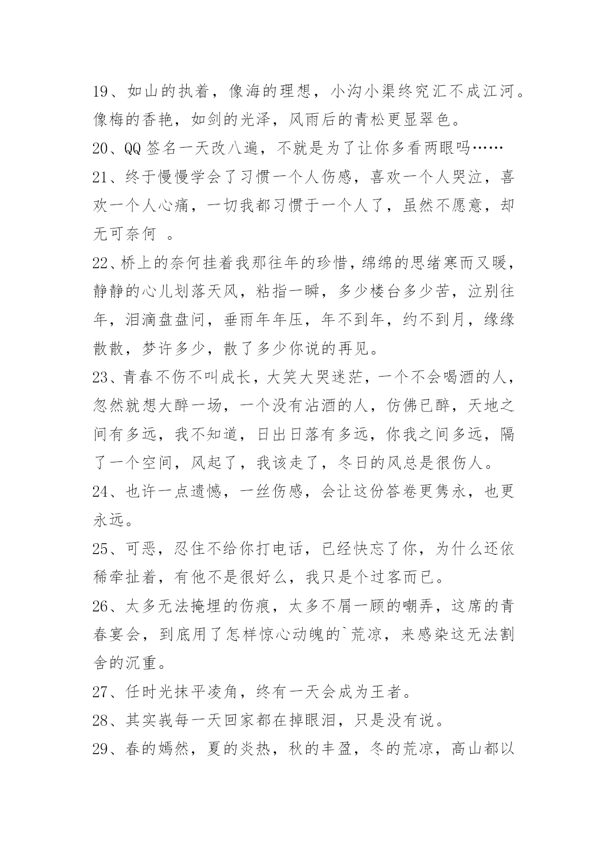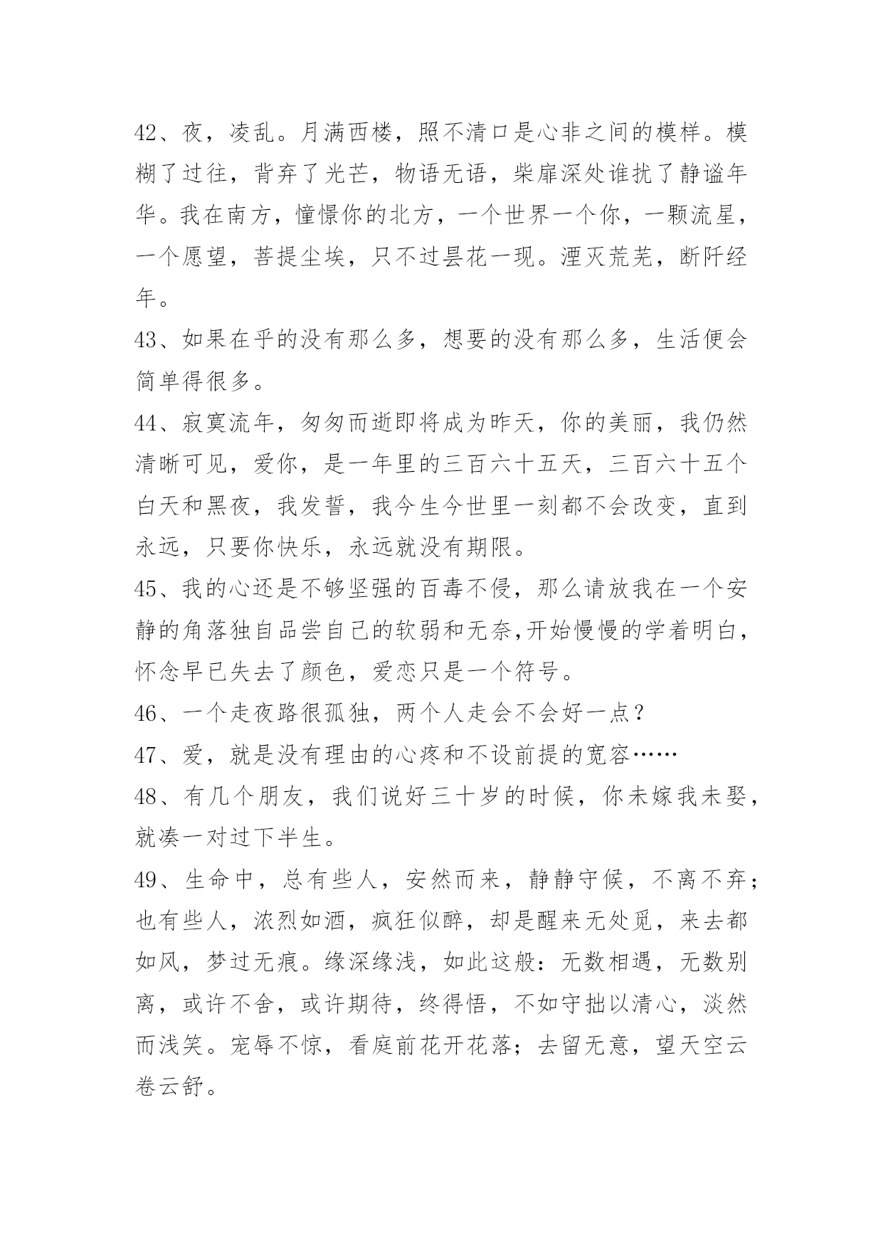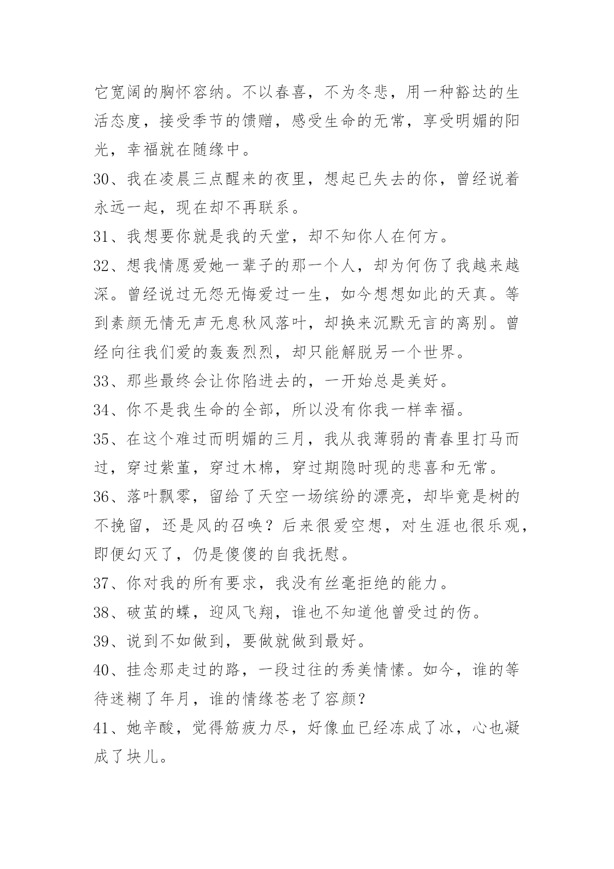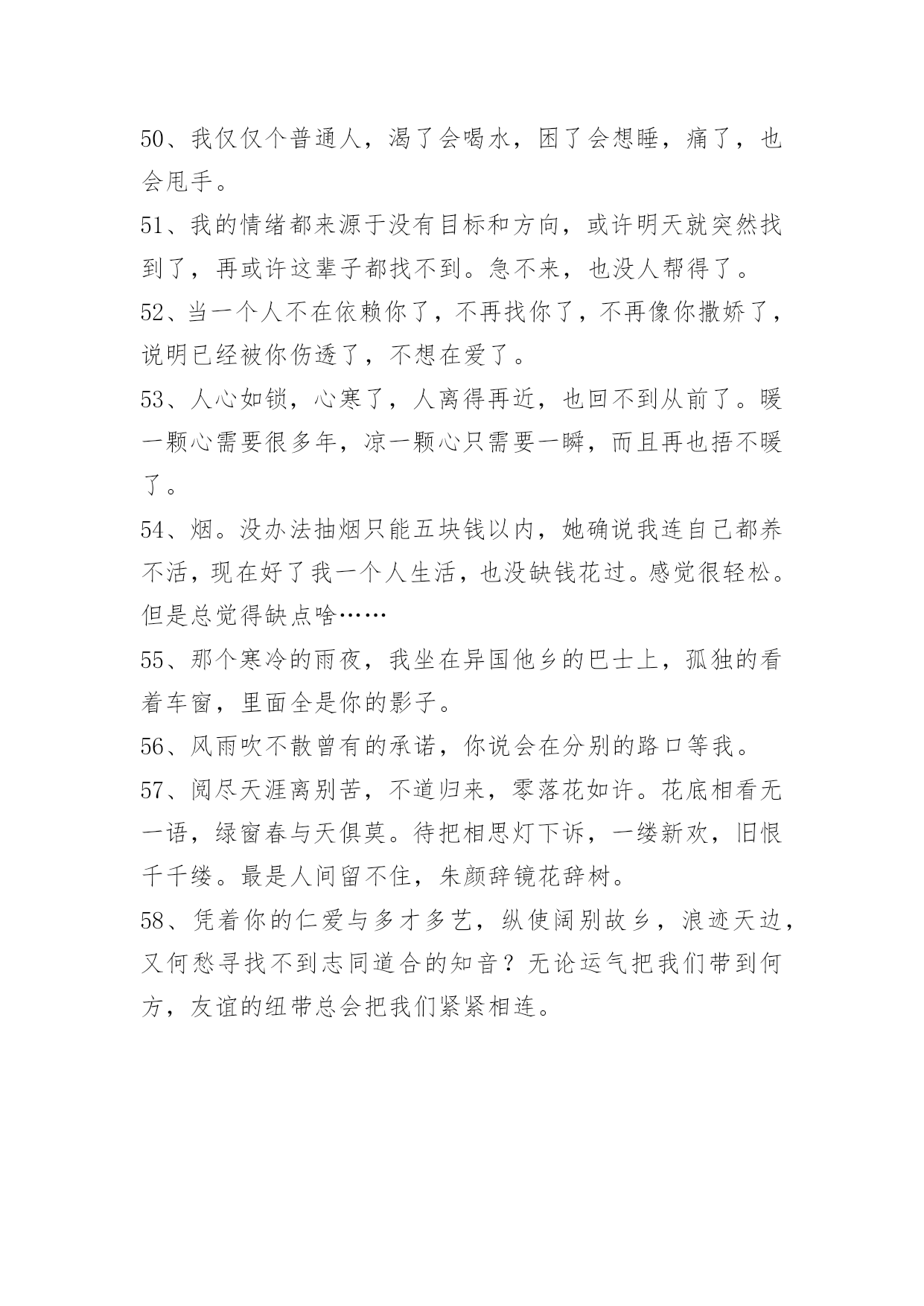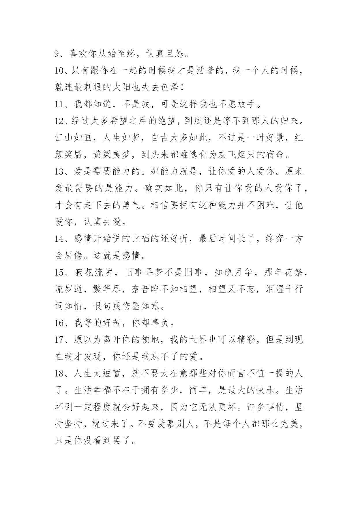 生活伤感句子2022年有关生活伤感句子58句当我们还未曾把自己的内心敞开的时候,一直把自己紧紧地锁在寂寞里的时候,我们会发现自己活得使很压抑,很孤独,和外在的世界失去了所有的联系。我们很多时候都很矛盾,渴望自由又害怕寂寞,所以一直在所有的寂寞里摸索爬行。以下是小编给各位读者分享的生活伤感句子58句,大家快来看看吧。1、蹉跎的时光,缓步行于尘世。原本白云飘飘的天空,风,匆匆而过,演变出蔚蓝一片的回眸。以为,一段情会长久。半开半合,荏弱中的玫瑰,雨,打湿了谁的双眼。雨过,瓣飘落。薄凉一瞬间,回眸永无尽。2、我知道,我不能陪在你的身边。我知道,我能做的只有遥远的思念。我只愿你快乐。3、充满明媚的阳光,蒸发内心深处的悲伤。4、你的心思,就像雾里的花朵、难以琢磨,难以看透。5、指缝太宽,时间太瘦。6、时间不能浪费,要把它留给最有益的事情。7、我爱你,已在心里默念无数遍,就是没有勇气真正对你开口。8、有一天终于明白,只要你不放手,我原本可以爱你很久很久。9、喜欢你从始至终,认真且怂。10、只有跟你在一起的时候我才是活着的,我一个人的时候,就连最刺眼的太阳也失去色泽!11、我都知道,不是我,可是这样我也不愿放手。12、经过太多希望之后的绝望,到底还是等不到那人的归来。江山如画,人生如梦,自古大多如此,不过是一时好景,红颜笑靥,黄梁美梦,到头来都难逃化为灰飞烟灭的宿命。13、爱是需要能力的。那能力就是,让你爱的人爱你。原来爱最需要的是能力。确实如此,你只有让你爱的人爱你了,才会有走下去的勇气。相信要拥有这种能力并不困难,让他爱你,认真去爱。14、感情开始说的比唱的还好听,最后时间长了,终究一方会厌倦。这就是感情。15、寂花流岁,旧事寻梦不是旧事,知晓月华,那年花祭,流岁逝,繁华尽,奈吾眸不知相望,相望又不忘,泪湿千行词知情,恨句成伤墨知意。16、我等的好苦,你却辜负。17、原以为离开你的领地,我的世界也可以精彩,但是到现在我才发现,你还是我忘不了的爱。18、人生太短暂,就不要太在意那些对你而言不值一提的人了。生活幸福不在于拥有多少,简单,是最大的快乐。生活坏到一定程度就会好起来,因为它无法更坏。许多事情,坚持坚持,就过来了。不要羡慕别人,不是每个人都那么完美,只是你没看到罢了。19、如山的执着,像海的理想,小沟小渠终究汇不成江河。像梅的香艳,如剑的光泽,风雨后的青松更显翠色。20、QQ签名一天改八遍,不就是为了让你多看两眼吗……21、终于慢慢学会了习惯一个人伤感,喜欢一个人哭泣,喜欢一个人心痛,一切我都习惯于一个人了,虽然不愿意,却无可奈何。22、桥上的奈何挂着我那往年的珍惜,绵绵的思绪寒而又暖,静静的心儿划落天风,粘指一瞬,多少楼台多少苦,泣别往年,泪滴盘盘问,垂雨年年压,年不到年,约不到月,缘缘散散,梦许多少,散了多少你说的再见。23、青春不伤不叫成长,大笑大哭迷茫,一个不会喝酒的人,忽然就想大醉一场,一个没有沾酒的人,仿佛已醉,天地之间有多远,我不知道,日出日落有多远,你我之间多远,隔了一个空间,风起了,我该走了,冬日的风总是很伤人。24、也许一点遗憾,一丝伤感,会让这份答卷更隽永,也更永远。25、可恶,忍住不给你打电话,已经快忘了你,为什么还依稀牵扯着,有他不是很好么,我只是个过客而已。26、太多无法掩埋的伤痕,太多不屑一顾的嘲弄,这席的青春宴会,到底用了怎样惊心动魄的`荒凉,来感染这无法割舍的沉重。27、任时光抹平凌角,终有一天会成为王者。28、其实峩每一天回家都在掉眼泪,只是没有说。29、春的嫣然,夏的炎热,秋的丰盈,冬的荒凉,高山都以它宽阔的胸怀容纳。不以春喜,不为冬悲,用一种豁达的生活态度,接受季节的馈赠,感受生命的无常,享受明媚的阳光,幸福就在随缘中。30、我在凌晨三点醒来的夜里,想起已失去的你,曾经说着永远一起,现在却不再联系。31、我想要你就是我的天堂,却不知你人在何方。32、想我情愿爱她一辈子的那一个人,却为何伤了我越来越深。曾经说过无怨无悔爱过一生,如今想想如此的天真。等到素颜无情无声无息秋风落叶,却换来沉默无言的离别。曾经向往我们爱的轰轰烈烈,却只能解脱另一个世界。33、那些最终会让你陷进去的,一开始总是美好。34、你不是我生命的全部,所以没有你我一样幸福。35、在这个难过而明媚的三月,我从我薄弱的青春里打马而过,穿过紫堇,穿过木棉,穿过期隐时现的悲喜和无常。36、落叶飘零,留给了天空一场缤纷的漂亮,却毕竟是树的不挽留,还是风的召唤?后来很爱空想,对生涯也很乐观,即便幻灭了,仍是傻傻的自我抚慰。37、你对我的所有要求,我没有丝毫拒绝的能力。38、破茧的蝶,迎风飞翔,谁也不知道他曾受过的伤。39、说到不如做到,要做就做到最好。40、挂念那走过的路,一段过往的秀美情愫。如今,谁的等待迷糊了年月,谁的情缘苍老了容颜?