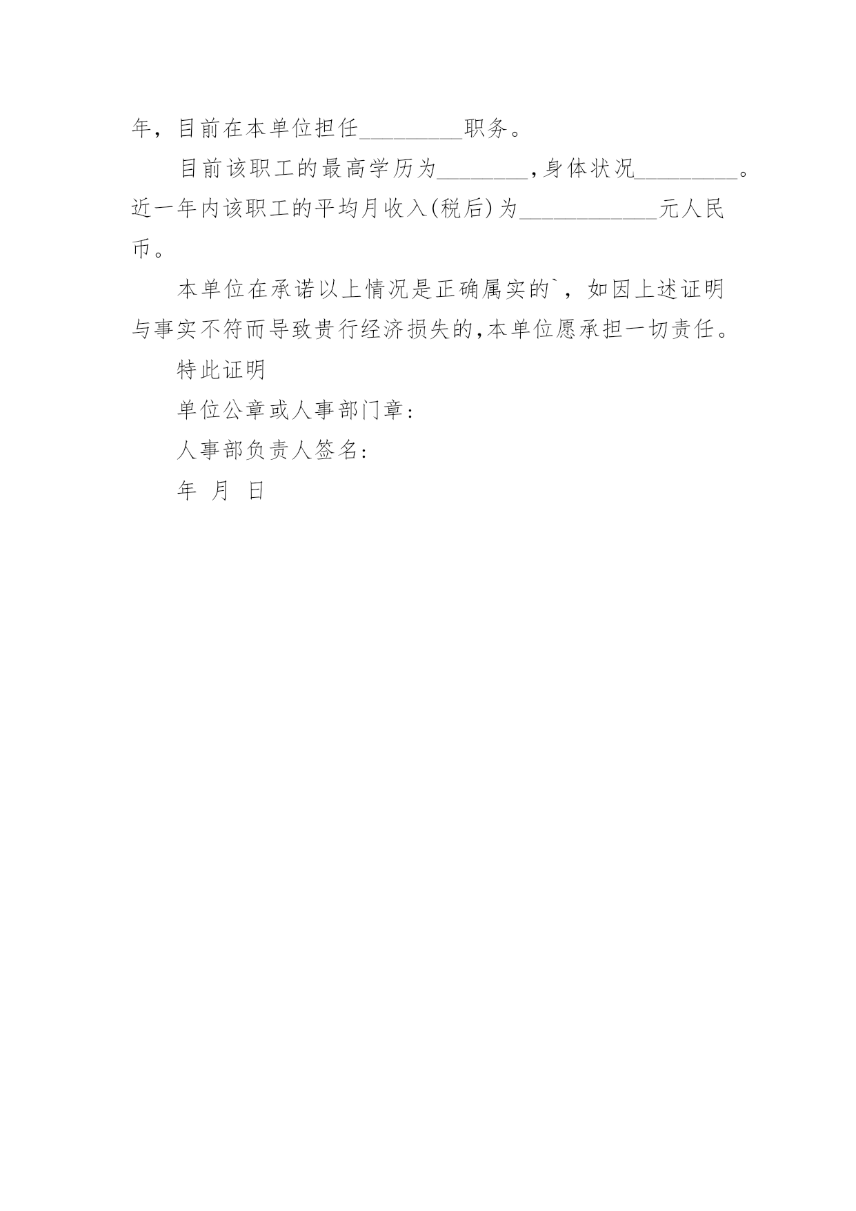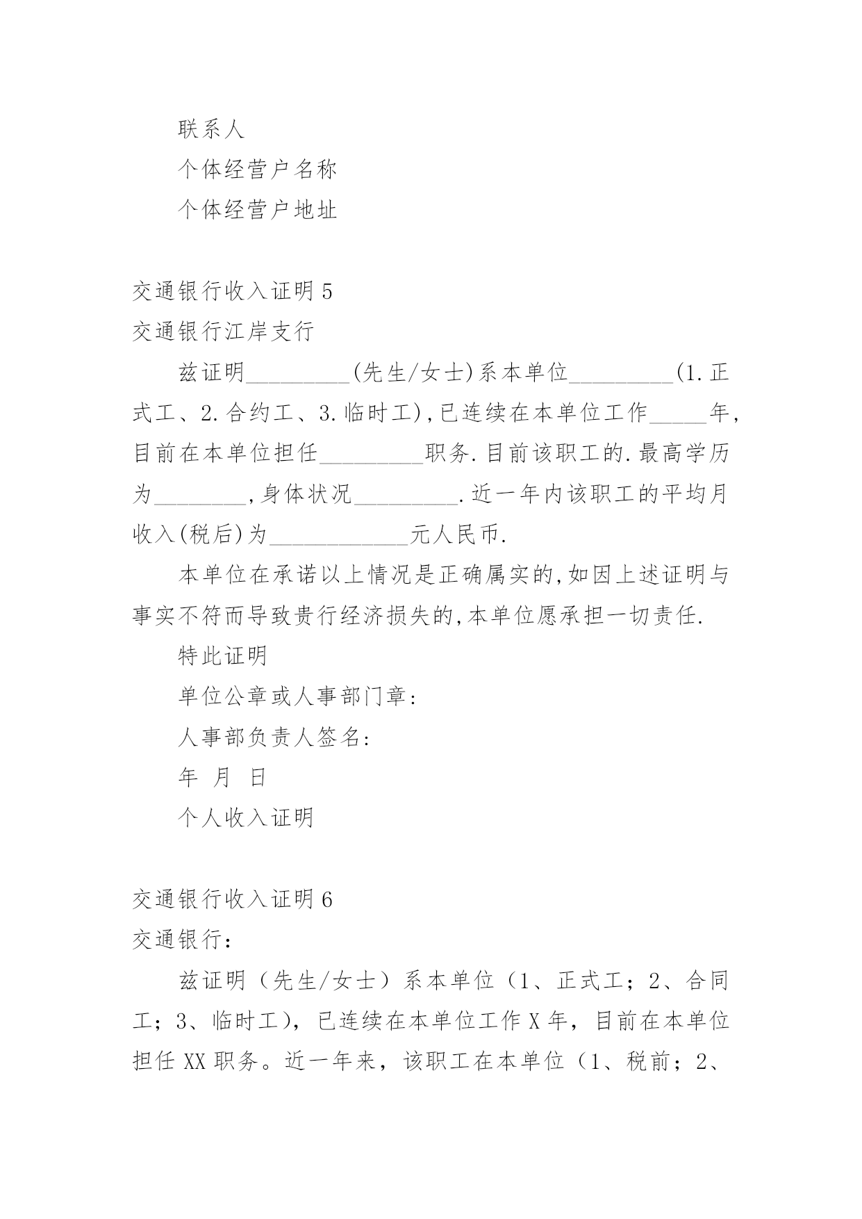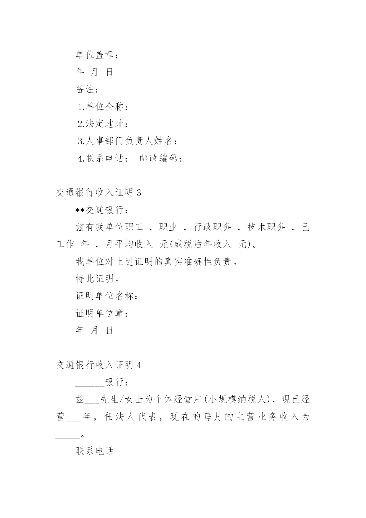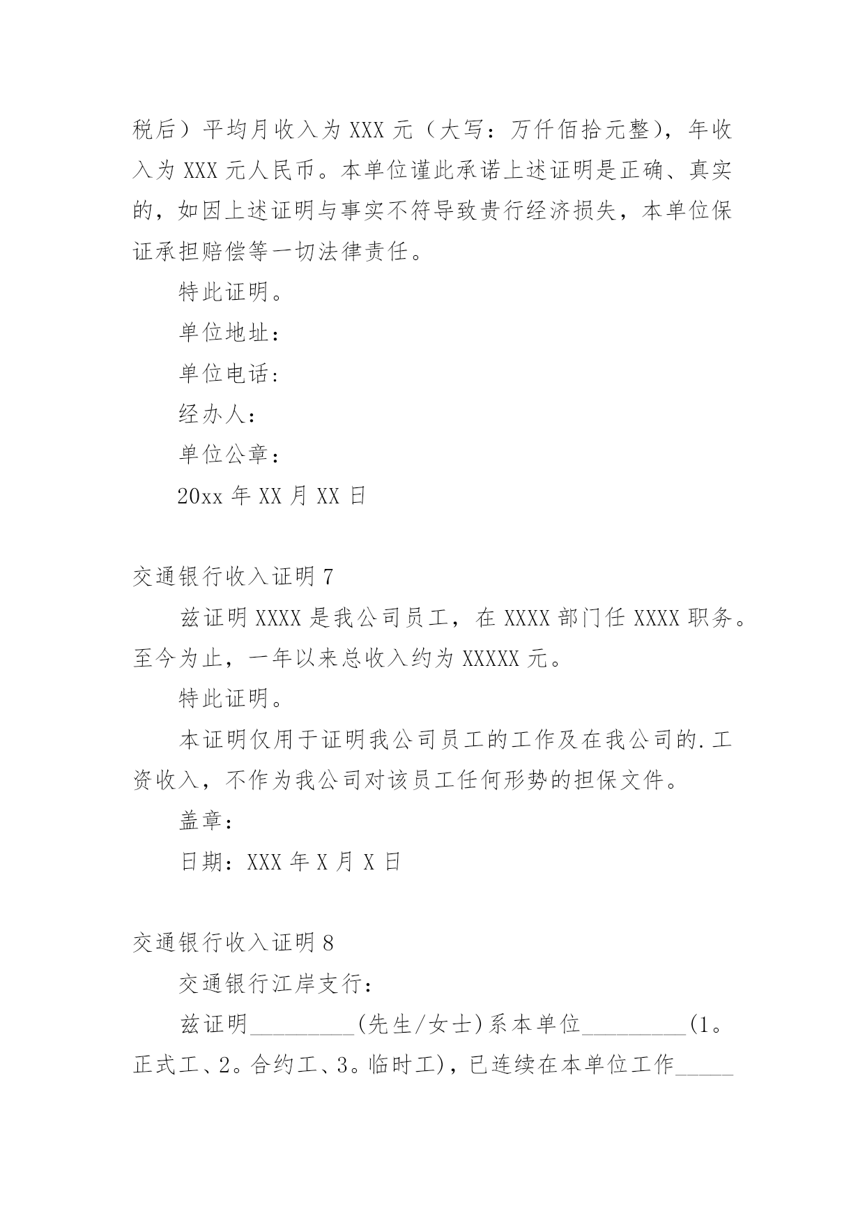 交通银行收入证明在日复一日的学习、工作或生活中,大家对证明都再熟悉不过了吧,证明是由机关、学校、团体等发的证明资格或权力的文件。那么什么样的证明才是规范的呢?以下是小编精心整理的交通银行收入证明,欢迎阅读,希望大家能够喜欢。交通银行收入证明1(非固定收入人员适用)**交通银行:本人从事,经营状况稳定,年收入万元,月均收入元(纳税证明附后)。我对上述证明的真实合法性负责,如有虚假,本人愿意无条件接受银行对个人财产的处分。特此证明(签名及手印):年月日交通银行收入证明2兹有同志,身份证号码:,系我单位正式工作人员,任职务。其本人月收入为元人民币,年收入为元人民币,特此证明。上述情况属实,我单位愿意对此承担相应的法律责任,工作证明《交通银行工作证明》。单位盖章:年月日备注:⒈单位全称:⒉法定地址:⒊人事部门负责人姓名:⒋联系电话:邮政编码:交通银行收入证明3**交通银行:兹有我单位职工,职业,行政职务,技术职务,已工作年,月平均收入元(或税后年收入元)。我单位对上述证明的真实准确性负责。特此证明。证明单位名称:证明单位章:年月日交通银行收入证明4______银行:兹___先生/女士为个体经营户(小规模纳税人),现已经营___年,任法人代表,现在的每月的主营业务收入为_____。联系电话联系人个体经营户名称个体经营户地址交通银行收入证明5交通银行江岸支行兹证明_________(先生/女士)系本单位_________(1.正式工、2.合约工、3.临时工),已连续在本单位工作_____年,目前在本单位担任_________职务.目前该职工的.最高学历为________,身体状况_________.近一年内该职工的平均月收入(税后)为____________元人民币.本单位在承诺以上情况是正确属实的,如因上述证明与事实不符而导致贵行经济损失的,本单位愿承担一切责任.特此证明单位公章或人事部门章:人事部负责人签名:年月日个人收入证明交通银行收入证明6交通银行:兹证明(先生/女士)系本单位(1、正式工;2、合同工;3、临时工),已连续在本单位工作X年,目前在本单位担任XX职务。近一年来,该职工在本单位(1、税前;2、税后)平均月收入为XXX元(大写:万仟佰拾元整),年收入为XXX元人民币。本单位谨此承诺上述证明是正确、真实的,如因上述证明与事实不符导致贵行经济损失,本单位保证承担赔偿等一切法律责任。特此证明。单位地址:单位电话:经办人:单位公章:20xx年XX月XX日交通银行收入证明7兹证明XXXX是我公司员工,在XXXX部门任XXXX职务。至今为止,一年以来总收入约为XXXXX元。特此证明。本证明仅用于证明我公司员工的工作及在我公司的.工资收入,不作为我公司对该员工任何形势的担保文件。盖章:日期:XXX年X月X日交通银行收入证明8交通银行江岸支行:兹证明_________(先生/女士)系本单位_________(1。正式工、2。合约工、3。临时工),已连续在本单位工作_____年,目前在本单位担任_________职务。目前该职工的最高学历为________,身体状况_________。近一年内该职工的平均月收入(税后)为____________元人民币。本单位在承诺以上情况是正确属实的`,如因上述证明与事实不符而导致贵行经济损失的,本单位愿承担一切责任。特此证明单位公章或人事部门章:人事部负责人签名:年月日