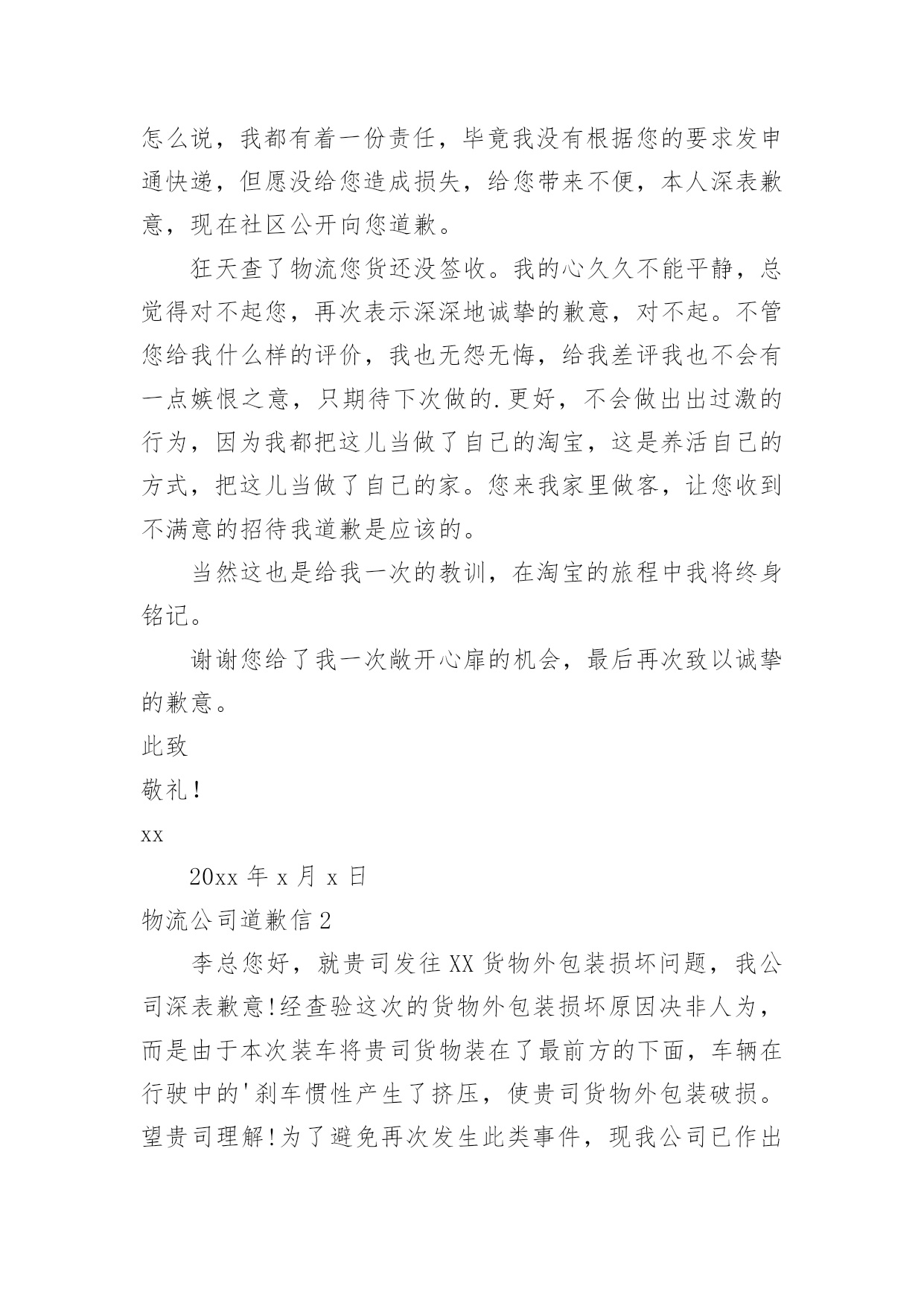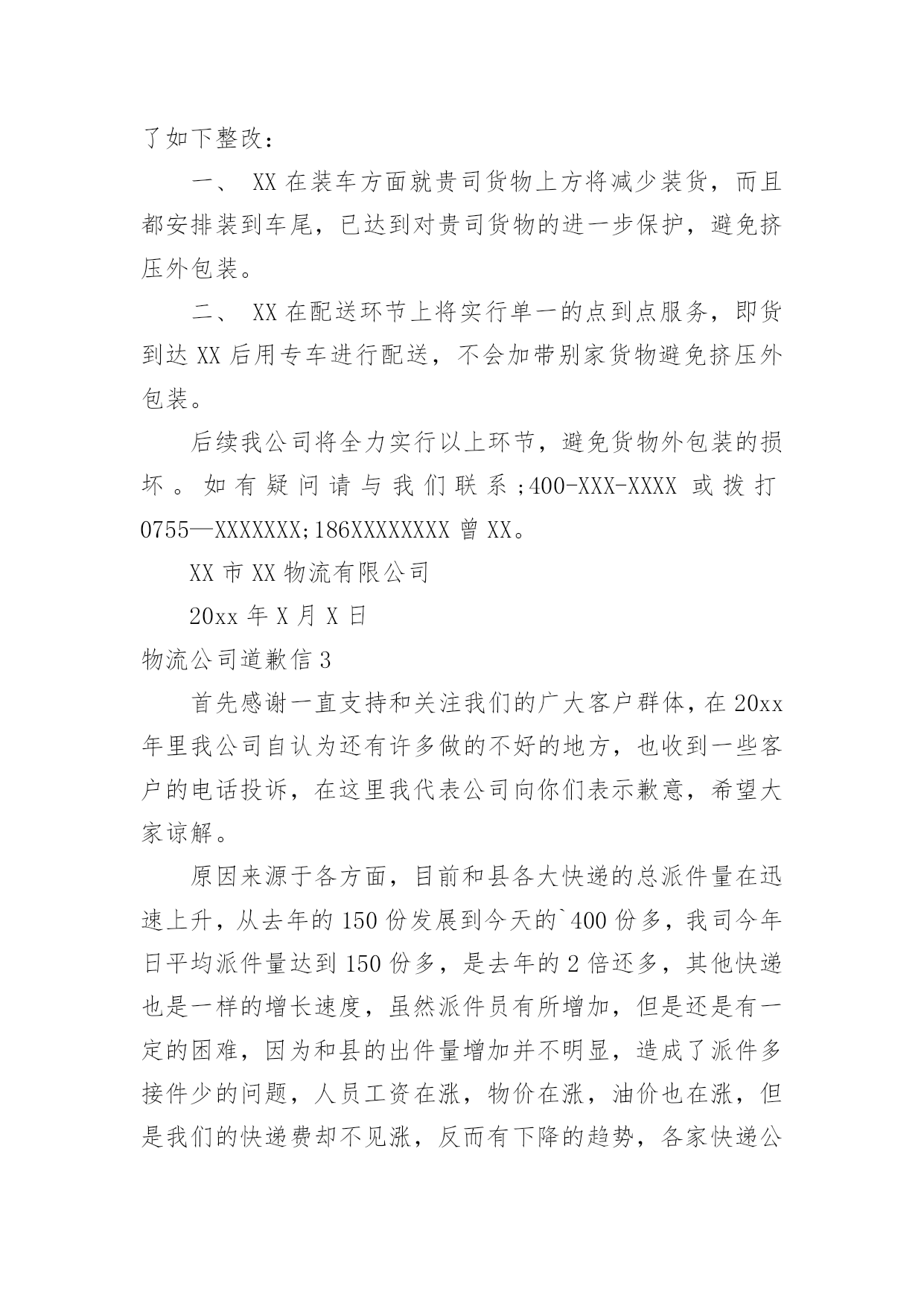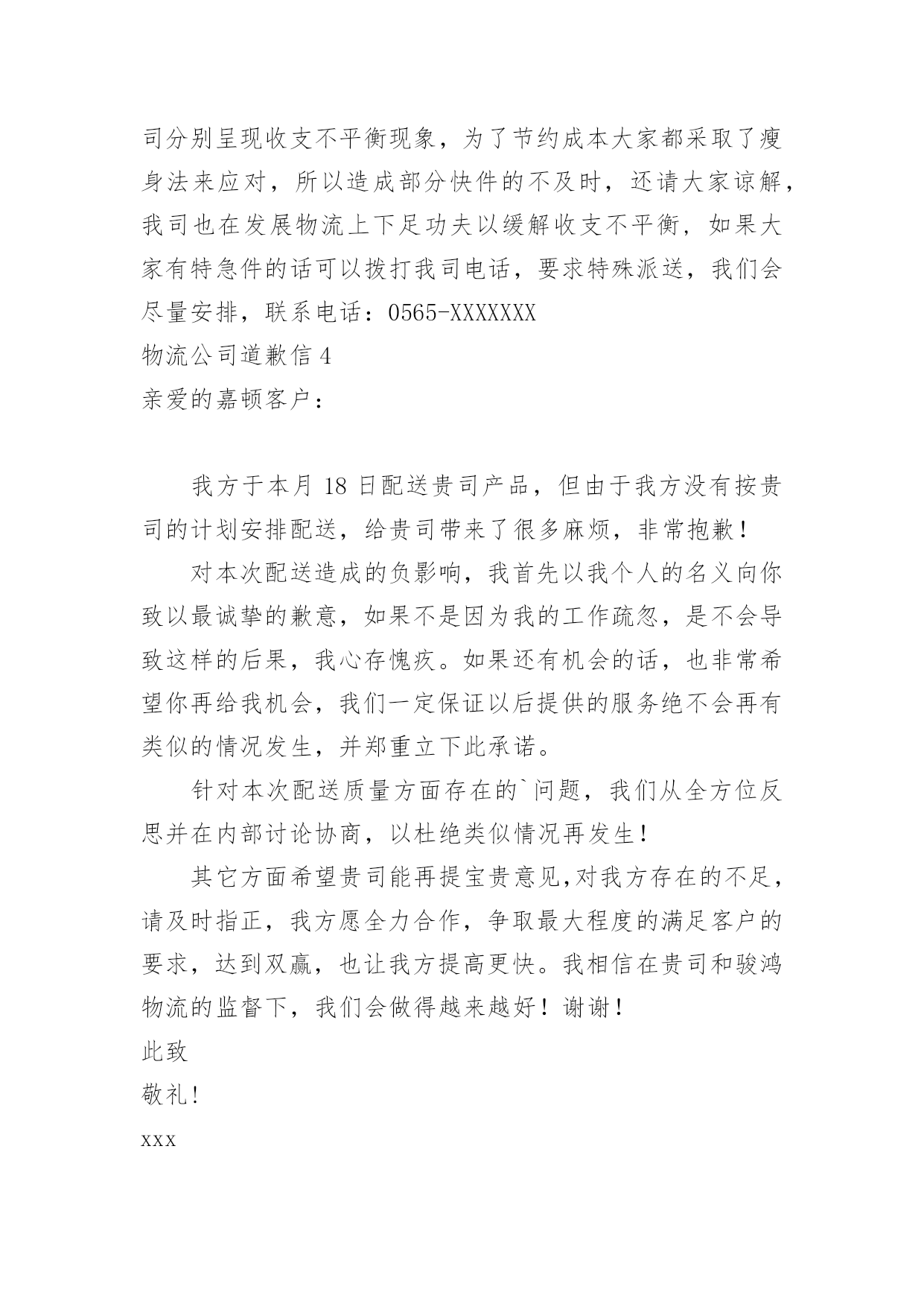 物流公司道歉信物流公司道歉信在现在社会,我们经常会遇到要写道歉信的情况,道歉信是要向对方陈述无法答应的所请所托的原因,对不愿为的事,可声明自己的一贯主张,对不能为的请托,更应陈述理由,说明自己为什么不能为。还是对道歉信一筹莫展吗?下面是小编整理的物流公司道歉信,仅供参考,欢迎大家阅读。物流公司道歉信1亲:您好!没想到会用这样的方式和您交流,请原谅我的冒失。狂天写这封信不仅为求您的原谅,更求个人的一点心安,我真的不知知道EMS物流为什么会这么慢,以前没遇到过这种情况。发货的时候我咨询过EMS,跟我说到您的收货地址2—3天就可以到了,可到现在过去了5天还没收到货,我也随时跟踪单号并咨询EMS客服,咨询原因跟您汇报。我们默认走的物流是EMS因为EMS比较正规货物丢失的几率很小,且覆盖面非常广,他们的管理也是相当严的走的程序也是比较复杂的所以EMS的会耽误些时间加上很多小的邮局效率不是很高所以造就了EMS的慢!事情既然发生了现在说什么也没用只能等物流了。不管怎么说,我都有着一份责任,毕竟我没有根据您的要求发申通快递,但愿没给您造成损失,给您带来不便,本人深表歉意,现在社区公开向您道歉。狂天查了物流您货还没签收。我的心久久不能平静,总觉得对不起您,再次表示深深地诚挚的歉意,对不起。不管您给我什么样的评价,我也无怨无悔,给我差评我也不会有一点嫉恨之意,只期待下次做的.更好,不会做出出过激的行为,因为我都把这儿当做了自己的淘宝,这是养活自己的方式,把这儿当做了自己的家。您来我家里做客,让您收到不满意的招待我道歉是应该的。当然这也是给我一次的教训,在淘宝的旅程中我将终身铭记。谢谢您给了我一次敞开心扉的机会,最后再次致以诚挚的歉意。此致敬礼!xx20xx年x月x日物流公司道歉信2李总您好,就贵司发往XX货物外包装损坏问题,我公司深表歉意!经查验这次的货物外包装损坏原因决非人为,而是由于本次装车将贵司货物装在了最前方的下面,车辆在行驶中的'刹车惯性产生了挤压,使贵司货物外包装破损。望贵司理解!为了避免再次发生此类事件,现我公司已作出了如下整改:一、XX在装车方面就贵司货物上方将减少装货,而且都安排装到车尾,已达到对贵司货物的进一步保护,避免挤压外包装。二、XX在配送环节上将实行单一的点到点服务,即货到达XX后用专车进行配送,不会加带别家货物避免挤压外包装。后续我公司将全力实行以上环节,避免货物外包装的损坏。如有疑问请与我们联系;400-XXX-XXXX或拨打0755—XXXXXXX;186XXXXXXXX曾XX。XX市XX物流有限公司20xx年X月X日物流公司道歉信3首先感谢一直支持和关注我们的广大客户群体,在20xx年里我公司自认为还有许多做的不好的地方,也收到一些客户的电话投诉,在这里我代表公司向你们表示歉意,希望大家谅解。原因来源于各方面,目前和县各大快递的总派件量在迅速上升,从去年的150份发展到今天的`400份多,我司今年日平均派件量达到150份多,是去年的2倍还多,其他快递也是一样的增长速度,虽然派件员有所增加,但是还是有一定的困难,因为和县的出件量增加并不明显,造成了派件多接件少的问题,人员工资在涨,物价在涨,油价也在涨,但是我们的快递费却不见涨,反而有下降的趋势,各家快递公司分别呈现收支不平衡现象,为了节约成本大家都采取了瘦身法来应对,所以造成部分快件的不及时,还请大家谅解,我司也在发展物流上下足功夫以缓解收支不平衡,如果大家有特急件的话可以拨打我司电话,要求特殊派送,我们会尽量安排,联系电话:0565-XXXXXXX物流公司道歉信4亲爱的嘉顿客户:我方于本月18日配送贵司产品,但由于我方没有按贵司的计划安排配送,给贵司带来了很多麻烦,非常抱歉!对本次配送造成的负影响,我首先以我个人的名义向你致以最诚挚的歉意,如果不是因为我的工作疏忽,是不会导致这样的后果,我心存愧疚。如果还有机会的话,也非常希望你再给我机会,我们一定保证以后提供的服务绝不会再有类似的情况发生,并郑重立下此承诺。针对本次配送质量方面存在的`问题,我们从全方位反思并在内部讨论协商,以杜绝类似情况再发生!其它方面希望贵司能再提宝贵意见,对我方存在的不足,请及时指正,我方愿全力合作,争取最大程度的满足客户的要求,达到双赢,也让我方提高更快。我相信在贵司和骏鸿物流的监督下,我们会做得越来越好!谢谢!此致敬礼!xxx20xx年xx月xx日