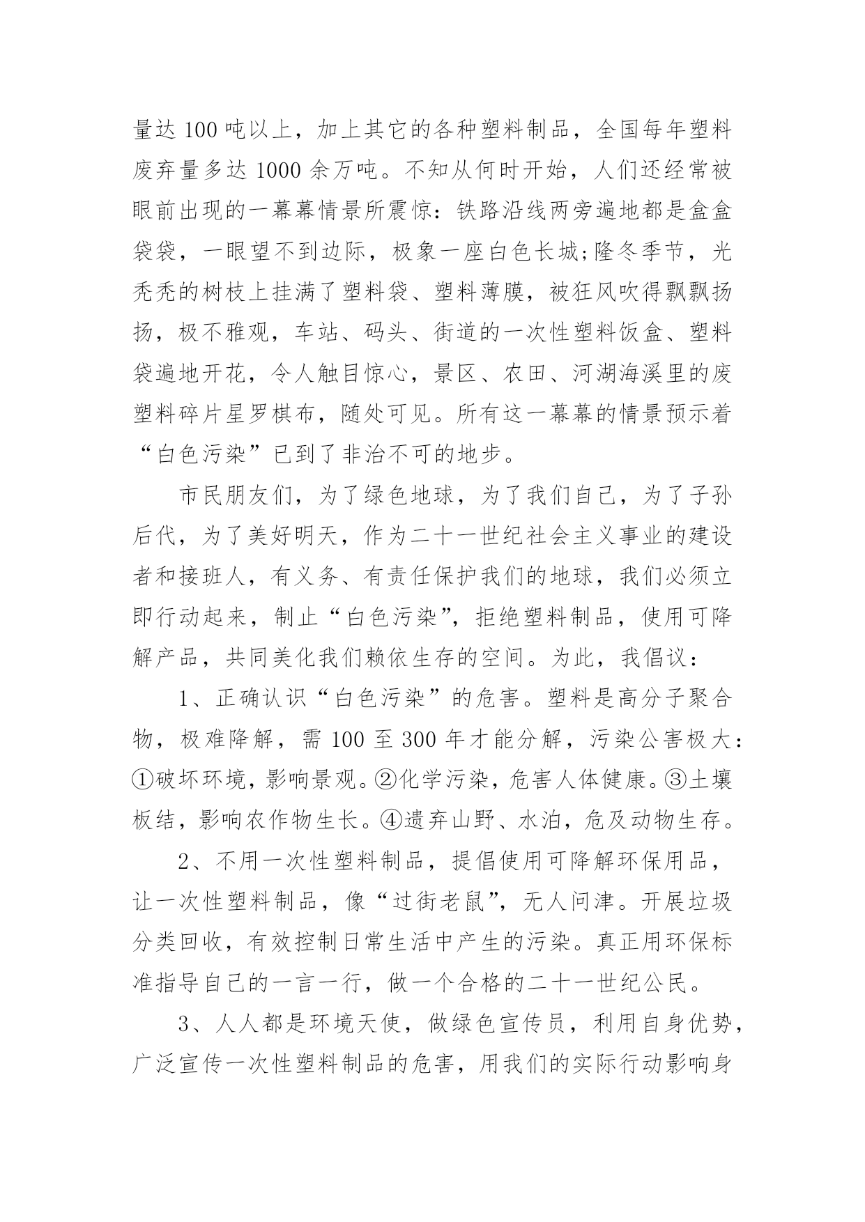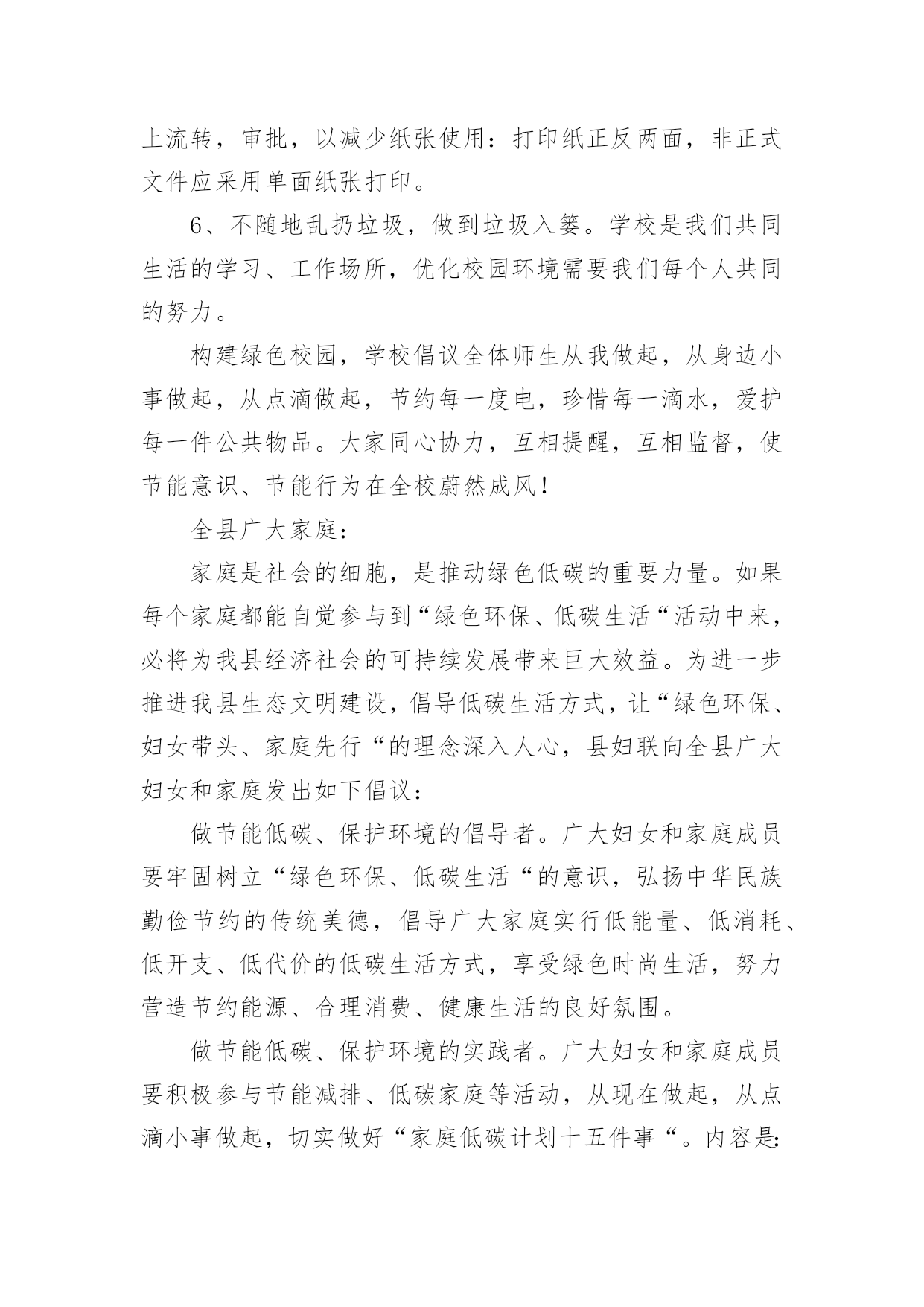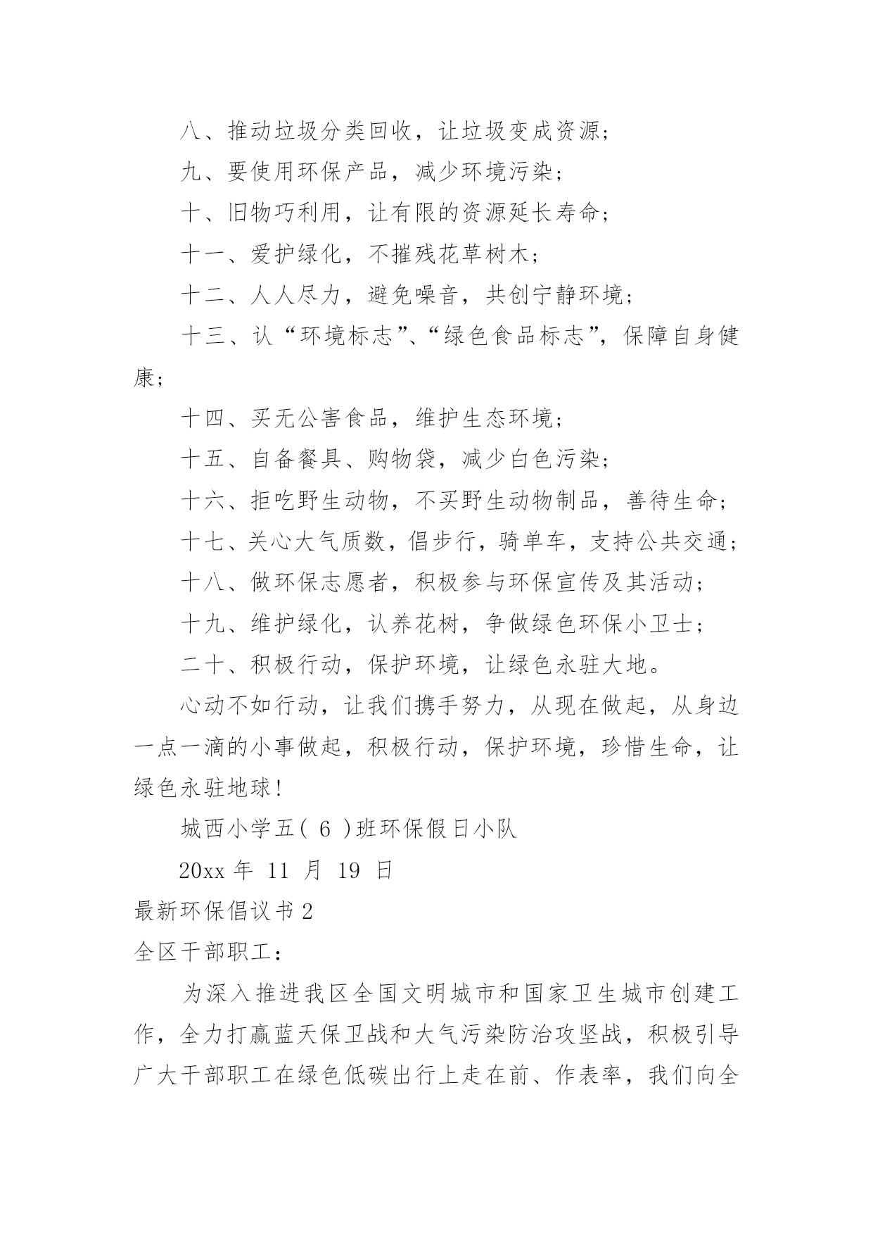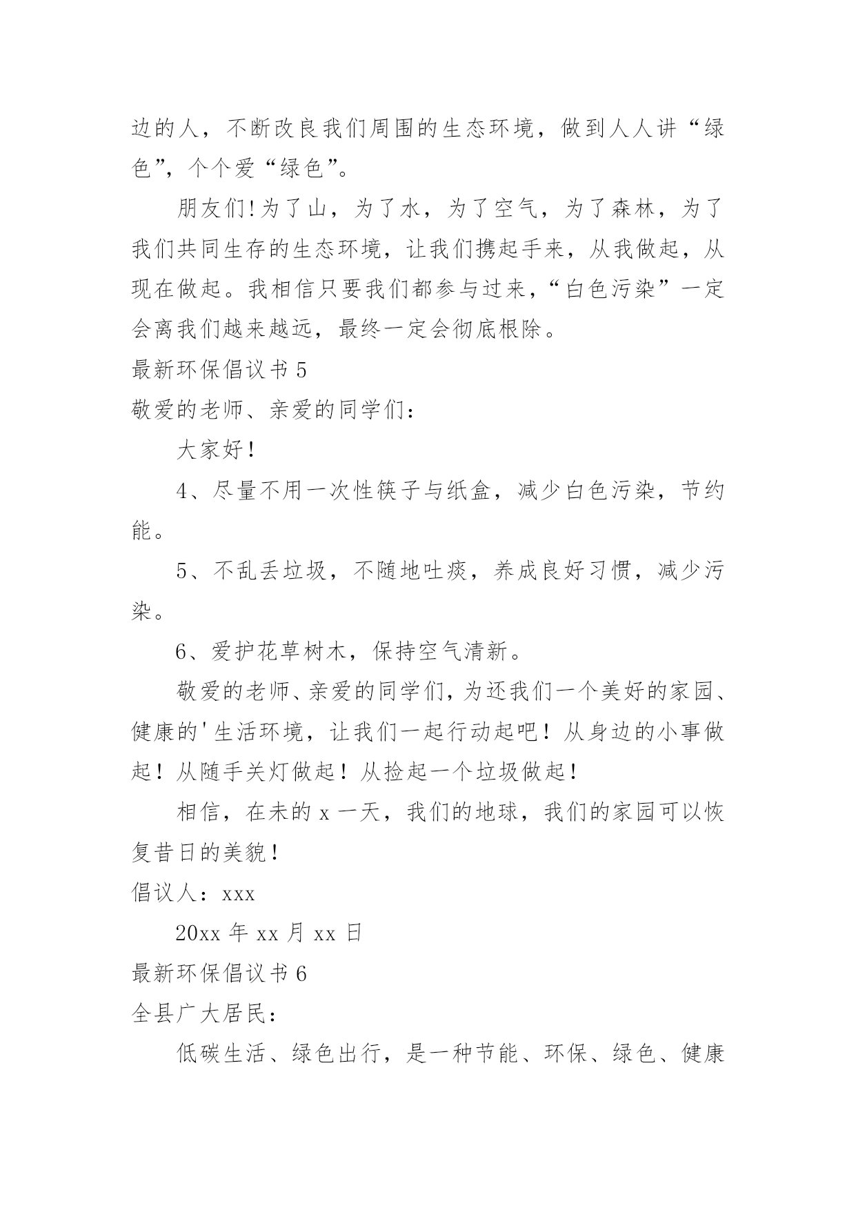 最新环保倡议书(精华)最新环保倡议书在不断进步的时代,用到倡议书的地方越来越多,倡议书一般由标题、称呼、正文、结尾、落款五部分组成。大家知道倡议书的格式吗?以下是小编整理的最新环保倡议书,仅供参考,大家一起来看看吧。最新环保倡议书1同学们:人类只有一个地球,它是生命的摇篮,是人类共有的家园。环境污染与生态破坏,已经对人类的社会经济发展和人们的正常生活构成了现实威胁。爱护环境,崇尚文明,无疑是人类自身的道义和责任。为了牢固树立同学们的环境保护新思想、新道德、新风尚,保护我们美好的`家园,我们发出如下倡议:一、提高环保意识,自觉、认真学习课内外环保知识;二、奉献环保爱心,加入环保行列,保护水源环境;三、爱护环境卫生,不乱丢乱吐,不乱涂乱画;四、节约用水,一水多用,别让生命之泉空流;五、节约用纸;珍惜森林资源;六、节约用电,不过早开灯,人走灯熄;七、珍惜资源,物尽其用,一物多用;八、推动垃圾分类回收,让垃圾变成资源;九、要使用环保产品,减少环境污染;十、旧物巧利用,让有限的资源延长寿命;十一、爱护绿化,不摧残花草树木;十二、人人尽力,避免噪音,共创宁静环境;十三、认“环境标志”、“绿色食品标志”,保障自身健康;十四、买无公害食品,维护生态环境;十五、自备餐具、购物袋,减少白色污染;十六、拒吃野生动物,不买野生动物制品,善待生命;十七、关心大气质数,倡步行,骑单车,支持公共交通;十八、做环保志愿者,积极参与环保宣传及其活动;十九、维护绿化,认养花树,争做绿色环保小卫士;二十、积极行动,保护环境,让绿色永驻大地。心动不如行动,让我们携手努力,从现在做起,从身边一点一滴的小事做起,积极行动,保护环境,珍惜生命,让绿色永驻地球!城西小学五(6)班环保假日小队20xx年11月19日最新环保倡议书2全区干部职工:为深入推进我区全国文明城市和国家卫生城市创建工作,全力打赢蓝天保卫战和大气污染防治攻坚战,积极引导广大干部职工在绿色低碳出行上走在前、作表率,我们向全区广大干部职工发出如下倡议:选择绿色出行方式。倡议广大干部职工公务或个人出行时,尽量少开私家车,优先选择城市公交、自行车、步行等绿色出行方式,缓解城市交通拥堵,从源头上减少大气污染。倡议广大干部职工每月1日、11日、21日,上下班不开私家车。遵守城市交通秩序。倡议广大干部职工在驾车出行时,模范遵守城市交通秩序,不抢红灯,不压实线,不乱停放,礼让行人;绿色出行时,看红绿灯,走人行道,行斑马线,做到健康出行、文明出行,共同营造畅通、有序、环保、健康的交通环境。浓厚社会文明氛围。倡议广大干部职工以身作则,大力宣传绿色出行的.必要性和重要意义,积极引导家人以及亲朋好友增强绿色出行的生活理念和社会责任意识,带动身边人自觉参与、共同营造绿色出行的良好氛围,不断提升全社会文明程度。保护环境,功在当代,利在千秋。让我们积极行动起来,从机关做起,从自己做起,从现在做起,绿色出行、安全出行、健康出行、文明出行,让城市更有序,环境更优美,生活更舒畅!xx区生态环境保护委员会办公室xx区公共机构节能领导小组办公室20xx年9月10日最新环保倡议书3亲爱的老师、同学们:大家好!绿色是令人愉快的颜色,绿色校园是令人向往的校园,将华风创建成一个绿色的校园是我们共同的责任。节能降耗,既是保障学校正常运行,实现学校健康可持续办学的长久之计,也是人与自然和谐相处的必然选择。为此,特向全校师生发出“节能低碳,绿色环保”的.倡议,具体如下:1、物品回收,变废为宝。以班级为单位,回收易拉罐、各类可以变卖的空瓶子、和其它可以回收的废品,如纸张等。变卖后所得的钱作为班会费用。注:瓶子、废纸变卖工作可作如下安排:每班自行准备2个大袋子,一个用于装瓶子,一个用于装废纸,学校会统一安排收购时间,各班可根据收购时间,提前安排好变卖工作,变卖后的经费为各班班会费,生活委员做好收支记录。2、杜绝长明灯。办公室,教室等要充分利用照明,在光线充足的情况下不开室内照明灯。全校师生要培养无人不开灯,人走灯灭的良好习惯。3、合理使用办公室的空调,合理使用教室的电风扇。要做到人下班空调关,人走风扇灭。4、珍惜每一滴水。使用后请关紧水龙头,杜绝浪费现象。5、节约办公用品。逐步实行无纸化办公,除需要存档或共签的重要文件,尽可能在OA系统或电子邮箱,工作群上流转,审批,以减少纸张使用:打印纸正反两面,非正式文件应采用单面纸张打印。6、不随地乱扔垃圾,做到垃圾入篓。学校是我们共同生活的学习、工作场所,优化校园环境需要我们每个人共同的努力。构建绿色校园,学校倡议全体师生从我做起,从身边小事做起,从点滴做起,节约每一度电,珍惜每一滴水,爱护每一件公共物品。大家同心协力,互相提醒,互相监督,使节能意识、节能行为在全校蔚然成风!全县广大家庭:家庭是社会的细胞,是推动绿色