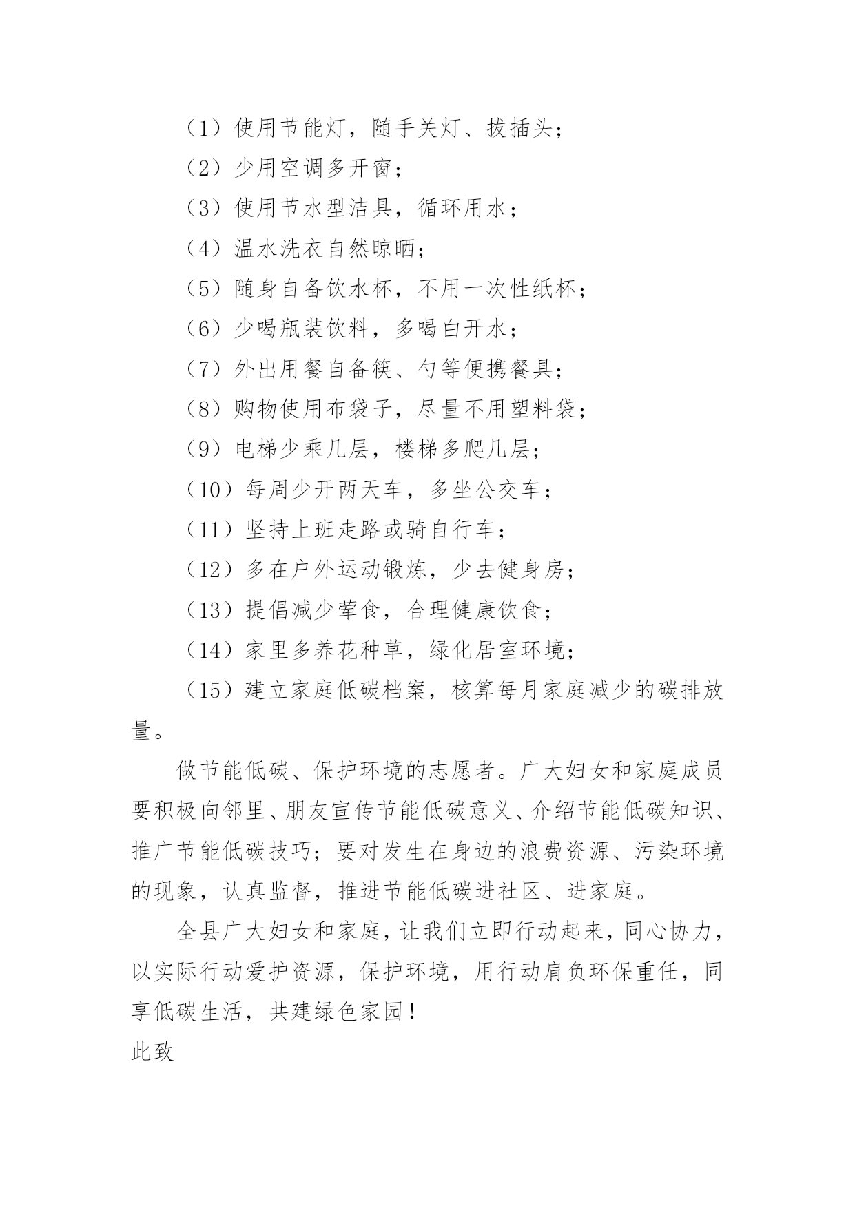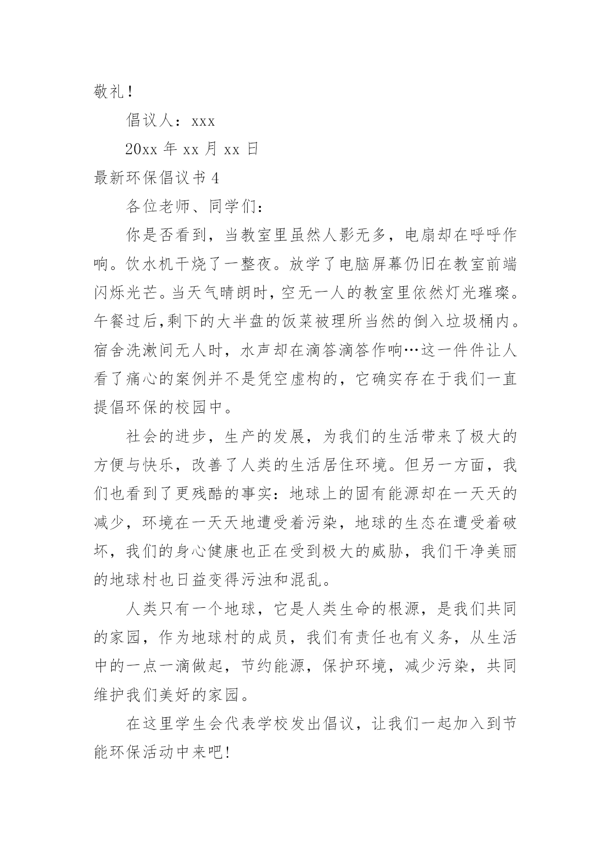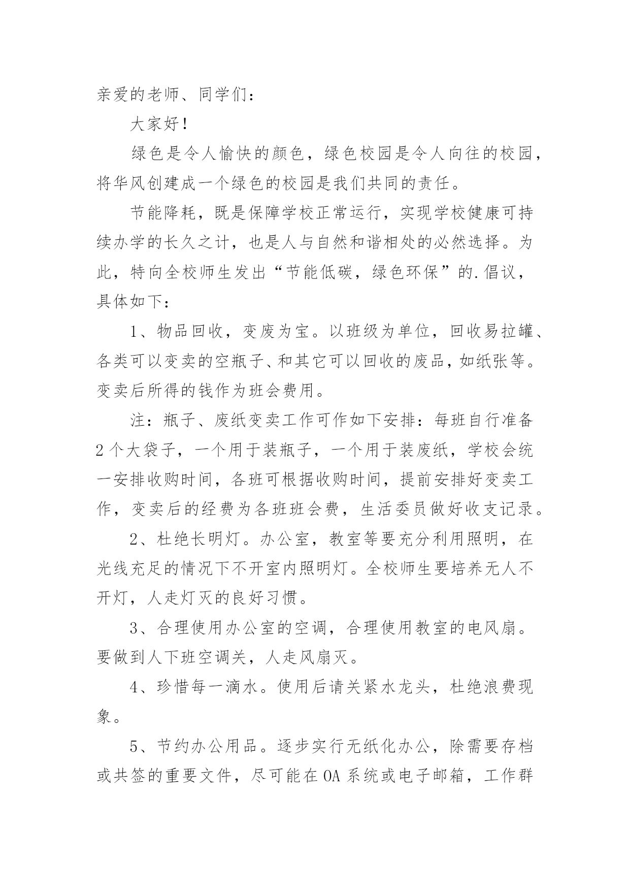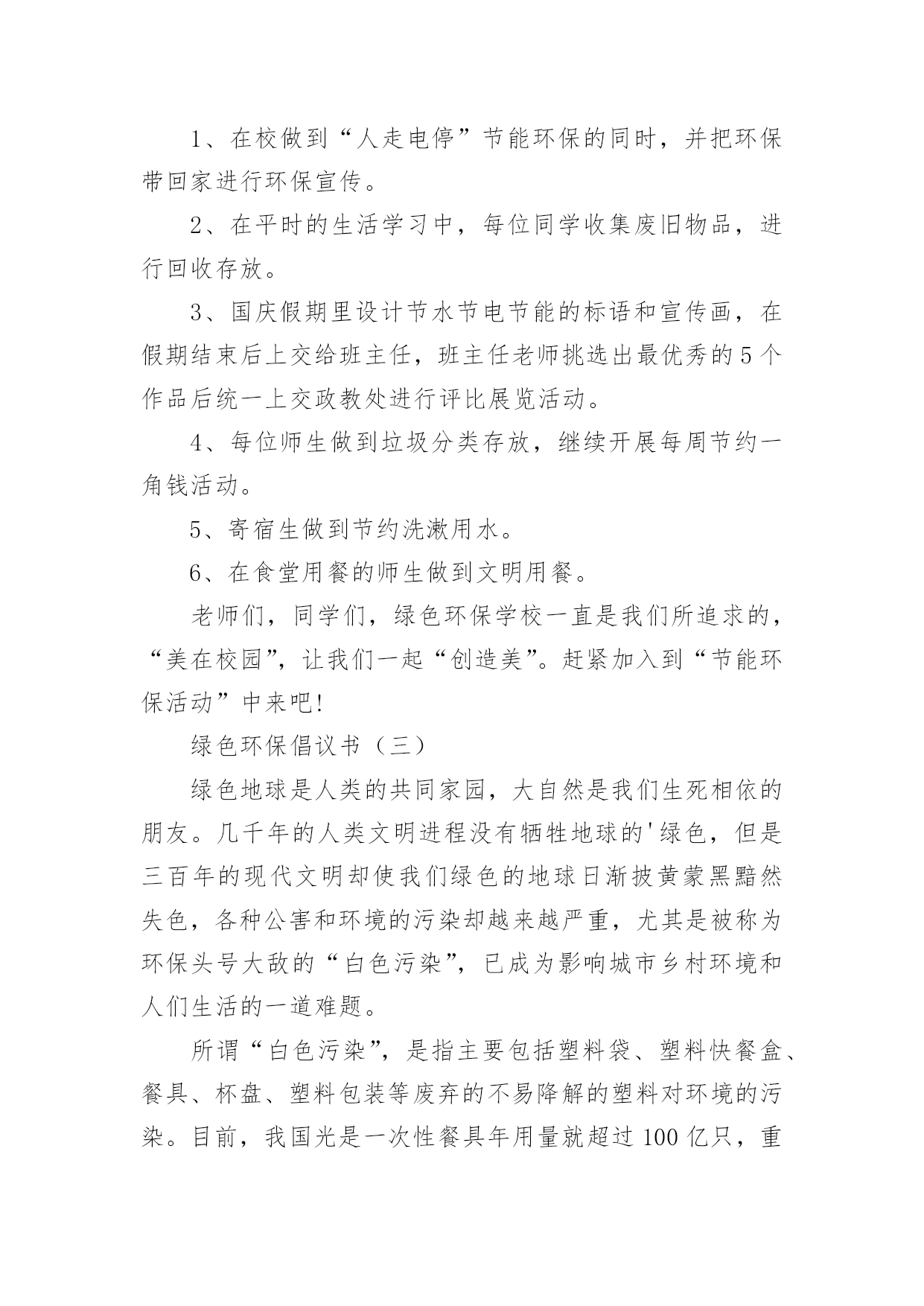 最新环保倡议书(精华)最新环保倡议书在不断进步的时代,用到倡议书的地方越来越多,倡议书一般由标题、称呼、正文、结尾、落款五部分组成。大家知道倡议书的格式吗?以下是小编整理的最新环保倡议书,仅供参考,大家一起来看看吧。最新环保倡议书1同学们:人类只有一个地球,它是生命的摇篮,是人类共有的家园。环境污染与生态破坏,已经对人类的社会经济发展和人们的正常生活构成了现实威胁。爱护环境,崇尚文明,无疑是人类自身的道义和责任。为了牢固树立同学们的环境保护新思想、新道德、新风尚,保护我们美好的`家园,我们发出如下倡议:一、提高环保意识,自觉、认真学习课内外环保知识;二、奉献环保爱心,加入环保行列,保护水源环境;三、爱护环境卫生,不乱丢乱吐,不乱涂乱画;四、节约用水,一水多用,别让生命之泉空流;五、节约用纸;珍惜森林资源;六、节约用电,不过早开灯,人走灯熄;七、珍惜资源,物尽其用,一物多用;八、推动垃圾分类回收,让垃圾变成资源;九、要使用环保产品,减少环境污染;十、旧物巧利用,让有限的资源延长寿命;十一、爱护绿化,不摧残花草树木;十二、人人尽力,避免噪音,共创宁静环境;十三、认“环境标志”、“绿色食品标志”,保障自身健康;十四、买无公害食品,维护生态环境;十五、自备餐具、购物袋,减少白色污染;十六、拒吃野生动物,不买野生动物制品,善待生命;十七、关心大气质数,倡步行,骑单车,支持公共交通;十八、做环保志愿者,积极参与环保宣传及其活动;十九、维护绿化,认养花树,争做绿色环保小卫士;二十、积极行动,保护环境,让绿色永驻大地。心动不如行动,让我们携手努力,从现在做起,从身边一点一滴的小事做起,积极行动,保护环境,珍惜生命,让绿色永驻地球!城西小学五(6)班环保假日小队20xx年11月19日最新环保倡议书2全区干部职工:为深入推进我区全国文明城市和国家卫生城市创建工作,全力打赢蓝天保卫战和大气污染防治攻坚战,积极引导广大干部职工在绿色低碳出行上走在前、作表率,我们向全区广大干部职工发出如下倡议:选择绿色出行方式。倡议广大干部职工公务或个人出行时,尽量少开私家车,优先选择城市公交、自行车、步行等绿色出行方式,缓解城市交通拥堵,从源头上减少大气污染。倡议广大干部职工每月1日、11日、21日,上下班不开私家车。遵守城市交通秩序。倡议广大干部职工在驾车出行时,模范遵守城市交通秩序,不抢红灯,不压实线,不乱停放,礼让行人;绿色出行时,看红绿灯,走人行道,行斑马线,做到健康出行、文明出行,共同营造畅通、有序、环保、健康的交通环境。浓厚社会文明氛围。倡议广大干部职工以身作则,大力宣传绿色出行的.必要性和重要意义,积极引导家人以及亲朋好友增强绿色出行的生活理念和社会责任意识,带动身边人自觉参与、共同营造绿色出行的良好氛围,不断提升全社会文明程度。保护环境,功在当代,利在千秋。让我们积极行动起来,从机关做起,从自己做起,从现在做起,绿色出行、安全出行、健康出行、文明出行,让城市更有序,环境更优美,生活更舒畅!xx区生态环境保护委员会办公室xx区公共机构节能领导小组办公室20xx年9月10日最新环保倡议书3亲爱的老师、同学们:大家好!绿色是令人愉快的颜色,绿色校园是令人向往的校园,将华风创建成一个绿色的校园是我们共同的责任。节能降耗,既是保障学校正常运行,实现学校健康可持续办学的长久之计,也是人与自然和谐相处的必然选择。为此,特向全校师生发出“节能低碳,绿色环保”的.倡议,具体如下:1、物品回收,变废为宝。以班级为单位,回收易拉罐、各类可以变卖的空瓶子、和其它可以回收的废品,如纸张等。变卖后所得的钱作为班会费用。注:瓶子、废纸变卖工作可作如下安排:每班自行准备2个大袋子,一个用于装瓶子,一个用于装废纸,学校会统一安排收购时间,各班可根据收购时间,提前安排好变卖工作,变卖后的经费为各班班会费,生活委员做好收支记录。2、杜绝长明灯。办公室,教室等要充分利用照明,在光线充足的情况下不开室内照明灯。全校师生要培养无人不开灯,人走灯灭的良好习惯。3、合理使用办公室的空调,合理使用教室的电风扇。要做到人下班空调关,人走风扇灭。4、珍惜每一滴水。使用后请关紧水龙头,杜绝浪费现象。5、节约办公用品。逐步实行无纸化办公,除需要存档或共签的重要文件,尽可能在OA系统或电子邮箱,工作群上流转,审批,以减少纸张使用:打印纸正反两面,非正式文件应采用单面纸张打印。6、不随地乱扔垃圾,做到垃圾入篓。学校是我们共同生活的学习、工作场所,优化校园环境需要我们每个人共同的努力。构建绿色校园,学校倡议全体师生从我做起,从身边小事做起,从点滴做起,节约每一度电,珍惜每一滴水,爱护每一件公共物品。大家同心协力,互相提醒,互相监督,使节能意识、节能行为在全校蔚然成风!全县广大家庭:家庭是社会的细胞,是推动绿色