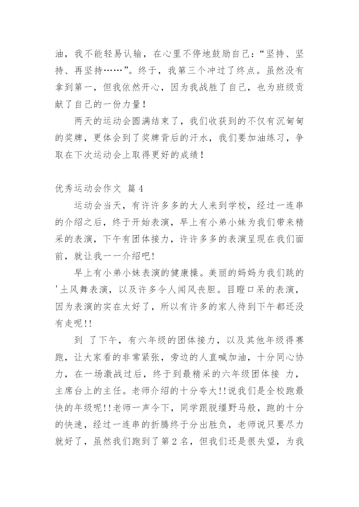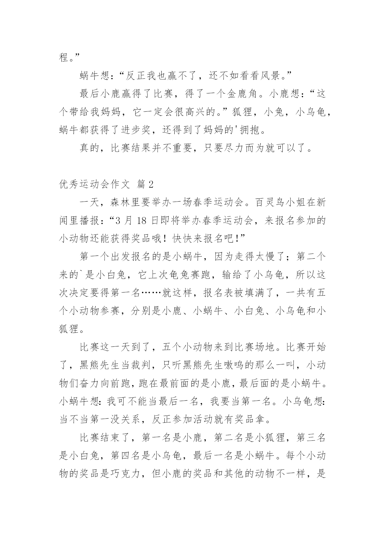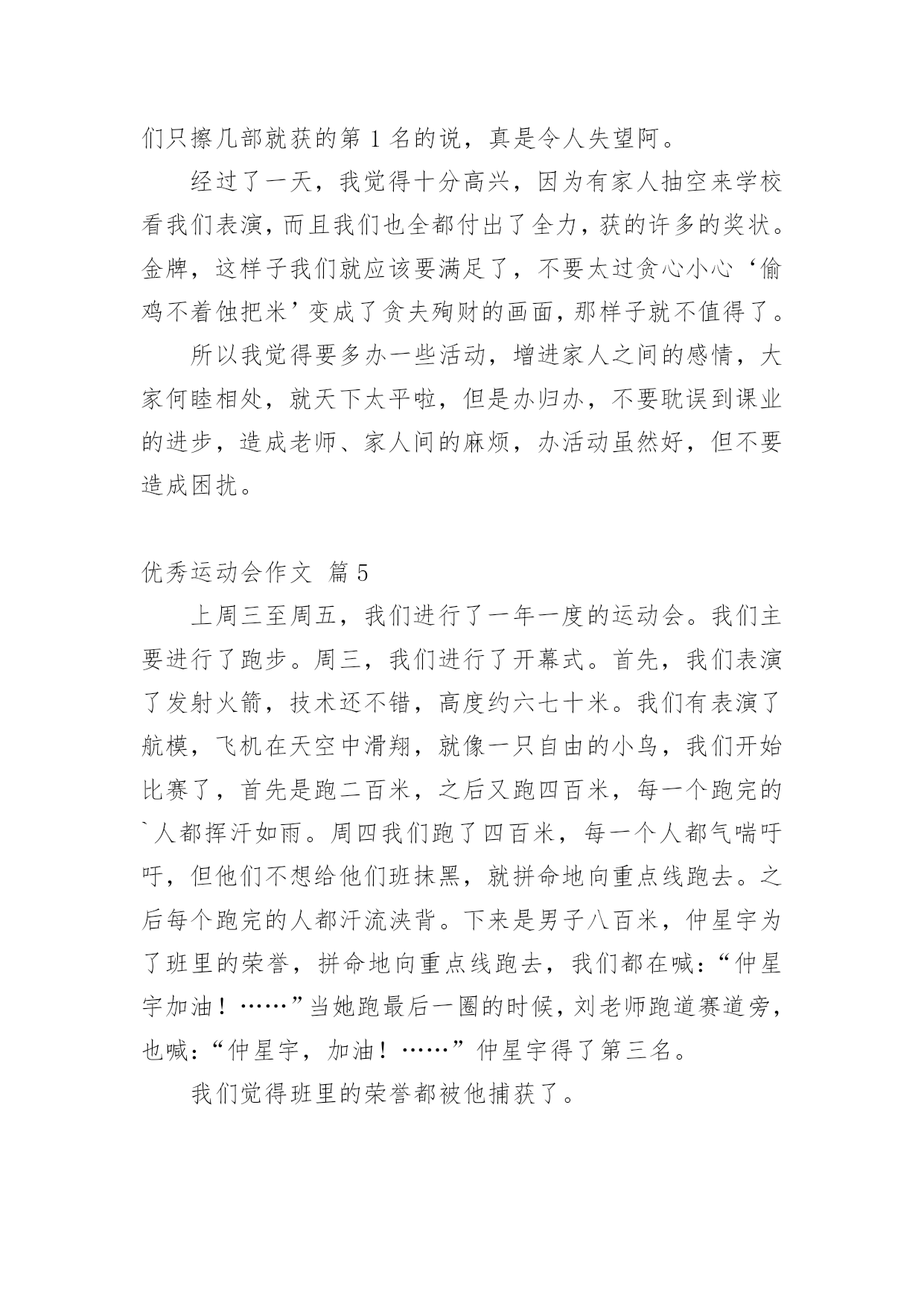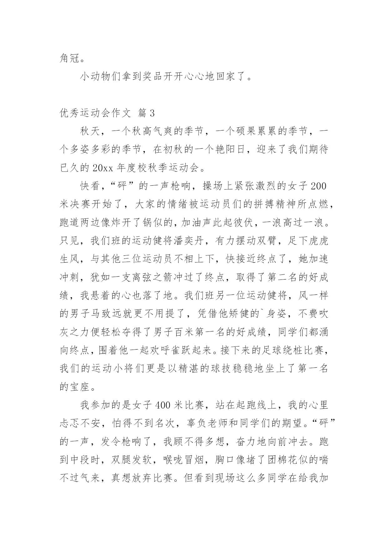 优秀运动会作文实用的优秀运动会作文汇总[5篇]在平平淡淡的学习、工作、生活中,大家都经常看到作文的身影吧,作文是人们把记忆中所存储的有关知识、经验和思想用书面形式表达出来的记叙方式。那么问题来了,到底应如何写一篇优秀的作文呢?以下是小编精心整理的优秀运动会作文5篇,希望对大家有所帮助。优秀运动会作文篇1早上,太阳走进了森林。小动物们起床了,它们打开电视机看见百灵鸟小姐在说话,它说:“一年一度的森林运动会开始了,欢迎大家前来报名,赢的人可以得奖,快来报名呀!”大家听到消息之后,都前来报名。小乌龟从早上爬到了中午才到,过了几分钟,小乌龟就报好了。远远看见小鹿奔跑了过来,小鹿报完名后就和大黑熊市长握了握手,小鹿的手都被握疼了,还怎么跑步呀?比赛开始了,选手们都来到了起点,小鹿、狐狸、小兔、小乌龟和蜗牛都准备好了。它们开始了比赛。小鹿一马当先超过了其它选手。狐狸想:“我那些馊主意也用不上了,还是继续跑吧。”小兔想:“这次我一定能超过乌龟。”乌龟想:“比赛赢不了不重要,重要的是我们努力的过程。”蜗牛想:“反正我也赢不了,还不如看看风景。”最后小鹿赢得了比赛,得了一个金鹿角。小鹿想:“这个带给我妈妈,它一定会很高兴的。”狐狸,小兔,小乌龟,蜗牛都获得了进步奖,还得到了妈妈的'拥抱。真的,比赛结果并不重要,只要尽力而为就可以了。优秀运动会作文篇2一天,森林里要举办一场春季运动会。百灵鸟小姐在新闻里播报:“3月18日即将举办春季运动会,来报名参加的小动物还能获得奖品哦!快快来报名吧!”第一个出发报名的是小蜗牛,因为走得太慢了;第二个来的`是小白兔,它上次龟兔赛跑,输给了小乌龟,所以这次决定要得第一名……就这样,报名表被填满了,一共有五个小动物参赛,分别是小鹿、小蜗牛、小白兔、小乌龟和小狐狸。比赛这一天到了,五个小动物来到比赛场地。比赛开始了,黑熊先生当裁判,只听黑熊先生嗷呜的那么一叫,小动物们奋力向前跑,跑在最前面的是小鹿,最后面的是小蜗牛。小蜗牛想:我可不能当最后一名,我要当第一名。小乌龟想:当不当第一没关系,反正参加活动就有奖品拿。比赛结束了,第一名是小鹿,第二名是小狐狸,第三名是小白兔,第四名是小乌龟,最后一名是小蜗牛。每个小动物的奖品是巧克力,但小鹿的奖品和其他的动物不一样,是角冠。小动物们拿到奖品开开心心地回家了。优秀运动会作文篇3秋天,一个秋高气爽的季节,一个硕果累累的季节,一个多姿多彩的季节,在初秋的一个艳阳日,迎来了我们期待已久的20xx年度校秋季运动会。快看,“砰”的一声枪响,操场上紧张激烈的女子200米决赛开始了,大家的情绪被运动员们的拼搏精神所点燃,跑道两边像炸开了锅似的,加油声此起彼伏,一浪高过一浪。只见,我们班的运动健将潘奕丹,有力摆动双臂,足下虎虎生风,与其他三位运动员不相上下,快接近终点了,她加速冲刺,犹如一支离弦之箭冲过了终点,取得了第二名的好成绩,我悬着的心也落了地。我们班另一位运动健将,风一样的男子马致远就更不用提了,凭借他矫健的`身姿,不费吹灰之力便轻松夺得了男子百米第一名的好成绩,同学们都涌向终点,围着他一起欢呼雀跃起来。接下来的足球绕桩比赛,我们的运动小将们更是以精湛的球技稳稳地坐上了第一名的宝座。我参加的是女子400米比赛,站在起跑线上,我的心里忐忑不安,怕得不到名次,辜负老师和同学们的期望。“砰”的一声,发令枪响了,我顾不得多想,奋力地向前冲去。跑到中段时,双腿发软,喉咙冒烟,胸口像堵了团棉花似的喘不过气来,真想放弃比赛。但看到现场这么多同学在给我加油,我不能轻易认输,在心里不停地鼓励自己:“坚持、坚持、再坚持……”。终于,我第三个冲过了终点。虽然没有拿到第一,但我依然开心,因为我战胜了自己,也为班级贡献了自己的一份力量!两天的运动会圆满结束了,我们收获到的不仅有沉甸甸的奖牌,更体会到了奖牌背后的汗水,我们要加油练习,争取在下次运动会上取得更好的成绩!优秀运动会作文篇4运动会当天,有许许多多的大人来到学校,经过一连串的介绍之后,终于开始表演,早上有小弟小妹为我们带来精采的表演,下午有团体接力,许许多多的表演呈现在我们面前,就让我一一介绍吧!早上有小弟小妹表演的健康操。美丽的妈妈为我们跳的'土风舞表演,以及许多令人闻风丧胆。目瞪口呆的表演,因为表演的实在太好了,所以有许多的家人待到下午都还没有走呢!!到了下午,有六年级的团体接力,以及其他年级得赛跑,让大家看的非常紧张,旁边的人直喊加油,十分同心协力,在一场激战过后,终于到最精采的六年级团体接力,主席台上的主任。老师介绍的十分夸大!!说我们是全校跑最快的年级呢!!老师一声令下,同学跟脱缰野马般,跑的十分的快速,经过一连串的折腾终于分出胜负,老师说只要尽力就好了,虽然我们跑到了第2名,但我们还是很失望,为我们只擦几部就获的第1名的说,真是令人失望阿