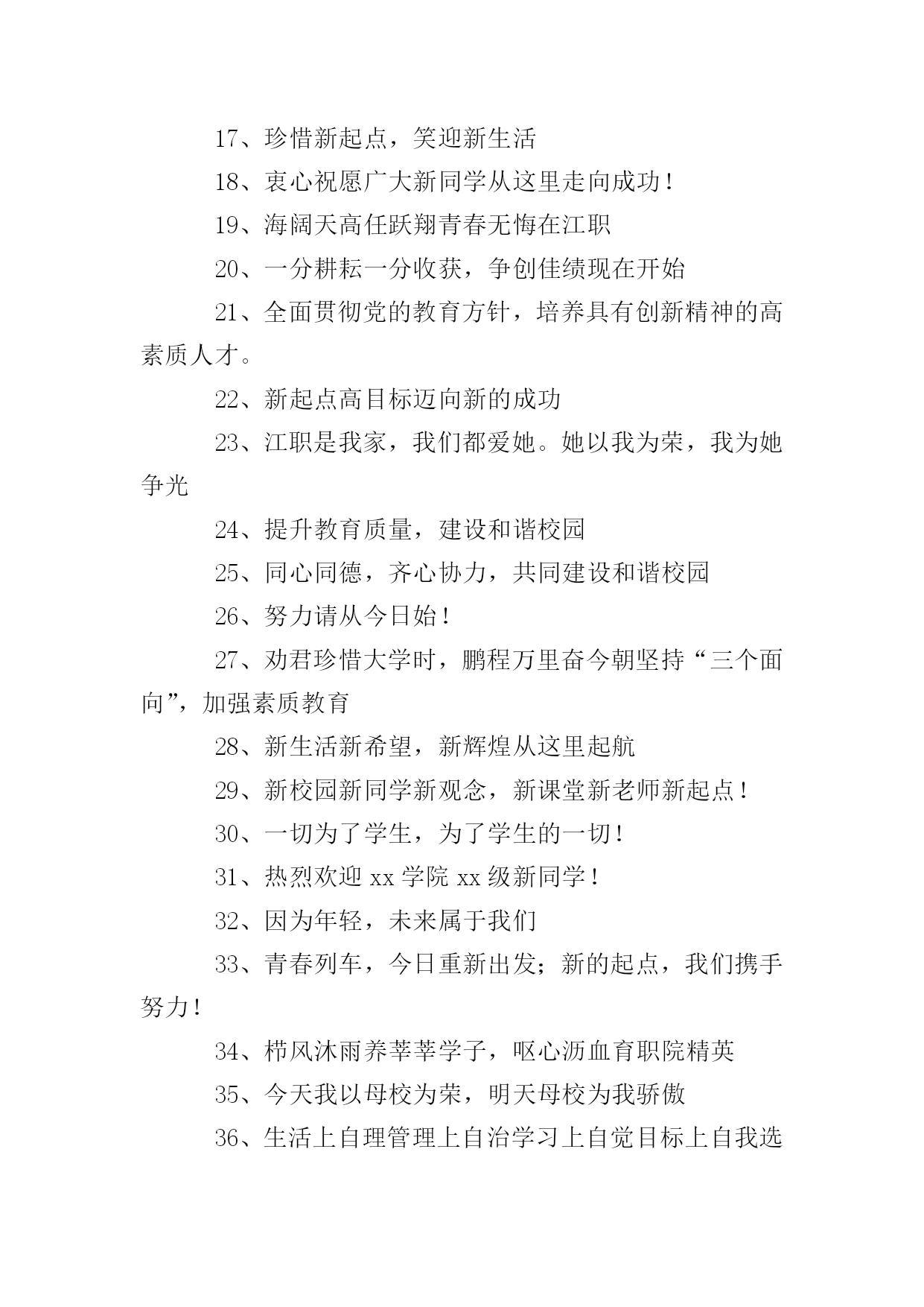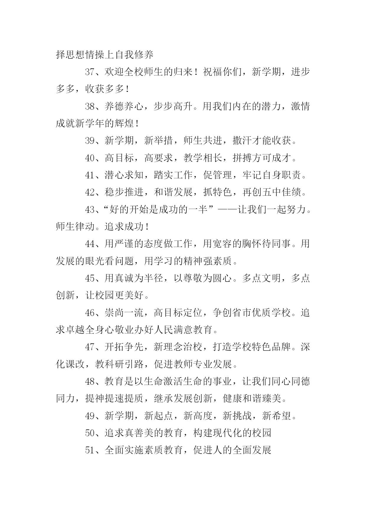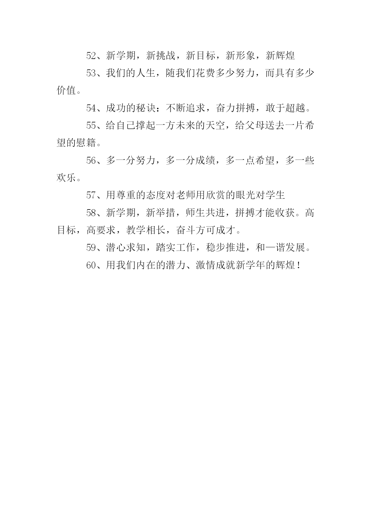 中学秋季运动会标语导语:金秋送爽喜迎八方学子,丹桂飘香共祝美好明天!小编给大家提供中学秋季运动会标语,欢迎阅读和参考!1、编织一对坚实的翅膀,让梦想在这里起飞!2、坚持教育为人民服务的思想,一切为学生发展着想!3、做文明新生,创和谐校园4、迎新同学,展新风貌5、携手武生院,共创辉煌6、金秋送爽,喜迎八方学子,丹桂飘香,共祝美好明天!7、热烈欢迎来自五湖四海的莘莘学子!8、我的职院是我家,家的温馨你我他9、牢记“明德笃学尚能崇艺”校训,再接再厉,创造职院辉煌!10、建设先进文化打造优良校风11、欢迎新同学!12、做武生院人,铸武生院魂!13、迎接新学年,迎接新同学!14、今日江门职院学子,明日技术应用型人才!15、良好的开端是成功的一半16、新学期,新姿态,新作风,新进步17、珍惜新起点,笑迎新生活18、衷心祝愿广大新同学从这里走向成功!19、海阔天高任跃翔青春无悔在江职20、一分耕耘一分收获,争创佳绩现在开始21、全面贯彻党的教育方针,培养具有创新精神的高素质人才。22、新起点高目标迈向新的成功23、江职是我家,我们都爱她。她以我为荣,我为她争光24、提升教育质量,建设和谐校园25、同心同德,齐心协力,共同建设和谐校园26、努力请从今日始!27、劝君珍惜大学时,鹏程万里奋今朝坚持“三个面向”,加强素质教育28、新生活新希望,新辉煌从这里起航29、新校园新同学新观念,新课堂新老师新起点!30、一切为了学生,为了学生的一切!31、热烈欢迎xx学院xx级新同学!32、因为年轻,未来属于我们33、青春列车,今日重新出发;新的起点,我们携手努力!34、栉风沐雨养莘莘学子,呕心沥血育职院精英35、今天我以母校为荣,明天母校为我骄傲36、生活上自理管理上自治学习上自觉目标上自我选择思想情操上自我修养37、欢迎全校师生的归来!祝福你们,新学期,进步多多,收获多多!38、养德养心,步步高升。用我们内在的潜力,激情成就新学年的辉煌!39、新学期,新举措,师生共进,撒汗才能收获。40、高目标,高要求,教学相长,拼搏方可成才。41、潜心求知,踏实工作,促管理,牢记自身职责。42、稳步推进,和谐发展,抓特色,再创五中佳绩。43、“好的开始是成功的一半”——让我们一起努力。师生律动。追求成功!44、用严谨的态度做工作,用宽容的胸怀待同事。用发展的眼光看问题,用学习的精神强素质。45、用真诚为半径,以尊敬为圆心。多点文明,多点创新,让校园更美好。46、崇尚一流,高目标定位,争创省市优质学校。追求卓越全身心敬业办好人民满意教育。47、开拓争先,新理念治校,打造学校特色品牌。深化课改,教科研引路,促进教师专业发展。48、教育是以生命激活生命的事业,让我们同心同德同力,提神提速提质,继承发展创新,健康和谐臻美。49、新学期,新起点,新高度,新挑战,新希望。50、追求真善美的教育,构建现代化的校园51、全面实施素质教育,促进人的全面发展52、新学期,新挑战,新目标,新形象,新辉煌53、我们的人生,随我们花费多少努力,而具有多少价值。54、成功的秘诀:不断追求,奋力拼搏,敢于超越。55、给自己撑起一方未来的天空,给父母送去一片希望的慰籍。56、多一分努力,多一分成绩,多一点希望,多一些欢乐。57、用尊重的态度对老师用欣赏的眼光对学生58、新学期,新举措,师生共进,拼搏才能收获。高目标,高要求,教学相长,奋斗方可成才。59、潜心求知,踏实工作,稳步推进,和—谐发展。60、用我们内在的潜力、激情成就新学年的辉煌!