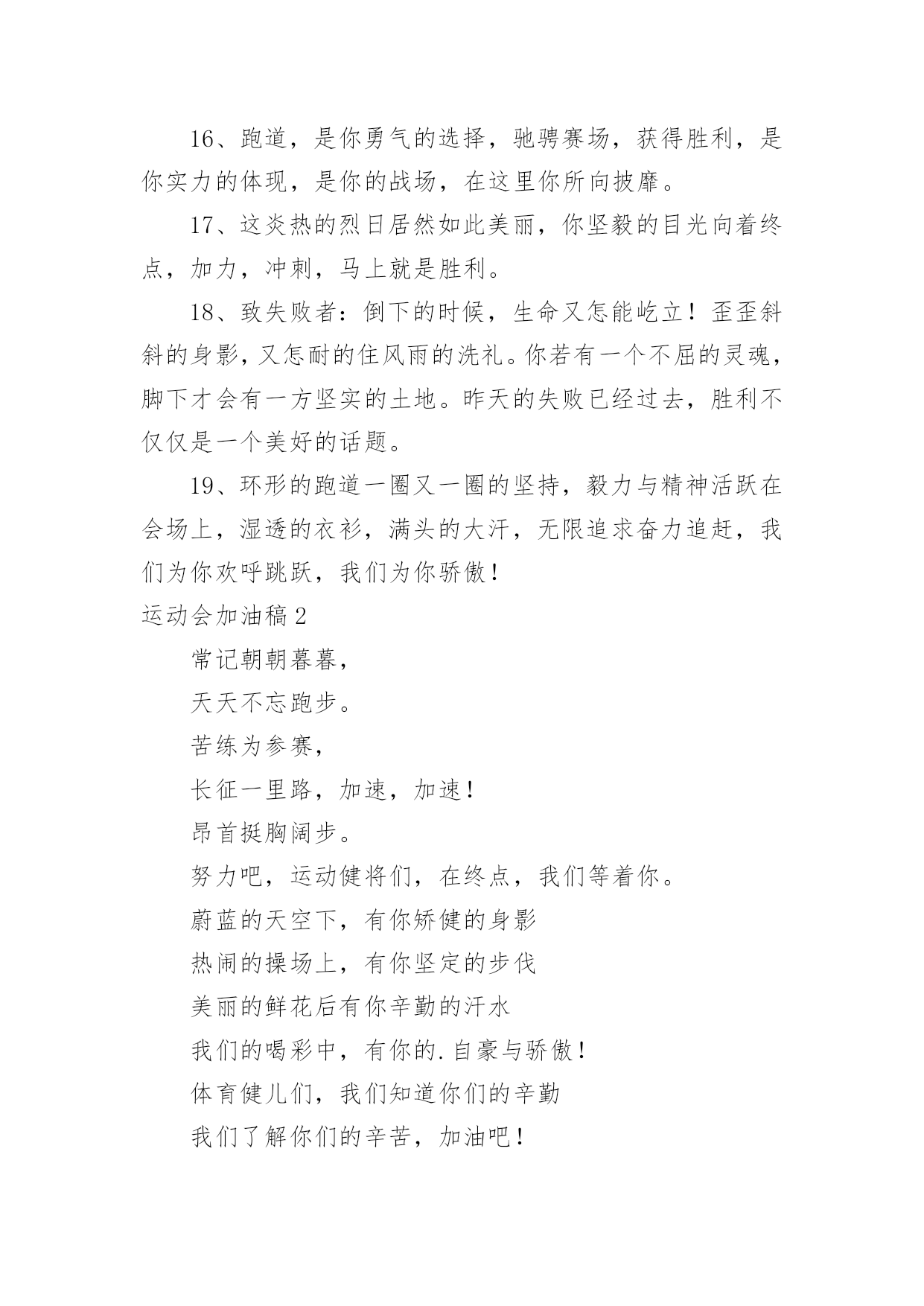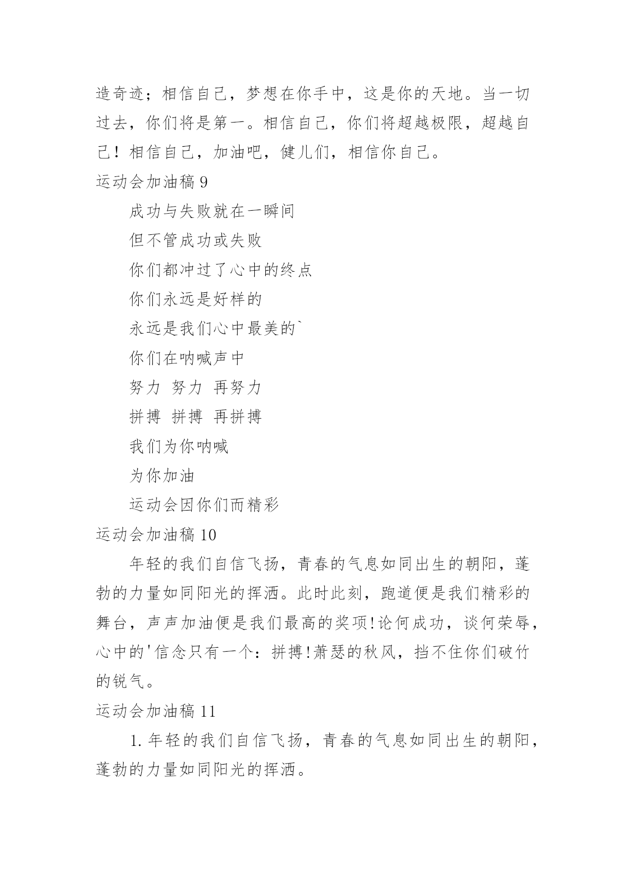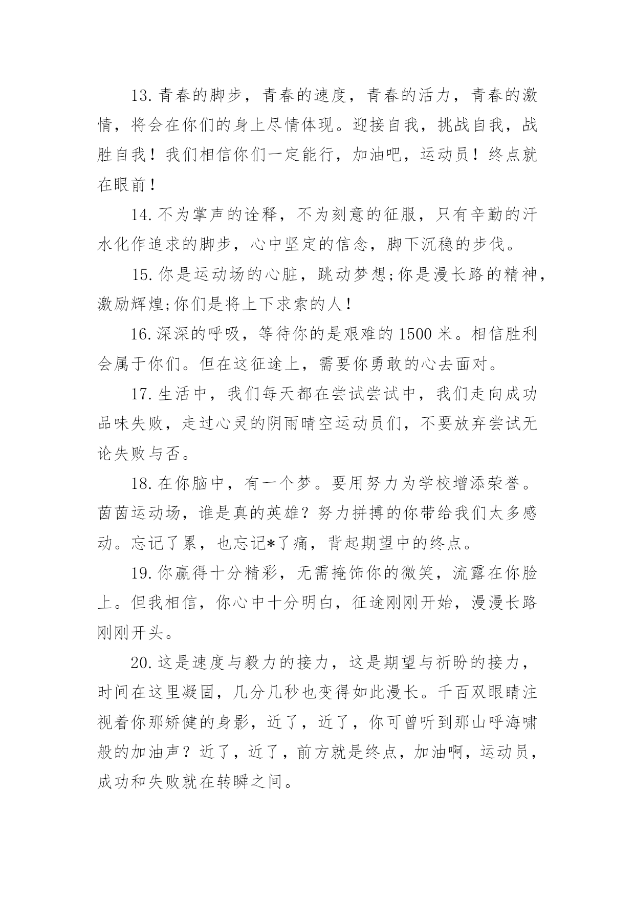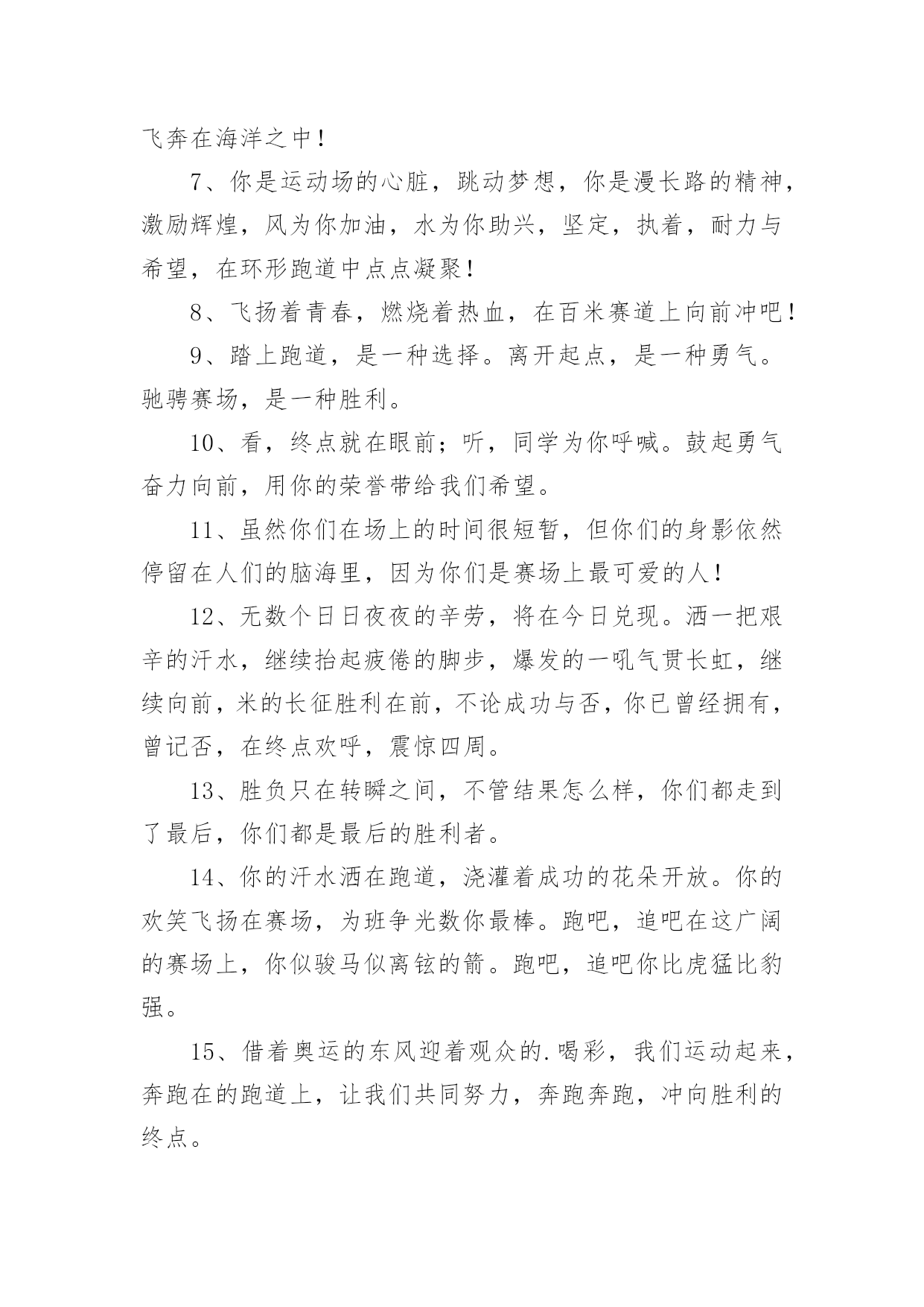 运动会加油稿运动会加油稿在现实社会中,接触并使用加油稿的人越来越多,加油稿可以强化人们的自我认知,给予人正向的激励作用。你写加油稿时总是无从下笔?以下是小编为大家整理的运动会加油稿,欢迎大家借鉴与参考,希望对大家有所帮助。运动会加油稿11、你用坚实的臂膀,撑起了一片天,你用坚实的臂膀,撑起了班级的荣耀,你用坚实的臂膀撑起了我们坚定的信念,在战场前告诉我们坚强坚强,祝你成功,加油!2、运动健将们,用你的实力,用你的精神,去开拓出,一片属于你的长跑天地!3、你们是我心中的太阳,在热度的考验下,你们渴望;在风度的辛意中,你们痴狂。亲爱的运动员们,愿你们冲破乌云,放出耀眼的光芒!4、枪声响起,冲刺向前,一马当先,咫尺天涯,永恒之巅,冲吧,向着未来冲刺,向着胜利冲刺。5、迎接自我,挑战自我,战胜自我!我们相信你们一定能行,加油吧,运动员!终点就在眼前!6、你像是头猎豹,疾驰在草原之中;你像一艘快艇,飞奔在海洋之中!7、你是运动场的心脏,跳动梦想,你是漫长路的精神,激励辉煌,风为你加油,水为你助兴,坚定,执着,耐力与希望,在环形跑道中点点凝聚!8、飞扬着青春,燃烧着热血,在百米赛道上向前冲吧!9、踏上跑道,是一种选择。离开起点,是一种勇气。驰骋赛场,是一种胜利。10、看,终点就在眼前;听,同学为你呼喊。鼓起勇气奋力向前,用你的荣誉带给我们希望。11、虽然你们在场上的时间很短暂,但你们的身影依然停留在人们的脑海里,因为你们是赛场上最可爱的人!12、无数个日日夜夜的辛劳,将在今日兑现。洒一把艰辛的汗水,继续抬起疲倦的脚步,爆发的一吼气贯长虹,继续向前,米的长征胜利在前,不论成功与否,你已曾经拥有,曾记否,在终点欢呼,震惊四周。13、胜负只在转瞬之间,不管结果怎么样,你们都走到了最后,你们都是最后的胜利者。14、你的汗水洒在跑道,浇灌着成功的花朵开放。你的欢笑飞扬在赛场,为班争光数你最棒。跑吧,追吧在这广阔的赛场上,你似骏马似离铉的箭。跑吧,追吧你比虎猛比豹强。15、借着奥运的东风迎着观众的.喝彩,我们运动起来,奔跑在的跑道上,让我们共同努力,奔跑奔跑,冲向胜利的终点。16、跑道,是你勇气的选择,驰骋赛场,获得胜利,是你实力的体现,是你的战场,在这里你所向披靡。17、这炎热的烈日居然如此美丽,你坚毅的目光向着终点,加力,冲刺,马上就是胜利。18、致失败者:倒下的时候,生命又怎能屹立!歪歪斜斜的身影,又怎耐的住风雨的洗礼。你若有一个不屈的灵魂,脚下才会有一方坚实的土地。昨天的失败已经过去,胜利不仅仅是一个美好的话题。19、环形的跑道一圈又一圈的坚持,毅力与精神活跃在会场上,湿透的衣衫,满头的大汗,无限追求奋力追赶,我们为你欢呼跳跃,我们为你骄傲!运动会加油稿2常记朝朝暮暮,天天不忘跑步。苦练为参赛,长征一里路,加速,加速!昂首挺胸阔步。努力吧,运动健将们,在终点,我们等着你。蔚蓝的天空下,有你矫健的身影热闹的操场上,有你坚定的步伐美丽的鲜花后有你辛勤的汗水我们的喝彩中,有你的.自豪与骄傲!体育健儿们,我们知道你们的辛勤我们了解你们的辛苦,加油吧!不论你是成功还是失败,我们都是你们坚强的后盾胜也爱你,败也爱你,我们永远支持你你们永远是“最特别的存在”。是种子就该有绿色的希望,是种子就该有金色的梦想不要躺在封闭的暖房,怕什么秋日薄薄的风霜。既然已走上了运动场,心里就不要多想跑道已洒满阳光,不要羞涩、不要紧张。听秋雁在空中为你歌唱快去拾取片片金黄,充满信心,就有希望。运动会加油稿31、快去追赶对手,快去夺取胜利!相信你会送给我们一个汗水浸湿的微笑!2、不为掌声的诠释,不为刻意的征服,仅有辛勤的汗水化作追求的脚步,心中坚定的信念,脚下沉稳的步伐,你用行动诉说着一个不变的真理。3、泥泞的路走过无数,累了,告诉自我:快了,再坚持一会儿;身上的伤流出血来,疼了,告诉自我:别哭,会好的;摔倒了,告诉自我:快爬起来,世上很少有坦途。4、萧瑟的秋风,挡不住你们破竹的锐气,广阔的绿茵场,是为你们搭建的舞台。张扬吧,年轻的心,我们将为你永远喝彩!5、运动场上有你们的飒爽英姿,运动场上有你们拼搏的身影,面对漫漫的征程,你没有畏惧和退缩!6、环形的跑道,一圈又一圈的坚持,毅力与精神活跃在会场上,湿透的衣衫,满头的'大汗,无限追求。7、人生的路,有坦途,也有坎坷,做过的岁月,有欢笑,也有苦涩,泪水告诉我一个跌倒的故事,汗水使我多了一份沉重,几多成熟。理想毕竟不一样于现实,失败是生活的一部分,谁也无法选择,无法抗拒,人生要自己去拼搏,去奋斗,在风雨中百折不饶勇往直前。流泪不是失落,徘徊不是迷惑,成功属于那些战胜失败,坚持不懈,勇于追求梦想的人。8、你是运动场的心脏,跳动梦想;你是漫长路的精神,激励辉煌;你们是将上下求索的人!风为你加油,云为你助兴,坚定,执着,耐力与希望,在