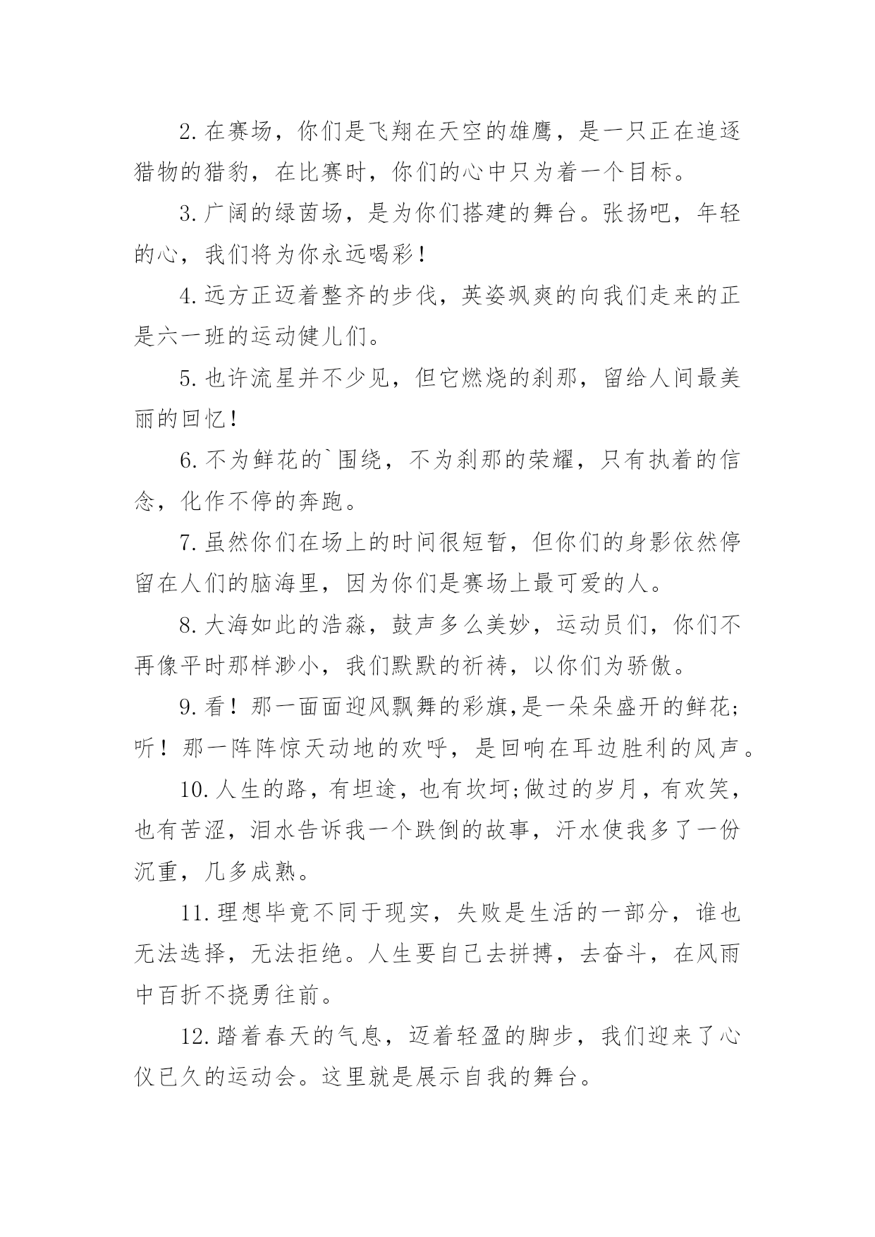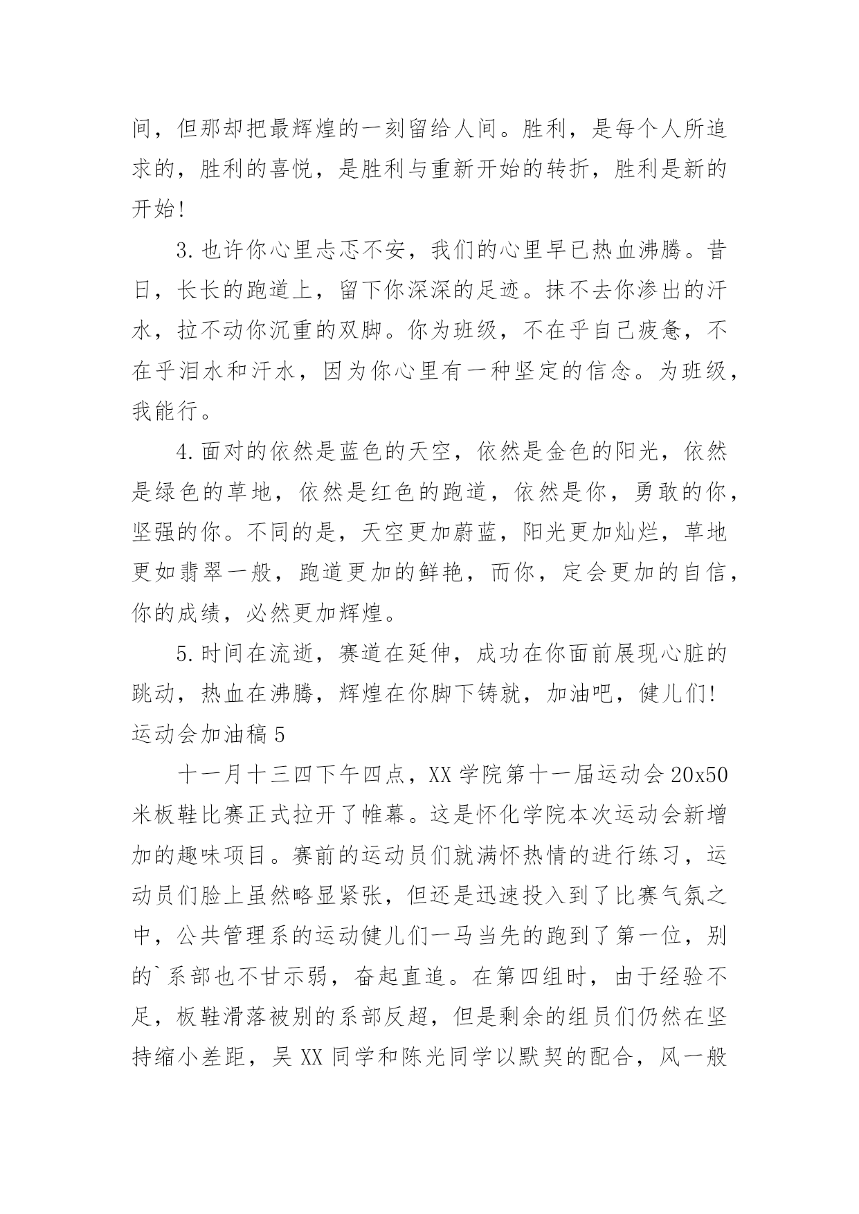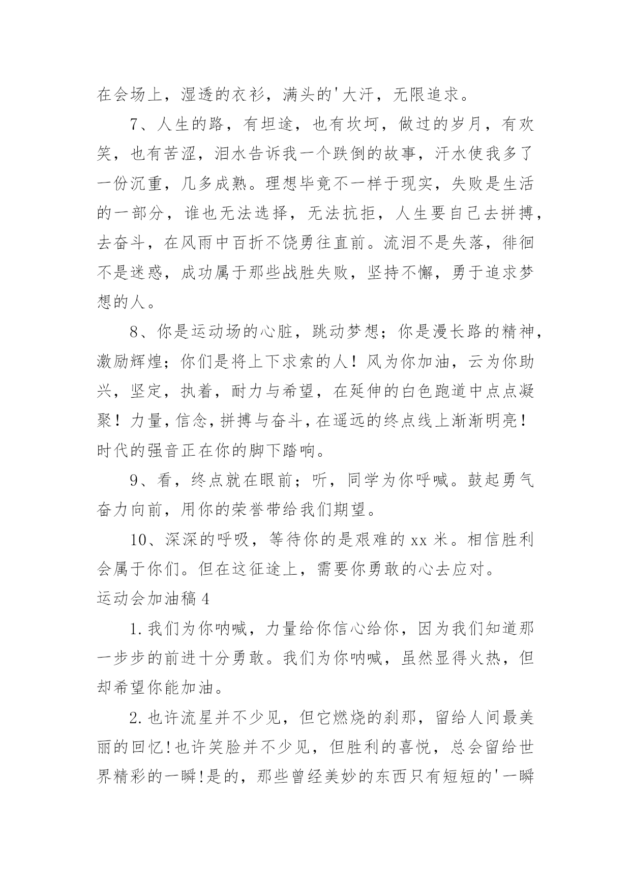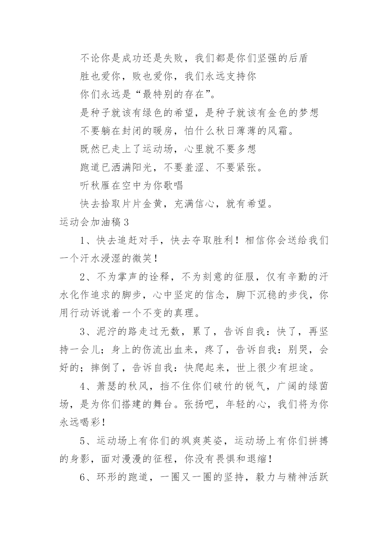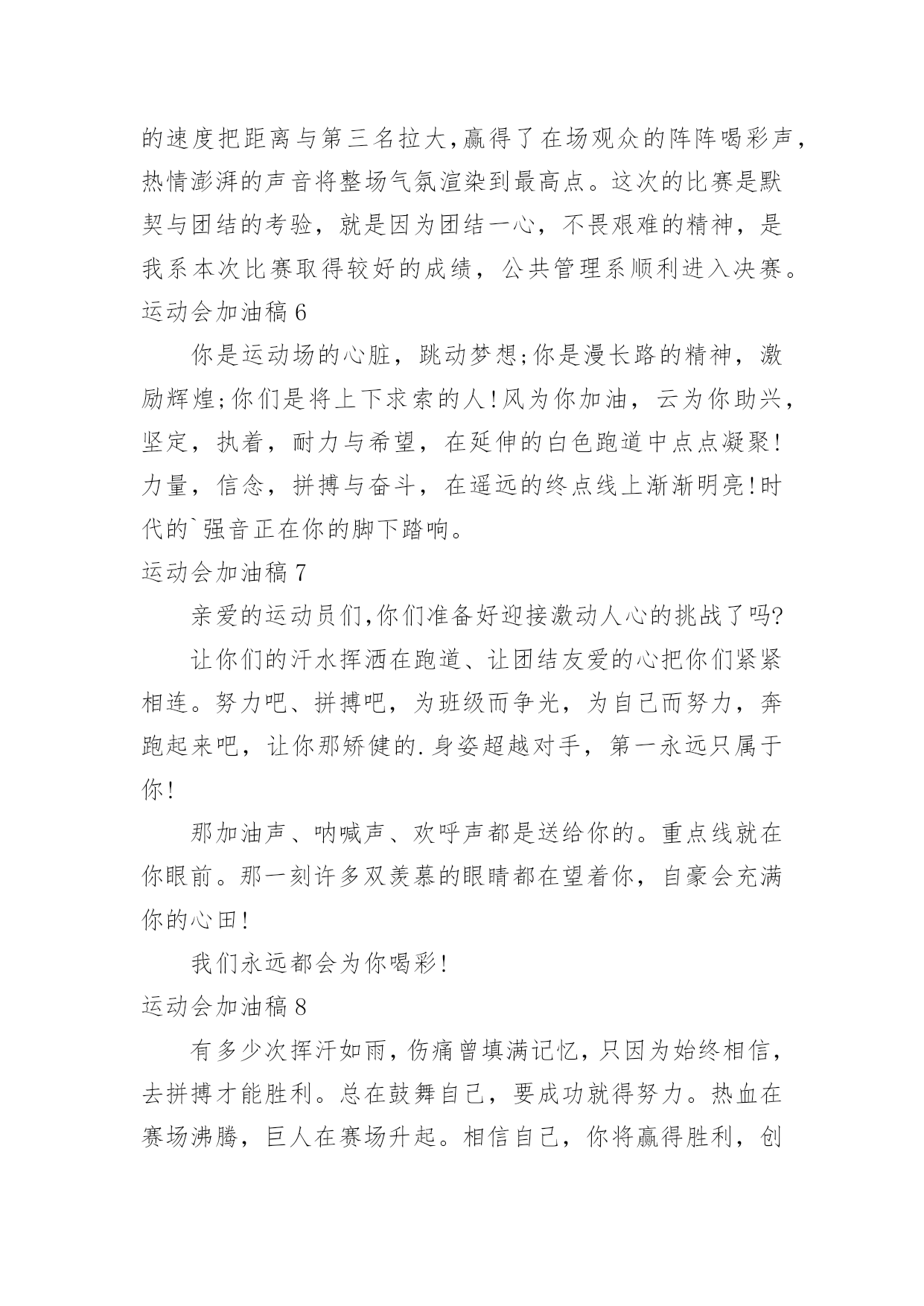 运动会加油稿运动会加油稿在现实社会中,接触并使用加油稿的人越来越多,加油稿可以强化人们的自我认知,给予人正向的激励作用。你写加油稿时总是无从下笔?以下是小编为大家整理的运动会加油稿,欢迎大家借鉴与参考,希望对大家有所帮助。运动会加油稿11、你用坚实的臂膀,撑起了一片天,你用坚实的臂膀,撑起了班级的荣耀,你用坚实的臂膀撑起了我们坚定的信念,在战场前告诉我们坚强坚强,祝你成功,加油!2、运动健将们,用你的实力,用你的精神,去开拓出,一片属于你的长跑天地!3、你们是我心中的太阳,在热度的考验下,你们渴望;在风度的辛意中,你们痴狂。亲爱的运动员们,愿你们冲破乌云,放出耀眼的光芒!4、枪声响起,冲刺向前,一马当先,咫尺天涯,永恒之巅,冲吧,向着未来冲刺,向着胜利冲刺。5、迎接自我,挑战自我,战胜自我!我们相信你们一定能行,加油吧,运动员!终点就在眼前!6、你像是头猎豹,疾驰在草原之中;你像一艘快艇,飞奔在海洋之中!7、你是运动场的心脏,跳动梦想,你是漫长路的精神,激励辉煌,风为你加油,水为你助兴,坚定,执着,耐力与希望,在环形跑道中点点凝聚!8、飞扬着青春,燃烧着热血,在百米赛道上向前冲吧!9、踏上跑道,是一种选择。离开起点,是一种勇气。驰骋赛场,是一种胜利。10、看,终点就在眼前;听,同学为你呼喊。鼓起勇气奋力向前,用你的荣誉带给我们希望。11、虽然你们在场上的时间很短暂,但你们的身影依然停留在人们的脑海里,因为你们是赛场上最可爱的人!12、无数个日日夜夜的辛劳,将在今日兑现。洒一把艰辛的汗水,继续抬起疲倦的脚步,爆发的一吼气贯长虹,继续向前,米的长征胜利在前,不论成功与否,你已曾经拥有,曾记否,在终点欢呼,震惊四周。13、胜负只在转瞬之间,不管结果怎么样,你们都走到了最后,你们都是最后的胜利者。14、你的汗水洒在跑道,浇灌着成功的花朵开放。你的欢笑飞扬在赛场,为班争光数你最棒。跑吧,追吧在这广阔的赛场上,你似骏马似离铉的箭。跑吧,追吧你比虎猛比豹强。15、借着奥运的东风迎着观众的.喝彩,我们运动起来,奔跑在的跑道上,让我们共同努力,奔跑奔跑,冲向胜利的终点。16、跑道,是你勇气的选择,驰骋赛场,获得胜利,是你实力的体现,是你的战场,在这里你所向披靡。17、这炎热的烈日居然如此美丽,你坚毅的目光向着终点,加力,冲刺,马上就是胜利。18、致失败者:倒下的时候,生命又怎能屹立!歪歪斜斜的身影,又怎耐的住风雨的洗礼。你若有一个不屈的灵魂,脚下才会有一方坚实的土地。昨天的失败已经过去,胜利不仅仅是一个美好的话题。19、环形的跑道一圈又一圈的坚持,毅力与精神活跃在会场上,湿透的衣衫,满头的大汗,无限追求奋力追赶,我们为你欢呼跳跃,我们为你骄傲!运动会加油稿2常记朝朝暮暮,天天不忘跑步。苦练为参赛,长征一里路,加速,加速!昂首挺胸阔步。努力吧,运动健将们,在终点,我们等着你。蔚蓝的天空下,有你矫健的身影热闹的操场上,有你坚定的步伐美丽的鲜花后有你辛勤的汗水我们的喝彩中,有你的.自豪与骄傲!体育健儿们,我们知道你们的辛勤我们了解你们的辛苦,加油吧!不论你是成功还是失败,我们都是你们坚强的后盾胜也爱你,败也爱你,我们永远支持你你们永远是“最特别的存在”。是种子就该有绿色的希望,是种子就该有金色的梦想不要躺在封闭的暖房,怕什么秋日薄薄的风霜。既然已走上了运动场,心里就不要多想跑道已洒满阳光,不要羞涩、不要紧张。听秋雁在空中为你歌唱快去拾取片片金黄,充满信心,就有希望。运动会加油稿31、快去追赶对手,快去夺取胜利!相信你会送给我们一个汗水浸湿的微笑!2、不为掌声的诠释,不为刻意的征服,仅有辛勤的汗水化作追求的脚步,心中坚定的信念,脚下沉稳的步伐,你用行动诉说着一个不变的真理。3、泥泞的路走过无数,累了,告诉自我:快了,再坚持一会儿;身上的伤流出血来,疼了,告诉自我:别哭,会好的;摔倒了,告诉自我:快爬起来,世上很少有坦途。4、萧瑟的秋风,挡不住你们破竹的锐气,广阔的绿茵场,是为你们搭建的舞台。张扬吧,年轻的心,我们将为你永远喝彩!5、运动场上有你们的飒爽英姿,运动场上有你们拼搏的身影,面对漫漫的征程,你没有畏惧和退缩!6、环形的跑道,一圈又一圈的坚持,毅力与精神活跃在会场上,湿透的衣衫,满头的'大汗,无限追求。7、人生的路,有坦途,也有坎坷,做过的岁月,有欢笑,也有苦涩,泪水告诉我一个跌倒的故事,汗水使我多了一份沉重,几多成熟。理想毕竟不一样于现实,失败是生活的一部分,谁也无法选择,无法抗拒,人生要自己去拼搏,去奋斗,在风雨中百折不饶勇往直前。流泪不是失落,徘徊不是迷惑,成功属于那些战胜失败,坚持不懈,勇于追求梦想的人。8、你是运动场的心脏,跳动梦想;你是漫长路的精神,激励辉煌;你们是将上下求索的人!风为你加油,云为你助兴,坚定,执着,耐力与希望,在