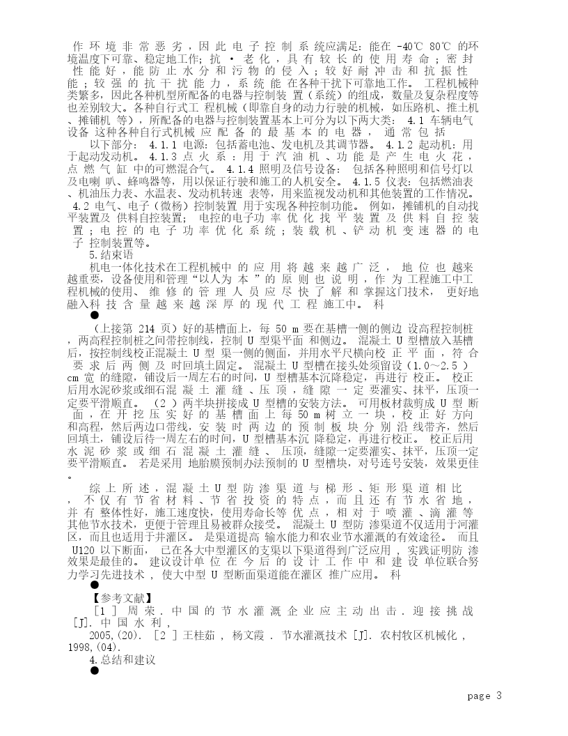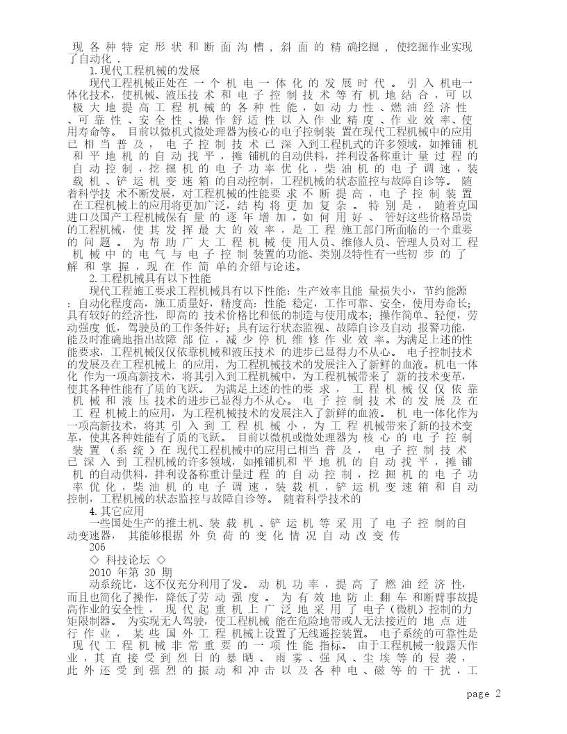 本文由workcw04贡献pdf文档可能在WAP端浏览体验不佳。建议您优先选择TXT,或下载源文件到本机查看。2010年第30期◇科技论坛◇机电一体化技术在工程机械中的应用史凤兰(长春城市开发集团吉林【摘要】文章论述了现代工程功能的发展,工程机械的性能。【关键词】机电一体化技术;工程机械;应用长春130000)】0.前言现代科学技术的不断发展,极大地扒动了不同学科学的交叉与渗透,导致了工程领域的技术革命与改造。在机械工程领域,由于微电子技术和计算机技术的迅速发展及其向机械工业的渗透所形成的机电一体化,使机械工业的技术结构、产品机构、功能与构成、生产方式及管理体系发生了巨大变化,使工业生产由“机械电气化”迈入了“机电一体化”为特征的发殿阶段。不断发展,对工程机械的性能要求不断提高,电子(微机)控制装置在工程机械上的应用将更加广泛,结构晚霞更加复杂。3.机电一体化在工程机械中的运用3.1机电一体化和工程机械的关系现代工程机械正处在一个机电一体化的发展时代。引入机电一体化技术,使机械、液压技术和电子控制技术等有机的结合,可以极大地提高了工程机械的各种性能,如动力性、燃油经济性、可靠性、安全性、操作舒适性以及作业精度、作业效率、使用寿命等。3.2机电一体化对工程机械功能的改进目前工程机械的电子(微机)控制系统主要用以实现台下功能:3.2.1电子监控、自动报警及故障自诊即对工程机械的发动机、传动系统、工作装置、制动系统和液压系统等的动行状态监控工作中一旦出现异常现象,能动报警并准确地指出故障部位,从而改善驾驶员的工作条件提高机器的工作效率,简化设备维护检查工作降低使用维修费用,缩短停机维修时间,延长设备的使用寿命。3.2.2节能降耗,提高生产率传统工程机械的能量利用率较低,例如液压挖掘机的燃料能量利用率仅为20%左右,如此低的能量利用率迫使工程机械化的发展必需品着眼于节能。日本小松公司挖掘机所采用的新型节能控制器(OLLS系统),具有良好的节能效果燃料可节省23%;日本日立公司挖掘机节能控制系统采用了卡特电子效率控制系统,通过对发动机和泵的综合控制,使功率的利用率可达98%,同时生产率也大大提高。3.2.3柴油机的控制如电子调速成器、电子油门控制装置、自动停机装置、自动升温控制装置等。3.2.4提高作业精度为保证成品料的级配精度,现代沥青及水泥混凝土拌和设备广泛采用了微机控制的电子称量系统,并使计量过程实现了自动化。自动找平系统的应用,使沥青混凝土摊铺机的施工质量有了较大的提高,路面的平整度可达到0。127MM/3M。采用超声波技术的自动供料系统,使沥青混凝土摊铺机的供料实现了自动调节,进一步提高了摊铺质量。推土机铲刀、平地机刮刀、铲运机铲斗刀刃的电子(微机)控制不仅提高了作业精度和作业效率,而且也减轻了操作人员的劳动强度。3.2.5作业过程的自动化或半自动化工程机械实现自动化或半自动化控制,可以减轻操作者的劳动强度,提高生产率,并减少因操作者的经验不足,对作业精度的影响。例如,日本三菱公司的挖掘机设有挖掘轨迹控制系统,操作者在控制板上设定耗铲斗运动轨迹的形状后,微机控制系统能够根据各种角度传感器的信号,自动控制动臂、斗杆和铲刀的运动,实page1现各种特定形状和断面沟槽,斜面的精确挖掘,使挖掘作业实现了自动化.1.现代工程机械的发展现代工程机械正处在一个机电一体化的发展时代。引入机电一体化技术,使机械、液压技术和电子控制技术等有机地结合,可以极大地提高工程机械的各种性能,如动力性、燃油经济性、可靠性、安全性、操作舒适性以入作业精度、作业效率、使用寿命等。目前以微机式微处理器为核心的电子控制装置在现代工程机械中的应用已相当普及,电子控制技术已深入到工程机式的许多领域,如摊铺机和平地机的自动找平,摊铺机的自动供料,拌利设备称重计量过程的自动控制,挖掘机的电子功率优化,柴油机的电子调速,装载机、铲运机变速箱的自动控制,工程机械的状态监控与故障自诊等。随着科学技术不断发展,对工程机械的性能要求不断提高,电子控制装置在工程机械上的应用将更加广泛,结构将更加复杂。特别是,随着克国进口及国产工程机械保有量的逐年增加,如何用好、管好这些价格昂贵的工程机械,使其发挥最大的效率,是工程施工部门所面临的一个重要的问题。为帮助广大工程机械使用人员、维修人员、管理人员对工程机械中的电气与电子控制装置的功能、类别及特性有一些初步的了解和掌握,现在作简单的介绍与论述。2.工程机械具有以下性能现代工程施工要求工程机械具有以下性能:生产效率且能量损失小,节约能源:自动化程度高,施工质量好,精度高:性能稳定,工作可靠、安