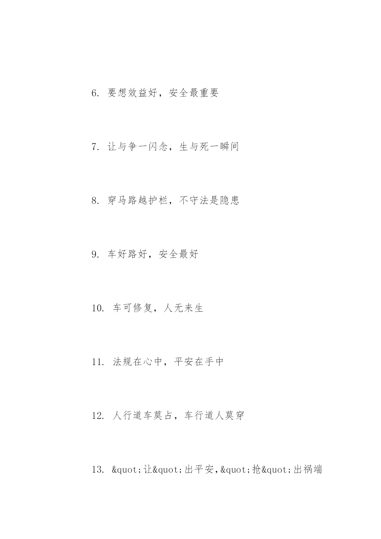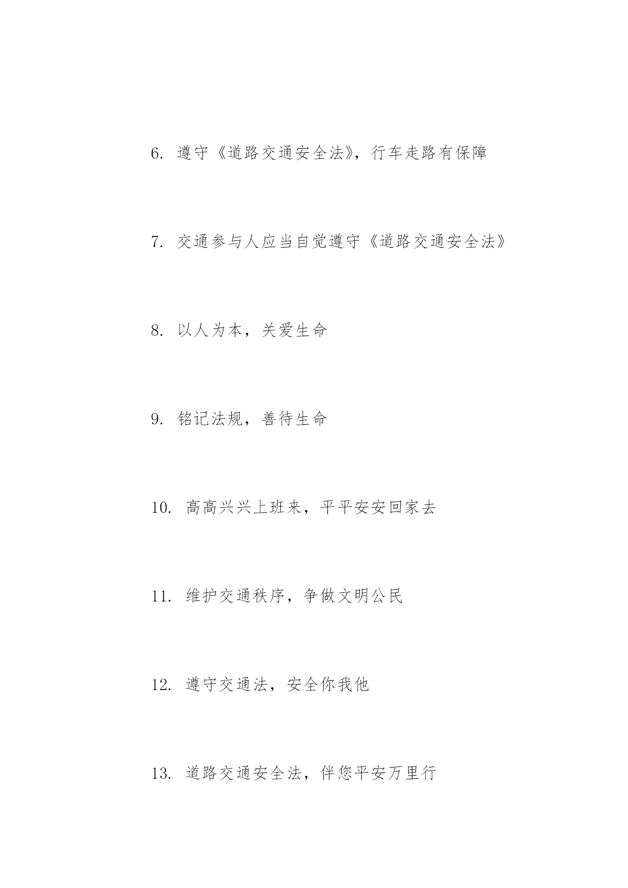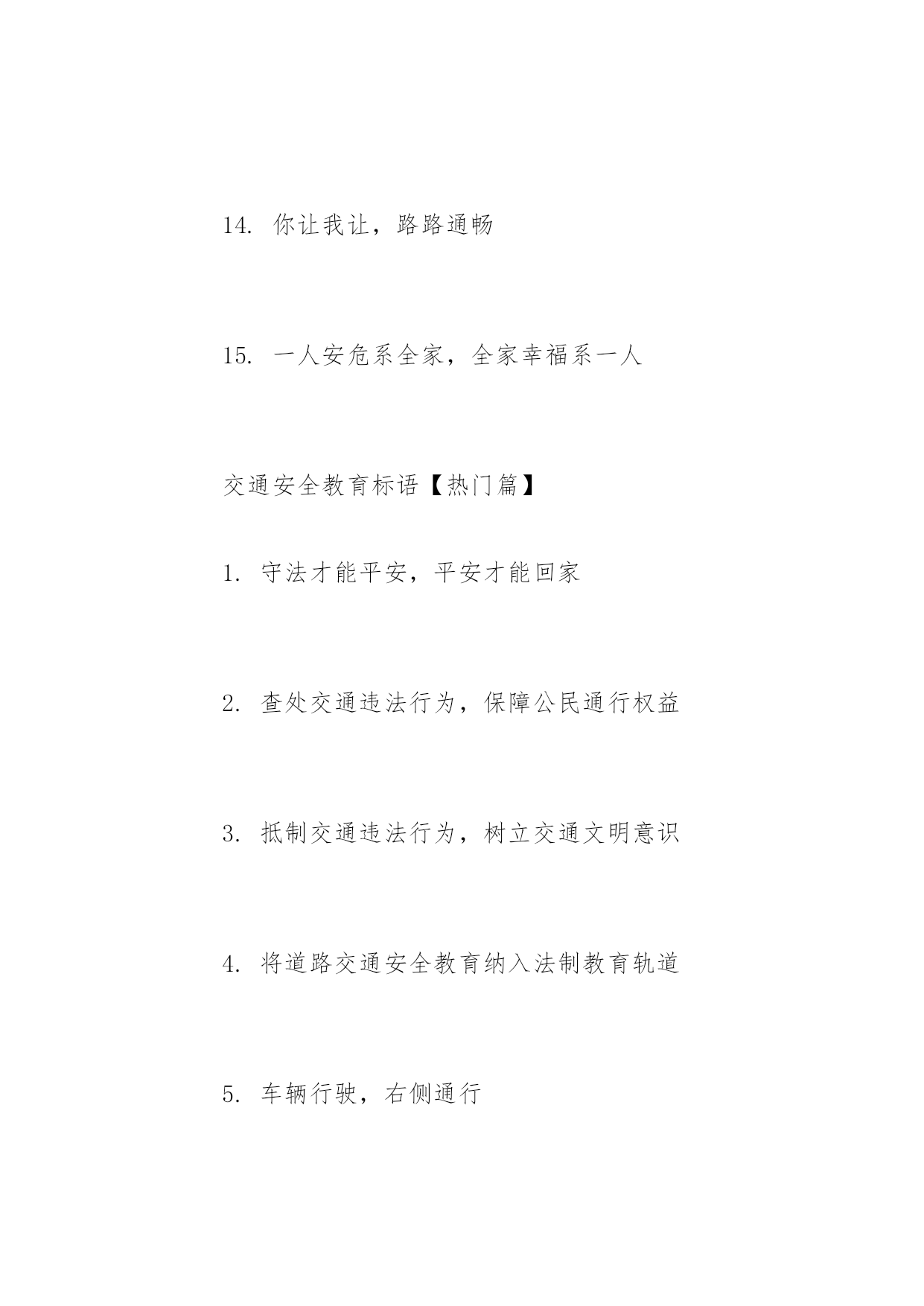 交通安全教育标语交通安全教育标语抵制交通违法行为,树立交通文明意识。以下是小编精心整理的交通安全教育标语,希望大家喜欢!交通安全教育标语【精选篇】1.肇事逃逸将终生禁止驾车2.良药苦口利于病,交通法规利于行3.安全与守法同在,事故与违法相随4.彼此让一让,安全有保障5.严是爱,松是害,发生事故祸三代6.要想效益好,安全最重要7.让与争一闪念,生与死一瞬间8.穿马路越护栏,不守法是隐患9.车好路好,安全最好10.车可修复,人无来生11.法规在心中,平安在手中12.人行道车莫占,车行道人莫穿13."让"出平安,"抢"出祸端14.你让我让,路路通畅15.一人安危系全家,全家幸福系一人交通安全教育标语【热门篇】1.守法才能平安,平安才能回家2.查处交通违法行为,保障公民通行权益3.抵制交通违法行为,树立交通文明意识4.将道路交通安全教育纳入法制教育轨道5.车辆行驶,右侧通行6.遵章守法,各行其道7.行人要走人行道8.行人横过道路应走人行横道或过街设施9.设计时速低于七十公里的机动车,不得进入高速公路10.驾驶人乘车人请按规定系安全带11.发生事故应保护现场,抢救受伤,及时报警12.不讲卫生要生病,不讲安全要送命13.运输单位有消除机动车安全隐患的责任14.违法超载的'重罚,酒后驾车害人害己15.拼装车报废车实行强制报废交通安全教育标语【经典篇】1.树立交通文明意识,自觉维护交通秩序2.人生美好,步步小心!维护交通安全,关爱生命久远3.学习道路交通安全法,提高公民交通安全意识4.增强公民守法意识,保障道路交通有序安全畅通5.道路交通安全法是您的生命之友6.遵守《道路交通安全法》,行车走路有保障7.交通参与人应当自觉遵守《道路交通安全法》8.以人为本,关爱生命9.铭记法规,善待生命10.高高兴兴上班来,平平安安回家去11.维护交通秩序,争做文明公民12.遵守交通法,安全你我他13.道路交通安全法,伴您平安万里行14.守法才能平安,平安才能回家15.抵制交通违法行为,树立交通文明意识16.车辆行驶,右侧通行,遵章守法,各行其道17.驾驶人乘车人请按规定系安全带18.发生事故应保护现场,抢救受伤,及时报警19.违法超载的重罚,酒后驾车害人害己20.良药苦口利于病,交通法规利于行
