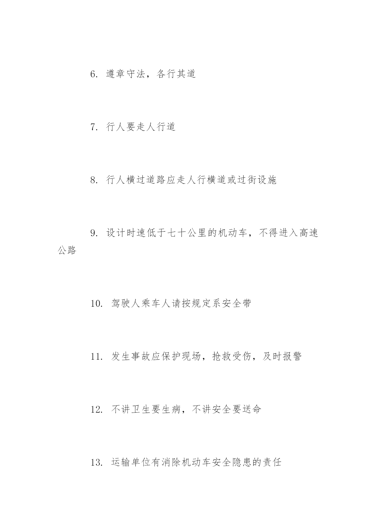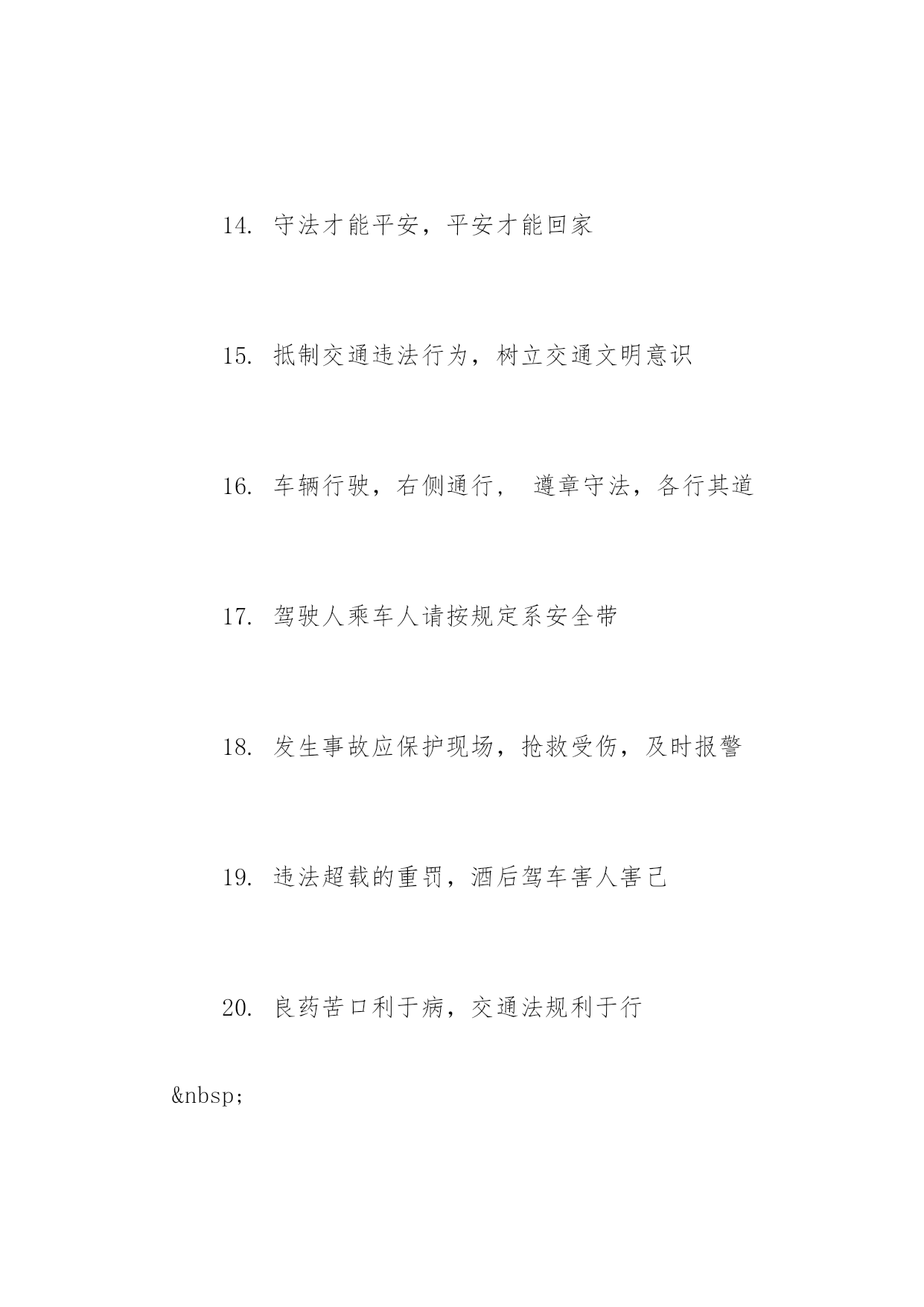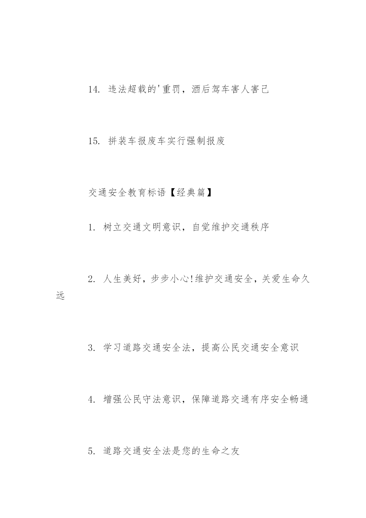 交通安全教育标语交通安全教育标语抵制交通违法行为,树立交通文明意识。以下是小编精心整理的交通安全教育标语,希望大家喜欢!交通安全教育标语【精选篇】1.肇事逃逸将终生禁止驾车2.良药苦口利于病,交通法规利于行3.安全与守法同在,事故与违法相随4.彼此让一让,安全有保障5.严是爱,松是害,发生事故祸三代6.要想效益好,安全最重要7.让与争一闪念,生与死一瞬间8.穿马路越护栏,不守法是隐患9.车好路好,安全最好10.车可修复,人无来生11.法规在心中,平安在手中12.人行道车莫占,车行道人莫穿13."让"出平安,"抢"出祸端14.你让我让,路路通畅15.一人安危系全家,全家幸福系一人交通安全教育标语【热门篇】1.守法才能平安,平安才能回家2.查处交通违法行为,保障公民通行权益3.抵制交通违法行为,树立交通文明意识4.将道路交通安全教育纳入法制教育轨道5.车辆行驶,右侧通行6.遵章守法,各行其道7.行人要走人行道8.行人横过道路应走人行横道或过街设施9.设计时速低于七十公里的机动车,不得进入高速公路10.驾驶人乘车人请按规定系安全带11.发生事故应保护现场,抢救受伤,及时报警12.不讲卫生要生病,不讲安全要送命13.运输单位有消除机动车安全隐患的责任14.违法超载的'重罚,酒后驾车害人害己15.拼装车报废车实行强制报废交通安全教育标语【经典篇】1.树立交通文明意识,自觉维护交通秩序2.人生美好,步步小心!维护交通安全,关爱生命久远3.学习道路交通安全法,提高公民交通安全意识4.增强公民守法意识,保障道路交通有序安全畅通5.道路交通安全法是您的生命之友6.遵守《道路交通安全法》,行车走路有保障7.交通参与人应当自觉遵守《道路交通安全法》8.以人为本,关爱生命9.铭记法规,善待生命10.高高兴兴上班来,平平安安回家去11.维护交通秩序,争做文明公民12.遵守交通法,安全你我他13.道路交通安全法,伴您平安万里行14.守法才能平安,平安才能回家15.抵制交通违法行为,树立交通文明意识16.车辆行驶,右侧通行,遵章守法,各行其道17.驾驶人乘车人请按规定系安全带18.发生事故应保护现场,抢救受伤,及时报警19.违法超载的重罚,酒后驾车害人害己20.良药苦口利于病,交通法规利于行