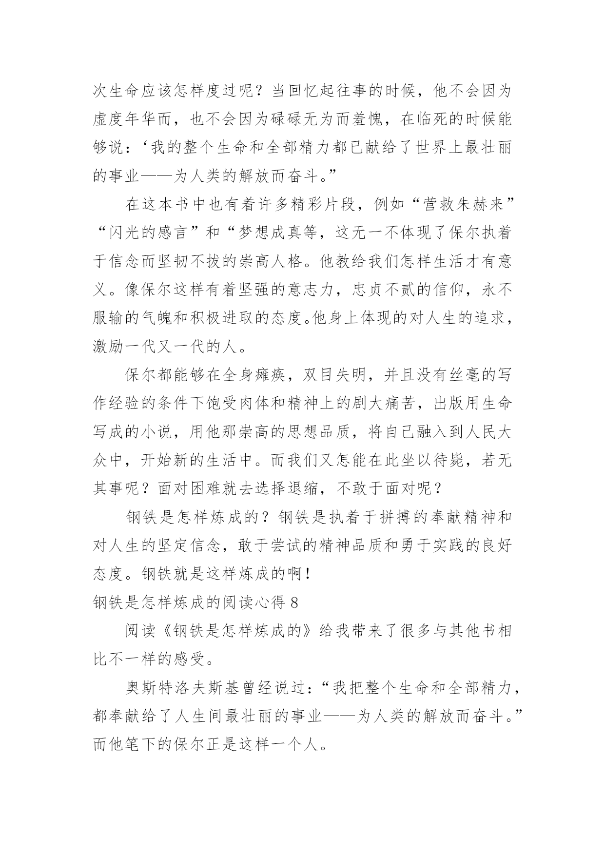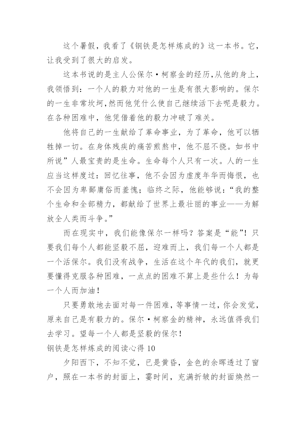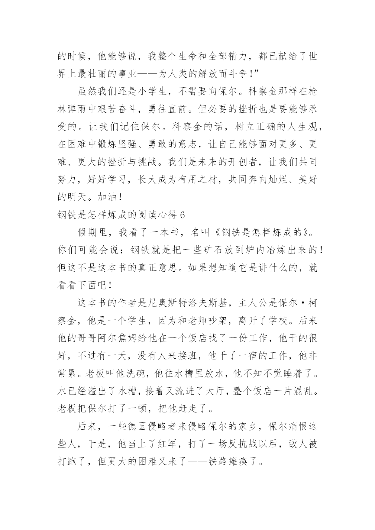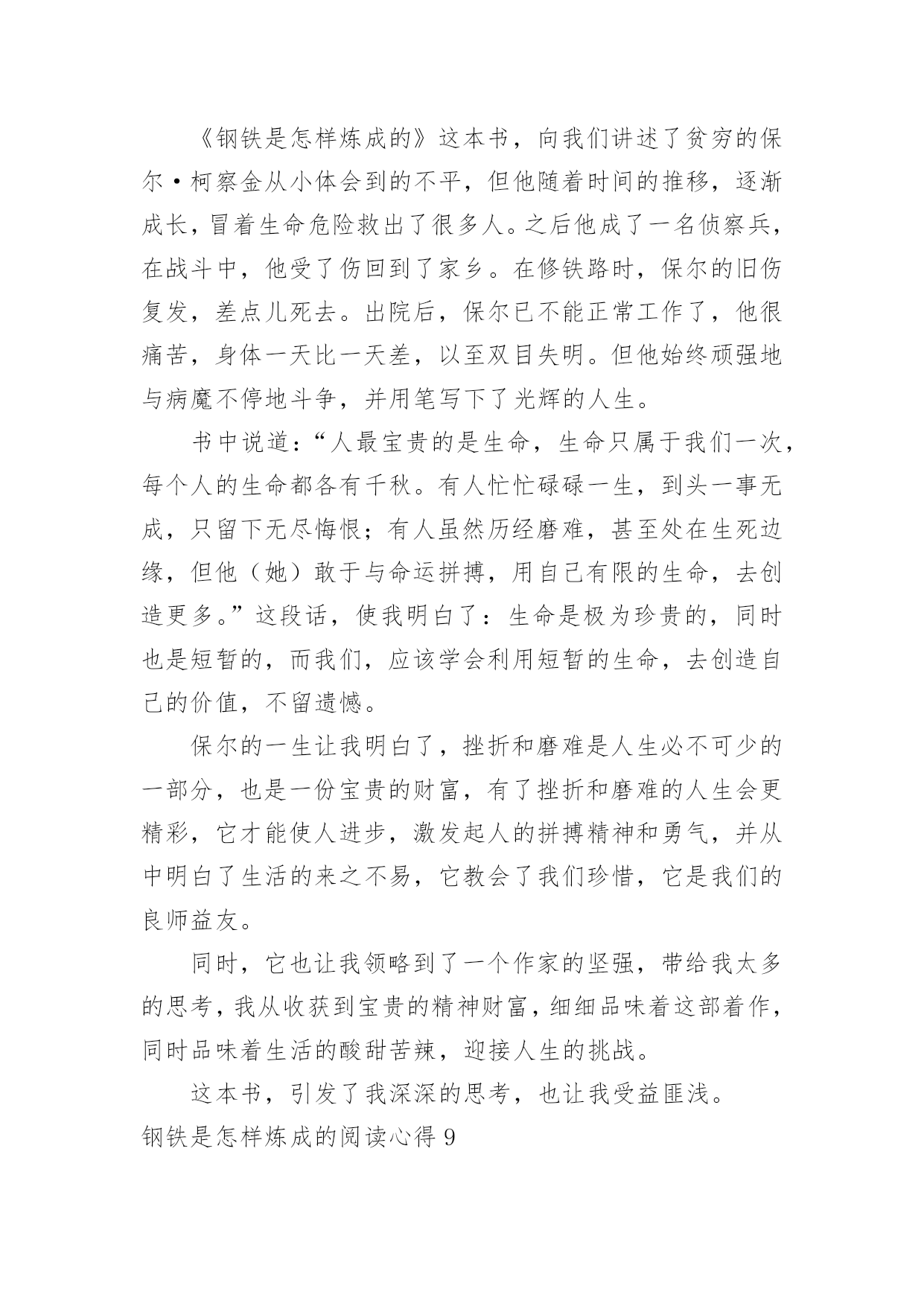 钢铁是怎样炼成的阅读心得钢铁是怎样炼成的阅读心得当在某些事情上我们有很深的体会时,写一篇心得体会,记录下来,从而不断地丰富我们的思想。那么好的心得体会是什么样的呢?以下是小编为大家收集的钢铁是怎样炼成的阅读心得,希望对大家有所帮助。钢铁是怎样炼成的阅读心得1《钢铁是怎样炼成的》这本书,相信大家并不陌生。当我真正用心去读这本书时,才感到了主人公保尔·柯察金的伟大,他那对革命事业执着追求、毫不畏惧地面对一切磨难的可贵精神,让我产生了崇敬之情。看完小说后,我不禁思考起了人生,我们的一生要怎样度过才算完美人生呢?书中的保尔说过:“人最宝贵的东西是生命。生命属于我们只有一次。一个人的生命应当这样度过:当他回首往事的时候,不因虚度年华而悔恨,不因碌碌无为而羞耻——这样,在临死前他就能够说:“‘我整个生命和全部精力,都已献给了世界上最壮丽的事业——为人类的解放而斗争。’”我在想,是什么让保尔不知疲倦地工作,以致全身瘫痪,双目失明却还坚持写作?也许正是完美人生哲理和信念激励着他。和保尔相比较,我们有着健康的体魄、良好的学习条件,正因为这样我们才更要奋发努力学习不虚度年华。可能就因为我们拥有太多,才不容易感觉到它们的宝贵。当我们不再有精力和强健的体魄时,才会真正后悔。我想想自己,繁重的学习任务和班级工作有时会令我感到疲倦。虽然我用心对待,但有时也抱怨生活好累。我希望自己成为一个轻松愉快,无忧无虑的女孩。而当我读完这本书后我才认识了生活的意义。生命之路上,有人散步,有人要做骏马。我选择了后者。我发现,我的忧虑、困惑,源于这不懈的追求。我透过保尔的精神去体会人生时,我才感到,我的生活是充实的,应该自豪!《钢铁是怎样炼成的》是一本好书。它让我明白,面对生活我们要奋力前进、使回忆留下更多闪光点!钢铁是怎样炼成的阅读心得2人生,就像是一条坎坷弯曲的路,也许因为大风肆意而尘土飞扬让你迷了眼,也许因为大雨滂沱而泥泞不堪使你不知所措。这就是我在这本书中悟出的道理。保尔·柯察金从一个不懂事的少年,成为刚毅坚强的布尔什维克战士,他从小所读的学校老师因一点小事而把他叫出教室,经历了多少风风雨雨。但他后来在工作中还是得到了不少人的帮助,使他成为了一名善良又坚强的小伙子。在保尔·柯察金身上我学到了很多东西。一是坚强。坚强,并不是很容易做到的,要想获得成功,除了坚持,还有有力量去面对成功道路上的各种阻碍,这就需要坚强陪护。如果一个人拥有了坚强,那他就已经往成功道路上行驶了。老实说,像我这样,因为一点小事儿哭泣,比成不了大业。二是善良。善良在与人与事物的相处中,是非常重要的,每个人怀着一颗善良而不是黑暗的心,就能救助成千上万遇难的人民。现在回忆之前我的行为,还真跟善良背道而驰了。我抄作业习题很快,同桌就借我的作业本去抄题,但我并没有答应,就算同桌如何请求我,我都死活不给借,最后我还骂了他。现在评价当时的我,真狠心,一点都不想保尔·柯察金那样的善良。在《钢铁是怎样炼成的》这本书中,学到的不只是只有坚强跟善良,还有很多很多。一个人在人生的道路上要经历无数次困难的洗礼,等积累到一定经验的时候,走向成功时,才能应对自如,才能所向披靡。钢铁是怎样炼成的阅读心得3这本书主要讲了发生在俄国的一个故事,当时的俄国社会很动乱,发生了内战。本书的主人公保尔就是在这样的环境下成长的。主人公保尔小时候很调皮,被学校开除了。之后,他到大堂里学习做饭,但是那里的老板很凶,动不动就打保尔,而且给的工钱很少,保尔无法忍受这种折磨就逃走了。回到家里保尔看到叛乱军在抢自己家里的东西,他很想赶走他们,但是保尔感觉到自己的力量太小了,根本不是他们的对手,只能看着他们把自己家里的东西抢走。保尔很苦恼,怎样才能保护好自己的家庭呢?于是他就报名参军了,成为了一名军人。在一次战斗中,保尔被一颗炮弹炸伤了脚,当时他的脚上全是鲜血,但是他没有后退,用绷带扎好了伤口继续战斗。不久,他肚子又中了一颗子弹,最后,他被抬回了医院。经过一段时间的修养,保尔的上终于好了,于是他有继续参加战斗,开始了自己新的生活。人的一生总是充满各种各样的困难和挫折,没有谁的一生会一帆风顺的,保尔的成长故事让我明白了在困难与挫折面前不要屈服,不要轻言放弃,要坚持下去,才能做好每一件事情。钢铁是怎样炼成的阅读心得4”人最宝贵的是生命,生命属于每个人只有一次。人的一生应当这样度过,回首往事,不因虚度年华而悔恨,也不因碌碌无为而羞愧……“这句话曾经鼓舞了多少青少年为革命事业奉献一生。最近有幸读了奥斯特洛夫斯基的《钢铁是怎样炼成的》。让我感受到了坚强的保尔面对悲惨的人生,仍对生命的执着,对生活的渴求对革命胜利的必胜信念。他十几岁就立足杀场,英勇杀敌,热爱祖国,在战场上,他被砍了好几刀都大难不死,为什么仍然是毅力。年轻的他后来疾病缠身,但他仍不停地忘我工作,有