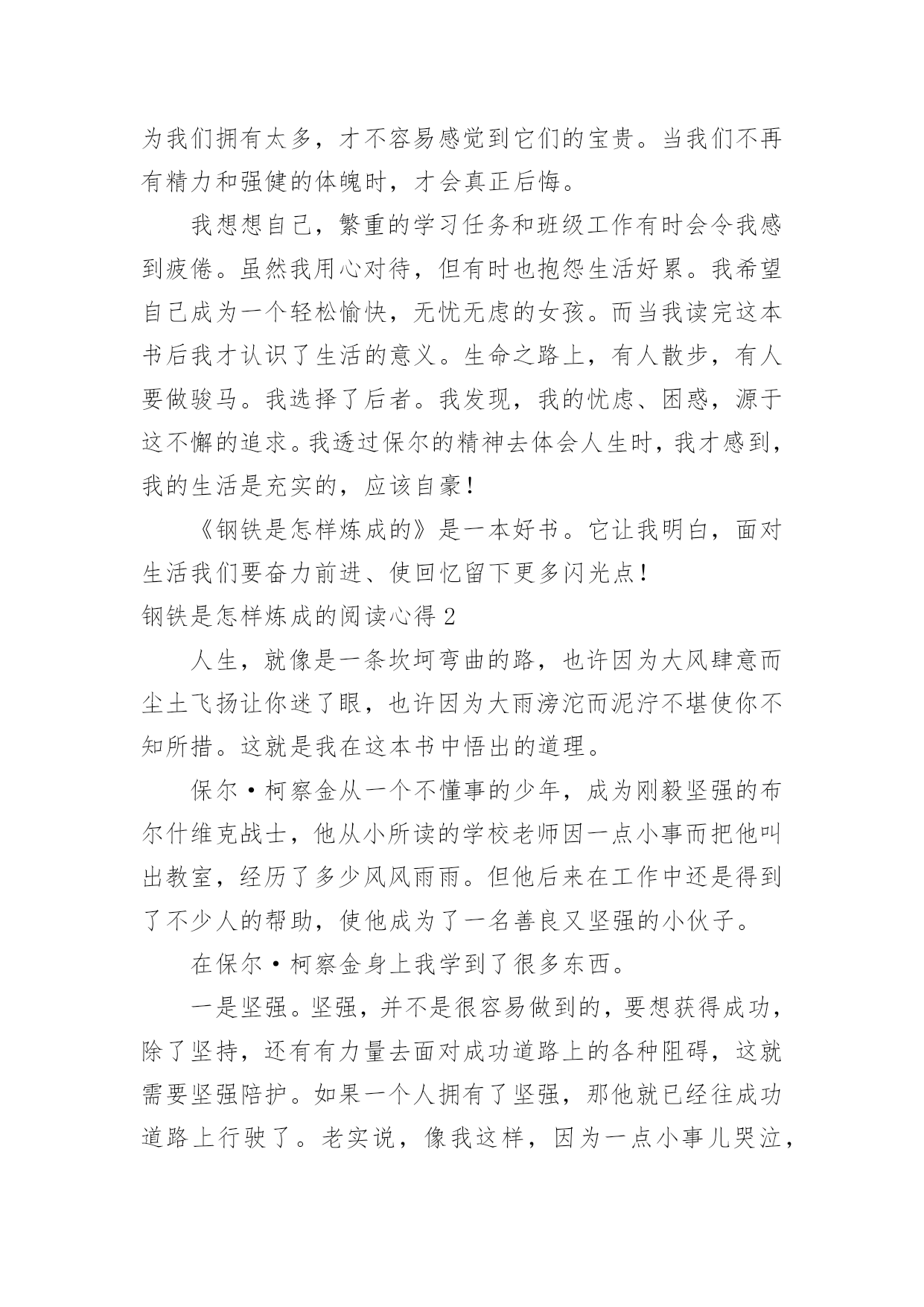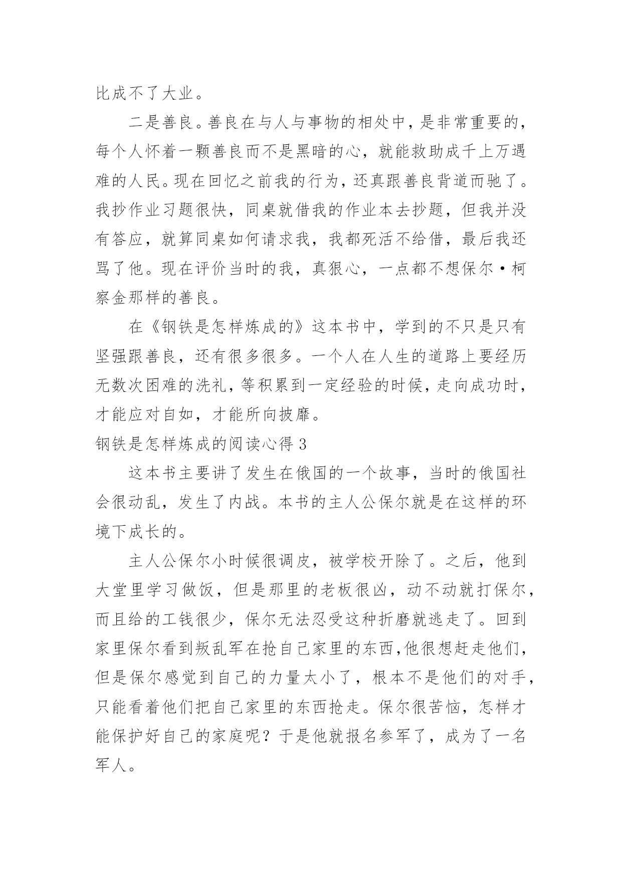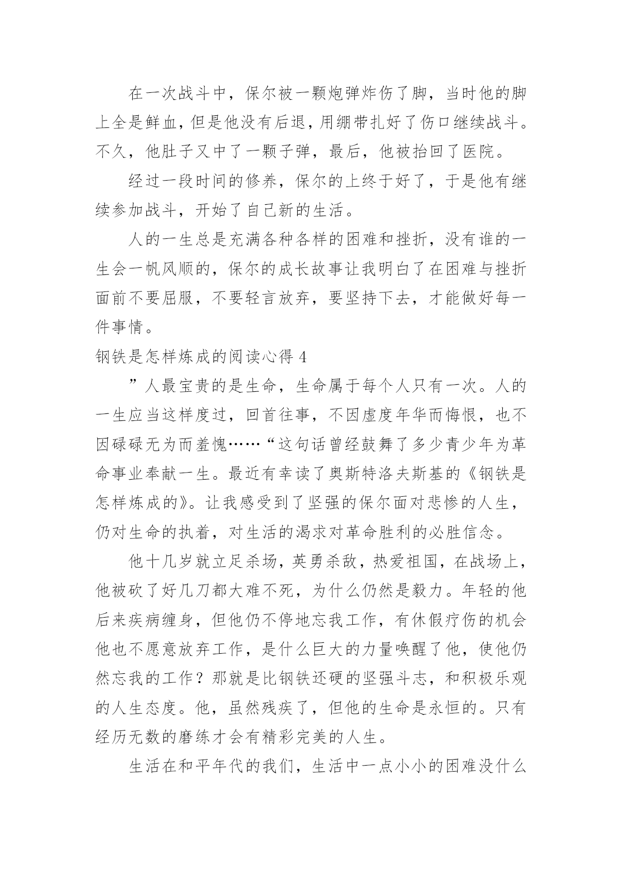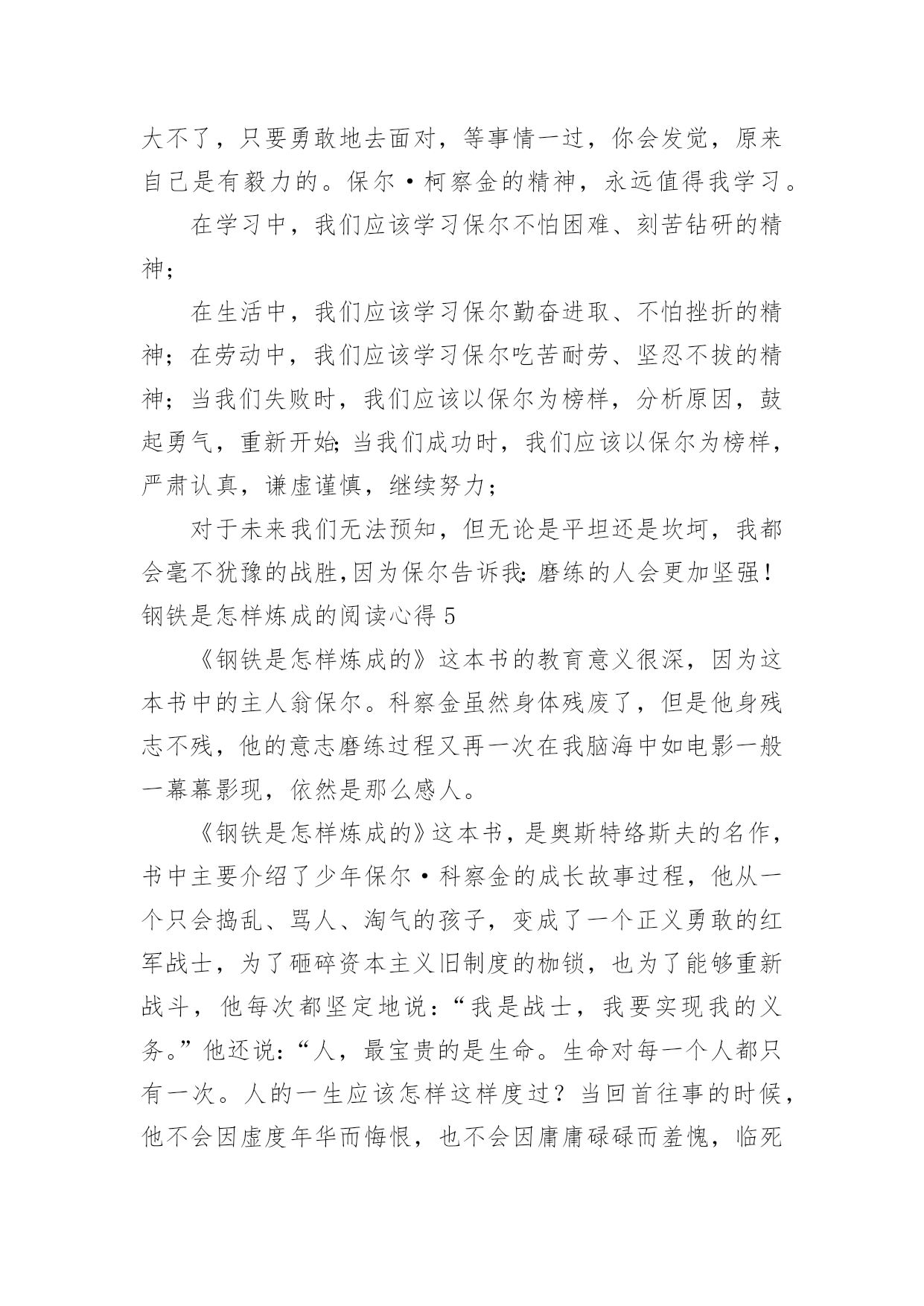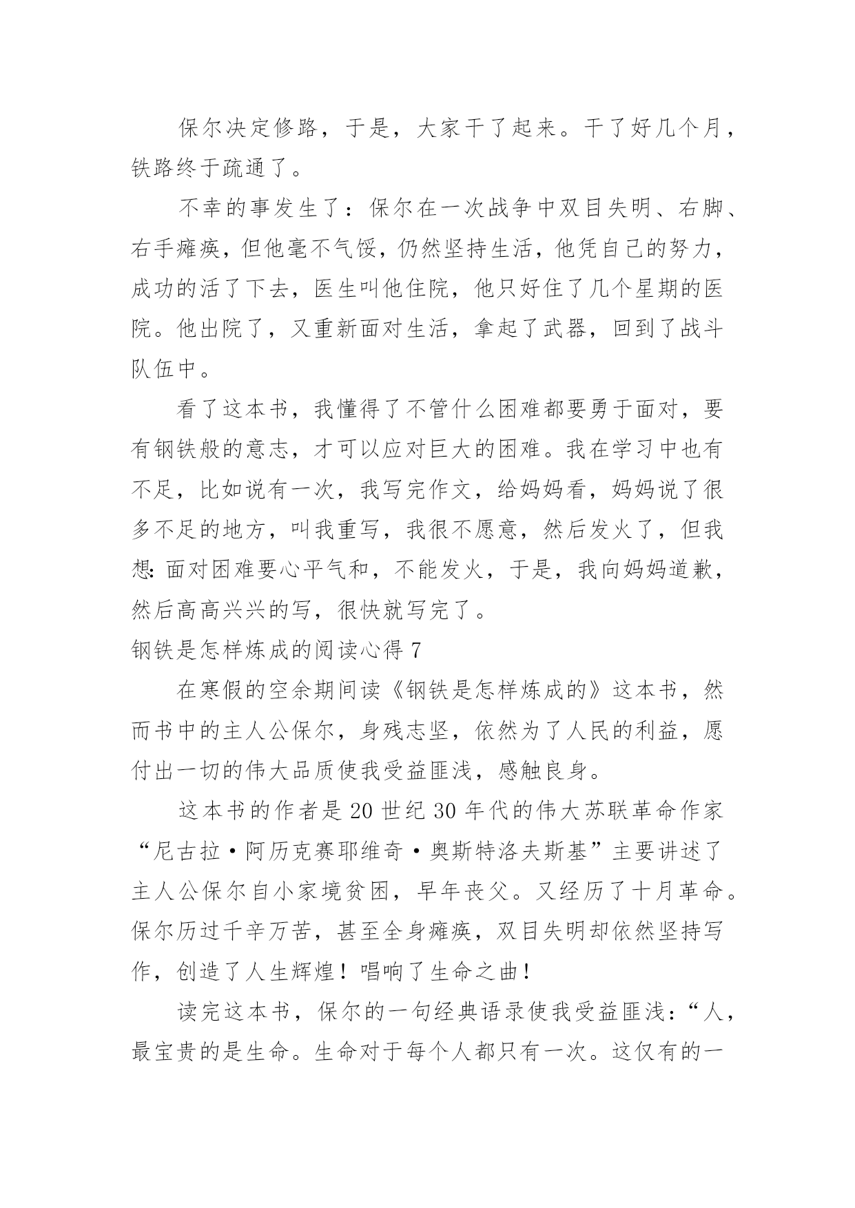 钢铁是怎样炼成的阅读心得钢铁是怎样炼成的阅读心得当在某些事情上我们有很深的体会时,写一篇心得体会,记录下来,从而不断地丰富我们的思想。那么好的心得体会是什么样的呢?以下是小编为大家收集的钢铁是怎样炼成的阅读心得,希望对大家有所帮助。钢铁是怎样炼成的阅读心得1《钢铁是怎样炼成的》这本书,相信大家并不陌生。当我真正用心去读这本书时,才感到了主人公保尔·柯察金的伟大,他那对革命事业执着追求、毫不畏惧地面对一切磨难的可贵精神,让我产生了崇敬之情。看完小说后,我不禁思考起了人生,我们的一生要怎样度过才算完美人生呢?书中的保尔说过:“人最宝贵的东西是生命。生命属于我们只有一次。一个人的生命应当这样度过:当他回首往事的时候,不因虚度年华而悔恨,不因碌碌无为而羞耻——这样,在临死前他就能够说:“‘我整个生命和全部精力,都已献给了世界上最壮丽的事业——为人类的解放而斗争。’”我在想,是什么让保尔不知疲倦地工作,以致全身瘫痪,双目失明却还坚持写作?也许正是完美人生哲理和信念激励着他。和保尔相比较,我们有着健康的体魄、良好的学习条件,正因为这样我们才更要奋发努力学习不虚度年华。可能就因为我们拥有太多,才不容易感觉到它们的宝贵。当我们不再有精力和强健的体魄时,才会真正后悔。我想想自己,繁重的学习任务和班级工作有时会令我感到疲倦。虽然我用心对待,但有时也抱怨生活好累。我希望自己成为一个轻松愉快,无忧无虑的女孩。而当我读完这本书后我才认识了生活的意义。生命之路上,有人散步,有人要做骏马。我选择了后者。我发现,我的忧虑、困惑,源于这不懈的追求。我透过保尔的精神去体会人生时,我才感到,我的生活是充实的,应该自豪!《钢铁是怎样炼成的》是一本好书。它让我明白,面对生活我们要奋力前进、使回忆留下更多闪光点!钢铁是怎样炼成的阅读心得2人生,就像是一条坎坷弯曲的路,也许因为大风肆意而尘土飞扬让你迷了眼,也许因为大雨滂沱而泥泞不堪使你不知所措。这就是我在这本书中悟出的道理。保尔·柯察金从一个不懂事的少年,成为刚毅坚强的布尔什维克战士,他从小所读的学校老师因一点小事而把他叫出教室,经历了多少风风雨雨。但他后来在工作中还是得到了不少人的帮助,使他成为了一名善良又坚强的小伙子。在保尔·柯察金身上我学到了很多东西。一是坚强。坚强,并不是很容易做到的,要想获得成功,除了坚持,还有有力量去面对成功道路上的各种阻碍,这就需要坚强陪护。如果一个人拥有了坚强,那他就已经往成功道路上行驶了。老实说,像我这样,因为一点小事儿哭泣,比成不了大业。二是善良。善良在与人与事物的相处中,是非常重要的,每个人怀着一颗善良而不是黑暗的心,就能救助成千上万遇难的人民。现在回忆之前我的行为,还真跟善良背道而驰了。我抄作业习题很快,同桌就借我的作业本去抄题,但我并没有答应,就算同桌如何请求我,我都死活不给借,最后我还骂了他。现在评价当时的我,真狠心,一点都不想保尔·柯察金那样的善良。在《钢铁是怎样炼成的》这本书中,学到的不只是只有坚强跟善良,还有很多很多。一个人在人生的道路上要经历无数次困难的洗礼,等积累到一定经验的时候,走向成功时,才能应对自如,才能所向披靡。钢铁是怎样炼成的阅读心得3这本书主要讲了发生在俄国的一个故事,当时的俄国社会很动乱,发生了内战。本书的主人公保尔就是在这样的环境下成长的。主人公保尔小时候很调皮,被学校开除了。之后,他到大堂里学习做饭,但是那里的老板很凶,动不动就打保尔,而且给的工钱很少,保尔无法忍受这种折磨就逃走了。回到家里保尔看到叛乱军在抢自己家里的东西,他很想赶走他们,但是保尔感觉到自己的力量太小了,根本不是他们的对手,只能看着他们把自己家里的东西抢走。保尔很苦恼,怎样才能保护好自己的家庭呢?于是他就报名参军了,成为了一名军人。在一次战斗中,保尔被一颗炮弹炸伤了脚,当时他的脚上全是鲜血,但是他没有后退,用绷带扎好了伤口继续战斗。不久,他肚子又中了一颗子弹,最后,他被抬回了医院。经过一段时间的修养,保尔的上终于好了,于是他有继续参加战斗,开始了自己新的生活。人的一生总是充满各种各样的困难和挫折,没有谁的一生会一帆风顺的,保尔的成长故事让我明白了在困难与挫折面前不要屈服,不要轻言放弃,要坚持下去,才能做好每一件事情。钢铁是怎样炼成的阅读心得4”人最宝贵的是生命,生命属于每个人只有一次。人的一生应当这样度过,回首往事,不因虚度年华而悔恨,也不因碌碌无为而羞愧……“这句话曾经鼓舞了多少青少年为革命事业奉献一生。最近有幸读了奥斯特洛夫斯基的《钢铁是怎样炼成的》。让我感受到了坚强的保尔面对悲惨的人生,仍对生命的执着,对生活的渴求对革命胜利的必胜信念。他十几岁就立足杀场,英勇杀敌,热爱祖国,在战场上,他被砍了好几刀都大难不死,为什么仍然是毅力。年轻的他后来疾病缠身,但他仍不停地忘我工作,有