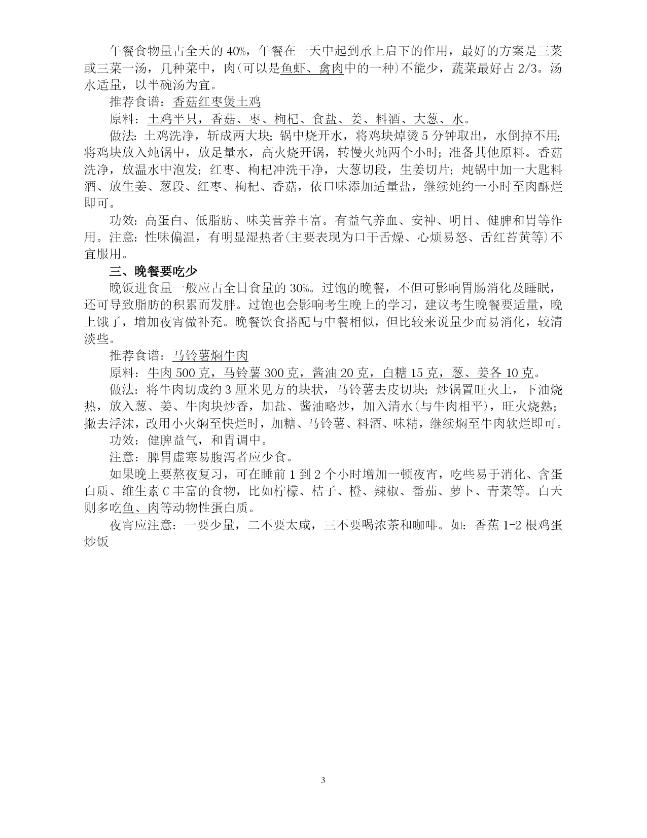 中考前饮食注意事项1、注意饮食护眼专家表示,孩子在昏黄的灯光下苦战一夜容易使眼肌疲劳、视力下降。营养专家指出,维生素A及维生素B对预防视力减弱有一定结果,维生素A可调节视网膜感光物质——视紫的合成,能提高熬夜的人对昏暗光线的适应力,防止视觉疲劳。所以,要多吃胡萝卜、韭菜、鳗鱼等富含维生素A的食物,以及富含维生素B的瘦肉、鱼肉、猪肝等动物性食品。2、注意饮食清淡专家称,熬夜时晚餐应多吃些蔬菜、水果等清淡的食物,对熬夜时的健康有帮助。以下是一些适合的水果:适量的苹果、胡萝卜、菠菜、芹菜,切成小块,加入牛奶、蜂蜜、小许冰块,用果汁机打碎,制成营养完全而且丰富的果蔬汁。香蕉、木瓜和优质酸奶放在一起打碎,营养丰富而且能够补充身体所需的很多能量。两个猕猴桃、4只橙子、一个柠檬所组成的新鲜果汁中耗能有丰富的VitC,补充体能而且美容。3个柚子剥皮后榨汁,一串葡萄打碎成葡萄汁,再加上两匙蜂蜜,酸酸甜甜别有滋味。一根新鲜黄瓜、1/2胜豆浆、3片薄荷,一同打碎搅拌后制成清凉的黄瓜汁,消暑解乏。3、饮食习惯应合理专家表示,考生要注意保持合理的饮食习惯,如不要吃泡面来填饱肚子,以免火气太大,最好尽量以水果、土司、面包、清粥小菜来充饥;晚饭不能吃太饱;开始熬夜前,来一颗维他命B群营养丸,维他命B能够解除疲劳,增强人体免疫力;一定要有足够多的白开水;早饭一定要吃饱,一定不要吃凉的食物;若乏困可喝咖啡或茶水之类的刺激性饮品来提神,但要注意应饮热的,浓度不要太高,以免伤胃。最好以绿茶为主,可以提神,又可以消除体内多余的自由基,让您神清气爽;但是肠胃不好的人,最好改喝枸杞子泡热水的茶,可以解压,还可以明目。4、少喝咖啡茶,增加维生素B群的摄入专家指出,熬夜的人,最先想到的就是喝咖啡或喝茶提神,营养师表示,咖啡因的确会让人精神振奋。不过,美国圣路加医院睡眠医药研究中心的实验发现,咖啡因对提升工作效率不见得有效,即使有用,也仅能维持短时间。咖啡因虽然提神,相对地会消耗体内与神经、肌肉协调有关的维生素B群,缺乏维生素B群的人本来就比较容易累,更可能形成恶性循环,养成酗茶、酗咖啡的习惯,需要量愈来愈多,效果却愈来愈差。因此,必须熬夜时,多补充些维生素B群,反而比较有效。熬夜时,有人认为吃甜食可以补充热量,其实甜食也是熬夜大忌。晚餐后或熬夜时,不要吃太多甜食,高糖虽有高热量,虽在一定程度上让人兴奋,却会消耗维生素B群,导致反效果,也容易引来肥胖问题。整体说来,熬夜的预防保健仍取决于日常饮食,必须均衡摄取6大类食物。但为了熬夜,晚餐时多吃富含维生素B群的食物,绝对有必要!维生素B群成员颇多,包括叶酸、烟碱酸、维生素B6、维生素B12等,它们不仅参与新陈代谢,提供能量,保护神经细胞,对安定神经、舒缓焦虑也有助益。平衡饮食也很重要广州中医药大学门诊部主任、食疗专家指出,高三学生考前复习阶段,大脑处于高度紧张状态,身体能量消耗较多,再加上夏季天气炎热,胃口差且出汗多,摄入量不足与损耗过多,加重营养物质的不足,体质相对下降,免疫力降低。高三学生该怎么吃?陈京萍建议,“首先要按照中国居民平衡膳食宝塔推荐的饮食搭配,保证日常合理膳食搭配。此外,应适当增加优质蛋白质、不饱和脂肪酸、维生素A、B、C等营养素的供给量。”食物搭配建议:主食:以谷类为主,注意粗细搭配,适当吃些燕麦、小米、玉米等粗粮。副食:多吃鱼虾、禽肉、瘦肉、蛋、奶、动物肝脏等,以补充优质蛋白质和维生素A、B等;多吃红薯、老玉米、南瓜、红辣椒、香蕉、苹果、菜花、油菜、豆类等红黄绿色蔬菜、水果,补充维生素A、C、矿物质和膳食纤维,起到保护视力、心血管健康及提高抗病能力的作用。在全面膳食、主副食合理搭配的基础上,可根据个人体质等情况选用食、药两用的健脑食品,如核桃、桂圆、芝麻、大枣、山药、枸杞子、百合、莲子等,以消除脑疲劳,缓解学习压力,增强记忆。在盛夏时,还可多吃些清热利湿的食物,如西瓜、苦瓜、桃子、西红柿、绿豆、黄瓜等。家长还可尝试巧用大蒜、姜、醋等调味品以增强食欲。推荐清补汤:●莲子桂圆肉炖猪脑汤原料:莲子25克,猪脑1副,桂圆肉15克,陈皮1块。做法:莲子、桂圆肉、陈皮用清水洗净,猪脑浸于水中,小心挑去薄膜红筋,再用清水洗净,放入沸水中汆烫过,捞起沥干水分;将全部材料同置炖盅内,加入适量清水,隔水炖4小时,以少许盐调味即可。功效:益气养血,健脾补脑●胡萝卜马蹄煲猪骨原料:马蹄100克,胡萝卜80克,猪骨300克,生姜10克。做法:胡萝卜洗净切块,姜去皮切片,猪骨斩件,马蹄洗净;锅中注入水烧开,放入猪骨焯烫去血水,捞出沥水;将高汤倒入煲中,加入所有材料煲1小时,加入调味料即可。功能:健脾消食、补肝明目一、早餐要吃好早餐应占每日饮食量的30%,考生早餐不可忽