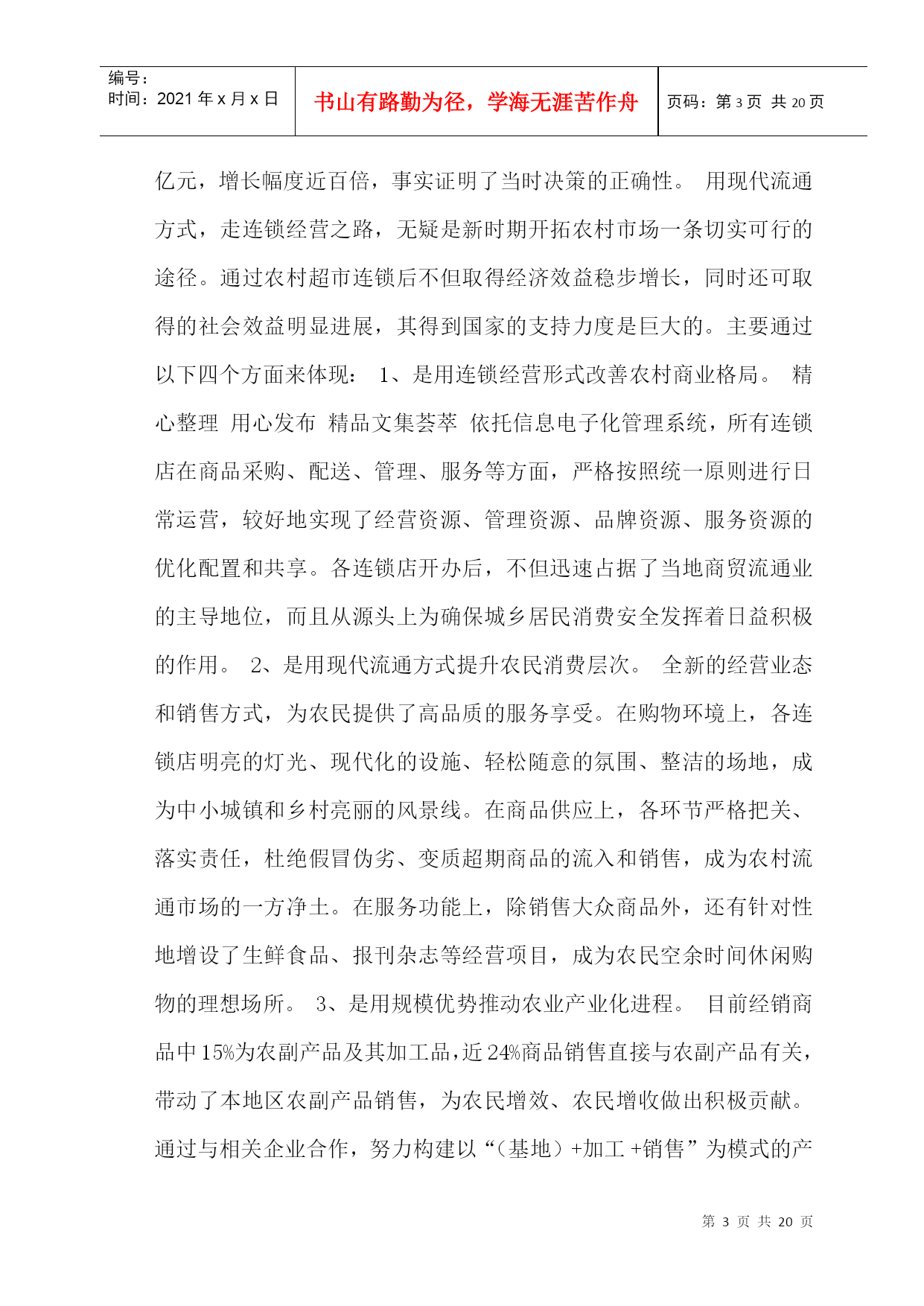 农村超市经营的4P分析目录中文摘要……………………………………………………………………………1Abstract……………………………………………………………………………2一、农村超市的发展现状……………………………………………………3二、农村超市经营的产品分析………………………………………………4三、农村超市经营的价格策略………………………………………………5四、农村超市经营的购销渠道………………………………………………7五、农村超市经营的促销方式………………………………………………9六、结论与展望…………………………………………………………………10参考文献……………………………………………………………………………15致谢……………………………………………………………………………………16中文摘要随着我国经济的发展和农村超市经营独特优势的显现,越来越多的连锁超市开始进军农村市场。本文通过运用”4ps”营销分析法对农村超市经营的产品选择、产品定价、购销渠道和促销方式等问题提出对策。本文从以下几个方面对我国发展农村超市的策略进行思考。第一、要明确农村超市的发展前景是广大和光明的。第二、主要分析农村超市的产品类别及定价。第三、探索目前农村超市在发展过程中存在的购销问题。第四、了解农村超市应如何选择快捷有效的促销方式。第五、找出一条适合我国农村连锁超市发展的光明道路。以下我将针对这一系列问题进行思考并寻求解决办法。关键词:农村超市,产品分析,购销渠道,促销方式AbstractWiththedevelopmentofournationaleconomyandruralsupermarketmanagementuniqueadvantagesofappearedmoreandmoresupermarketchainforayintoruralmarket.ThearticleUSES"4ps"marketinganalysisofruralsupermarketmanagementchoosingproducts,productpricing,purchaseandsaleschannelsandpromotionmethodsproposedcountermeasures.Thisarticlefromthefollowingseveralaspectstoourdevelopmentofruralsupermarketstrategythinking.First,mustbeclearaboutprospectsforthedevelopmentofruralsupermarketisbroadandlight.Second,mainlyanalysestheruralsupermarketproductcategoryandpricing.Third,toexplorethepresentcountrysidesupermarketindevelopingprocessexistsinthepurchasingorsellingproblem.Fourth,tounderstandhowshouldchooseruralsupermarketquickandeffectivepromotionmeans.Fifth,findasuitableforthedevelopmentofChina'sruralsupermarketchainlightpath.BelowIwillforthisaseriesofproblemsintoconsiderationandseeksolutions.Keywords:ruralsupermarket,productanalysis,marketingchannels,promotionmeans编号:时间:2021年x月x日书山有路勤为径,学海无涯苦作舟页码:第PAGE15页共NUMPAGES20页第PAGE\*MERGEFORMAT15页共NUMPAGES\*MERGEFORMAT20页农村超市经营的“4p”分析随着中国加入WTO后,农村流通体制向社会化、市场化的方向不断发展,农村市场已呈现出多条经营渠道、多种经济成份、多种经营形式的新格局。但目前农村市场迫切需要提高商品流通的组织化程度,特别是农资市场和农村食品市场的假货问题成了国家当务之急需解决的头痛问题,面对具大金矿的农村商业市场,通过引入现代流通方式来促进农村流通的现代化,使农村食品、农产品与农资通过连锁经营有利于摆脱目前我国农产品流通困境,提高农产品、食品安全性和流通效率,推进农村经济的发展等问