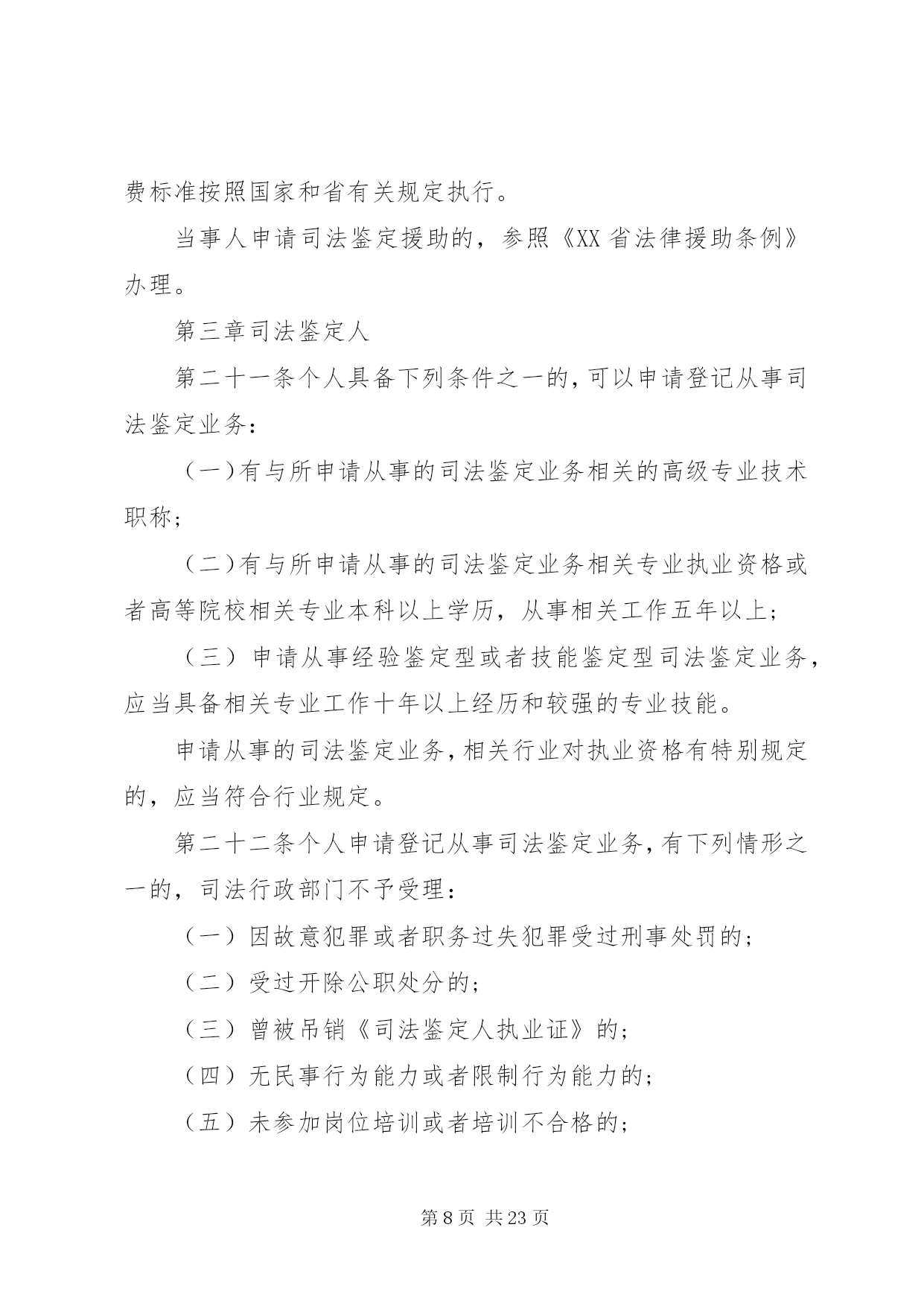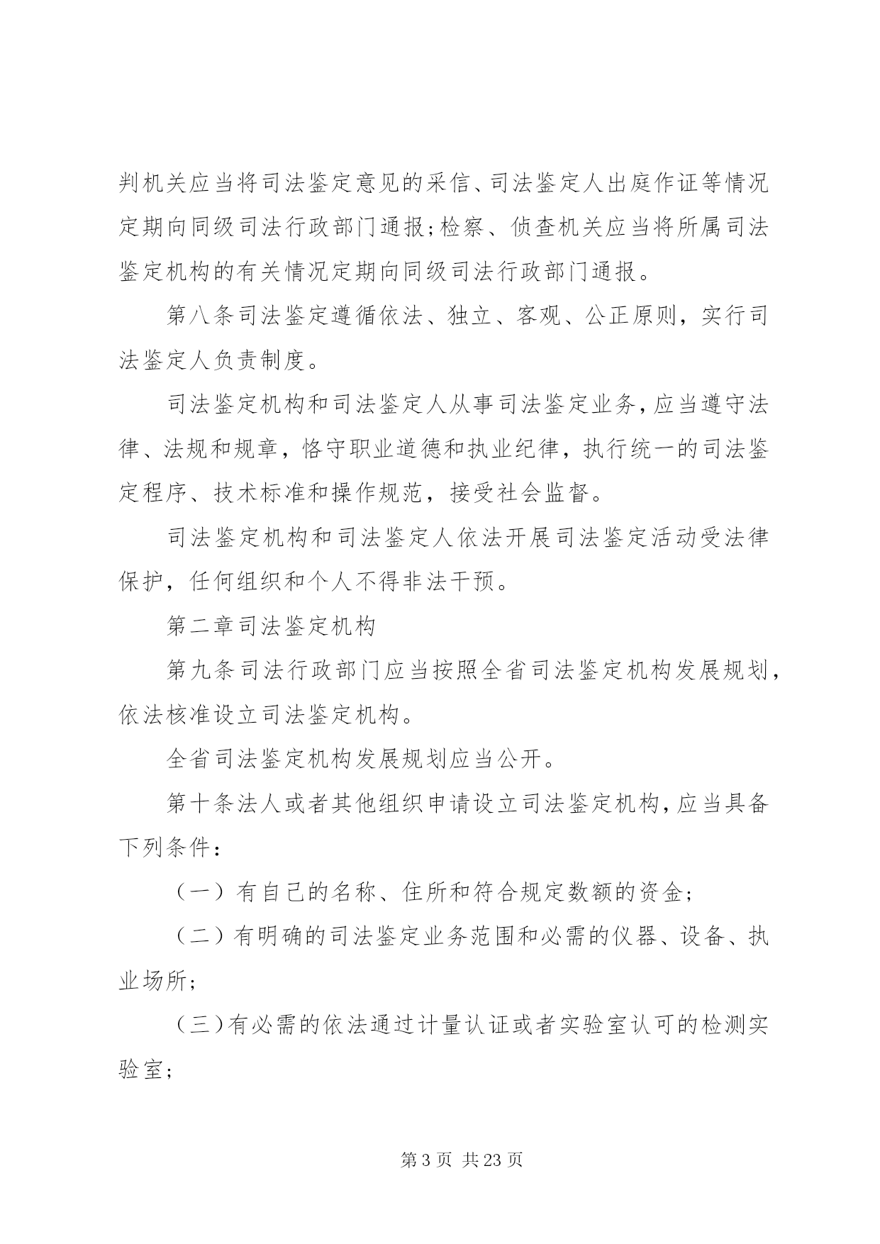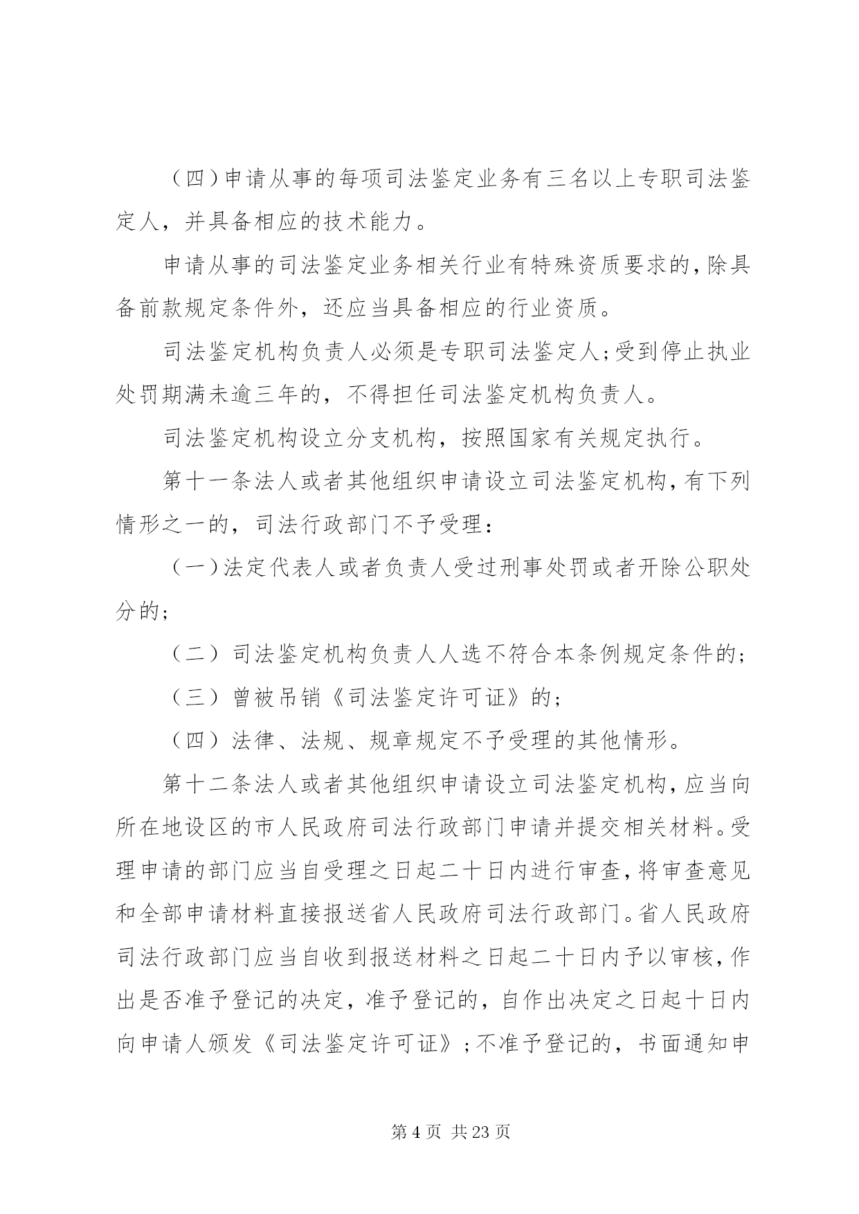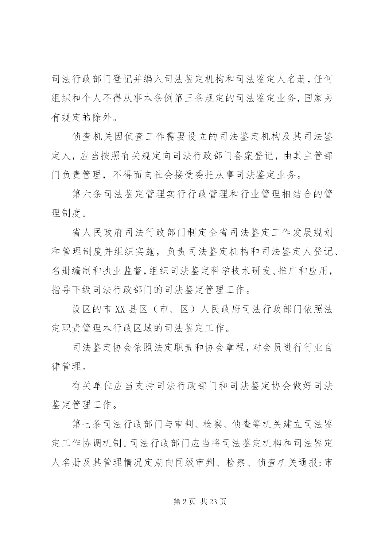 第PAGE\*Arabic\*MERGEFORMAT23页共NUMPAGES\*MERGEFORMAT23页XX市司法鉴定条例XX省司法鉴定条例第一章总则第一条为了规范司法鉴定活动,维护司法公正,保障当事人的合法权益,根据《全国人民代表大会常务委员会关于司法鉴定管理问题的决定》和有关法律、行政法规,结合本省实际,制定本条例,XX省司法鉴定条例。第二条本条例适用于本省行政区域内的司法鉴定及其监督管理活动。第三条本条例所称司法鉴定,是指司法鉴定机构和司法鉴定人运用科学技术或者专门知识对诉讼涉及的专门性问题进行检验、鉴别和判断并提供鉴定意见的活动,包括法医类、物证类、声像资料类鉴定以及诉讼需要的会计、知识产权、建设工程、产品质量、海事、交通、电子数据等其他类鉴定。本条例所称司法鉴定机构和司法鉴定人,是指符合本条例规定条件,经司法行政部门登记,从事前款规定司法鉴定业务的组织和人员。第四条省和设区的市人民政府统筹规划本行政区域的司法鉴定事业发展,协调解决司法鉴定管理工作中的重大问题。设立司法鉴定机构遵循统筹规划、合理布局、优化结构、有序发展的原则。第五条司法鉴定机构和司法鉴定人实行统一登记制度。未经司法行政部门登记并编入司法鉴定机构和司法鉴定人名册,任何组织和个人不得从事本条例第三条规定的司法鉴定业务,国家另有规定的除外。侦查机关因侦查工作需要设立的司法鉴定机构及其司法鉴定人,应当按照有关规定向司法行政部门备案登记,由其主管部门负责管理,不得面向社会接受委托从事司法鉴定业务。第六条司法鉴定管理实行行政管理和行业管理相结合的管理制度。省人民政府司法行政部门制定全省司法鉴定工作发展规划和管理制度并组织实施,负责司法鉴定机构和司法鉴定人登记、名册编制和执业监督,组织司法鉴定科学技术研发、推广和应用,指导下级司法行政部门的司法鉴定管理工作。设区的市XX县区(市、区)人民政府司法行政部门依照法定职责管理本行政区域的司法鉴定工作。司法鉴定协会依照法定职责和协会章程,对会员进行行业自律管理。有关单位应当支持司法行政部门和司法鉴定协会做好司法鉴定管理工作。第七条司法行政部门与审判、检察、侦查等机关建立司法鉴定工作协调机制。司法行政部门应当将司法鉴定机构和司法鉴定人名册及其管理情况定期向同级审判、检察、侦查机关通报;审判机关应当将司法鉴定意见的采信、司法鉴定人出庭作证等情况定期向同级司法行政部门通报;检察、侦查机关应当将所属司法鉴定机构的有关情况定期向同级司法行政部门通报。第八条司法鉴定遵循依法、独立、客观、公正原则,实行司法鉴定人负责制度。司法鉴定机构和司法鉴定人从事司法鉴定业务,应当遵守法律、法规和规章,恪守职业道德和执业纪律,执行统一的司法鉴定程序、技术标准和操作规范,接受社会监督。司法鉴定机构和司法鉴定人依法开展司法鉴定活动受法律保护,任何组织和个人不得非法干预。第二章司法鉴定机构第九条司法行政部门应当按照全省司法鉴定机构发展规划,依法核准设立司法鉴定机构。全省司法鉴定机构发展规划应当公开。第十条法人或者其他组织申请设立司法鉴定机构,应当具备下列条件:(一)有自己的名称、住所和符合规定数额的资金;(二)有明确的司法鉴定业务范围和必需的仪器、设备、执业场所;(三)有必需的依法通过计量认证或者实验室认可的检测实验室;(四)申请从事的每项司法鉴定业务有三名以上专职司法鉴定人,并具备相应的技术能力。申请从事的司法鉴定业务相关行业有特殊资质要求的,除具备前款规定条件外,还应当具备相应的行业资质。司法鉴定机构负责人必须是专职司法鉴定人;受到停止执业处罚期满未逾三年的,不得担任司法鉴定机构负责人。司法鉴定机构设立分支机构,按照国家有关规定执行。第十一条法人或者其他组织申请设立司法鉴定机构,有下列情形之一的,司法行政部门不予受理:(一)法定代表人或者负责人受过刑事处罚或者开除公职处分的;(二)司法鉴定机构负责人人选不符合本条例规定条件的;(三)曾被吊销《司法鉴定许可证》的;(四)法律、法规、规章规定不予受理的其他情形。第十二条法人或者其他组织申请设立司法鉴定机构,应当向所在地设区的市人民政府司法行政部门申请并提交相关材料。受理申请的部门应当自受理之日起二十日内进行审查,将审查意见和全部申请材料直接报送省人民政府司法行政部门。省人民政府司法行政部门应当自收到报送材料之日起二十日内予以审核,作出是否准予登记的决定,准予登记的,自作出决定之日起十日内向申请人颁发《司法鉴定许可证》;不准予登记的,书面通知申请人并说明理由。司法行政部门组织专家对申请人的仪器、设备、执业场所和检测实验室进行评审,所需时间不计算在前款规定的期限内。第十三条《司法鉴定许可证》自颁发之日起五年内有效;有效期届满需要延续,应当在届满六十日前依照有关规定向司法行政部门申请。