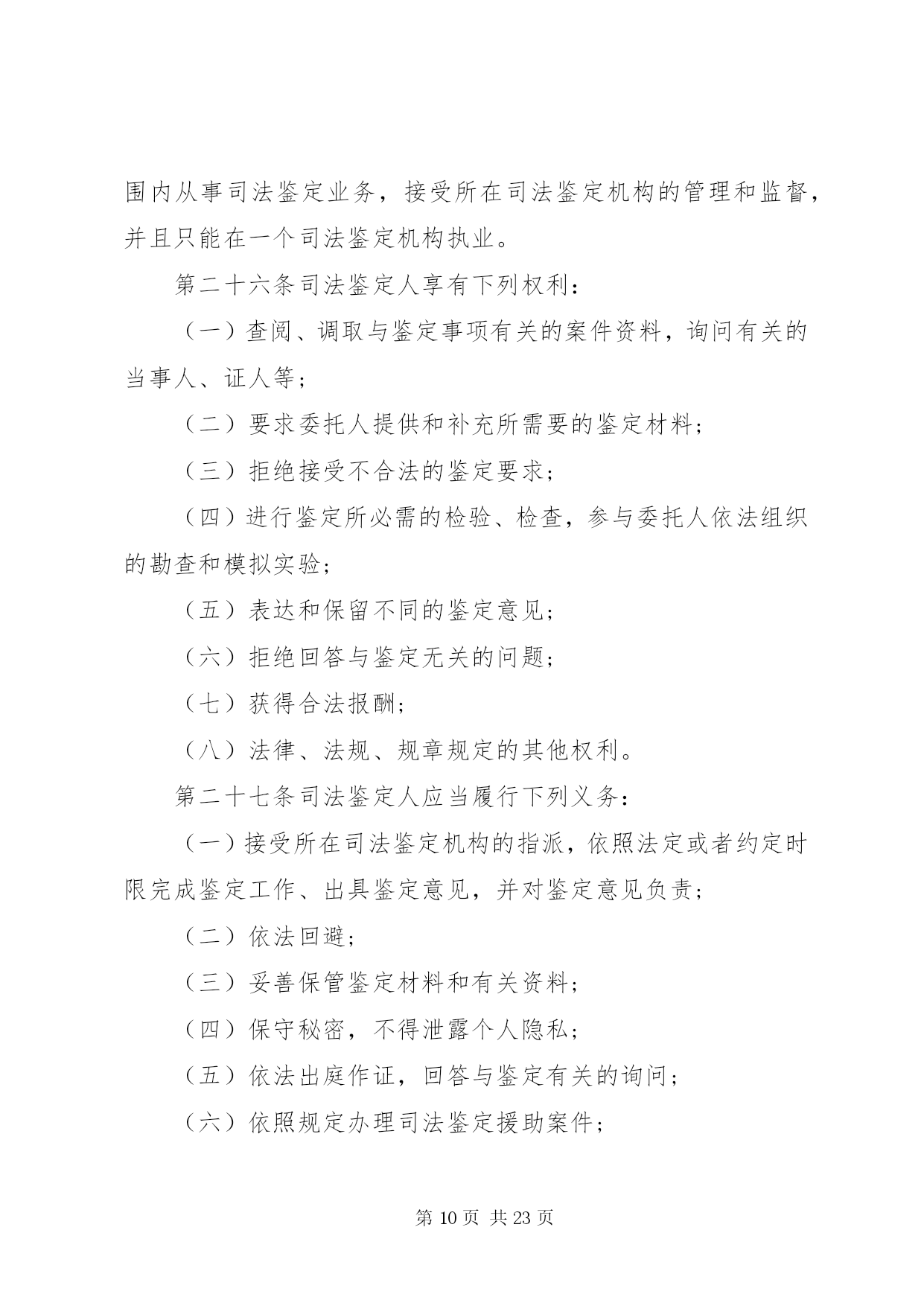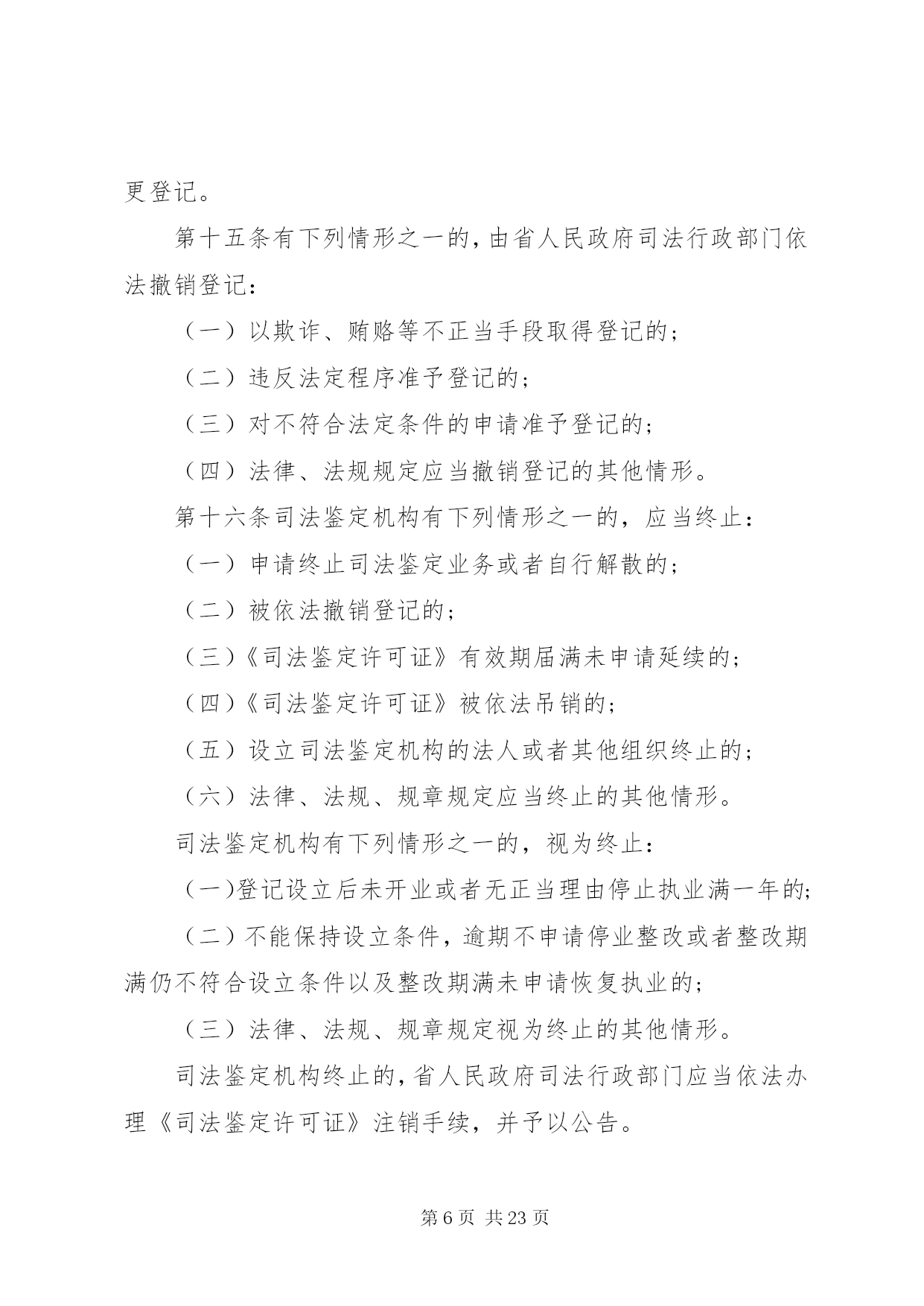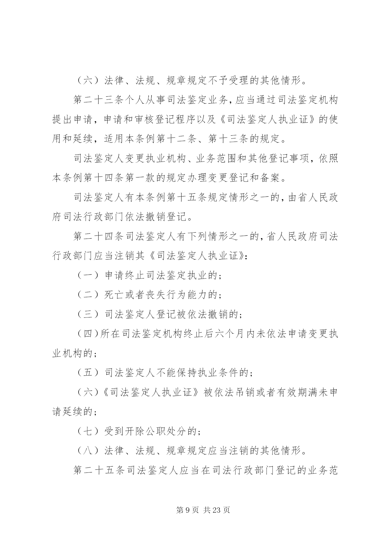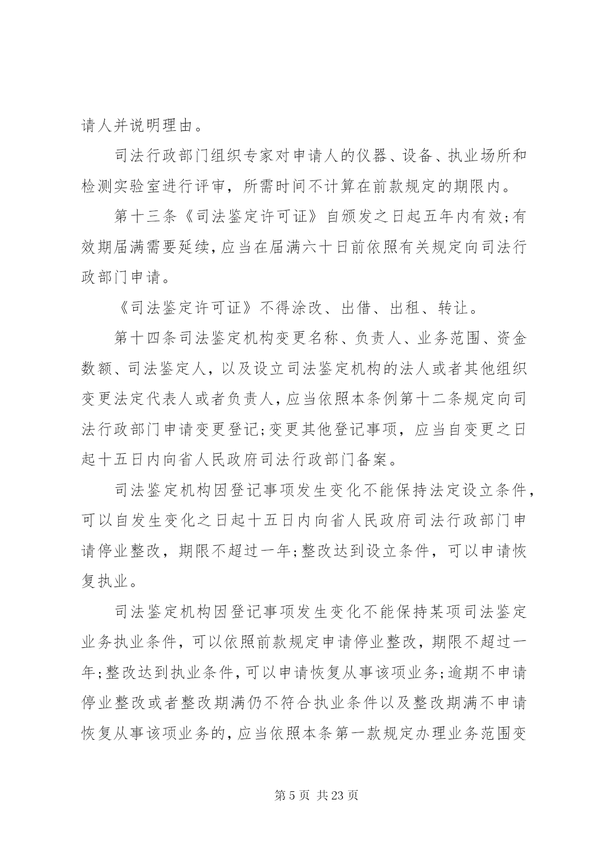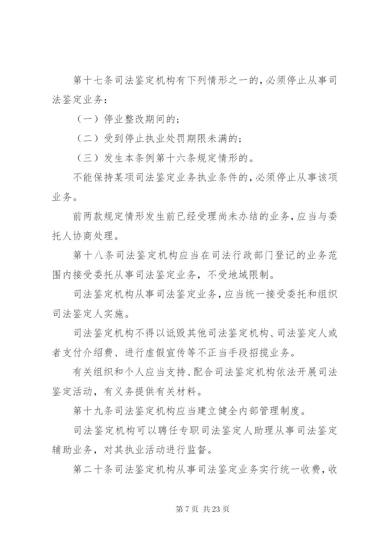 第PAGE\*Arabic\*MERGEFORMAT23页共NUMPAGES\*MERGEFORMAT23页XX市司法鉴定条例XX省司法鉴定条例第一章总则第一条为了规范司法鉴定活动,维护司法公正,保障当事人的合法权益,根据《全国人民代表大会常务委员会关于司法鉴定管理问题的决定》和有关法律、行政法规,结合本省实际,制定本条例,XX省司法鉴定条例。第二条本条例适用于本省行政区域内的司法鉴定及其监督管理活动。第三条本条例所称司法鉴定,是指司法鉴定机构和司法鉴定人运用科学技术或者专门知识对诉讼涉及的专门性问题进行检验、鉴别和判断并提供鉴定意见的活动,包括法医类、物证类、声像资料类鉴定以及诉讼需要的会计、知识产权、建设工程、产品质量、海事、交通、电子数据等其他类鉴定。本条例所称司法鉴定机构和司法鉴定人,是指符合本条例规定条件,经司法行政部门登记,从事前款规定司法鉴定业务的组织和人员。第四条省和设区的市人民政府统筹规划本行政区域的司法鉴定事业发展,协调解决司法鉴定管理工作中的重大问题。设立司法鉴定机构遵循统筹规划、合理布局、优化结构、有序发展的原则。第五条司法鉴定机构和司法鉴定人实行统一登记制度。未经司法行政部门登记并编入司法鉴定机构和司法鉴定人名册,任何组织和个人不得从事本条例第三条规定的司法鉴定业务,国家另有规定的除外。侦查机关因侦查工作需要设立的司法鉴定机构及其司法鉴定人,应当按照有关规定向司法行政部门备案登记,由其主管部门负责管理,不得面向社会接受委托从事司法鉴定业务。第六条司法鉴定管理实行行政管理和行业管理相结合的管理制度。省人民政府司法行政部门制定全省司法鉴定工作发展规划和管理制度并组织实施,负责司法鉴定机构和司法鉴定人登记、名册编制和执业监督,组织司法鉴定科学技术研发、推广和应用,指导下级司法行政部门的司法鉴定管理工作。设区的市XX县区(市、区)人民政府司法行政部门依照法定职责管理本行政区域的司法鉴定工作。司法鉴定协会依照法定职责和协会章程,对会员进行行业自律管理。有关单位应当支持司法行政部门和司法鉴定协会做好司法鉴定管理工作。第七条司法行政部门与审判、检察、侦查等机关建立司法鉴定工作协调机制。司法行政部门应当将司法鉴定机构和司法鉴定人名册及其管理情况定期向同级审判、检察、侦查机关通报;审判机关应当将司法鉴定意见的采信、司法鉴定人出庭作证等情况定期向同级司法行政部门通报;检察、侦查机关应当将所属司法鉴定机构的有关情况定期向同级司法行政部门通报。第八条司法鉴定遵循依法、独立、客观、公正原则,实行司法鉴定人负责制度。司法鉴定机构和司法鉴定人从事司法鉴定业务,应当遵守法律、法规和规章,恪守职业道德和执业纪律,执行统一的司法鉴定程序、技术标准和操作规范,接受社会监督。司法鉴定机构和司法鉴定人依法开展司法鉴定活动受法律保护,任何组织和个人不得非法干预。第二章司法鉴定机构第九条司法行政部门应当按照全省司法鉴定机构发展规划,依法核准设立司法鉴定机构。全省司法鉴定机构发展规划应当公开。第十条法人或者其他组织申请设立司法鉴定机构,应当具备下列条件:(一)有自己的名称、住所和符合规定数额的资金;(二)有明确的司法鉴定业务范围和必需的仪器、设备、执业场所;(三)有必需的依法通过计量认证或者实验室认可的检测实验室;(四)申请从事的每项司法鉴定业务有三名以上专职司法鉴定人,并具备相应的技术能力。申请从事的司法鉴定业务相关行业有特殊资质要求的,除具备前款规定条件外,还应当具备相应的行业资质。司法鉴定机构负责人必须是专职司法鉴定人;受到停止执业处罚期满未逾三年的,不得担任司法鉴定机构负责人。司法鉴定机构设立分支机构,按照国家有关规定执行。第十一条法人或者其他组织申请设立司法鉴定机构,有下列情形之一的,司法行政部门不予受理:(一)法定代表人或者负责人受过刑事处罚或者开除公职处分的;(二)司法鉴定机构负责人人选不符合本条例规定条件的;(三)曾被吊销《司法鉴定许可证》的;(四)法律、法规、规章规定不予受理的其他情形。第十二条法人或者其他组织申请设立司法鉴定机构,应当向所在地设区的市人民政府司法行政部门申请并提交相关材料。受理申请的部门应当自受理之日起二十日内进行审查,将审查意见和全部申请材料直接报送省人民政府司法行政部门。省人民政府司法行政部门应当自收到报送材料之日起二十日内予以审核,作出是否准予登记的决定,准予登记的,自作出决定之日起十日内向申请人颁发《司法鉴定许可证》;不准予登记的,书面通知申请人并说明理由。司法行政部门组织专家对申请人的仪器、设备、执业场所和检测实验室进行评审,所需时间不计算在前款规定的期限内。第十三条《司法鉴定许可证》自颁发之日起五年内有效;有效期届满需要延续,应当在届满六十日前依照有关规定向司法行政部门申请。