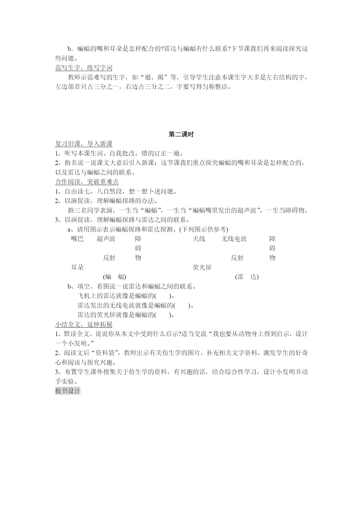蝙蝠和雷达学习目标1、认识7个生字,正确书写12个生字和“蝙蝠、清朗、捕捉、飞蛾、蚊子、避开、敏锐、铃铛、苍蝇、揭开、推进、障碍物、荧光屏、横七竖八”等词语。2、朗读课文,把握课文主要内容和要点,理解飞机夜间安全飞行与蝙蝠探路之间的联系,激发热爱科学,乐于观察和探究的兴趣。3、搜集并与同学交流有关仿生学的资料,提高信息搜集与处理能力。教学重难点理解飞机夜间安全飞行与蝙蝠探路之间的联系。课前准备1、生字词卡片或抄写有生字新词的小黑板。2、教师搜集有关仿生学的图文资料,准备蝙蝠图片、雷达图片。第一课时以图为媒,引入新课(依次出示蝙蝠和雷达的图片)同学们,你们认识它们吗?请说一说你对它们的了解。蝙蝠是一种动物,雷达是一种探测装置,它们之间有什么联系呢?今天,我们一起学习一篇新课文《蝙蝠和雷达》。(板书课题)朗读课文,读通读顺1、自由朗读课文两遍,难读句子多读几遍,标出自然段序号,画出生字词,读准字音。2、两人一组轮流读课文,互相认读生字词。3、出示写有生字词的小黑板,指名开火车认读生字词,提示学生注意形声字和“蝙、荧”等字的读音。默读课文,归纳大意1、课文主要讲什么?请大家默读全文,用自己的话说一说。2、指名说,教师根据说的情况,小结归纳主要内容的方法,如:有的同学是抓住课题联系课文归纳的,有的同学是把课文各部分意思连起来归纳的。填表助学,自主阅读1、指名朗读第三自然段,找一找:含有关联词的句子,如“即使……也……”,想想说明了什么;文中提出什么疑问?请读出疑问的语气。2、默读四、五、六自然段,填写下表。(表中加黑部分为需填写的内容,答案供参考,只要学生抓住要点即可,语言是否简洁不做重点强调)试验顺序第一次第二次第三次试验方式把蝙蝠眼睛蒙上,让它在拉有许多绳子系有铃铛的屋子里飞。把蝙蝠的耳朵塞上。把蝙蝠的嘴巴封住。试验结果铃铛一个也没响,绳子一根也没碰着。蝙蝠到处乱撞,铃铛响个不停。蝙蝠到处乱撞,铃铛响个不停。试验结论蝙蝠夜间飞行,靠的不是眼睛,而是嘴和耳朵配合起来探路的。3、交流:先在小组,再在班上交流填写表格的情况。4、读读课文,同桌互相看图表,科学家是怎样揭开蝙蝠探路之谜的。再指名上台介绍。5、小结:a、出示句子“科学家经过反复研究,终于揭开了蝙蝠能在夜里飞行的秘密”,说说从句子中体会到什么?(感悟“反复、终于”)b.蝙蝠的嘴和耳朵是怎样配合的?雷达与蝙蝠有什么联系?下节课我们再来阅读探究这些问题。范写生字,练写字词教师示范难写的生字,如“避、揭”等,引导学生注意本课生字大多是左右结构的字,左边部首只占三分之一,右边占三分之二,字要写得匀称整洁。第二课时复习旧课,导入新课1、听写本课生词。自我批改,错的订正一遍。2、指名说一说课文大意后引入新课:这节课我们重点探究蝙蝠的嘴和耳朵是怎样配合的,以及雷达与蝙蝠之间的联系。合作阅读,突破重难点1、自由读七、八自然段,想一想卜述问题。2、以演促读,理解蝙蝠探路的办法。指三名同学表演,一生当“蝙蝠”,一生当“蝙蝠嘴里发出的超声波”,一生当障碍物。3、以画促读,理解蝙蝠探路与雷达之间的联系。a、请用图示表示蝙蝠探路和雷达探测。(下列图示供参考)嘴巴超声波障天线无线电波障碍碍反射物反射物耳朵荧光屏(蝙蝠)(雷达)b、填空,看图说一说雷达和蝙蝠之间的联系。飞机上的雷达就像是蝙蝠的()。雷达发出的无线电波就像是蝙蝠的()。雷达的荧光屏就像是蝙蝠的()。小结全文,延伸拓展1、默读全文,说说你从本文中受到什么启示?适当交流“我也要从动物身上得到启示,设计一个小发明。”2、阅读文后“资料袋”,教师出示有关仿生学的图片,补充相关文字资料,激发学生的好奇心和阅读与探究兴趣。3、布置学生课外搜集关于仿生学的资料,有兴趣的话,结合综合性学习,设计小发明并动手实验。板书设计课后小记12*