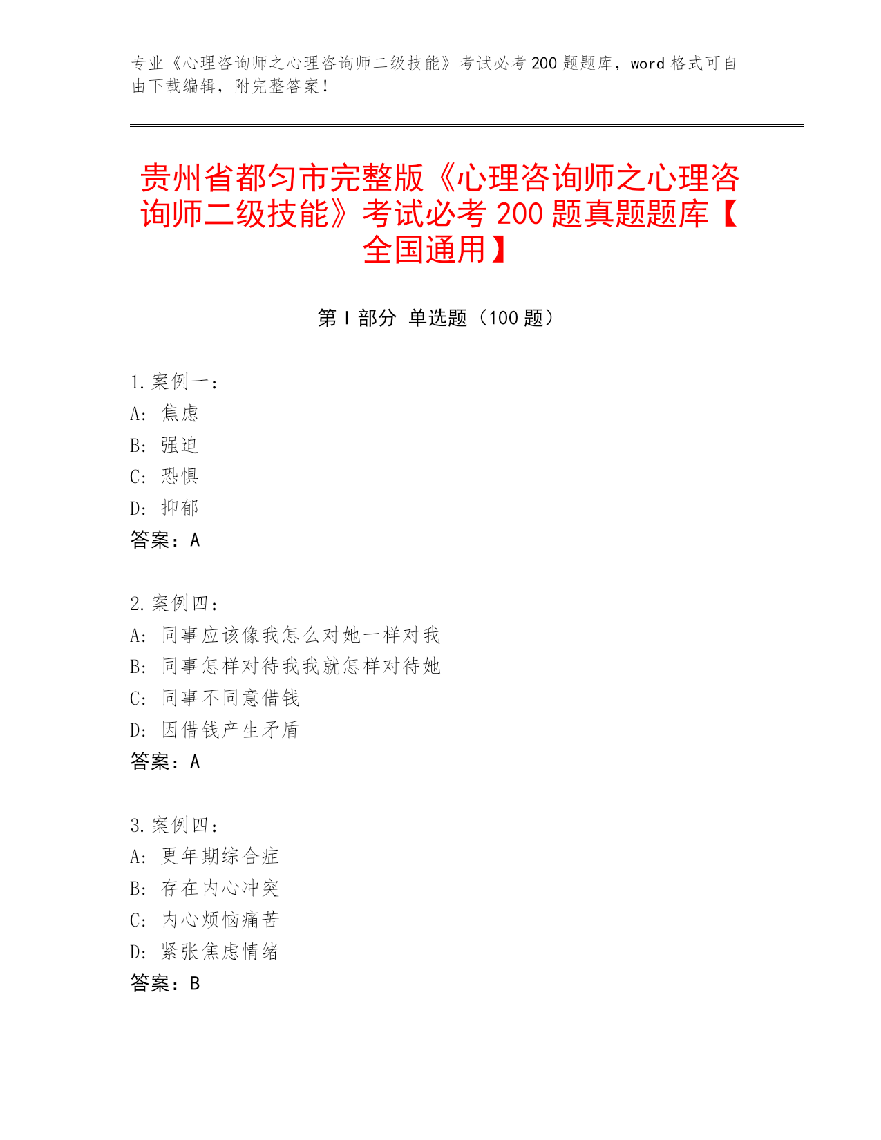 贵州省都匀市完整版《心理咨询师之心理咨询师二级技能》考试必考200题真题题库【全国通用】